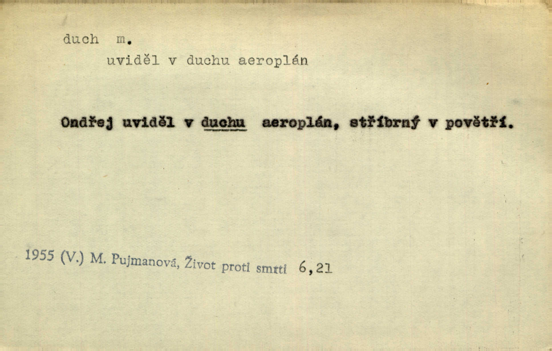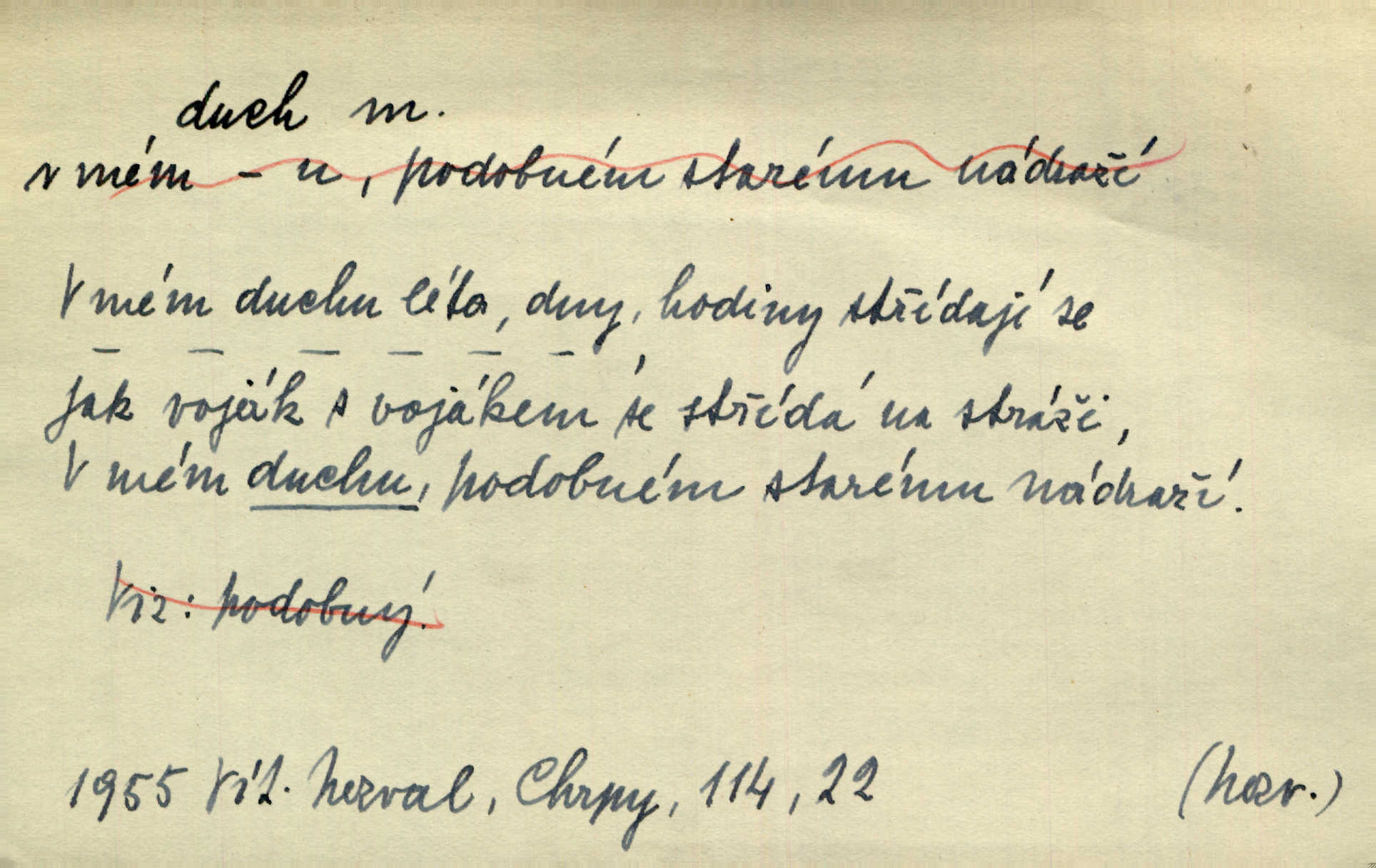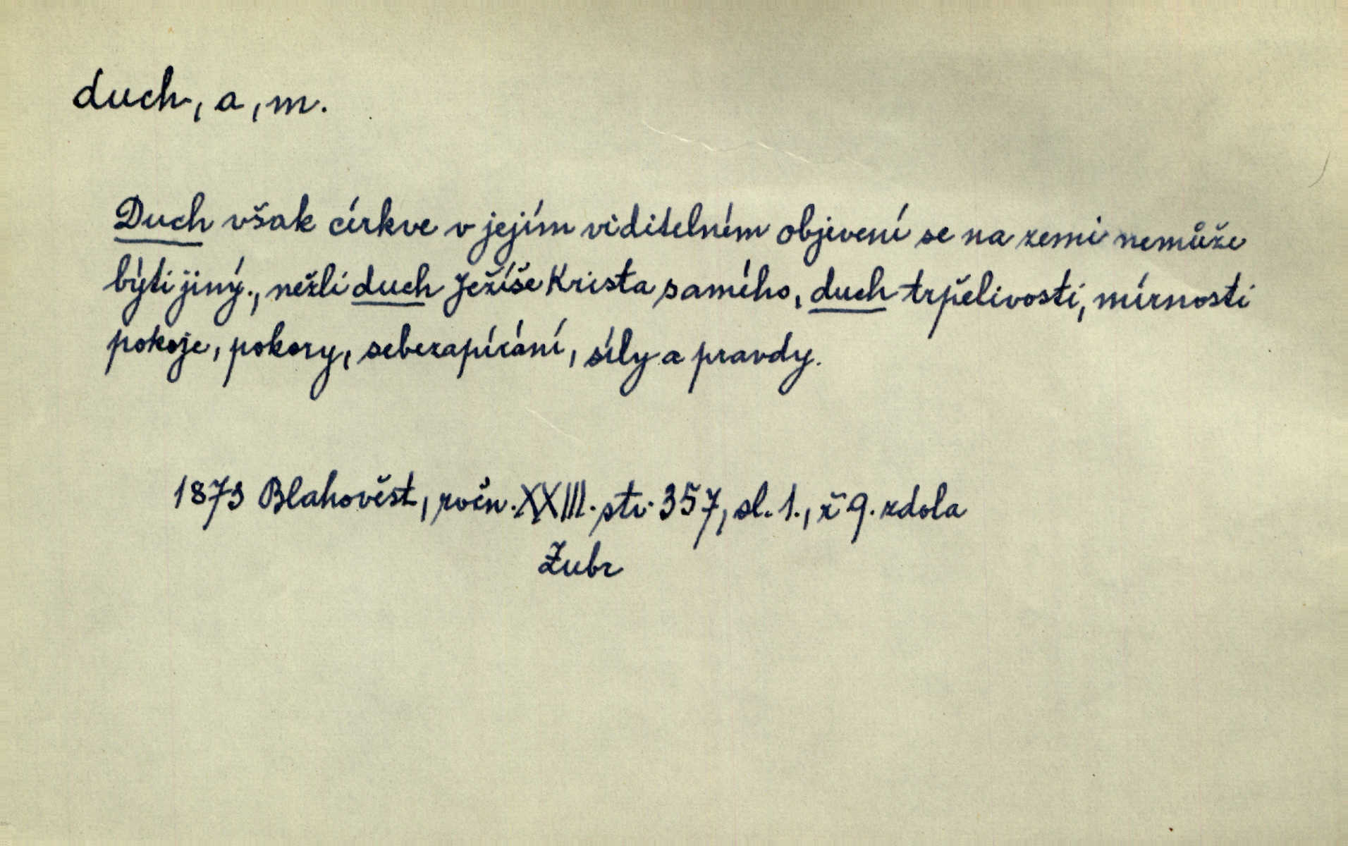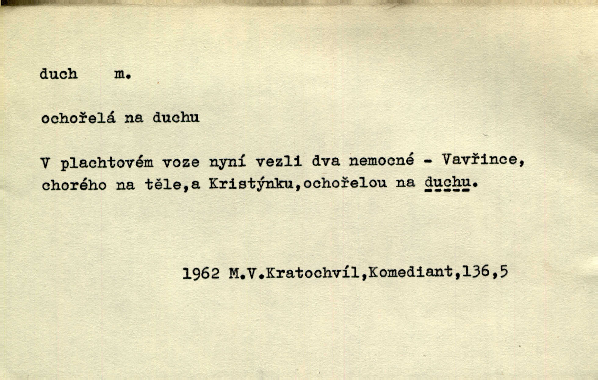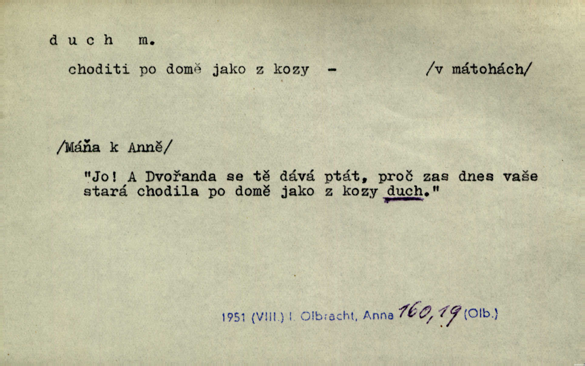 - duch, -a m. (jen sg.) myslící, cítící a jednající mohutnost člověka; duše (op. tělo). Prospíval na duchu i na těle. Herb. Sestra Rosina je na duchu ještě dítě. Prav. Chtěl aspoň duchem tady býti přítomen. Hál. Vypustiti ducha zemříti. V pátek vypustil ducha zemřel. Šim. Křečovitě sebou škubnul [umírající] a bez ducha zůstal v rukách štkající ženy mrtev. Herb. Chodil jako bez ducha mdle, zaraženě. Herb. Smála se už v duchu napřed u sebe, skrytě. Šmil. V duchu takto zvolal [Amil] s vroucností: „Ty výkvěte nebeské spanilosti!“ potichu, k sobě. Zey. Já měl tolik přítomnosti ducha, že jsem k stromu skočil a pistoli z náprsí vytrhl. Něm. D netělesná bytost. Bůh je pouhý duch. D (pl. duchové, lok. duchách) pomyslná, netělesná bytost, dobrá n. zlá; strašidlo. Dům plný duchů. Herrm. Stála před ním jako duch, aniž se toho nadál. Svět. Plíží se jako duchové. Šim. V domě Pilátově jako duchové se [kacíři] shromažďovali na modlitbách. Herb. Jen hodina duchů se nesla v dálku s věží v město spící dvanáctá. Vrch. Vyvolávati, citovati duchy (ku př. ve spiritismu). [Píseň o Hiavatě] zakládá se na podání o zázračné osobě, kterou poslal jim (Indiánům) Velký duch nejvyšší bytost božská. Slád. Jeden zlý duch vyšel ze srdce jeho zloduch, démon, zlé myšlenky. Herb. Kondelík za celou tu chvíli [co Vejvara ploval přes Vltavu] ani nehlesl, aby nevyvolal nějakého zlého ducha neštěstí. Herrm. Potom jí šeptal zlý duch, že bude sloužiti v panském domě. Prav. Zlý duch eufem. ďábel. Zlý duch posedl naši milou tetičku zloba. Herb. Cítila, že byl dobrým jejím duchem vedl ji k dobrému. Svět. D Círk. třetí božská osoba ve věrouce církví křesťanských. Duch svatý. Přijď, ó Duše přesvatý. Pís. Požehnej vás Bůh všemohoucí — Syn a Duch svatý! Hříchy proti Duchu svatému. Přen. v ustálených spojeních. Rázem byl Artur osvícen duchem svatým, uhodl, co se stalo. Herrm. Hrabec stal se už svatým duchem celého shromáždění rozhodující osobou. Herb. Pánbůh mu dává dar Ducha svatého, učení jde mu jak by hrál nadání. Něm. V lid. názvech rostlin: koření sv. Ducha čemeřice černá. D Ve spojeních o, po svatém Duše, do svatého Ducha, arch. na (o) svatý Duch svatodušní svátky. O svatý Duch to že již jistě budou doma. Jir. O svatém Duše choď ještě v kožiše. Pořek. Bába zachovávala přísloví: Do sv. Ducha nespúštěj se kožicha. Něm. D mohutnost duševní, nadání, důvtip, inteligence. Co bohů vytvořil již lidský duch. Mach. Ty máš bystrost, ty máš ducha, ale musíš mít také duši. Šim. Zvláštním duchem také nevynikal. Hlad. A co sejde s toho, má-li člověk ducha, či je-li hlupec? Havl. Z nebeť přichází věští duch. Erb. Maje dar ducha, soudil [zeman] moudře. Jir. D smýšlení. Mezi sedláky začal se jeviti podivný duch! Nebyli už tak ponížení. Herb. Duch shody a lahody se rozhostil po komnatě. Bozd. Duch nenávisti a mstivosti [v polské literatuře] protivil se mysli Jungmannově. Zel. Venkovan náš, ještě toho staročeského prostého ducha, slovo příroda nenávidí. Rais. Duch národní vane u nás v každé chýžce. Svět. Duch husitských předků našich probudil se ve Vás. Jir. Chyt’ se ho velký duch, ve Vídni si koupil predikát pýcha. Jir. D odvaha. Beneška, sotva zaslechla, že Petra z Brna poslali do Italie, sklesla na duchu. Herb. Dodav mu ducha, žádal ho, aby ničeho neříkal. Jir. D vnitřní ráz, povaha, podstata. Jako pokrokový člověk a jako průmyslník prý musí jít s duchem doby. Čap. Ch. U něho nebylo ani stopy obchodního ducha. Zey. Jednal jsem v duchu zákonů. Zey. Duch jazyka, literatury. Každý, kdo v některé vědě odborně je vzdělán, osvojuje si, jak říkáme, „ducha“ své vědy. Mas. Duch novin. D osoba duchem nadaná, osobnost. Silný karakter podrobuje si duchy slabší. Durd. Může-li tvůrčí duch úplně býti nešťastným? Jir. Časopis musejní za několik let soustředil nejvýtečnější duchy české. Zel. Třídění duchů třídění význačných lidí podle jejich smýšlení. Nastalo veliké třídění duchů. Hum. V přízemí bydleli služební duchové služebnictvo. Leg. Můj strážný duch je v limbu strážkyně! Herrm. D Lid. (ak. ducha n. duch) dech. Jen popřej málo oddechu. Duch slábne, nohy klesají. Erb. Poléhává, na duch si stýská. Baar. To je mela, že sotva ducha popadám. Šmil. Vzduch boží duch. Pořek. D Lid. (ak. ducha n. duch) plyn z konečníku, melior. prd. Má slabé útory (kdo moč nebo duch v sobě držeti nemůže). Čel. Kužela byl dobrý člověk, ale pořád jen jako z kozy duch slabý, chatrného zdraví. Rais. [K loupežníkům:] Vy duchové z kozy, kteří se ženete na poutníčka a před vojskem popotahujete ze slzavého nosu. Vanč.