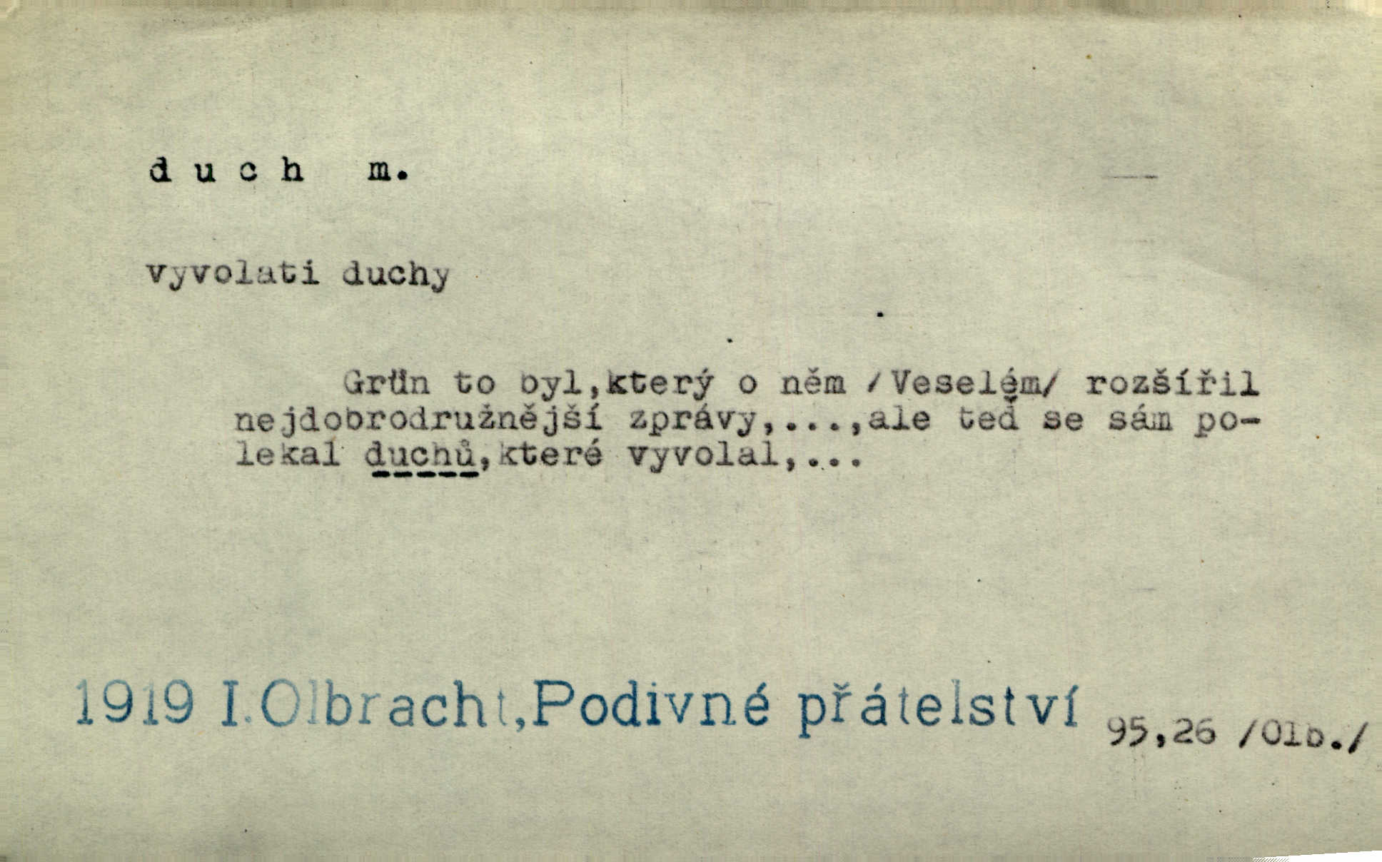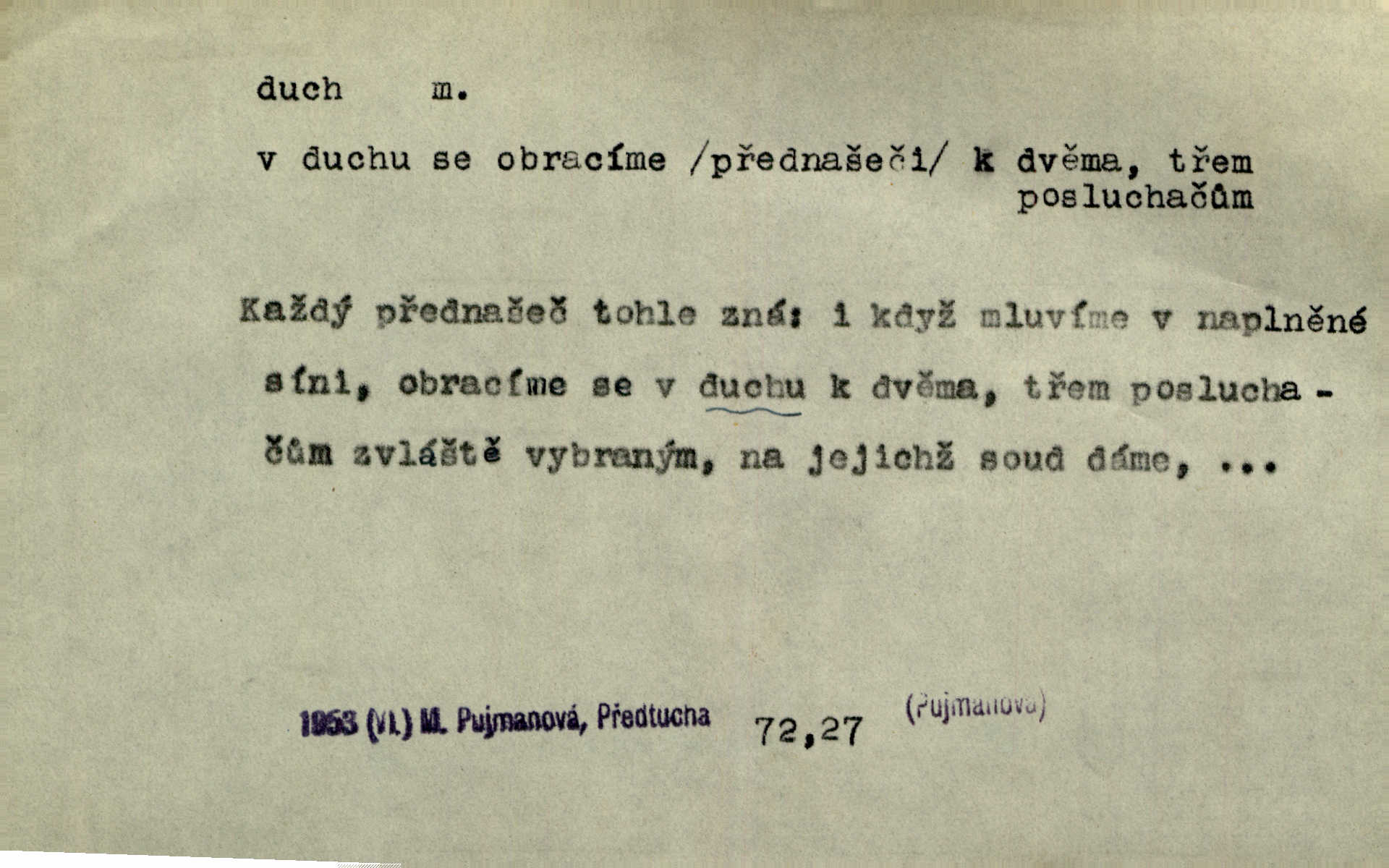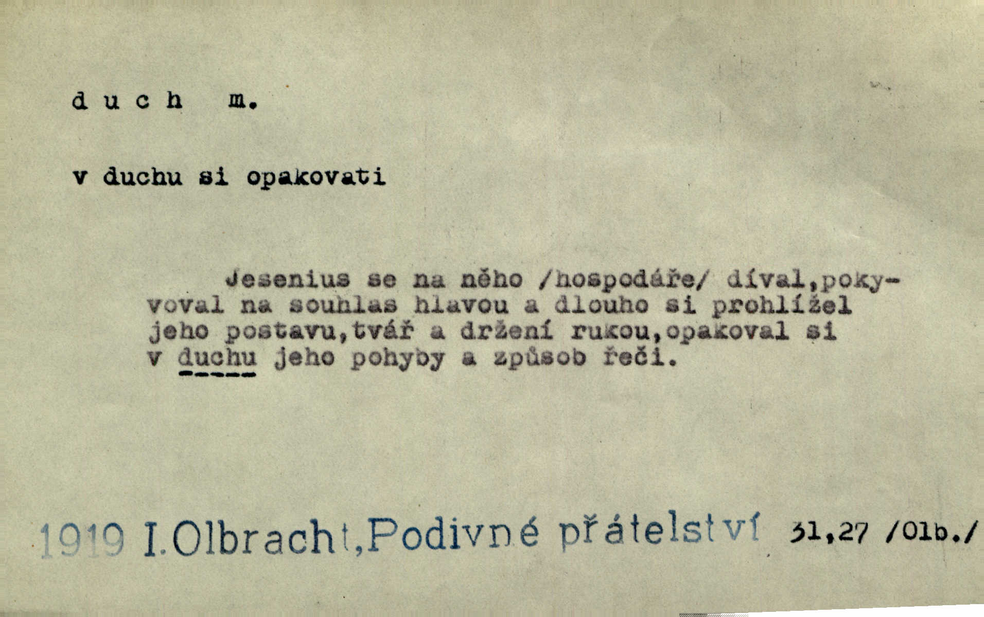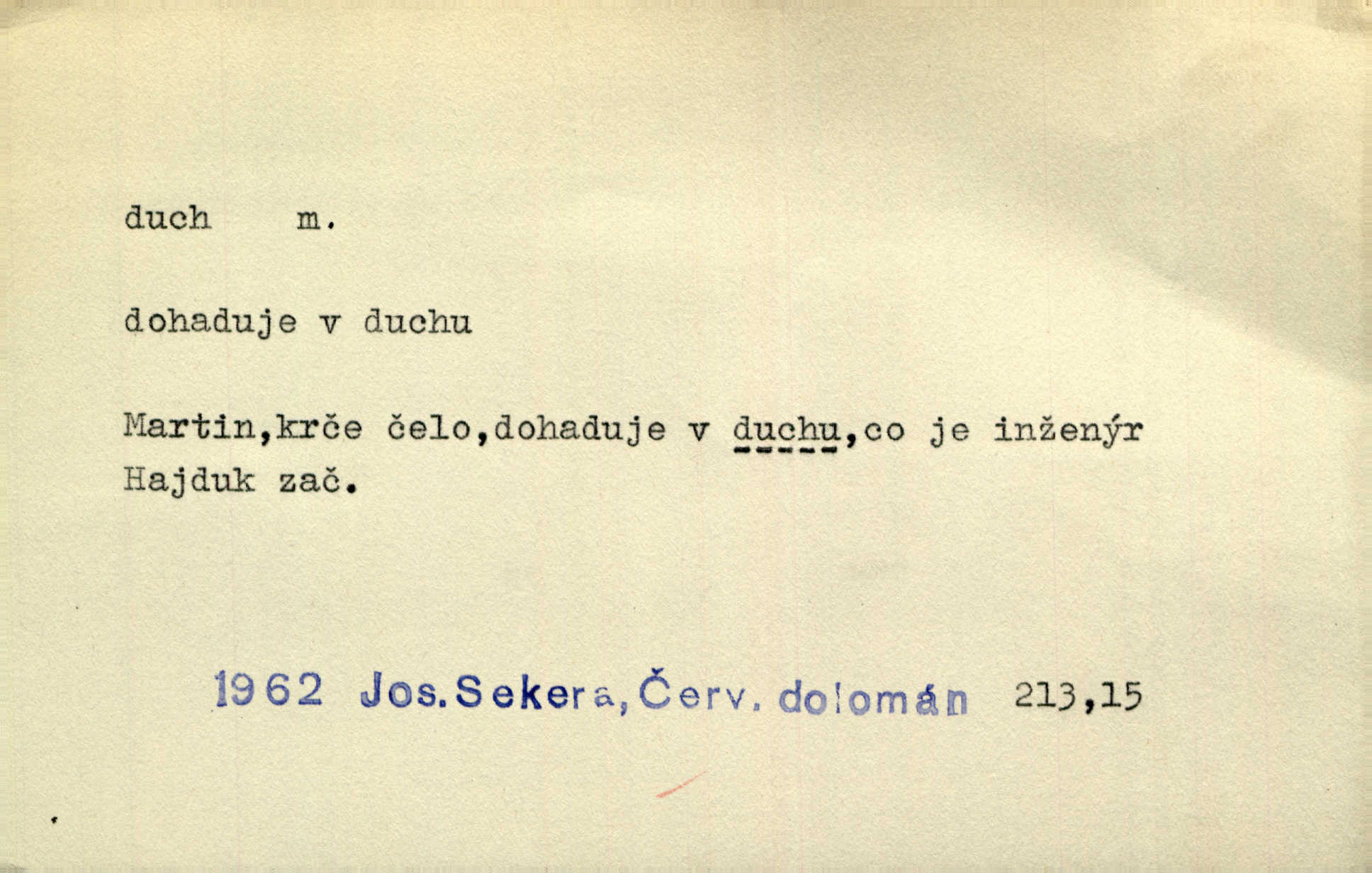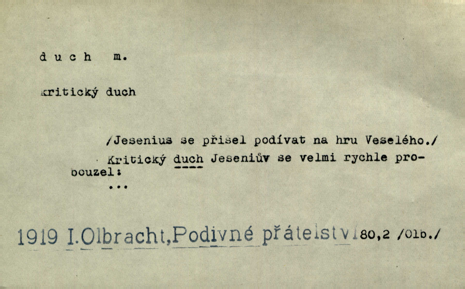 - duch, -a m. (jen sg.) myslící, cítící a jednající mohutnost člověka; duše (op. tělo). Prospíval na duchu i na těle. Herb. Sestra Rosina je na duchu ještě dítě. Prav. Chtěl aspoň duchem tady býti přítomen. Hál. Vypustiti ducha zemříti. V pátek vypustil ducha zemřel. Šim. Křečovitě sebou škubnul [umírající] a bez ducha zůstal v rukách štkající ženy mrtev. Herb. Chodil jako bez ducha mdle, zaraženě. Herb. Smála se už v duchu napřed u sebe, skrytě. Šmil. V duchu takto zvolal [Amil] s vroucností: „Ty výkvěte nebeské spanilosti!“ potichu, k sobě. Zey. Já měl tolik přítomnosti ducha, že jsem k stromu skočil a pistoli z náprsí vytrhl. Něm. D netělesná bytost. Bůh je pouhý duch. D (pl. duchové, lok. duchách) pomyslná, netělesná bytost, dobrá n. zlá; strašidlo. Dům plný duchů. Herrm. Stála před ním jako duch, aniž se toho nadál. Svět. Plíží se jako duchové. Šim. V domě Pilátově jako duchové se [kacíři] shromažďovali na modlitbách. Herb. Jen hodina duchů se nesla v dálku s věží v město spící dvanáctá. Vrch. Vyvolávati, citovati duchy (ku př. ve spiritismu). [Píseň o Hiavatě] zakládá se na podání o zázračné osobě, kterou poslal jim (Indiánům) Velký duch nejvyšší bytost božská. Slád. Jeden zlý duch vyšel ze srdce jeho zloduch, démon, zlé myšlenky. Herb. Kondelík za celou tu chvíli [co Vejvara ploval přes Vltavu] ani nehlesl, aby nevyvolal nějakého zlého ducha neštěstí. Herrm. Potom jí šeptal zlý duch, že bude sloužiti v panském domě. Prav. Zlý duch eufem. ďábel. Zlý duch posedl naši milou tetičku zloba. Herb. Cítila, že byl dobrým jejím duchem vedl ji k dobrému. Svět. D Círk. třetí božská osoba ve věrouce církví křesťanských. Duch svatý. Přijď, ó Duše přesvatý. Pís. Požehnej vás Bůh všemohoucí — Syn a Duch svatý! Hříchy proti Duchu svatému. Přen. v ustálených spojeních. Rázem byl Artur osvícen duchem svatým, uhodl, co se stalo. Herrm. Hrabec stal se už svatým duchem celého shromáždění rozhodující osobou. Herb. Pánbůh mu dává dar Ducha svatého, učení jde mu jak by hrál nadání. Něm. V lid. názvech rostlin: koření sv. Ducha čemeřice černá. D Ve spojeních o, po svatém Duše, do svatého Ducha, arch. na (o) svatý Duch svatodušní svátky. O svatý Duch to že již jistě budou doma. Jir. O svatém Duše choď ještě v kožiše. Pořek. Bába zachovávala přísloví: Do sv. Ducha nespúštěj se kožicha. Něm. D mohutnost duševní, nadání, důvtip, inteligence. Co bohů vytvořil již lidský duch. Mach. Ty máš bystrost, ty máš ducha, ale musíš mít také duši. Šim. Zvláštním duchem také nevynikal. Hlad. A co sejde s toho, má-li člověk ducha, či je-li hlupec? Havl. Z nebeť přichází věští duch. Erb. Maje dar ducha, soudil [zeman] moudře. Jir. D smýšlení. Mezi sedláky začal se jeviti podivný duch! Nebyli už tak ponížení. Herb. Duch shody a lahody se rozhostil po komnatě. Bozd. Duch nenávisti a mstivosti [v polské literatuře] protivil se mysli Jungmannově. Zel. Venkovan náš, ještě toho staročeského prostého ducha, slovo příroda nenávidí. Rais. Duch národní vane u nás v každé chýžce. Svět. Duch husitských předků našich probudil se ve Vás. Jir. Chyt’ se ho velký duch, ve Vídni si koupil predikát pýcha. Jir. D odvaha. Beneška, sotva zaslechla, že Petra z Brna poslali do Italie, sklesla na duchu. Herb. Dodav mu ducha, žádal ho, aby ničeho neříkal. Jir. D vnitřní ráz, povaha, podstata. Jako pokrokový člověk a jako průmyslník prý musí jít s duchem doby. Čap. Ch. U něho nebylo ani stopy obchodního ducha. Zey. Jednal jsem v duchu zákonů. Zey. Duch jazyka, literatury. Každý, kdo v některé vědě odborně je vzdělán, osvojuje si, jak říkáme, „ducha“ své vědy. Mas. Duch novin. D osoba duchem nadaná, osobnost. Silný karakter podrobuje si duchy slabší. Durd. Může-li tvůrčí duch úplně býti nešťastným? Jir. Časopis musejní za několik let soustředil nejvýtečnější duchy české. Zel. Třídění duchů třídění význačných lidí podle jejich smýšlení. Nastalo veliké třídění duchů. Hum. V přízemí bydleli služební duchové služebnictvo. Leg. Můj strážný duch je v limbu strážkyně! Herrm. D Lid. (ak. ducha n. duch) dech. Jen popřej málo oddechu. Duch slábne, nohy klesají. Erb. Poléhává, na duch si stýská. Baar. To je mela, že sotva ducha popadám. Šmil. Vzduch boží duch. Pořek. D Lid. (ak. ducha n. duch) plyn z konečníku, melior. prd. Má slabé útory (kdo moč nebo duch v sobě držeti nemůže). Čel. Kužela byl dobrý člověk, ale pořád jen jako z kozy duch slabý, chatrného zdraví. Rais. [K loupežníkům:] Vy duchové z kozy, kteří se ženete na poutníčka a před vojskem popotahujete ze slzavého nosu. Vanč.