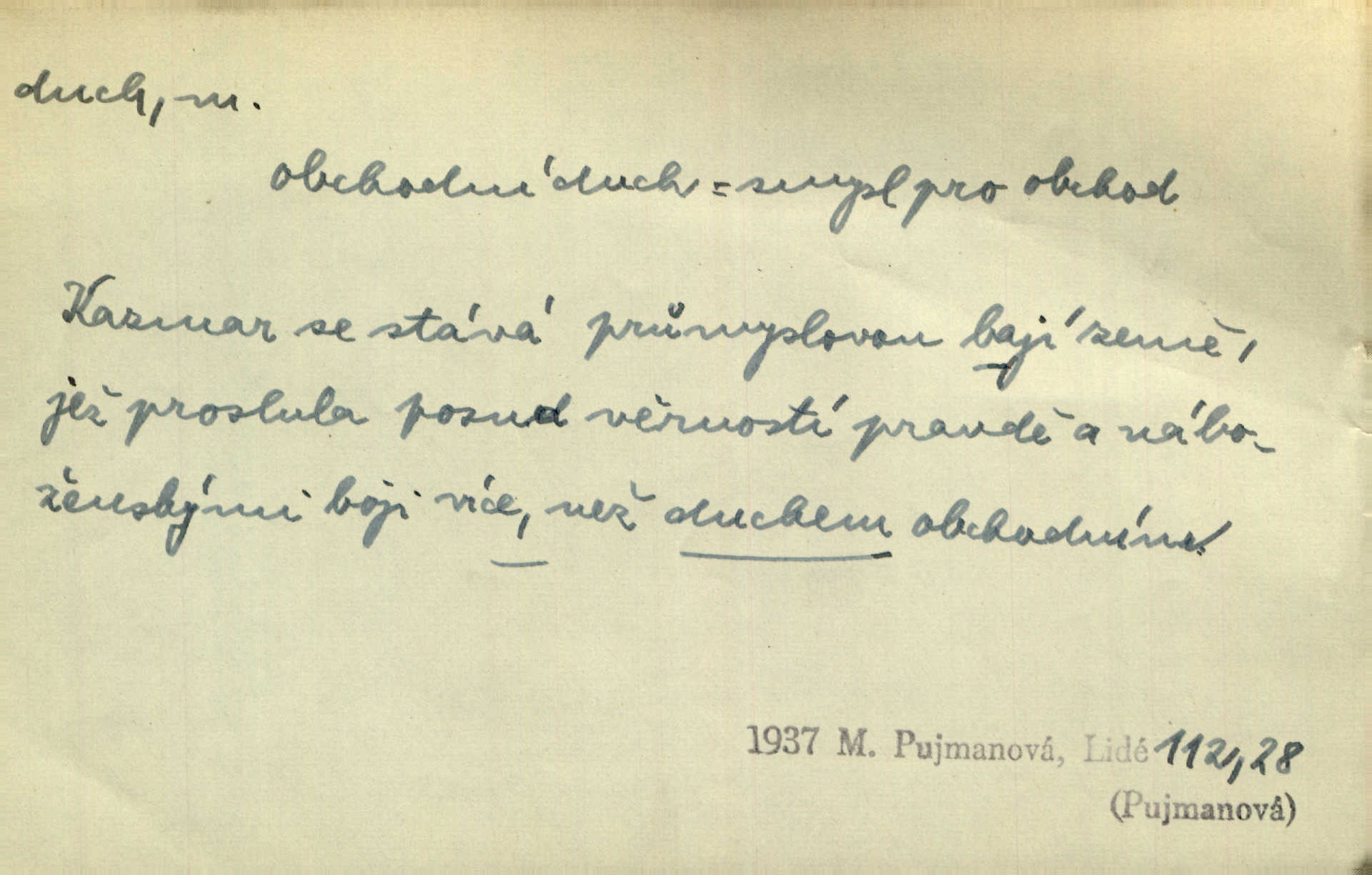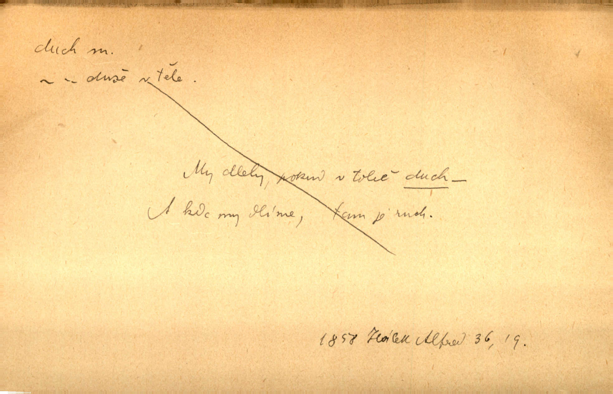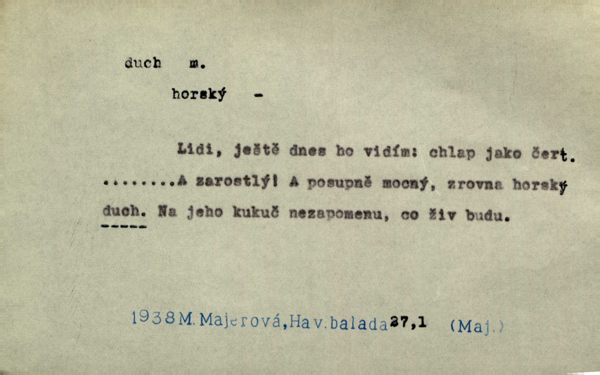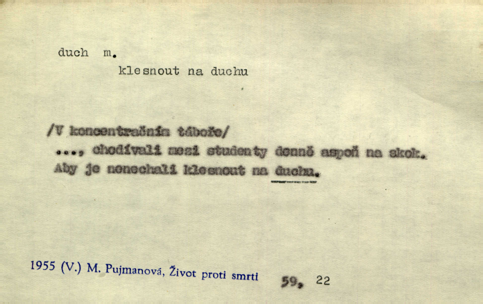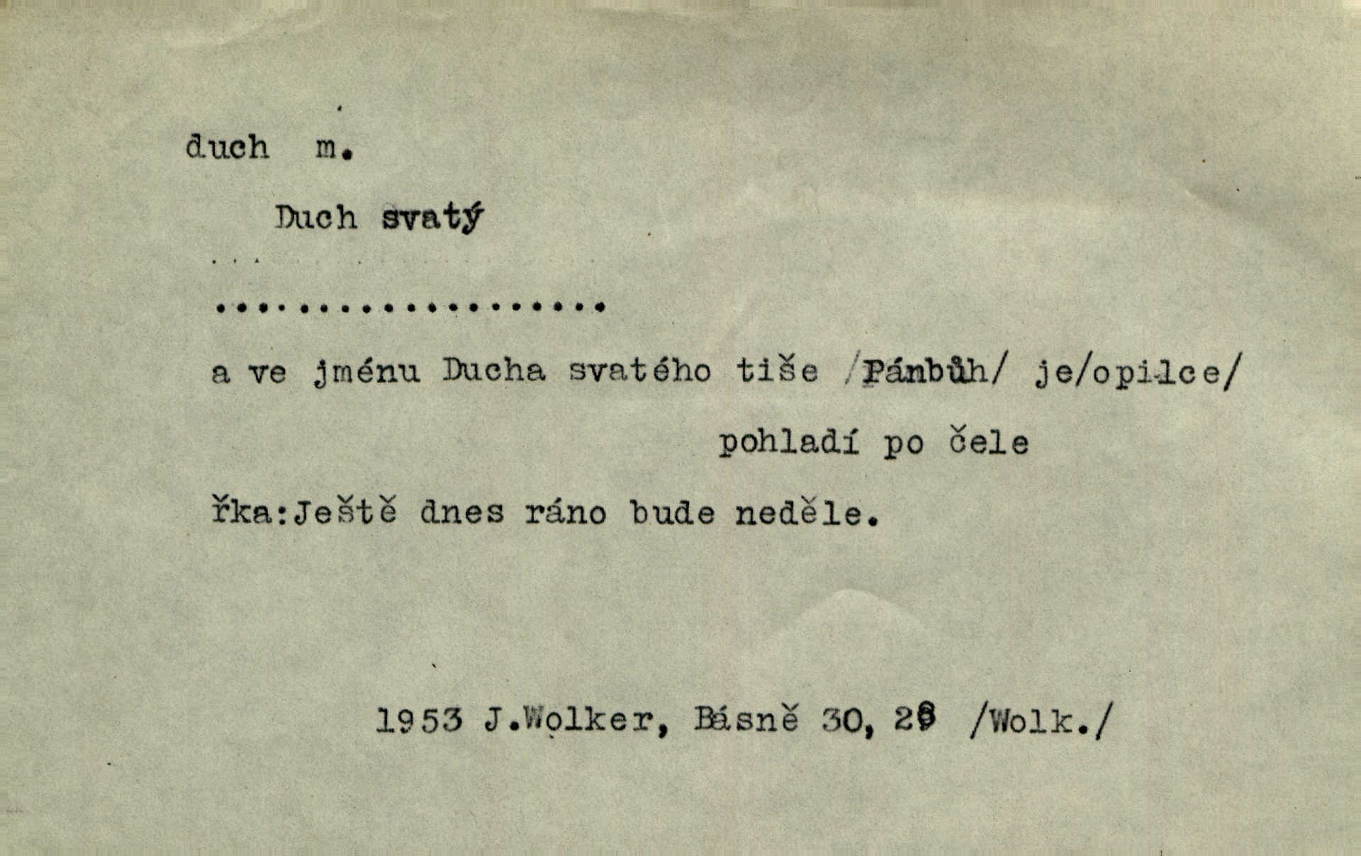 - duch, -a m. (jen sg.) myslící, cítící a jednající mohutnost člověka; duše (op. tělo). Prospíval na duchu i na těle. Herb. Sestra Rosina je na duchu ještě dítě. Prav. Chtěl aspoň duchem tady býti přítomen. Hál. Vypustiti ducha zemříti. V pátek vypustil ducha zemřel. Šim. Křečovitě sebou škubnul [umírající] a bez ducha zůstal v rukách štkající ženy mrtev. Herb. Chodil jako bez ducha mdle, zaraženě. Herb. Smála se už v duchu napřed u sebe, skrytě. Šmil. V duchu takto zvolal [Amil] s vroucností: „Ty výkvěte nebeské spanilosti!“ potichu, k sobě. Zey. Já měl tolik přítomnosti ducha, že jsem k stromu skočil a pistoli z náprsí vytrhl. Něm. D netělesná bytost. Bůh je pouhý duch. D (pl. duchové, lok. duchách) pomyslná, netělesná bytost, dobrá n. zlá; strašidlo. Dům plný duchů. Herrm. Stála před ním jako duch, aniž se toho nadál. Svět. Plíží se jako duchové. Šim. V domě Pilátově jako duchové se [kacíři] shromažďovali na modlitbách. Herb. Jen hodina duchů se nesla v dálku s věží v město spící dvanáctá. Vrch. Vyvolávati, citovati duchy (ku př. ve spiritismu). [Píseň o Hiavatě] zakládá se na podání o zázračné osobě, kterou poslal jim (Indiánům) Velký duch nejvyšší bytost božská. Slád. Jeden zlý duch vyšel ze srdce jeho zloduch, démon, zlé myšlenky. Herb. Kondelík za celou tu chvíli [co Vejvara ploval přes Vltavu] ani nehlesl, aby nevyvolal nějakého zlého ducha neštěstí. Herrm. Potom jí šeptal zlý duch, že bude sloužiti v panském domě. Prav. Zlý duch eufem. ďábel. Zlý duch posedl naši milou tetičku zloba. Herb. Cítila, že byl dobrým jejím duchem vedl ji k dobrému. Svět. D Círk. třetí božská osoba ve věrouce církví křesťanských. Duch svatý. Přijď, ó Duše přesvatý. Pís. Požehnej vás Bůh všemohoucí — Syn a Duch svatý! Hříchy proti Duchu svatému. Přen. v ustálených spojeních. Rázem byl Artur osvícen duchem svatým, uhodl, co se stalo. Herrm. Hrabec stal se už svatým duchem celého shromáždění rozhodující osobou. Herb. Pánbůh mu dává dar Ducha svatého, učení jde mu jak by hrál nadání. Něm. V lid. názvech rostlin: koření sv. Ducha čemeřice černá. D Ve spojeních o, po svatém Duše, do svatého Ducha, arch. na (o) svatý Duch svatodušní svátky. O svatý Duch to že již jistě budou doma. Jir. O svatém Duše choď ještě v kožiše. Pořek. Bába zachovávala přísloví: Do sv. Ducha nespúštěj se kožicha. Něm. D mohutnost duševní, nadání, důvtip, inteligence. Co bohů vytvořil již lidský duch. Mach. Ty máš bystrost, ty máš ducha, ale musíš mít také duši. Šim. Zvláštním duchem také nevynikal. Hlad. A co sejde s toho, má-li člověk ducha, či je-li hlupec? Havl. Z nebeť přichází věští duch. Erb. Maje dar ducha, soudil [zeman] moudře. Jir. D smýšlení. Mezi sedláky začal se jeviti podivný duch! Nebyli už tak ponížení. Herb. Duch shody a lahody se rozhostil po komnatě. Bozd. Duch nenávisti a mstivosti [v polské literatuře] protivil se mysli Jungmannově. Zel. Venkovan náš, ještě toho staročeského prostého ducha, slovo příroda nenávidí. Rais. Duch národní vane u nás v každé chýžce. Svět. Duch husitských předků našich probudil se ve Vás. Jir. Chyt’ se ho velký duch, ve Vídni si koupil predikát pýcha. Jir. D odvaha. Beneška, sotva zaslechla, že Petra z Brna poslali do Italie, sklesla na duchu. Herb. Dodav mu ducha, žádal ho, aby ničeho neříkal. Jir. D vnitřní ráz, povaha, podstata. Jako pokrokový člověk a jako průmyslník prý musí jít s duchem doby. Čap. Ch. U něho nebylo ani stopy obchodního ducha. Zey. Jednal jsem v duchu zákonů. Zey. Duch jazyka, literatury. Každý, kdo v některé vědě odborně je vzdělán, osvojuje si, jak říkáme, „ducha“ své vědy. Mas. Duch novin. D osoba duchem nadaná, osobnost. Silný karakter podrobuje si duchy slabší. Durd. Může-li tvůrčí duch úplně býti nešťastným? Jir. Časopis musejní za několik let soustředil nejvýtečnější duchy české. Zel. Třídění duchů třídění význačných lidí podle jejich smýšlení. Nastalo veliké třídění duchů. Hum. V přízemí bydleli služební duchové služebnictvo. Leg. Můj strážný duch je v limbu strážkyně! Herrm. D Lid. (ak. ducha n. duch) dech. Jen popřej málo oddechu. Duch slábne, nohy klesají. Erb. Poléhává, na duch si stýská. Baar. To je mela, že sotva ducha popadám. Šmil. Vzduch boží duch. Pořek. D Lid. (ak. ducha n. duch) plyn z konečníku, melior. prd. Má slabé útory (kdo moč nebo duch v sobě držeti nemůže). Čel. Kužela byl dobrý člověk, ale pořád jen jako z kozy duch slabý, chatrného zdraví. Rais. [K loupežníkům:] Vy duchové z kozy, kteří se ženete na poutníčka a před vojskem popotahujete ze slzavého nosu. Vanč.