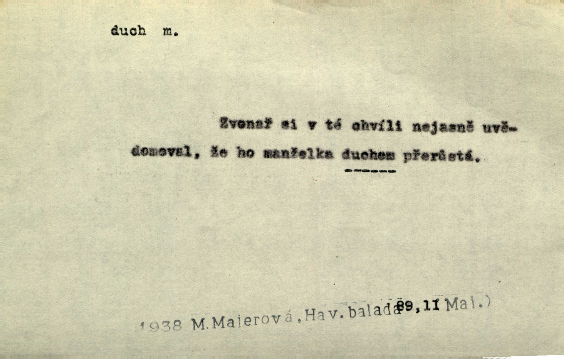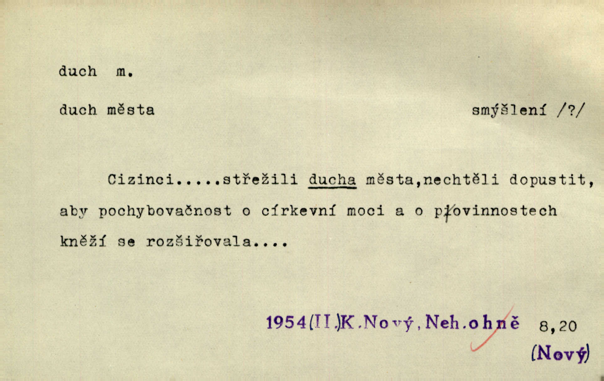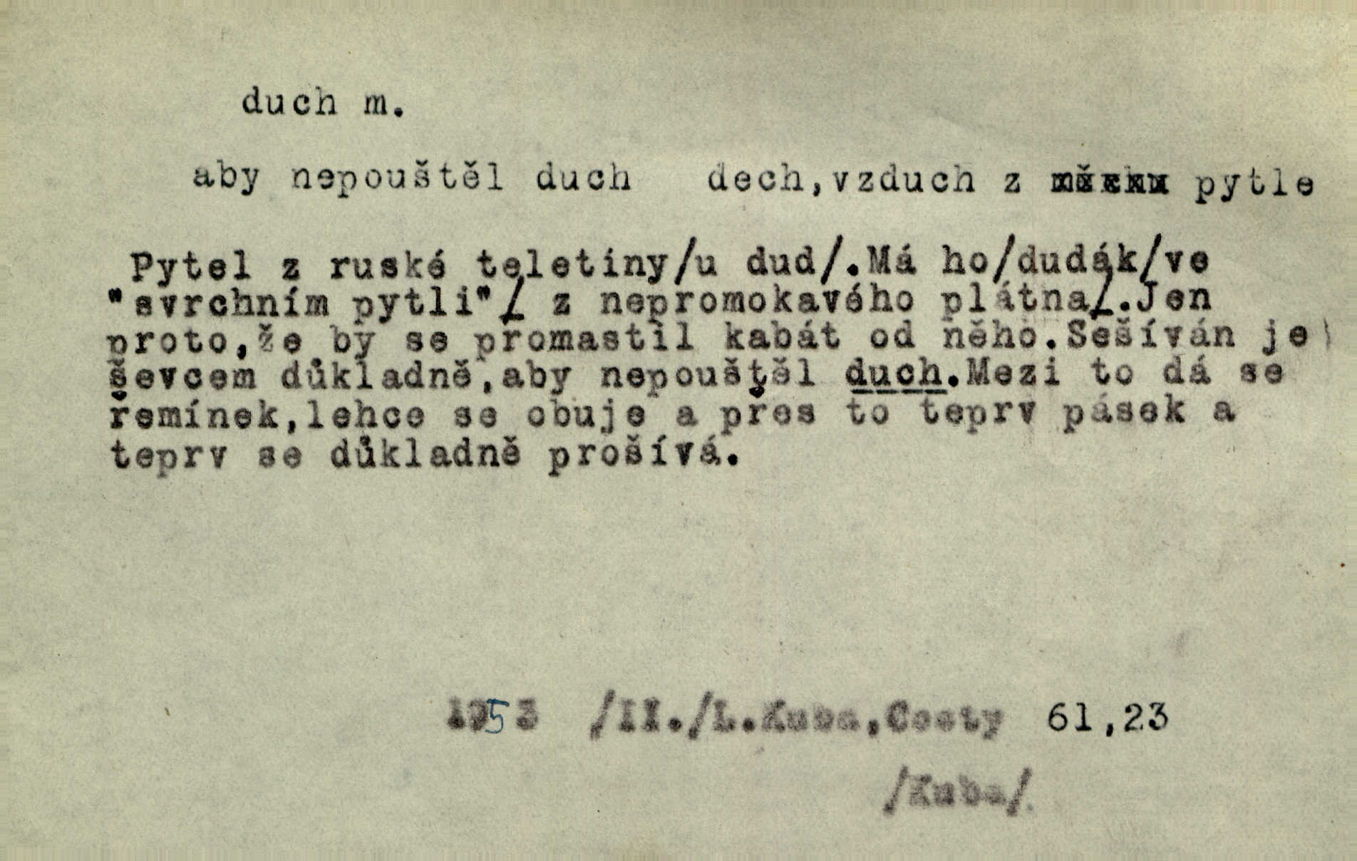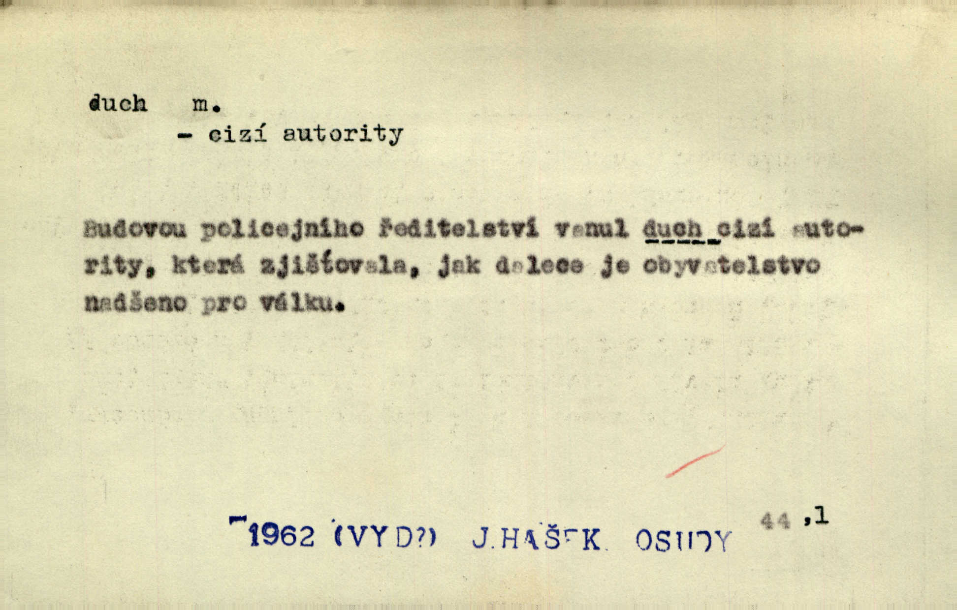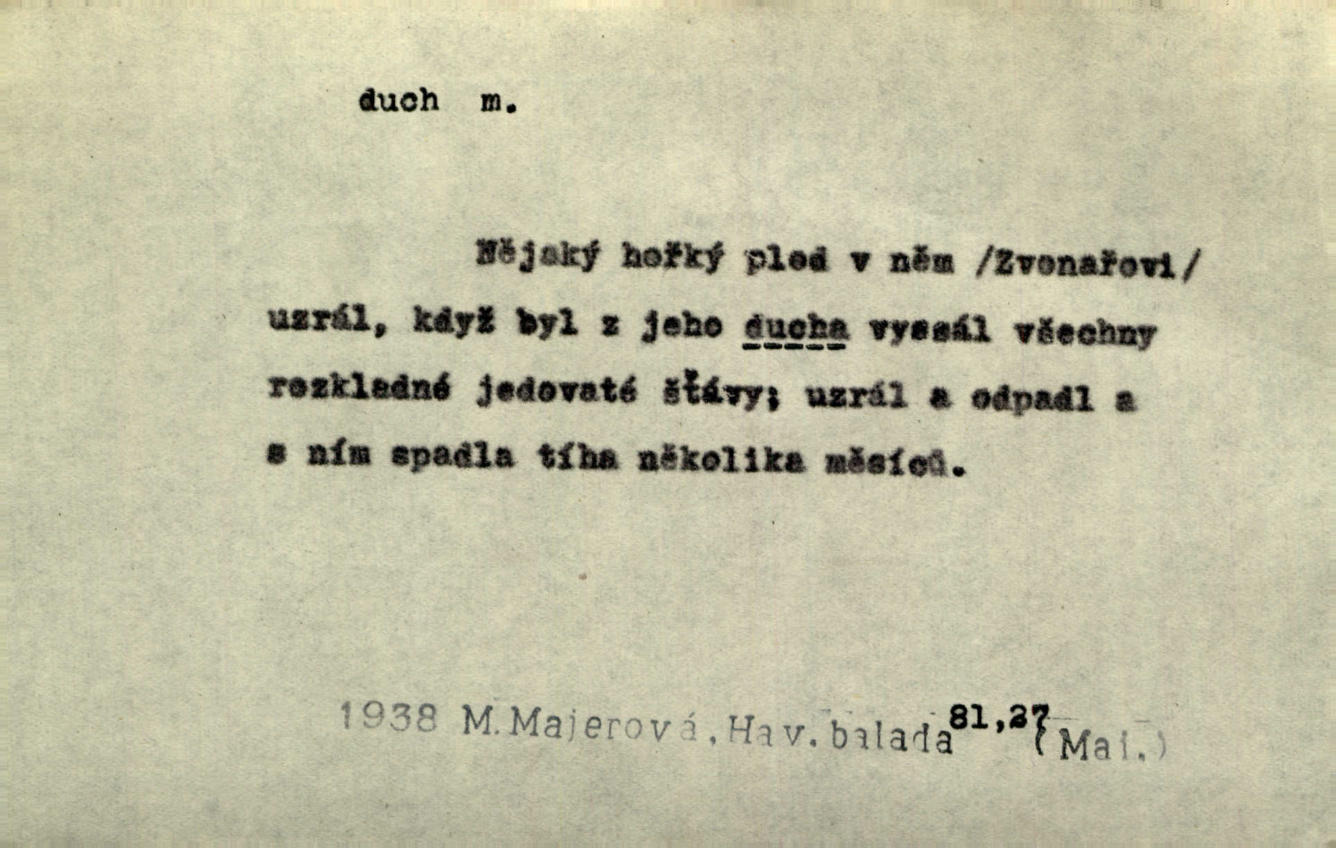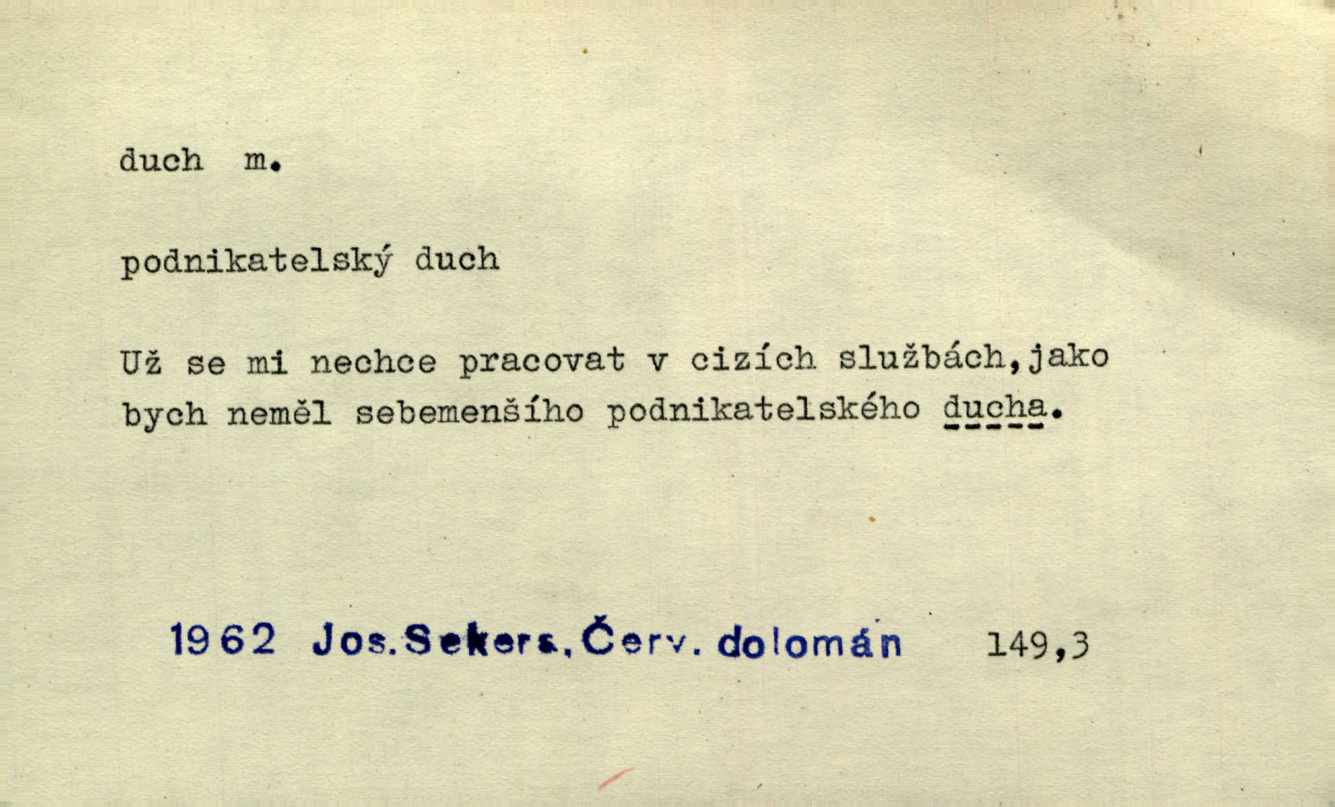 - duch, -a m. (jen sg.) myslící, cítící a jednající mohutnost člověka; duše (op. tělo). Prospíval na duchu i na těle. Herb. Sestra Rosina je na duchu ještě dítě. Prav. Chtěl aspoň duchem tady býti přítomen. Hál. Vypustiti ducha zemříti. V pátek vypustil ducha zemřel. Šim. Křečovitě sebou škubnul [umírající] a bez ducha zůstal v rukách štkající ženy mrtev. Herb. Chodil jako bez ducha mdle, zaraženě. Herb. Smála se už v duchu napřed u sebe, skrytě. Šmil. V duchu takto zvolal [Amil] s vroucností: „Ty výkvěte nebeské spanilosti!“ potichu, k sobě. Zey. Já měl tolik přítomnosti ducha, že jsem k stromu skočil a pistoli z náprsí vytrhl. Něm. D netělesná bytost. Bůh je pouhý duch. D (pl. duchové, lok. duchách) pomyslná, netělesná bytost, dobrá n. zlá; strašidlo. Dům plný duchů. Herrm. Stála před ním jako duch, aniž se toho nadál. Svět. Plíží se jako duchové. Šim. V domě Pilátově jako duchové se [kacíři] shromažďovali na modlitbách. Herb. Jen hodina duchů se nesla v dálku s věží v město spící dvanáctá. Vrch. Vyvolávati, citovati duchy (ku př. ve spiritismu). [Píseň o Hiavatě] zakládá se na podání o zázračné osobě, kterou poslal jim (Indiánům) Velký duch nejvyšší bytost božská. Slád. Jeden zlý duch vyšel ze srdce jeho zloduch, démon, zlé myšlenky. Herb. Kondelík za celou tu chvíli [co Vejvara ploval přes Vltavu] ani nehlesl, aby nevyvolal nějakého zlého ducha neštěstí. Herrm. Potom jí šeptal zlý duch, že bude sloužiti v panském domě. Prav. Zlý duch eufem. ďábel. Zlý duch posedl naši milou tetičku zloba. Herb. Cítila, že byl dobrým jejím duchem vedl ji k dobrému. Svět. D Círk. třetí božská osoba ve věrouce církví křesťanských. Duch svatý. Přijď, ó Duše přesvatý. Pís. Požehnej vás Bůh všemohoucí — Syn a Duch svatý! Hříchy proti Duchu svatému. Přen. v ustálených spojeních. Rázem byl Artur osvícen duchem svatým, uhodl, co se stalo. Herrm. Hrabec stal se už svatým duchem celého shromáždění rozhodující osobou. Herb. Pánbůh mu dává dar Ducha svatého, učení jde mu jak by hrál nadání. Něm. V lid. názvech rostlin: koření sv. Ducha čemeřice černá. D Ve spojeních o, po svatém Duše, do svatého Ducha, arch. na (o) svatý Duch svatodušní svátky. O svatý Duch to že již jistě budou doma. Jir. O svatém Duše choď ještě v kožiše. Pořek. Bába zachovávala přísloví: Do sv. Ducha nespúštěj se kožicha. Něm. D mohutnost duševní, nadání, důvtip, inteligence. Co bohů vytvořil již lidský duch. Mach. Ty máš bystrost, ty máš ducha, ale musíš mít také duši. Šim. Zvláštním duchem také nevynikal. Hlad. A co sejde s toho, má-li člověk ducha, či je-li hlupec? Havl. Z nebeť přichází věští duch. Erb. Maje dar ducha, soudil [zeman] moudře. Jir. D smýšlení. Mezi sedláky začal se jeviti podivný duch! Nebyli už tak ponížení. Herb. Duch shody a lahody se rozhostil po komnatě. Bozd. Duch nenávisti a mstivosti [v polské literatuře] protivil se mysli Jungmannově. Zel. Venkovan náš, ještě toho staročeského prostého ducha, slovo příroda nenávidí. Rais. Duch národní vane u nás v každé chýžce. Svět. Duch husitských předků našich probudil se ve Vás. Jir. Chyt’ se ho velký duch, ve Vídni si koupil predikát pýcha. Jir. D odvaha. Beneška, sotva zaslechla, že Petra z Brna poslali do Italie, sklesla na duchu. Herb. Dodav mu ducha, žádal ho, aby ničeho neříkal. Jir. D vnitřní ráz, povaha, podstata. Jako pokrokový člověk a jako průmyslník prý musí jít s duchem doby. Čap. Ch. U něho nebylo ani stopy obchodního ducha. Zey. Jednal jsem v duchu zákonů. Zey. Duch jazyka, literatury. Každý, kdo v některé vědě odborně je vzdělán, osvojuje si, jak říkáme, „ducha“ své vědy. Mas. Duch novin. D osoba duchem nadaná, osobnost. Silný karakter podrobuje si duchy slabší. Durd. Může-li tvůrčí duch úplně býti nešťastným? Jir. Časopis musejní za několik let soustředil nejvýtečnější duchy české. Zel. Třídění duchů třídění význačných lidí podle jejich smýšlení. Nastalo veliké třídění duchů. Hum. V přízemí bydleli služební duchové služebnictvo. Leg. Můj strážný duch je v limbu strážkyně! Herrm. D Lid. (ak. ducha n. duch) dech. Jen popřej málo oddechu. Duch slábne, nohy klesají. Erb. Poléhává, na duch si stýská. Baar. To je mela, že sotva ducha popadám. Šmil. Vzduch boží duch. Pořek. D Lid. (ak. ducha n. duch) plyn z konečníku, melior. prd. Má slabé útory (kdo moč nebo duch v sobě držeti nemůže). Čel. Kužela byl dobrý člověk, ale pořád jen jako z kozy duch slabý, chatrného zdraví. Rais. [K loupežníkům:] Vy duchové z kozy, kteří se ženete na poutníčka a před vojskem popotahujete ze slzavého nosu. Vanč.