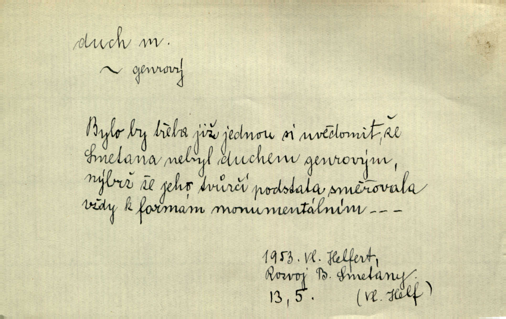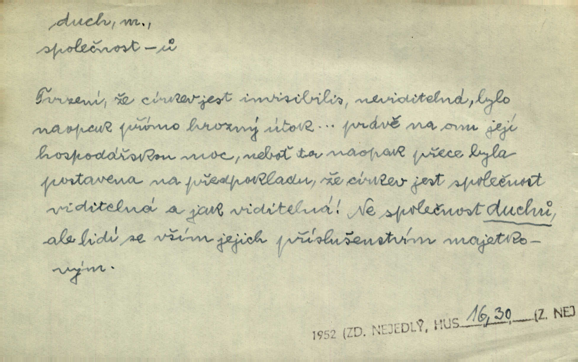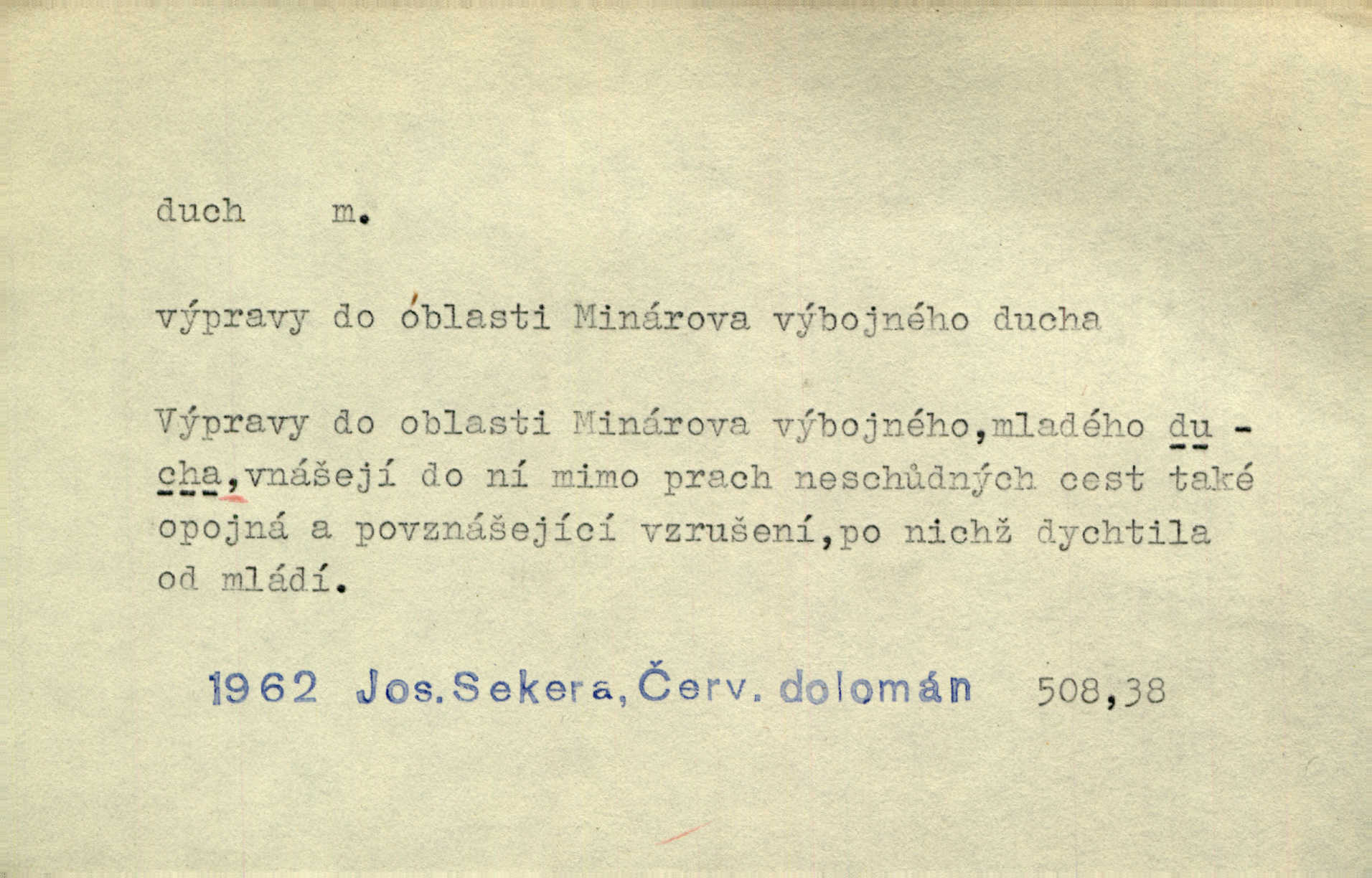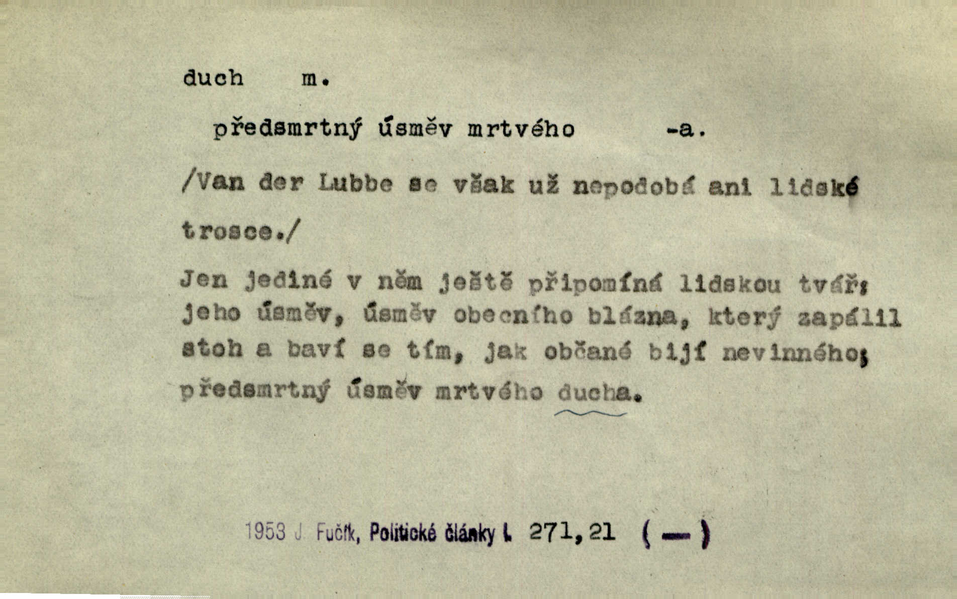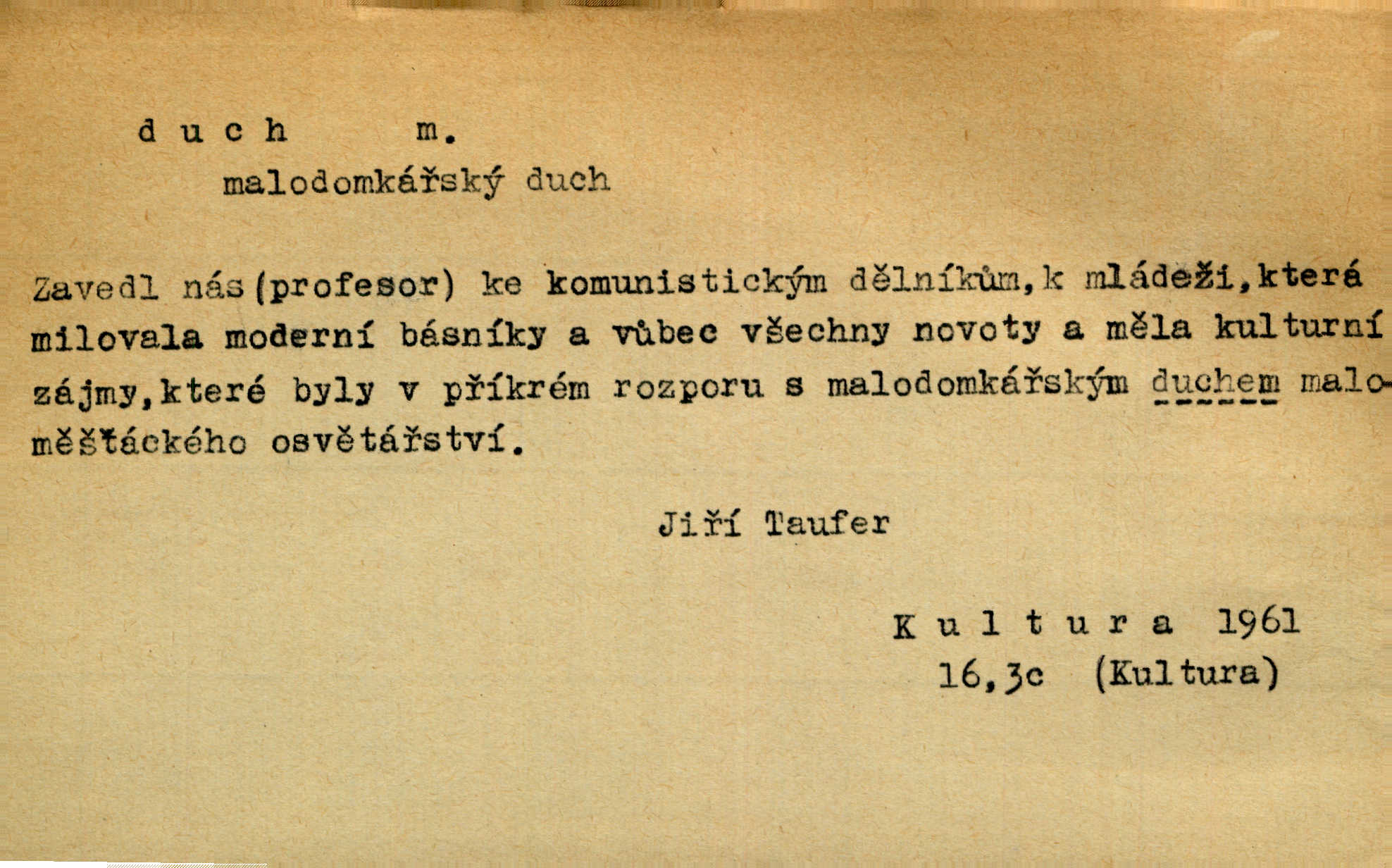 - duch, -a m. (jen sg.) myslící, cítící a jednající mohutnost člověka; duše (op. tělo). Prospíval na duchu i na těle. Herb. Sestra Rosina je na duchu ještě dítě. Prav. Chtěl aspoň duchem tady býti přítomen. Hál. Vypustiti ducha zemříti. V pátek vypustil ducha zemřel. Šim. Křečovitě sebou škubnul [umírající] a bez ducha zůstal v rukách štkající ženy mrtev. Herb. Chodil jako bez ducha mdle, zaraženě. Herb. Smála se už v duchu napřed u sebe, skrytě. Šmil. V duchu takto zvolal [Amil] s vroucností: „Ty výkvěte nebeské spanilosti!“ potichu, k sobě. Zey. Já měl tolik přítomnosti ducha, že jsem k stromu skočil a pistoli z náprsí vytrhl. Něm. D netělesná bytost. Bůh je pouhý duch. D (pl. duchové, lok. duchách) pomyslná, netělesná bytost, dobrá n. zlá; strašidlo. Dům plný duchů. Herrm. Stála před ním jako duch, aniž se toho nadál. Svět. Plíží se jako duchové. Šim. V domě Pilátově jako duchové se [kacíři] shromažďovali na modlitbách. Herb. Jen hodina duchů se nesla v dálku s věží v město spící dvanáctá. Vrch. Vyvolávati, citovati duchy (ku př. ve spiritismu). [Píseň o Hiavatě] zakládá se na podání o zázračné osobě, kterou poslal jim (Indiánům) Velký duch nejvyšší bytost božská. Slád. Jeden zlý duch vyšel ze srdce jeho zloduch, démon, zlé myšlenky. Herb. Kondelík za celou tu chvíli [co Vejvara ploval přes Vltavu] ani nehlesl, aby nevyvolal nějakého zlého ducha neštěstí. Herrm. Potom jí šeptal zlý duch, že bude sloužiti v panském domě. Prav. Zlý duch eufem. ďábel. Zlý duch posedl naši milou tetičku zloba. Herb. Cítila, že byl dobrým jejím duchem vedl ji k dobrému. Svět. D Círk. třetí božská osoba ve věrouce církví křesťanských. Duch svatý. Přijď, ó Duše přesvatý. Pís. Požehnej vás Bůh všemohoucí — Syn a Duch svatý! Hříchy proti Duchu svatému. Přen. v ustálených spojeních. Rázem byl Artur osvícen duchem svatým, uhodl, co se stalo. Herrm. Hrabec stal se už svatým duchem celého shromáždění rozhodující osobou. Herb. Pánbůh mu dává dar Ducha svatého, učení jde mu jak by hrál nadání. Něm. V lid. názvech rostlin: koření sv. Ducha čemeřice černá. D Ve spojeních o, po svatém Duše, do svatého Ducha, arch. na (o) svatý Duch svatodušní svátky. O svatý Duch to že již jistě budou doma. Jir. O svatém Duše choď ještě v kožiše. Pořek. Bába zachovávala přísloví: Do sv. Ducha nespúštěj se kožicha. Něm. D mohutnost duševní, nadání, důvtip, inteligence. Co bohů vytvořil již lidský duch. Mach. Ty máš bystrost, ty máš ducha, ale musíš mít také duši. Šim. Zvláštním duchem také nevynikal. Hlad. A co sejde s toho, má-li člověk ducha, či je-li hlupec? Havl. Z nebeť přichází věští duch. Erb. Maje dar ducha, soudil [zeman] moudře. Jir. D smýšlení. Mezi sedláky začal se jeviti podivný duch! Nebyli už tak ponížení. Herb. Duch shody a lahody se rozhostil po komnatě. Bozd. Duch nenávisti a mstivosti [v polské literatuře] protivil se mysli Jungmannově. Zel. Venkovan náš, ještě toho staročeského prostého ducha, slovo příroda nenávidí. Rais. Duch národní vane u nás v každé chýžce. Svět. Duch husitských předků našich probudil se ve Vás. Jir. Chyt’ se ho velký duch, ve Vídni si koupil predikát pýcha. Jir. D odvaha. Beneška, sotva zaslechla, že Petra z Brna poslali do Italie, sklesla na duchu. Herb. Dodav mu ducha, žádal ho, aby ničeho neříkal. Jir. D vnitřní ráz, povaha, podstata. Jako pokrokový člověk a jako průmyslník prý musí jít s duchem doby. Čap. Ch. U něho nebylo ani stopy obchodního ducha. Zey. Jednal jsem v duchu zákonů. Zey. Duch jazyka, literatury. Každý, kdo v některé vědě odborně je vzdělán, osvojuje si, jak říkáme, „ducha“ své vědy. Mas. Duch novin. D osoba duchem nadaná, osobnost. Silný karakter podrobuje si duchy slabší. Durd. Může-li tvůrčí duch úplně býti nešťastným? Jir. Časopis musejní za několik let soustředil nejvýtečnější duchy české. Zel. Třídění duchů třídění význačných lidí podle jejich smýšlení. Nastalo veliké třídění duchů. Hum. V přízemí bydleli služební duchové služebnictvo. Leg. Můj strážný duch je v limbu strážkyně! Herrm. D Lid. (ak. ducha n. duch) dech. Jen popřej málo oddechu. Duch slábne, nohy klesají. Erb. Poléhává, na duch si stýská. Baar. To je mela, že sotva ducha popadám. Šmil. Vzduch boží duch. Pořek. D Lid. (ak. ducha n. duch) plyn z konečníku, melior. prd. Má slabé útory (kdo moč nebo duch v sobě držeti nemůže). Čel. Kužela byl dobrý člověk, ale pořád jen jako z kozy duch slabý, chatrného zdraví. Rais. [K loupežníkům:] Vy duchové z kozy, kteří se ženete na poutníčka a před vojskem popotahujete ze slzavého nosu. Vanč.