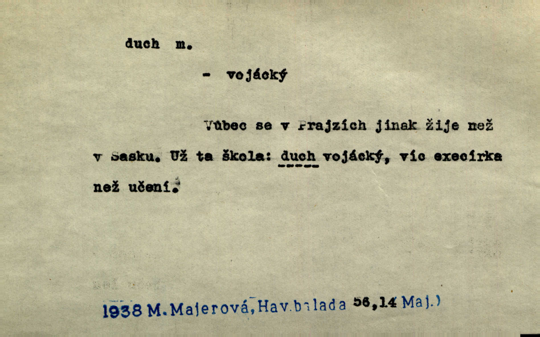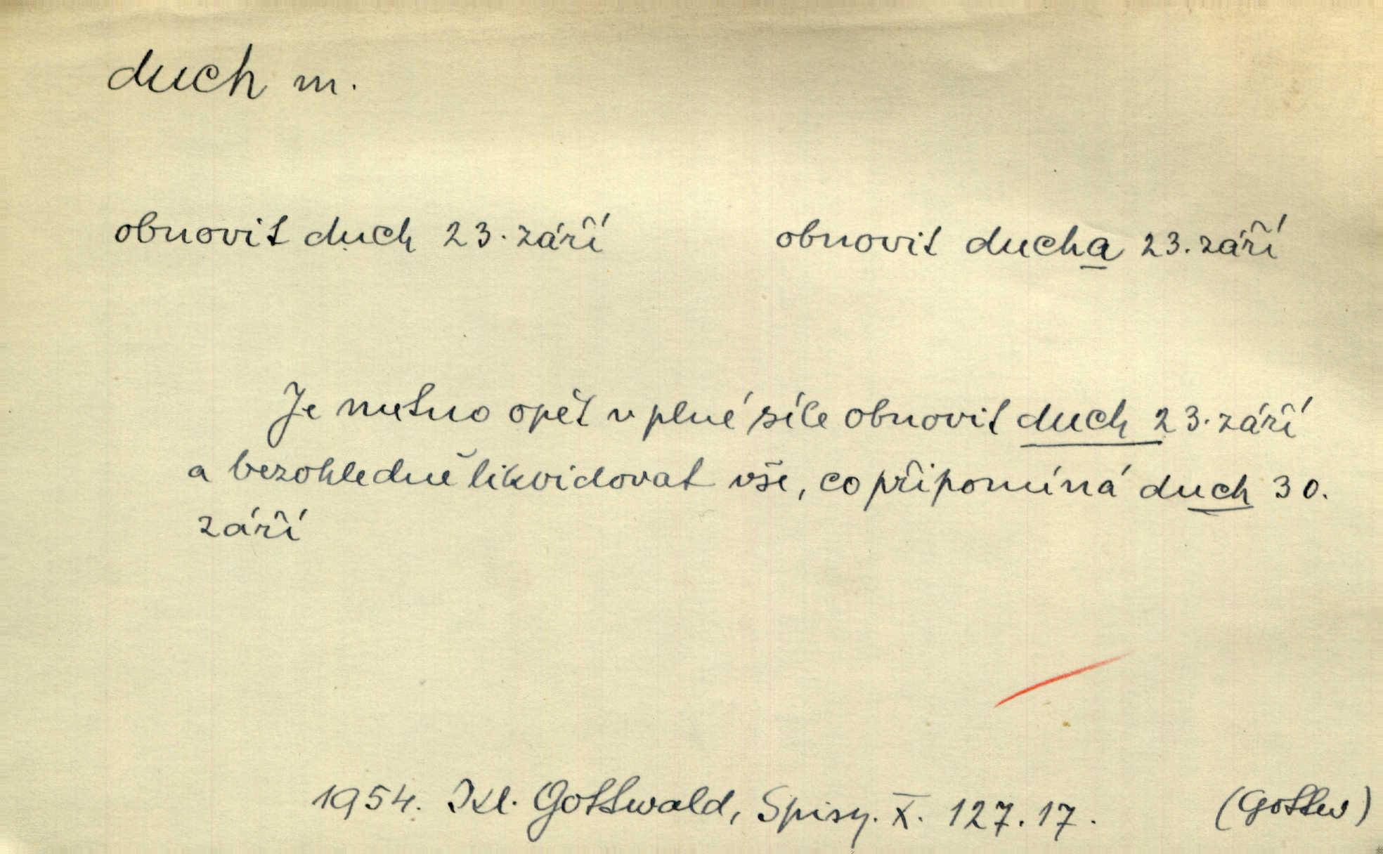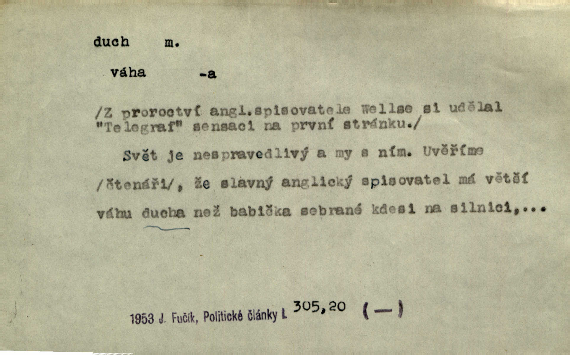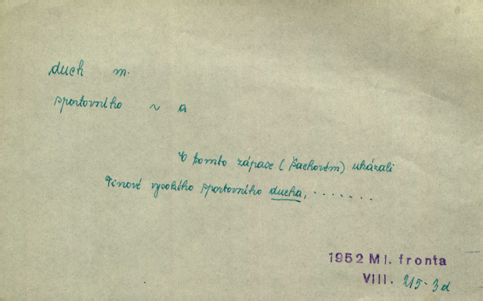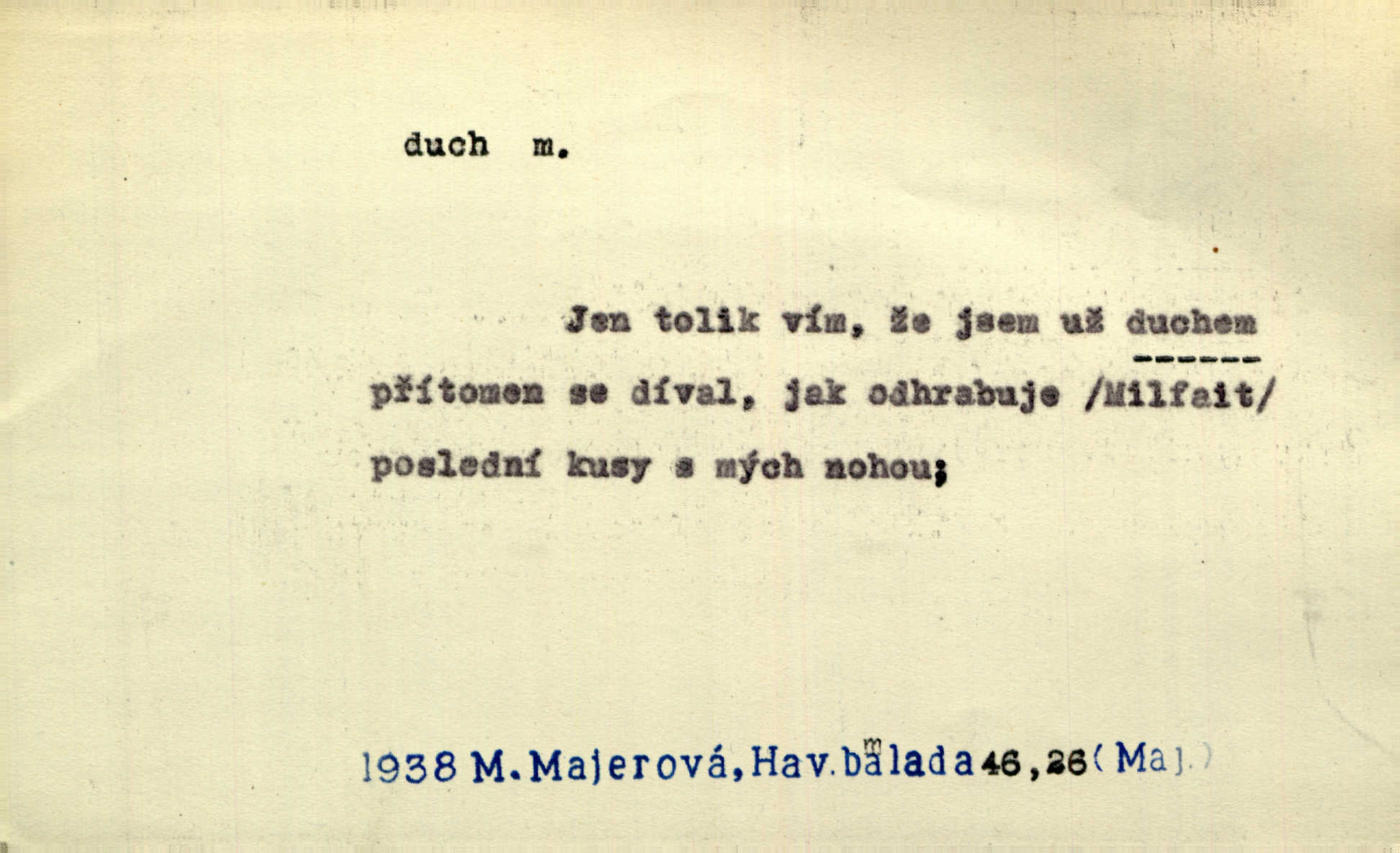 - duch, -a m. (jen sg.) myslící, cítící a jednající mohutnost člověka; duše (op. tělo). Prospíval na duchu i na těle. Herb. Sestra Rosina je na duchu ještě dítě. Prav. Chtěl aspoň duchem tady býti přítomen. Hál. Vypustiti ducha zemříti. V pátek vypustil ducha zemřel. Šim. Křečovitě sebou škubnul [umírající] a bez ducha zůstal v rukách štkající ženy mrtev. Herb. Chodil jako bez ducha mdle, zaraženě. Herb. Smála se už v duchu napřed u sebe, skrytě. Šmil. V duchu takto zvolal [Amil] s vroucností: „Ty výkvěte nebeské spanilosti!“ potichu, k sobě. Zey. Já měl tolik přítomnosti ducha, že jsem k stromu skočil a pistoli z náprsí vytrhl. Něm. D netělesná bytost. Bůh je pouhý duch. D (pl. duchové, lok. duchách) pomyslná, netělesná bytost, dobrá n. zlá; strašidlo. Dům plný duchů. Herrm. Stála před ním jako duch, aniž se toho nadál. Svět. Plíží se jako duchové. Šim. V domě Pilátově jako duchové se [kacíři] shromažďovali na modlitbách. Herb. Jen hodina duchů se nesla v dálku s věží v město spící dvanáctá. Vrch. Vyvolávati, citovati duchy (ku př. ve spiritismu). [Píseň o Hiavatě] zakládá se na podání o zázračné osobě, kterou poslal jim (Indiánům) Velký duch nejvyšší bytost božská. Slád. Jeden zlý duch vyšel ze srdce jeho zloduch, démon, zlé myšlenky. Herb. Kondelík za celou tu chvíli [co Vejvara ploval přes Vltavu] ani nehlesl, aby nevyvolal nějakého zlého ducha neštěstí. Herrm. Potom jí šeptal zlý duch, že bude sloužiti v panském domě. Prav. Zlý duch eufem. ďábel. Zlý duch posedl naši milou tetičku zloba. Herb. Cítila, že byl dobrým jejím duchem vedl ji k dobrému. Svět. D Círk. třetí božská osoba ve věrouce církví křesťanských. Duch svatý. Přijď, ó Duše přesvatý. Pís. Požehnej vás Bůh všemohoucí — Syn a Duch svatý! Hříchy proti Duchu svatému. Přen. v ustálených spojeních. Rázem byl Artur osvícen duchem svatým, uhodl, co se stalo. Herrm. Hrabec stal se už svatým duchem celého shromáždění rozhodující osobou. Herb. Pánbůh mu dává dar Ducha svatého, učení jde mu jak by hrál nadání. Něm. V lid. názvech rostlin: koření sv. Ducha čemeřice černá. D Ve spojeních o, po svatém Duše, do svatého Ducha, arch. na (o) svatý Duch svatodušní svátky. O svatý Duch to že již jistě budou doma. Jir. O svatém Duše choď ještě v kožiše. Pořek. Bába zachovávala přísloví: Do sv. Ducha nespúštěj se kožicha. Něm. D mohutnost duševní, nadání, důvtip, inteligence. Co bohů vytvořil již lidský duch. Mach. Ty máš bystrost, ty máš ducha, ale musíš mít také duši. Šim. Zvláštním duchem také nevynikal. Hlad. A co sejde s toho, má-li člověk ducha, či je-li hlupec? Havl. Z nebeť přichází věští duch. Erb. Maje dar ducha, soudil [zeman] moudře. Jir. D smýšlení. Mezi sedláky začal se jeviti podivný duch! Nebyli už tak ponížení. Herb. Duch shody a lahody se rozhostil po komnatě. Bozd. Duch nenávisti a mstivosti [v polské literatuře] protivil se mysli Jungmannově. Zel. Venkovan náš, ještě toho staročeského prostého ducha, slovo příroda nenávidí. Rais. Duch národní vane u nás v každé chýžce. Svět. Duch husitských předků našich probudil se ve Vás. Jir. Chyt’ se ho velký duch, ve Vídni si koupil predikát pýcha. Jir. D odvaha. Beneška, sotva zaslechla, že Petra z Brna poslali do Italie, sklesla na duchu. Herb. Dodav mu ducha, žádal ho, aby ničeho neříkal. Jir. D vnitřní ráz, povaha, podstata. Jako pokrokový člověk a jako průmyslník prý musí jít s duchem doby. Čap. Ch. U něho nebylo ani stopy obchodního ducha. Zey. Jednal jsem v duchu zákonů. Zey. Duch jazyka, literatury. Každý, kdo v některé vědě odborně je vzdělán, osvojuje si, jak říkáme, „ducha“ své vědy. Mas. Duch novin. D osoba duchem nadaná, osobnost. Silný karakter podrobuje si duchy slabší. Durd. Může-li tvůrčí duch úplně býti nešťastným? Jir. Časopis musejní za několik let soustředil nejvýtečnější duchy české. Zel. Třídění duchů třídění význačných lidí podle jejich smýšlení. Nastalo veliké třídění duchů. Hum. V přízemí bydleli služební duchové služebnictvo. Leg. Můj strážný duch je v limbu strážkyně! Herrm. D Lid. (ak. ducha n. duch) dech. Jen popřej málo oddechu. Duch slábne, nohy klesají. Erb. Poléhává, na duch si stýská. Baar. To je mela, že sotva ducha popadám. Šmil. Vzduch boží duch. Pořek. D Lid. (ak. ducha n. duch) plyn z konečníku, melior. prd. Má slabé útory (kdo moč nebo duch v sobě držeti nemůže). Čel. Kužela byl dobrý člověk, ale pořád jen jako z kozy duch slabý, chatrného zdraví. Rais. [K loupežníkům:] Vy duchové z kozy, kteří se ženete na poutníčka a před vojskem popotahujete ze slzavého nosu. Vanč.