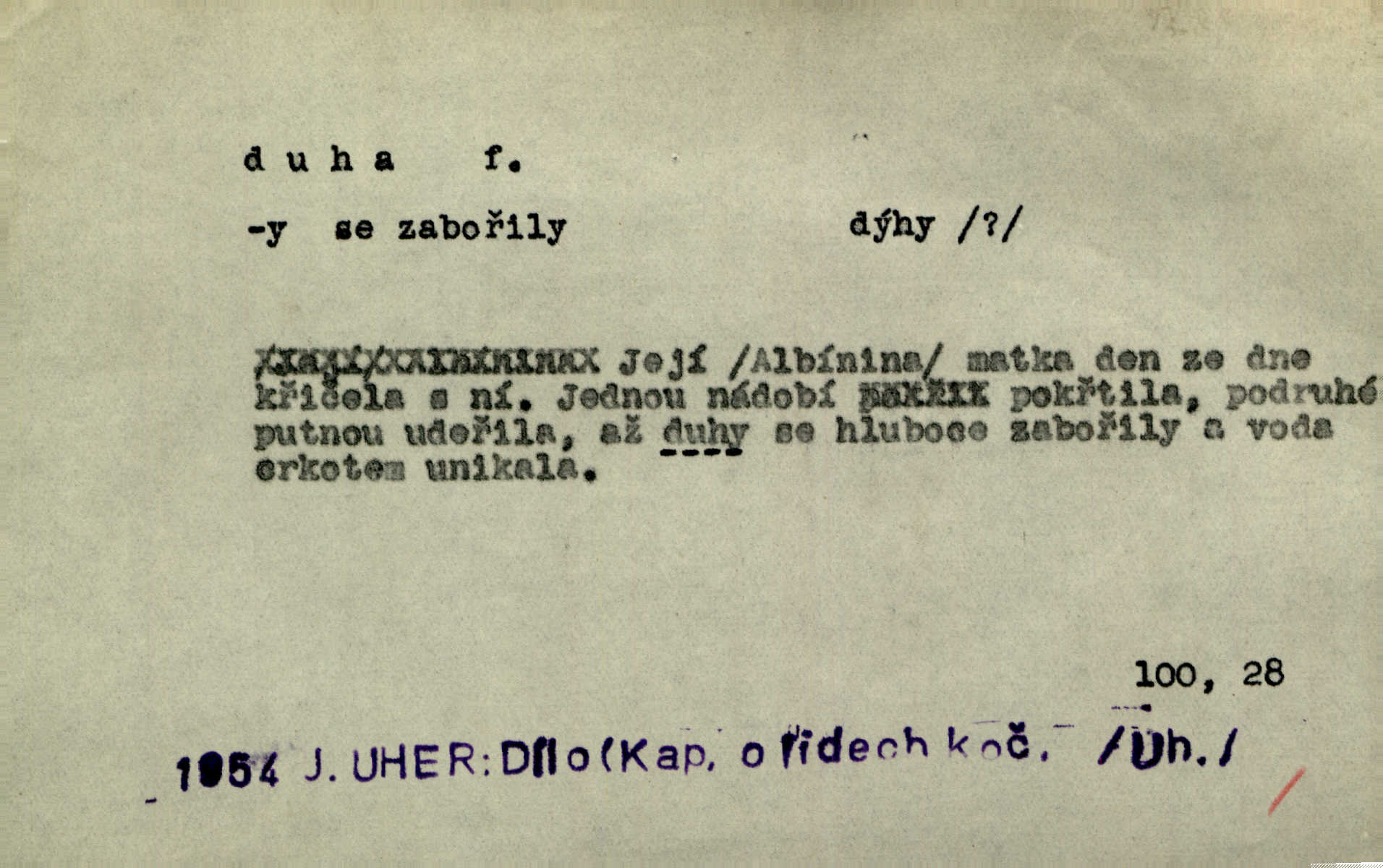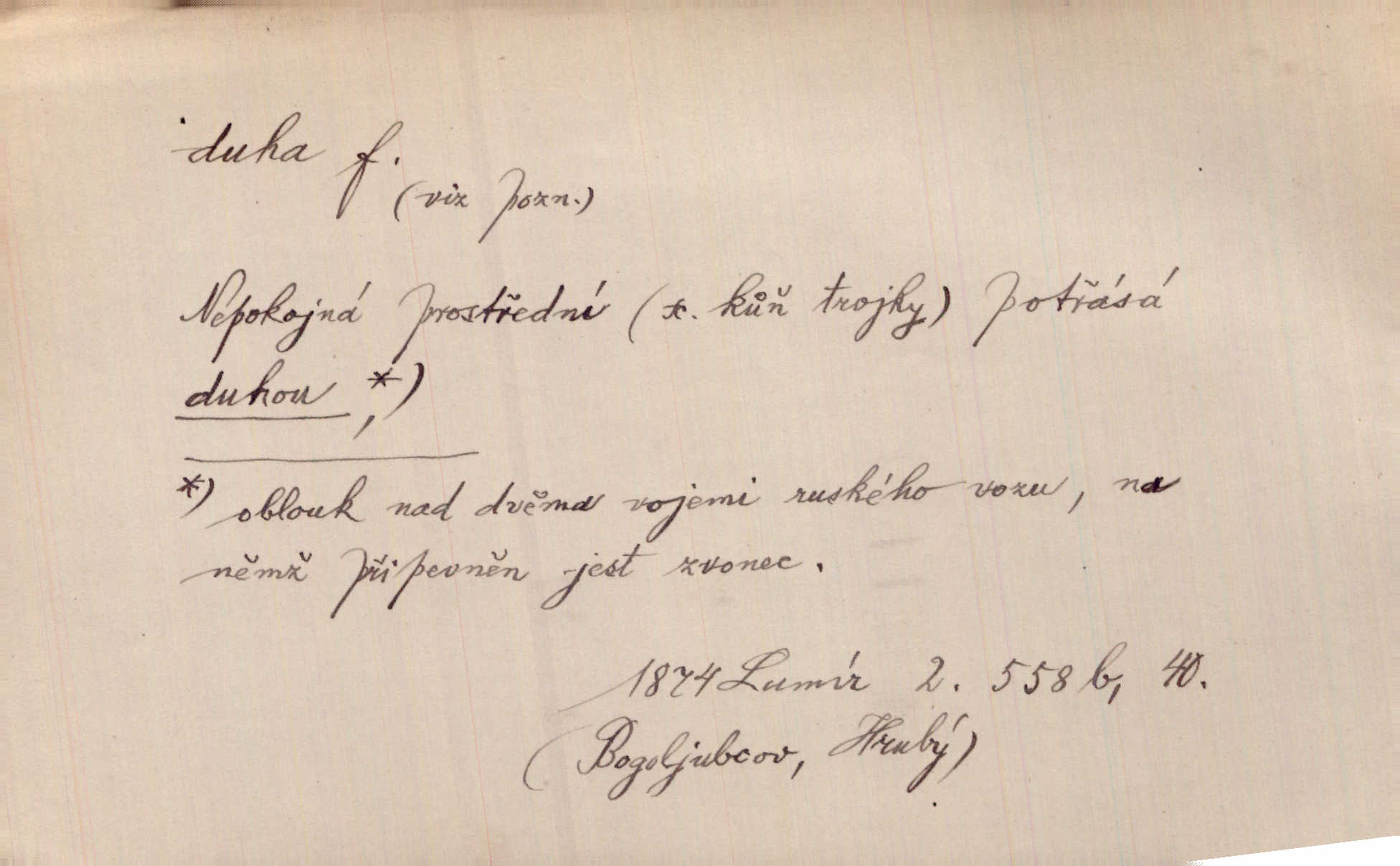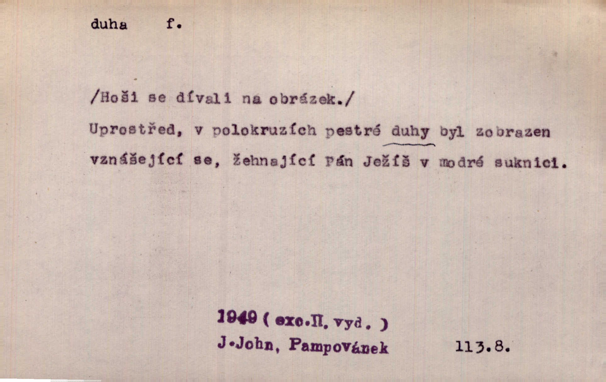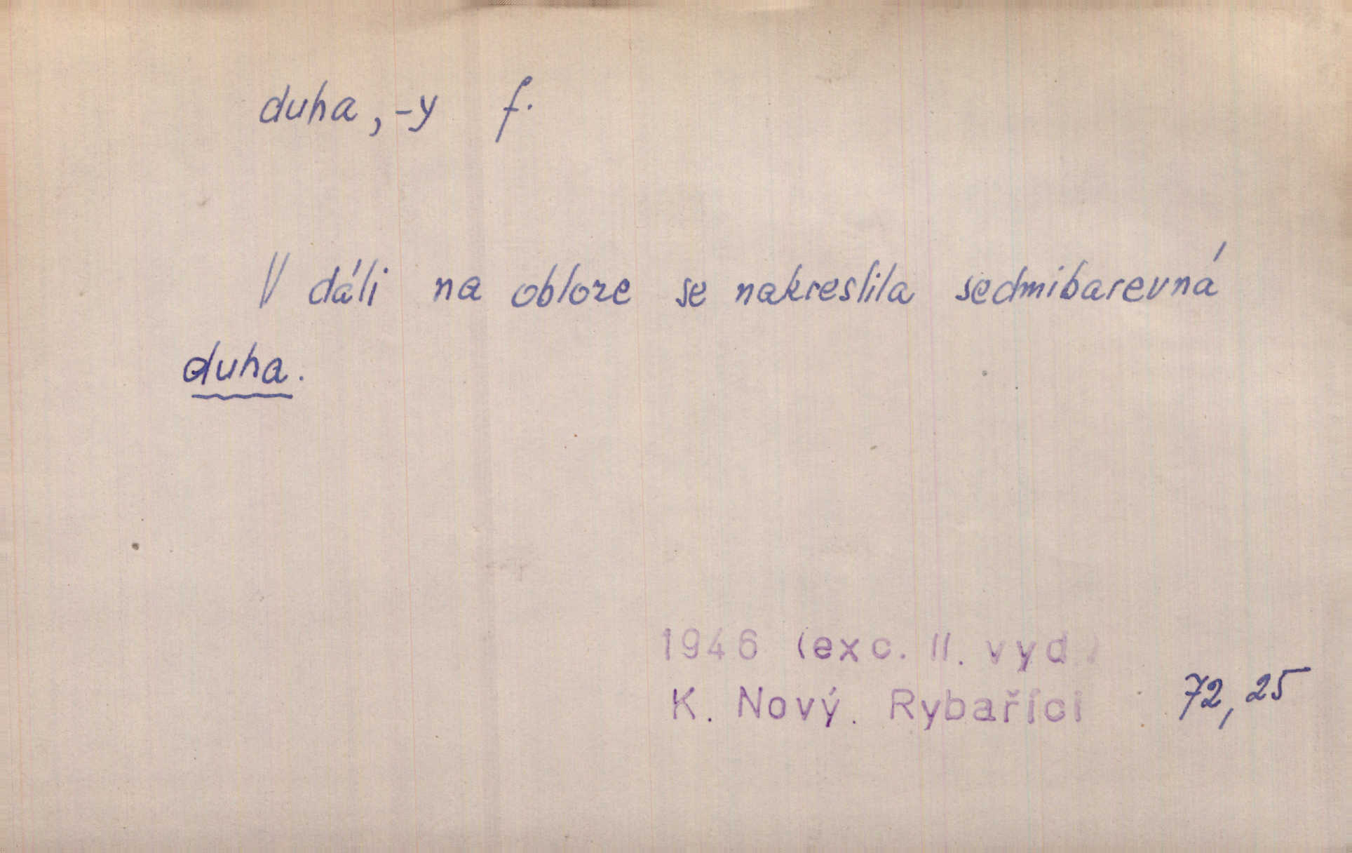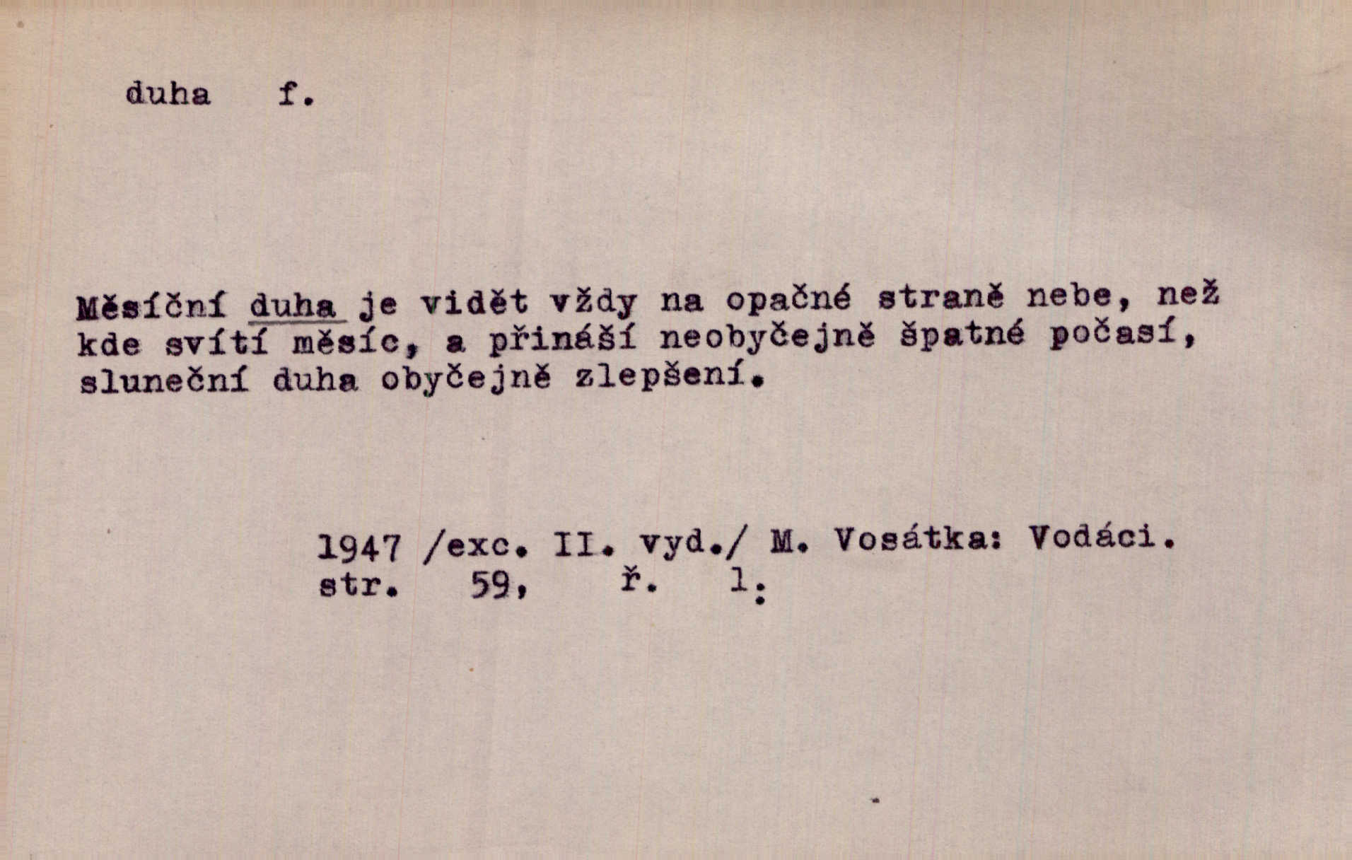 - duha, -y f. optický úkaz vznikající lomem světelných paprsků ve vodních kapkách, zejm. lomem slunečních paprsků v kapkách dešťových. Nad Silůvkou sklenula se překrásná duha. A. Mrš. Duha hlavní. Duha vedlejší s opačným pořádkem barev. Přen. o něčem pestrém. Stobarevnou duhu v širý věnec splítají [kvítky]. Krás. Na pasu pak vyšívaném pruhu zříti skvostů vyjasněnou duhu. Heyd. Nad rozpoutanou bouří se rozklene melodická duha (v h-moll). K. Čap. Nad naší zemí vzplane duha míru. Mach. Všichni pili jako duhy mnoho. Herb. D Bedn. dřevěná deska, dužina. [Bednář] pracoval zde v dílně, kde krájeli duhy sudů. Lang. D část koňského postroje u Rusů. Duha jako čásť koňské postroje jest dřevěný oblouk, pnoucí se nad krkem koňovým od jedné oje ke druhé; mezi nimi zapřažen jest kůň. Hol.