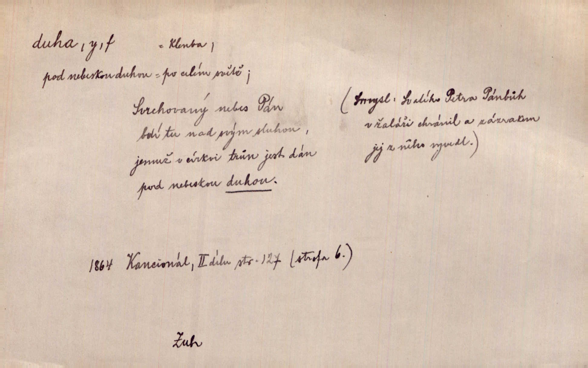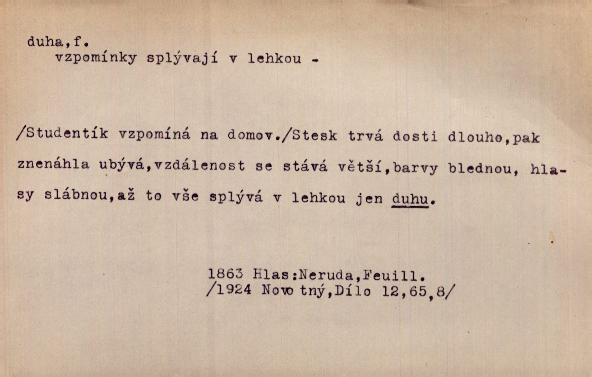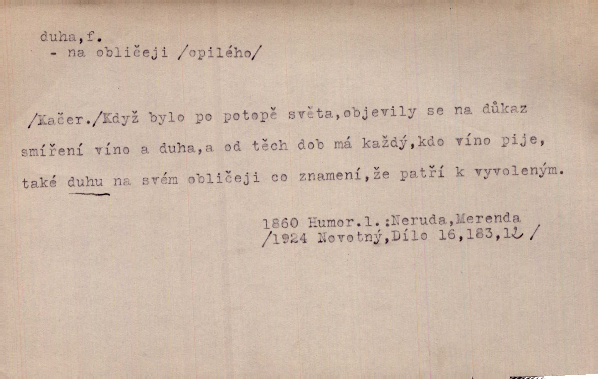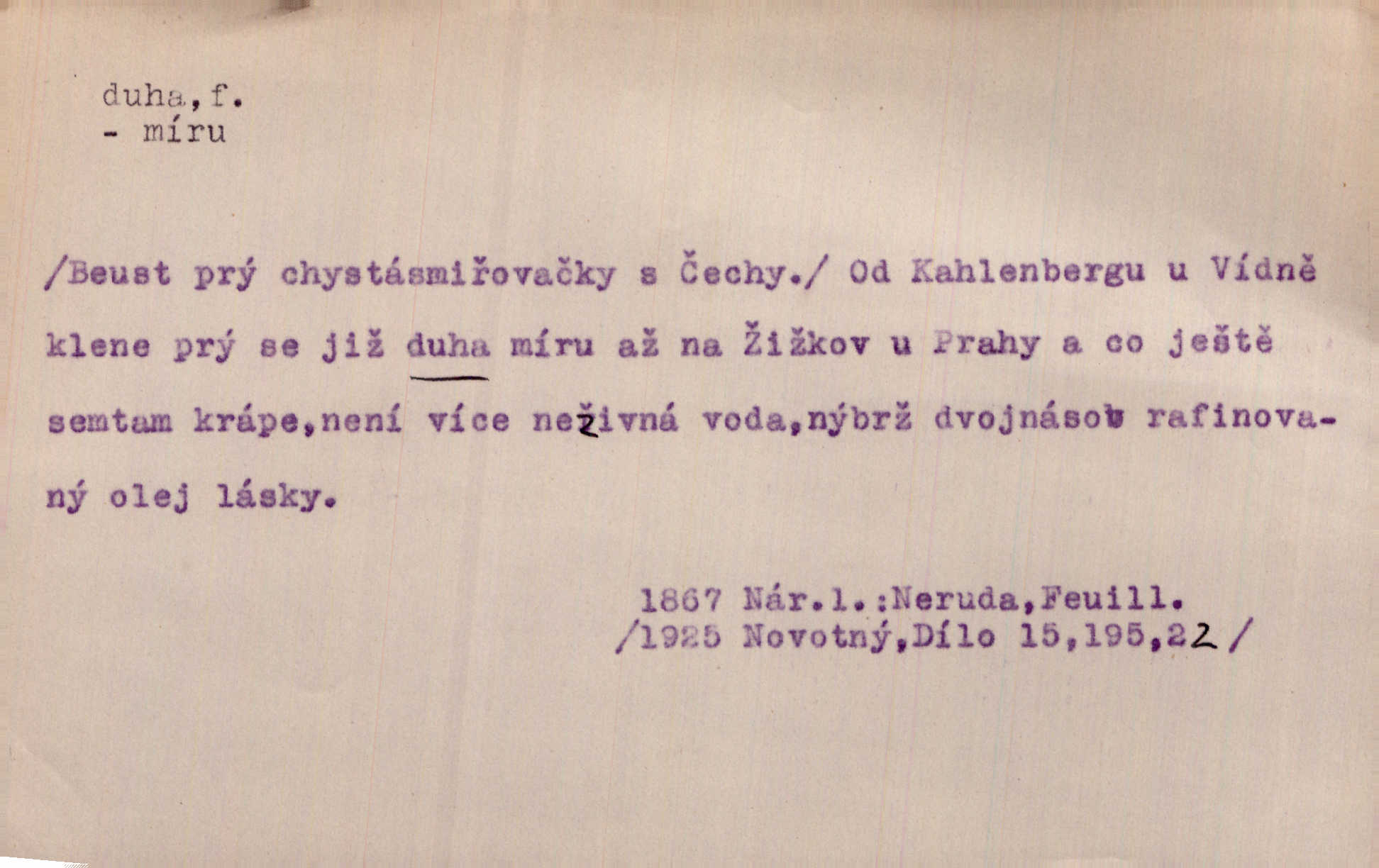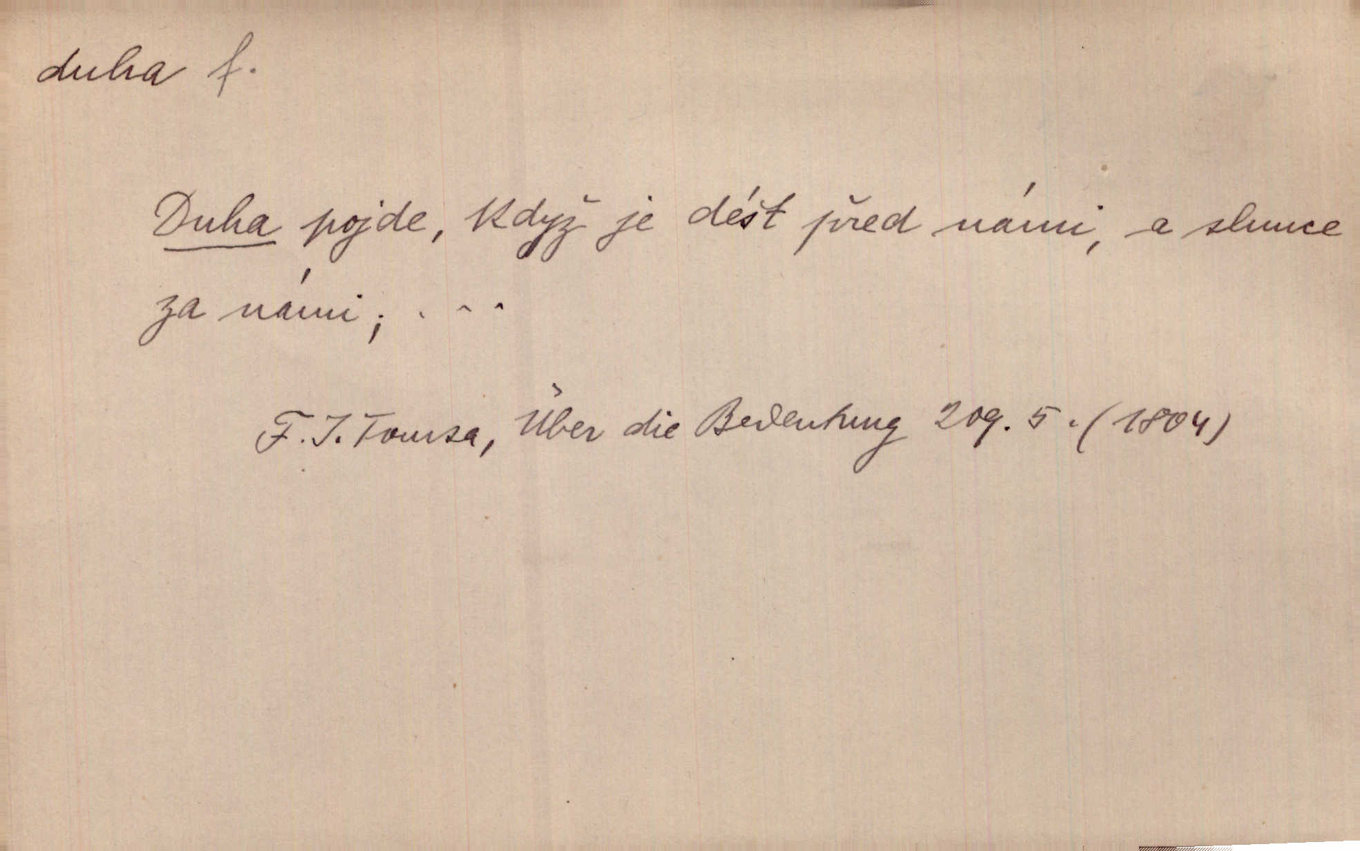 - duha, -y f. optický úkaz vznikající lomem světelných paprsků ve vodních kapkách, zejm. lomem slunečních paprsků v kapkách dešťových. Nad Silůvkou sklenula se překrásná duha. A. Mrš. Duha hlavní. Duha vedlejší s opačným pořádkem barev. Přen. o něčem pestrém. Stobarevnou duhu v širý věnec splítají [kvítky]. Krás. Na pasu pak vyšívaném pruhu zříti skvostů vyjasněnou duhu. Heyd. Nad rozpoutanou bouří se rozklene melodická duha (v h-moll). K. Čap. Nad naší zemí vzplane duha míru. Mach. Všichni pili jako duhy mnoho. Herb. D Bedn. dřevěná deska, dužina. [Bednář] pracoval zde v dílně, kde krájeli duhy sudů. Lang. D část koňského postroje u Rusů. Duha jako čásť koňské postroje jest dřevěný oblouk, pnoucí se nad krkem koňovým od jedné oje ke druhé; mezi nimi zapřažen jest kůň. Hol.
