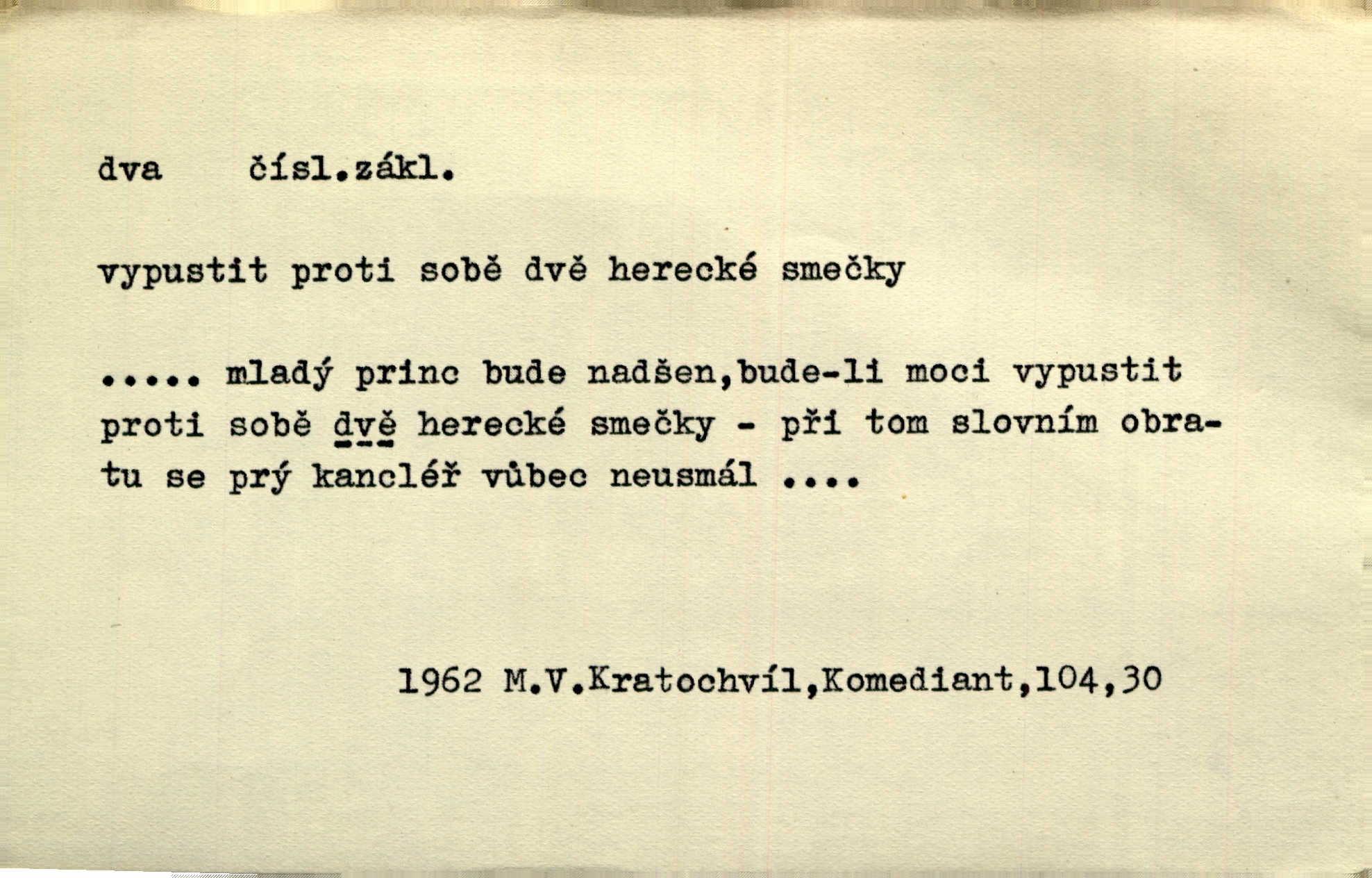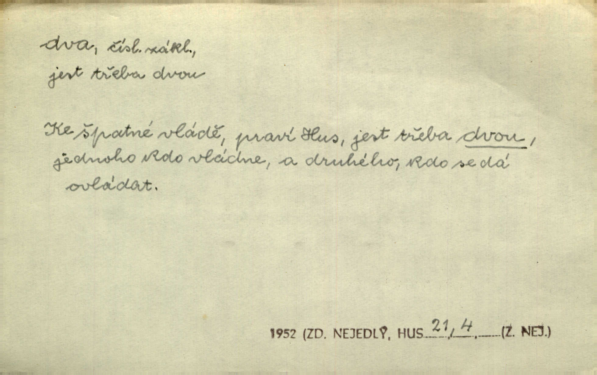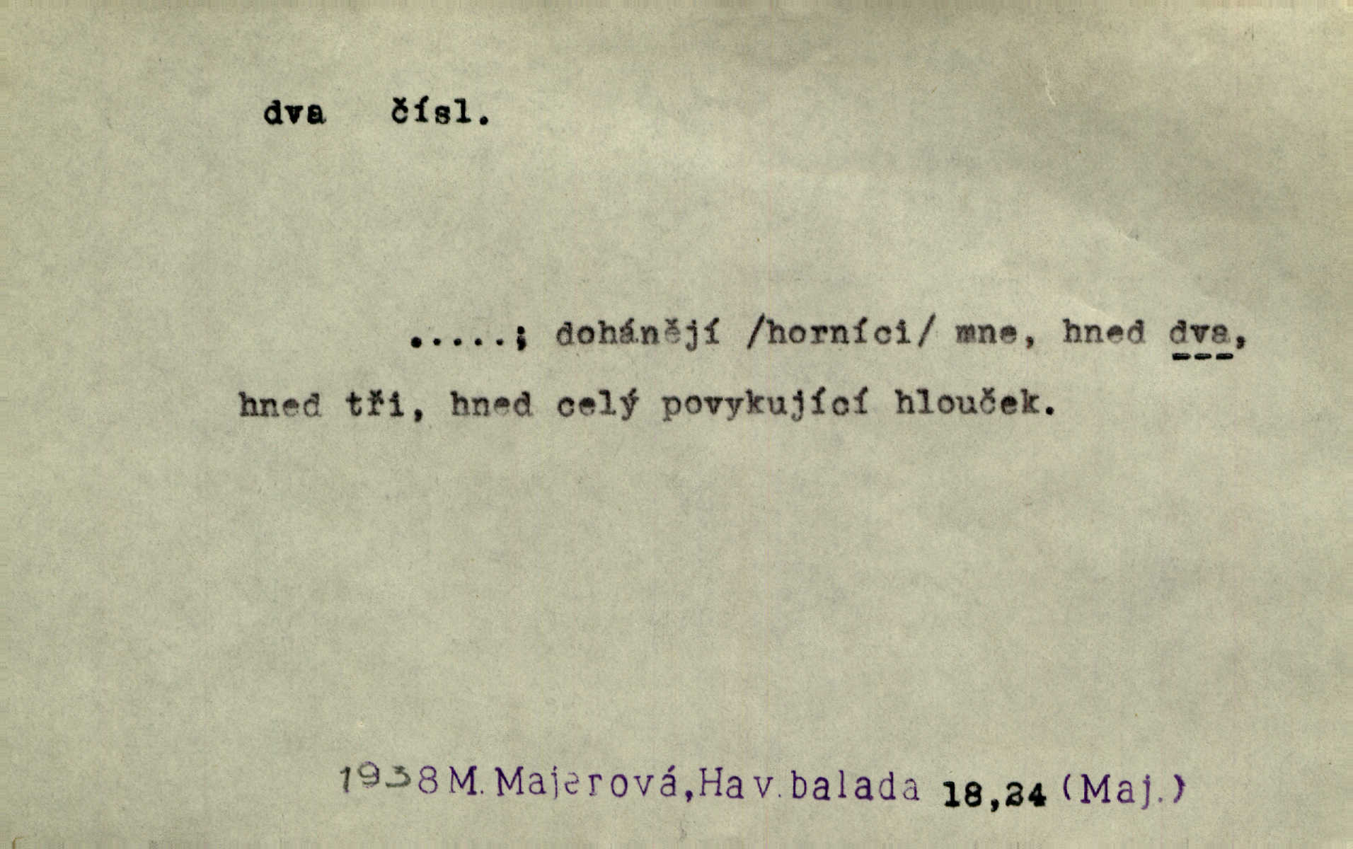 - dva, dvě čísl. (gen. lok. dvou, dat. instr. dvěma). Proti němu vyrazili z houštiny dva mužští a za nimi dva velcí psi. Jir. Na čísla on [čtenář] čeká svěží, ve vlasech když dva si leží. Dyk. Jen dva tři hosté dopíjeli černou kávu několik málo hostí. Dyk. Přišel zástup mnichů, dva a dva po dvou. Havl. A jak překrásná měli oba dva [Matěj a Matouš] hospodářství! Havl. Ve dvě šel opět z domu ve dvě hodiny. Šmil. „Že tě zavřu do chlívka!“ Janek řval za dva dvojnásob. A. Mrš. Pracovati za dva, míti sílu za dva a p. Sloužiti dvěma pánům kolísati mezi dvěma činnostmi. Býti ve dvou ohních, mezi dvěma ohni nevěděti kudy kam, býti nerozhodný. Zabíti dvě mouchy jednou ranou vyříditi dvě věci najednou. Seděti na dvou židlích, míti dvě želízka v ohni jednati dvojace. Jak se podívala, ještěrka! Celá matka. O to bude teprv na dva kraje nůž řízná, rázná. Sez. Žert. Oči se dívaly zároveň na dvě meze byly šilhavé. Něm.