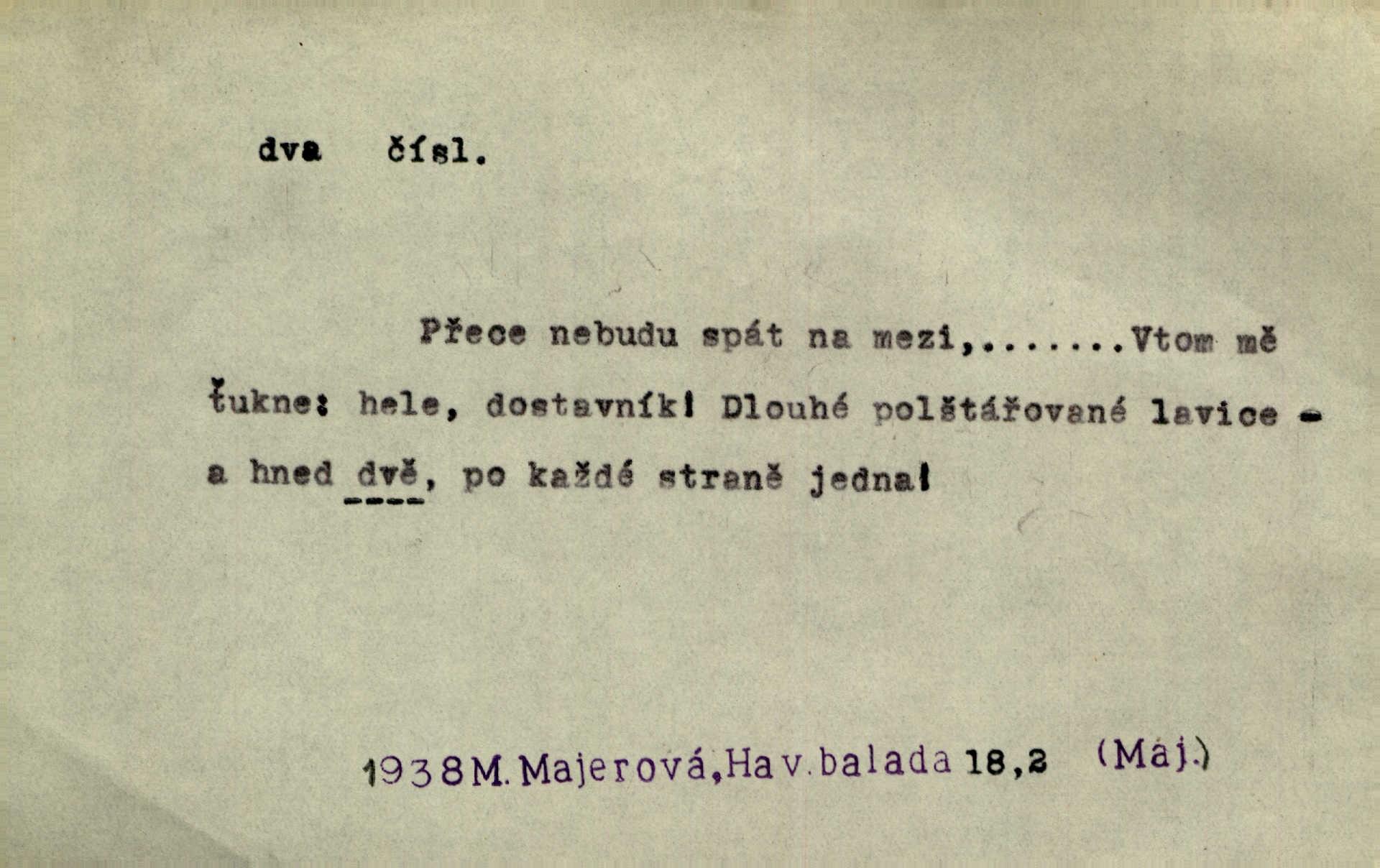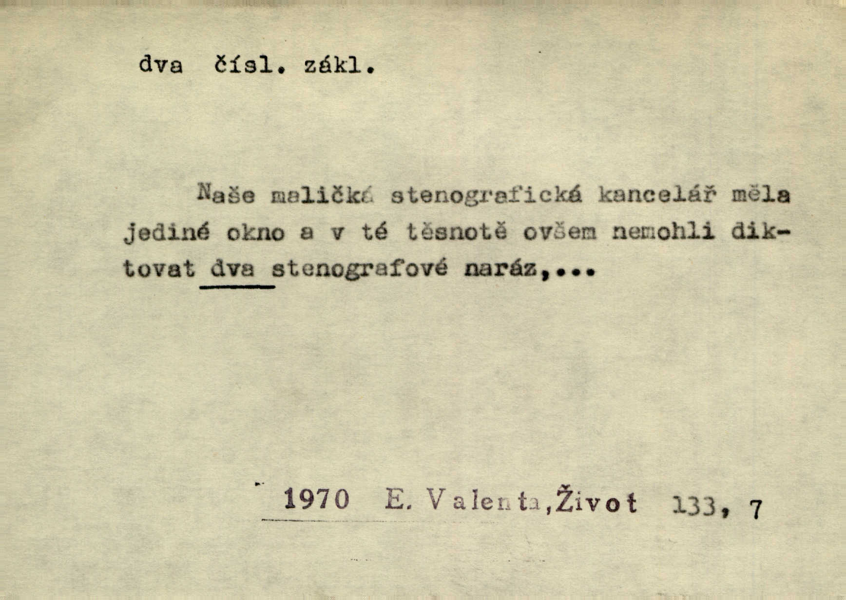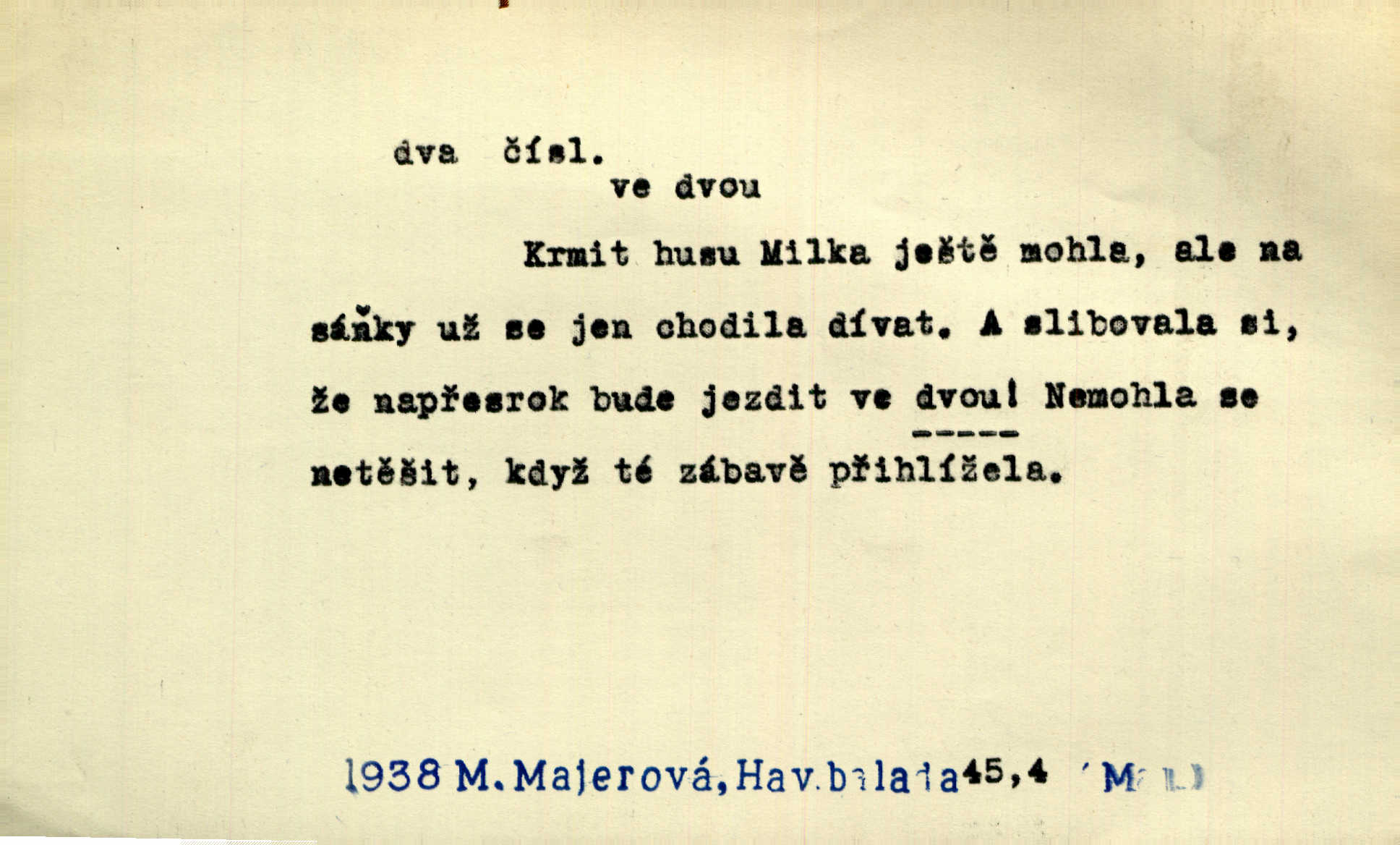 - dva, dvě čísl. (gen. lok. dvou, dat. instr. dvěma). Proti němu vyrazili z houštiny dva mužští a za nimi dva velcí psi. Jir. Na čísla on [čtenář] čeká svěží, ve vlasech když dva si leží. Dyk. Jen dva tři hosté dopíjeli černou kávu několik málo hostí. Dyk. Přišel zástup mnichů, dva a dva po dvou. Havl. A jak překrásná měli oba dva [Matěj a Matouš] hospodářství! Havl. Ve dvě šel opět z domu ve dvě hodiny. Šmil. „Že tě zavřu do chlívka!“ Janek řval za dva dvojnásob. A. Mrš. Pracovati za dva, míti sílu za dva a p. Sloužiti dvěma pánům kolísati mezi dvěma činnostmi. Býti ve dvou ohních, mezi dvěma ohni nevěděti kudy kam, býti nerozhodný. Zabíti dvě mouchy jednou ranou vyříditi dvě věci najednou. Seděti na dvou židlích, míti dvě želízka v ohni jednati dvojace. Jak se podívala, ještěrka! Celá matka. O to bude teprv na dva kraje nůž řízná, rázná. Sez. Žert. Oči se dívaly zároveň na dvě meze byly šilhavé. Něm.