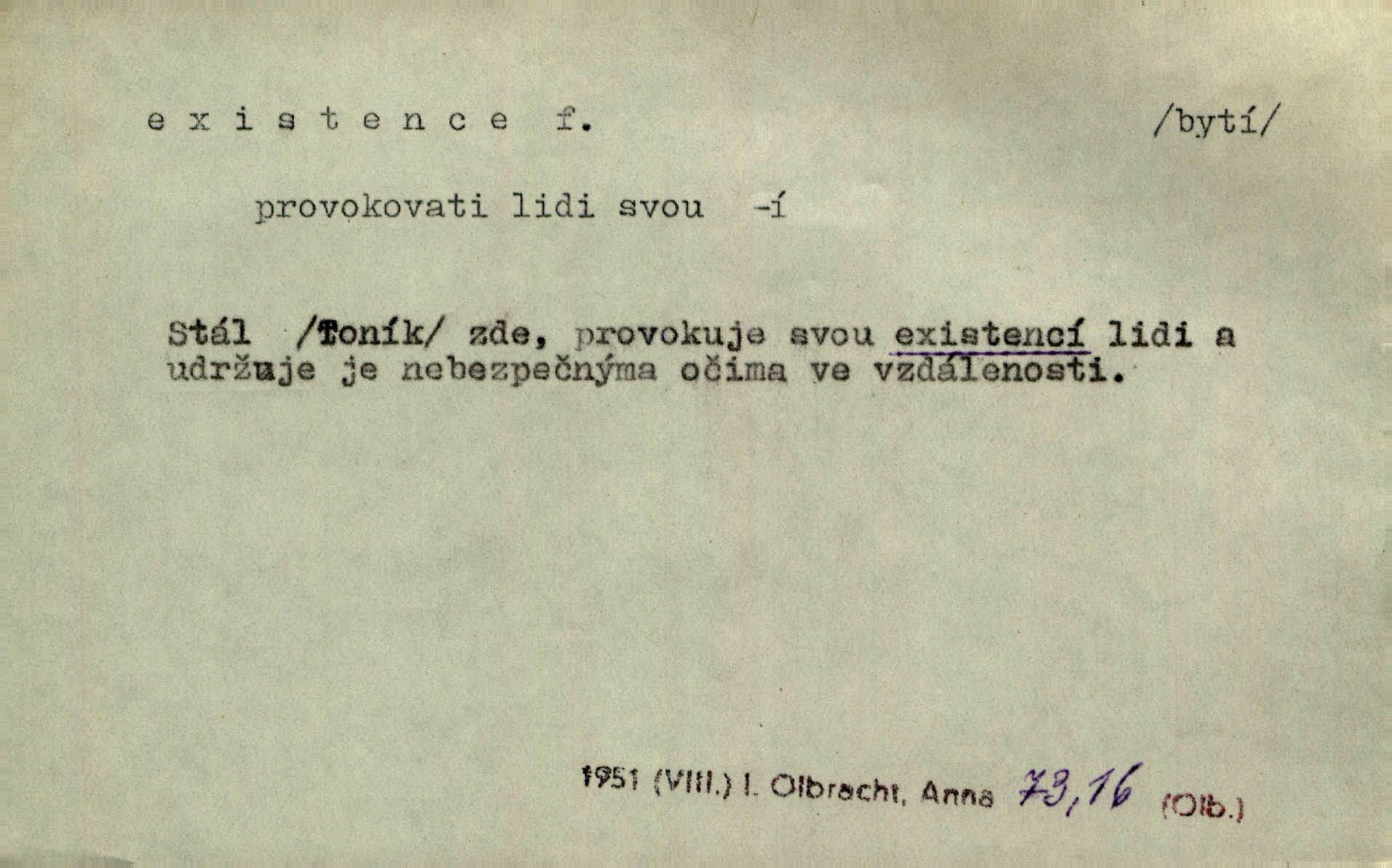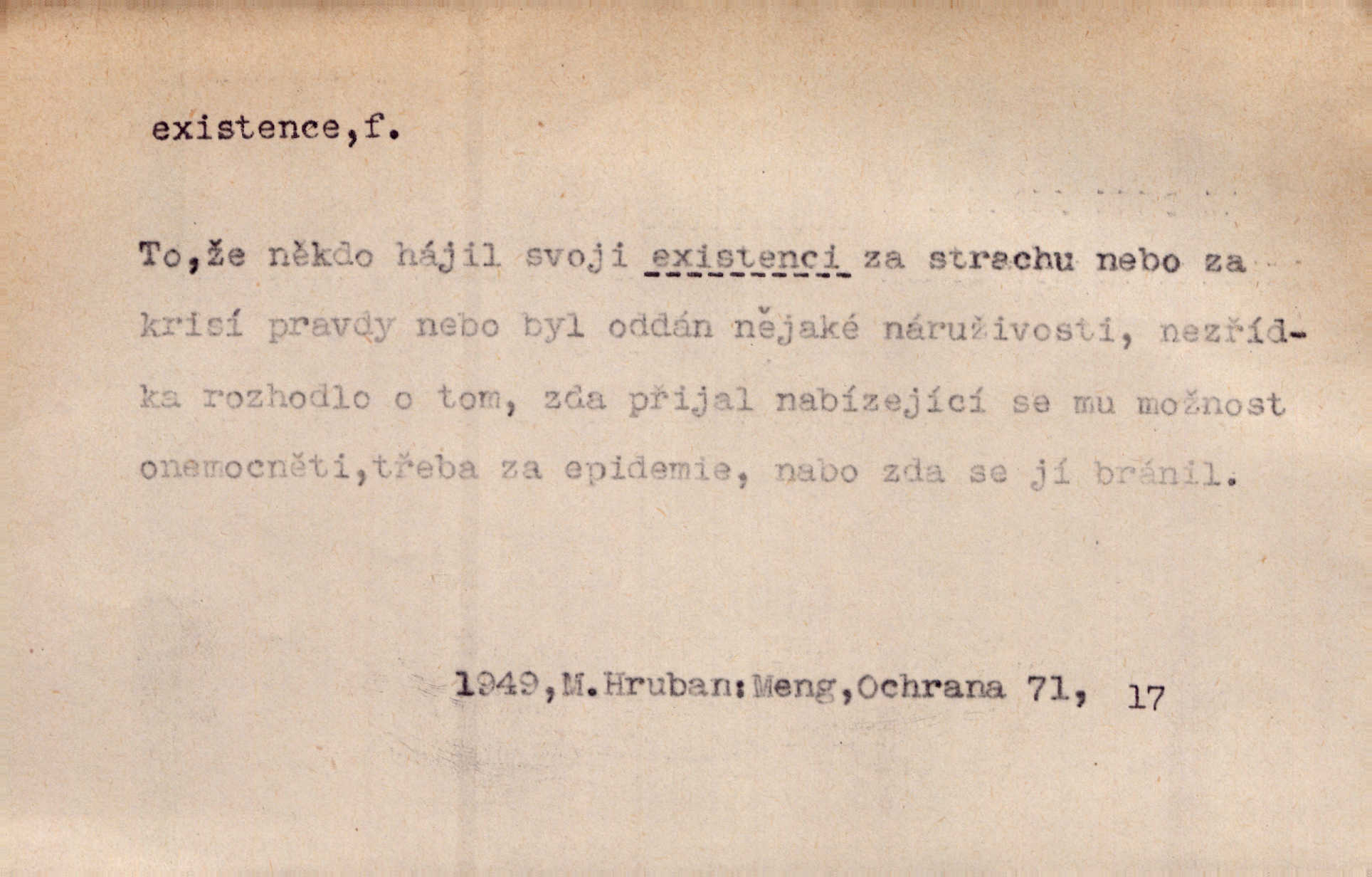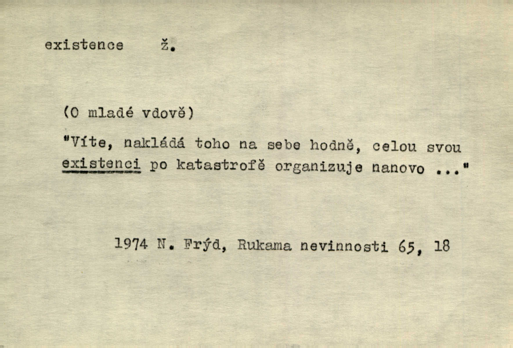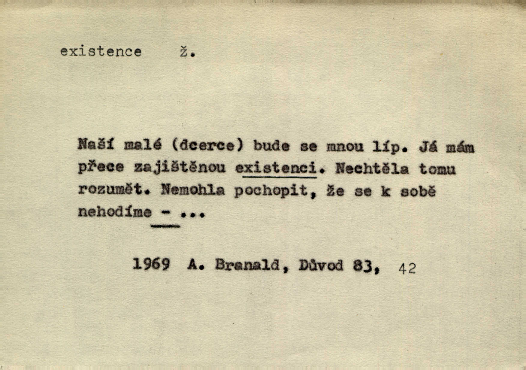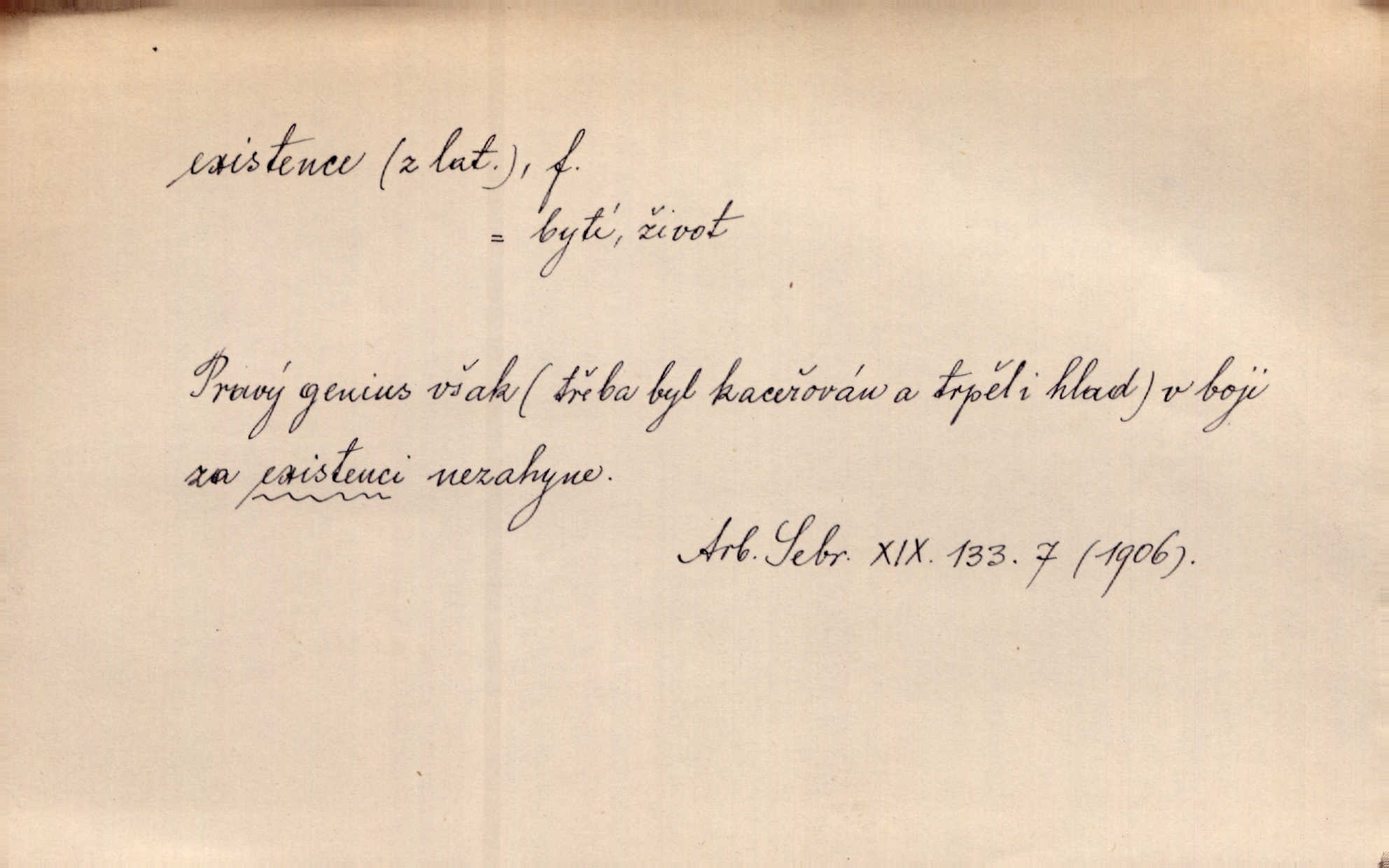 - existence, -e f. bytí; filos. jsoucnost. Přál-li jsem sobě od jakživa existenci státu Rakouského, míval jsem vždy na mysli Rakousko všem svým národům spravedlivé. Pal. D živobytí, životní postavení. On má své, ona má něco, víš, když to přijde dohromady, je to pěkná existence. Herrm. Člověk pochybné existence podezřelý. Po hlavním schodišti [zastavárny] vystupuje a sestupuje to četně jako po žebříku Jakobovu — jen že ne samí andělé: Leda andělé pochybné existence, jichž oči jsou smělostí svou podezřelé. Ner. D Pejor. osoba, člověk. Seděly tu velkoměstské existence neznámého povolání. Maj. Ztracená existence člověk sešlý, v životě ztroskotalý. Hrabě seznamoval Petra s celou tlupou německých dobrodruhů a ztracených existencí vůbec. Zey.