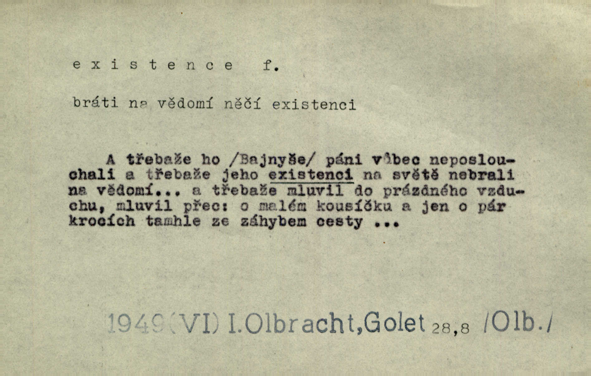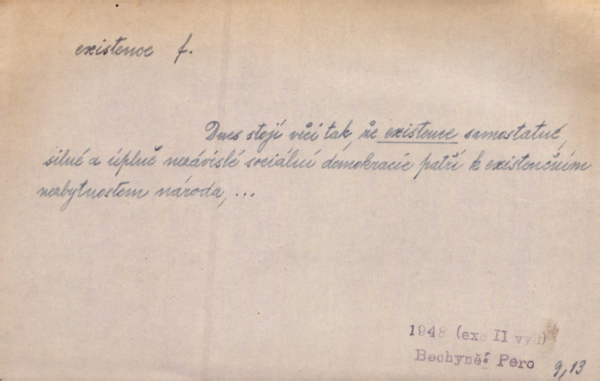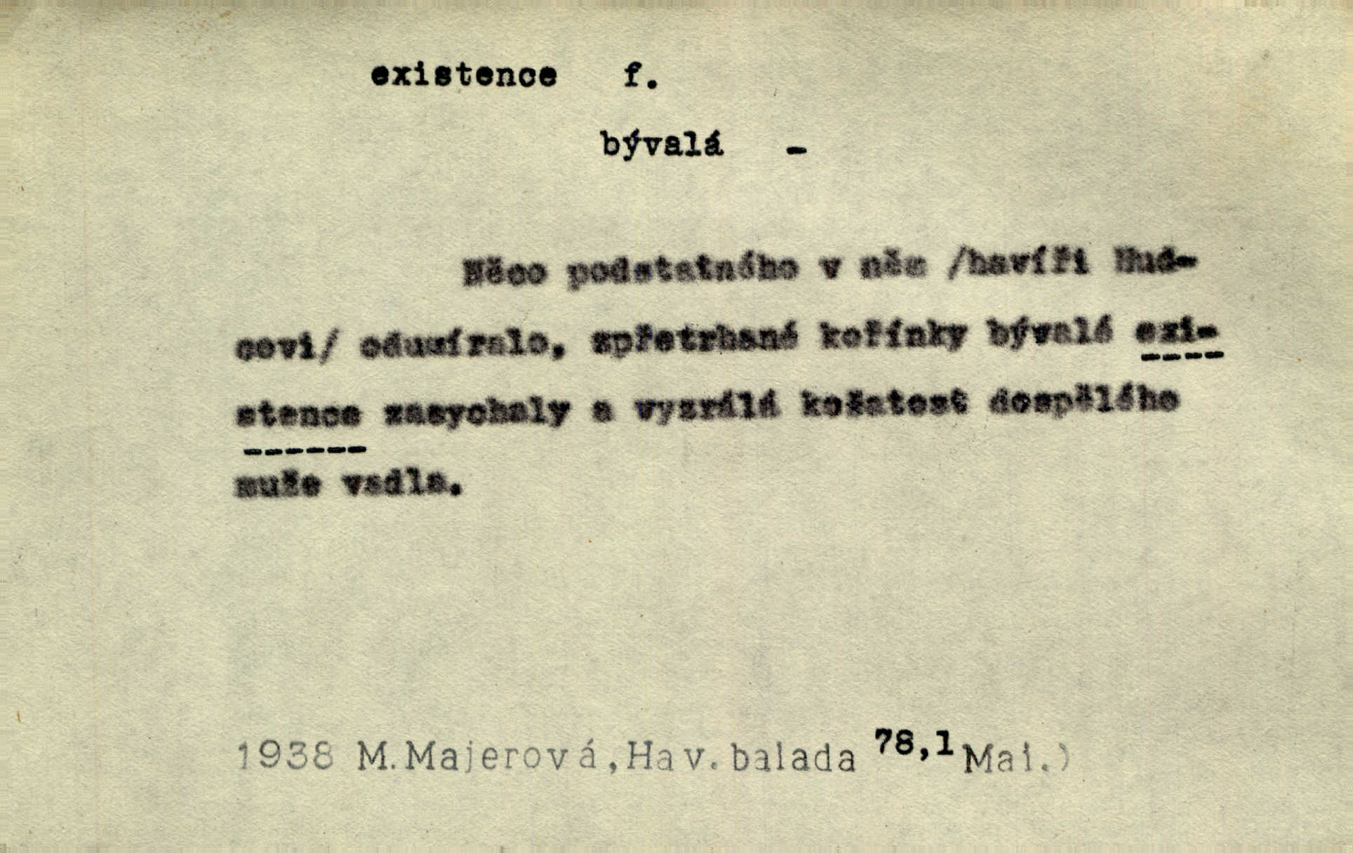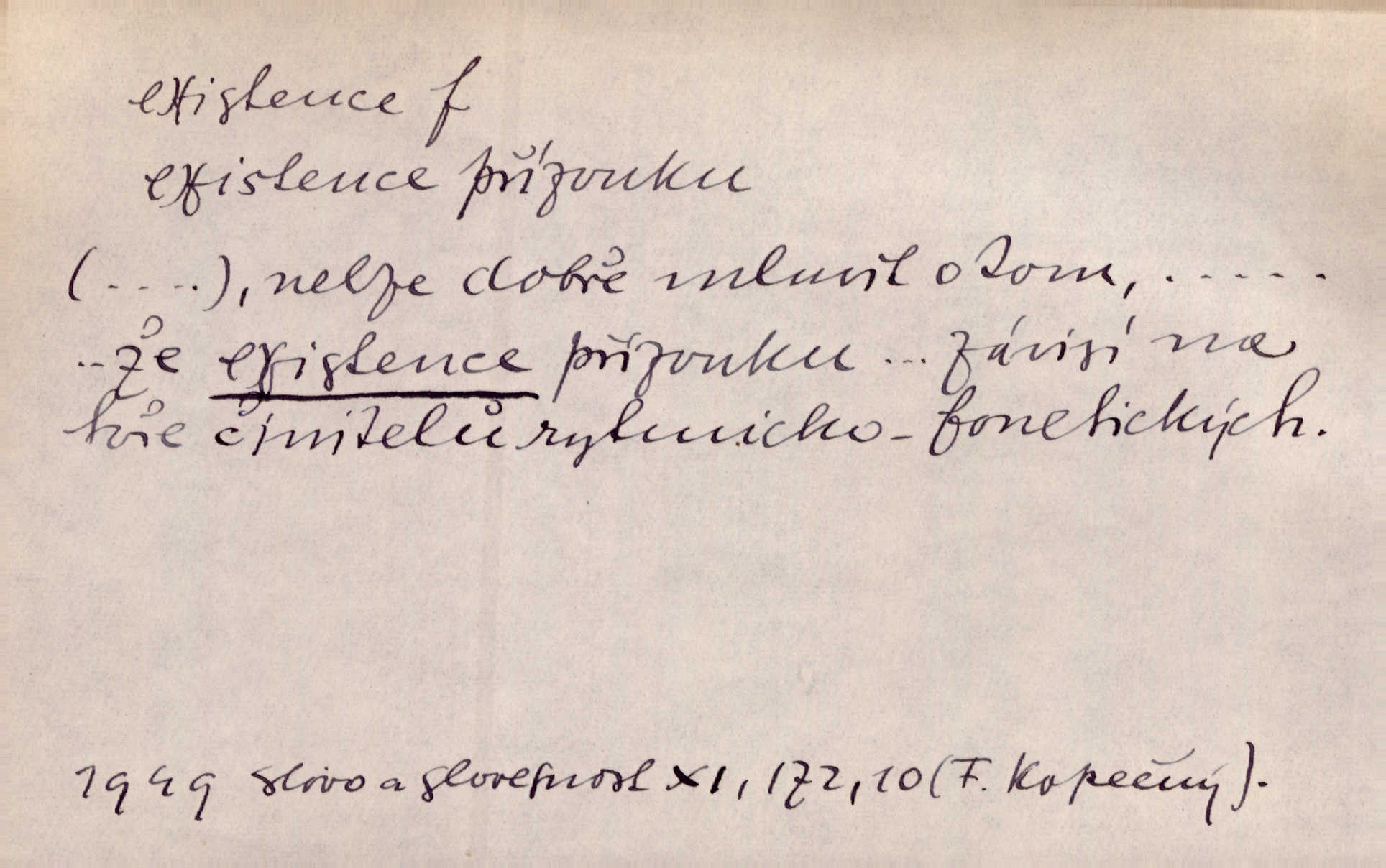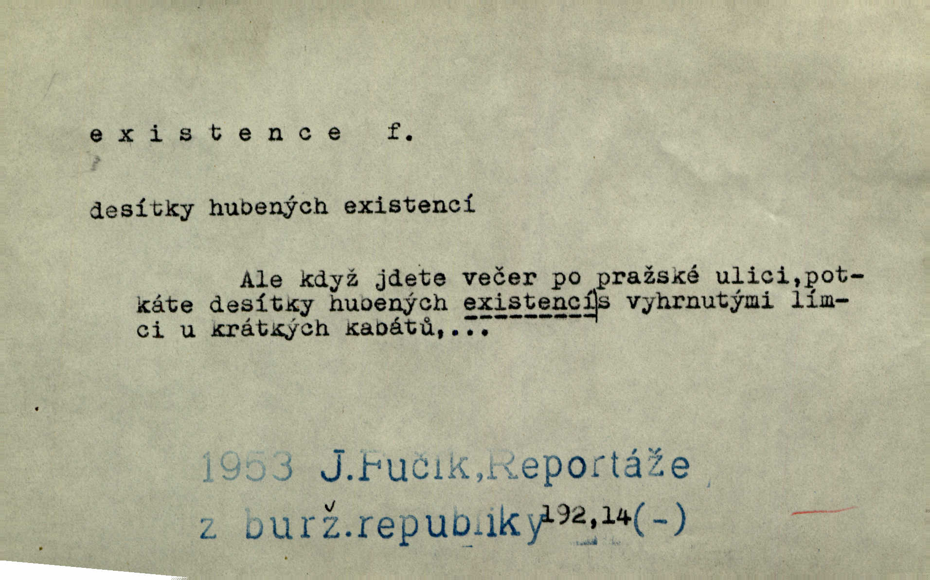 - existence, -e f. bytí; filos. jsoucnost. Přál-li jsem sobě od jakživa existenci státu Rakouského, míval jsem vždy na mysli Rakousko všem svým národům spravedlivé. Pal. D živobytí, životní postavení. On má své, ona má něco, víš, když to přijde dohromady, je to pěkná existence. Herrm. Člověk pochybné existence podezřelý. Po hlavním schodišti [zastavárny] vystupuje a sestupuje to četně jako po žebříku Jakobovu — jen že ne samí andělé: Leda andělé pochybné existence, jichž oči jsou smělostí svou podezřelé. Ner. D Pejor. osoba, člověk. Seděly tu velkoměstské existence neznámého povolání. Maj. Ztracená existence člověk sešlý, v životě ztroskotalý. Hrabě seznamoval Petra s celou tlupou německých dobrodruhů a ztracených existencí vůbec. Zey.