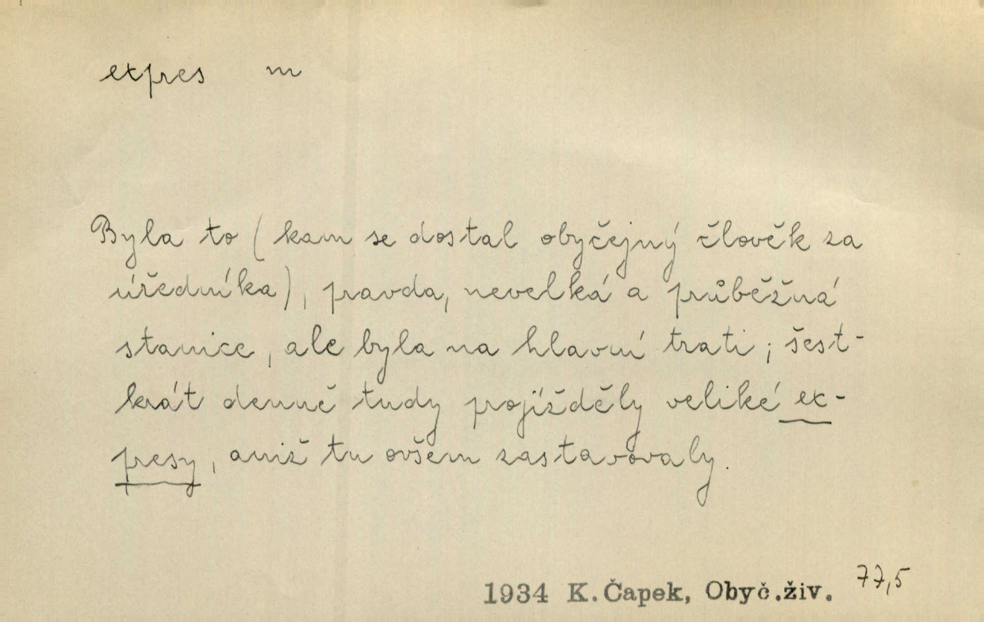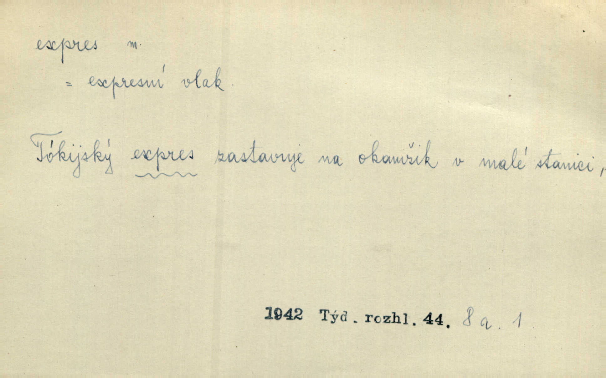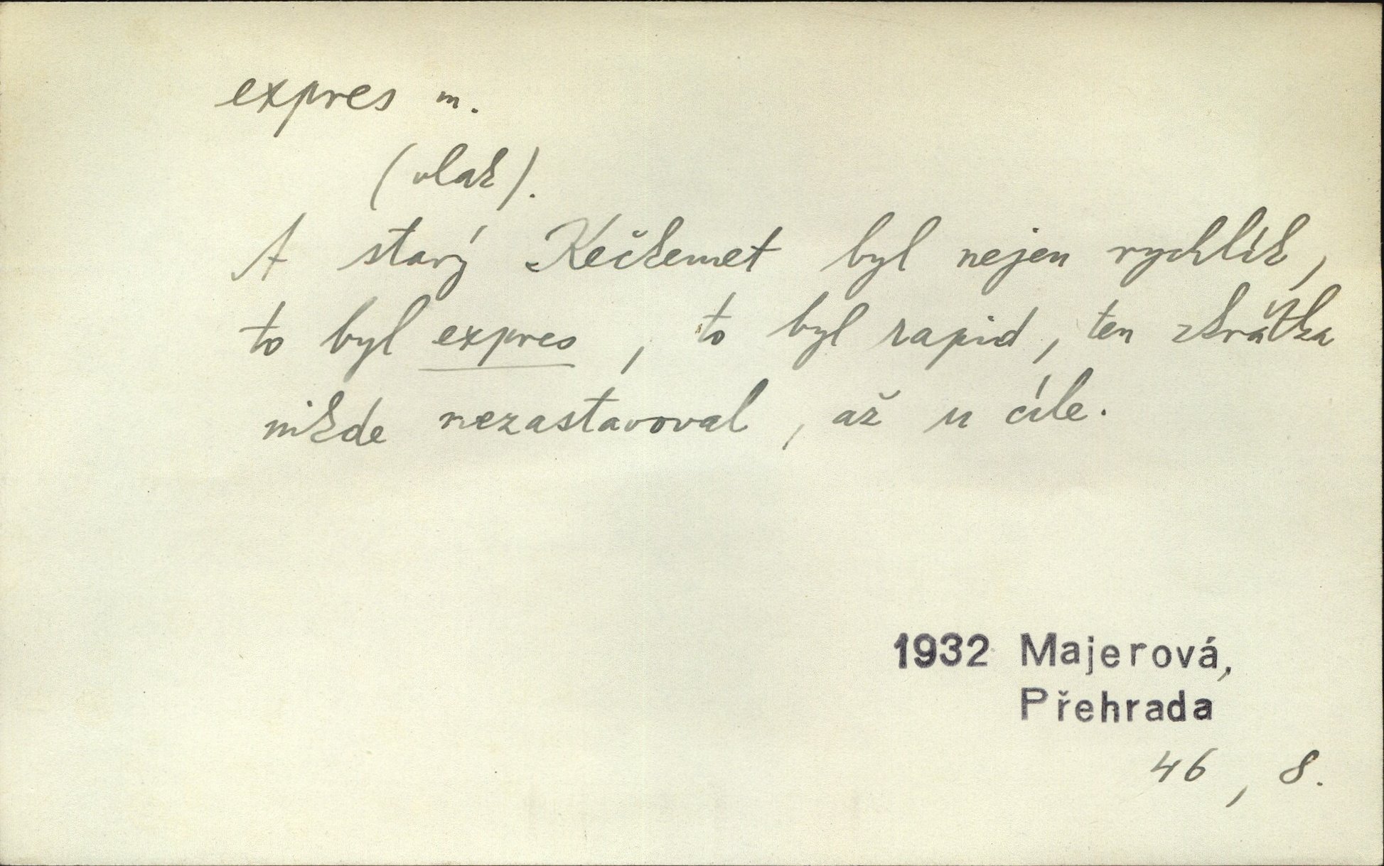 - expres, -u m. žel. zvlášť rychlý vlak, přímý mezinárodní rychlík. Starý Kečkemet byl nejen rychlík, to byl expres, to byl rapid, ten zkrátka nikde nezastavoval, až u cíle. Maj. Pošt. spěšný dopis, spěšnina. Co to, že Kýrovi dostávají dnes expres? Nor.