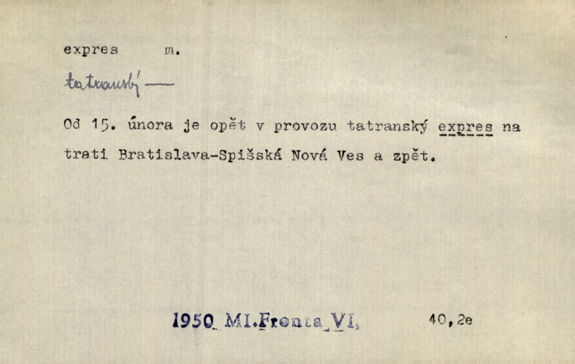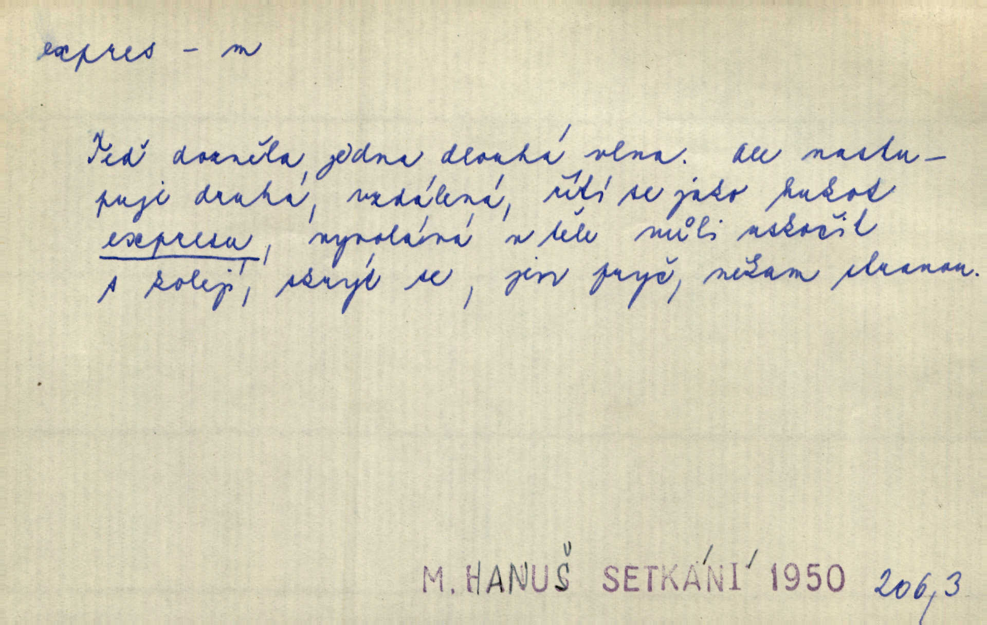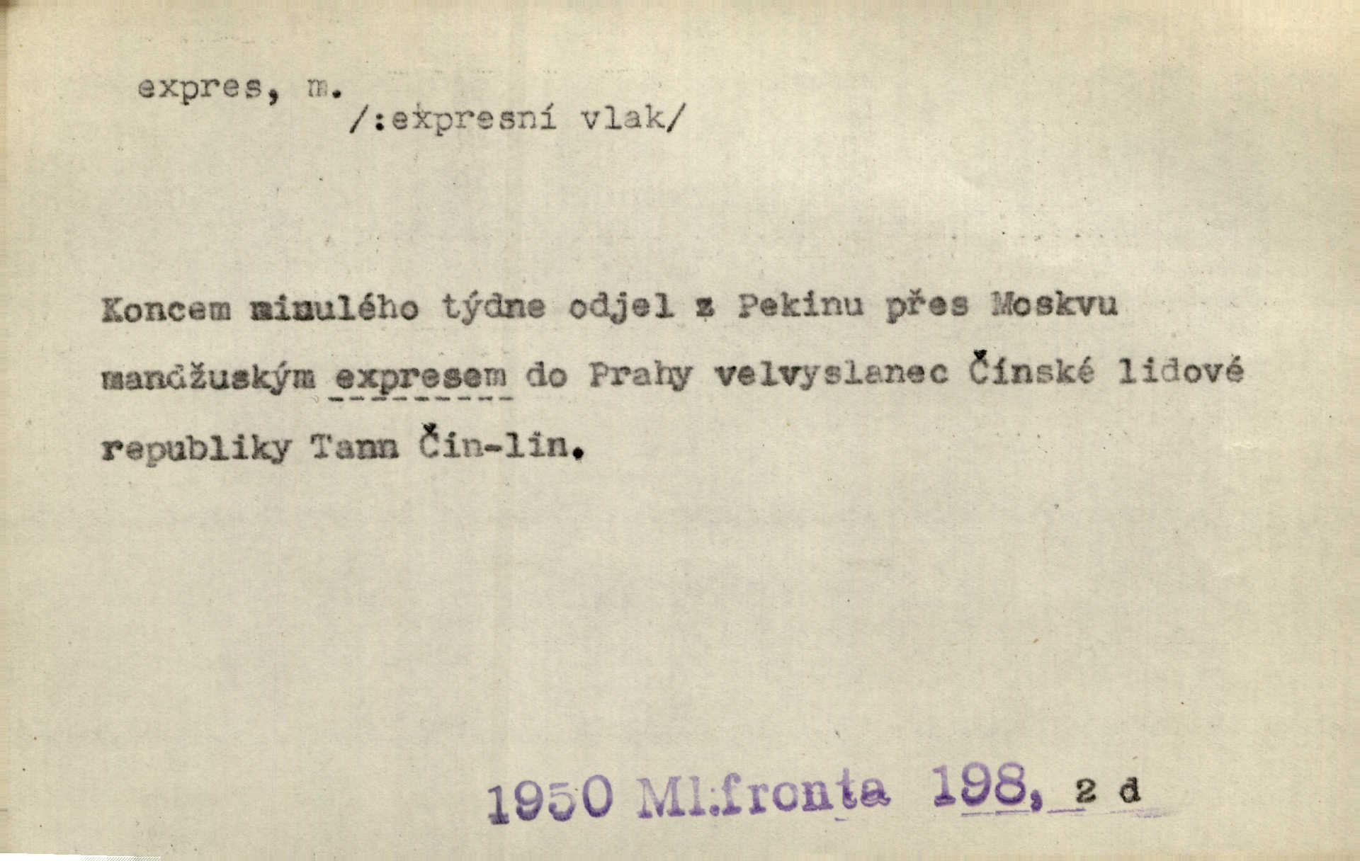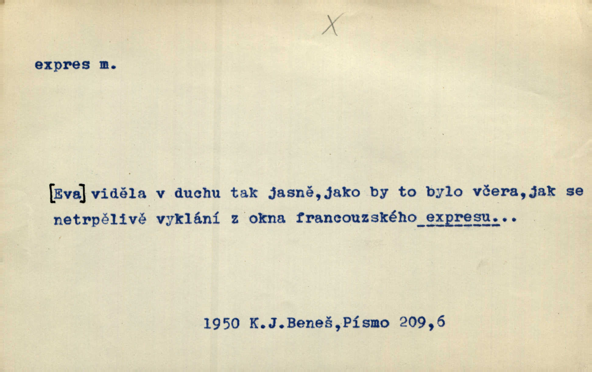- expres, -u m. žel. zvlášť rychlý vlak, přímý mezinárodní rychlík. Starý Kečkemet byl nejen rychlík, to byl expres, to byl rapid, ten zkrátka nikde nezastavoval, až u cíle. Maj. Pošt. spěšný dopis, spěšnina. Co to, že Kýrovi dostávají dnes expres? Nor.