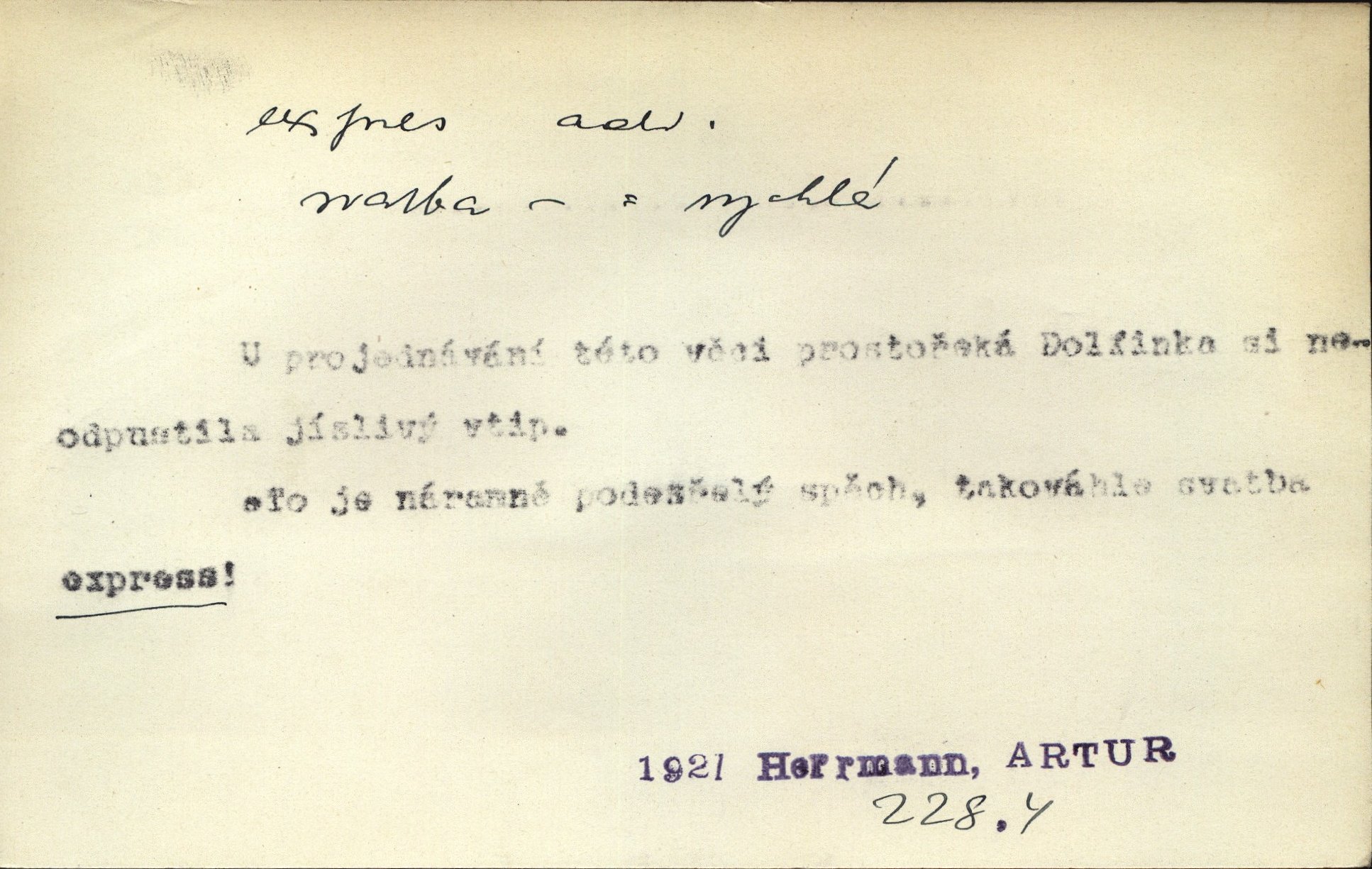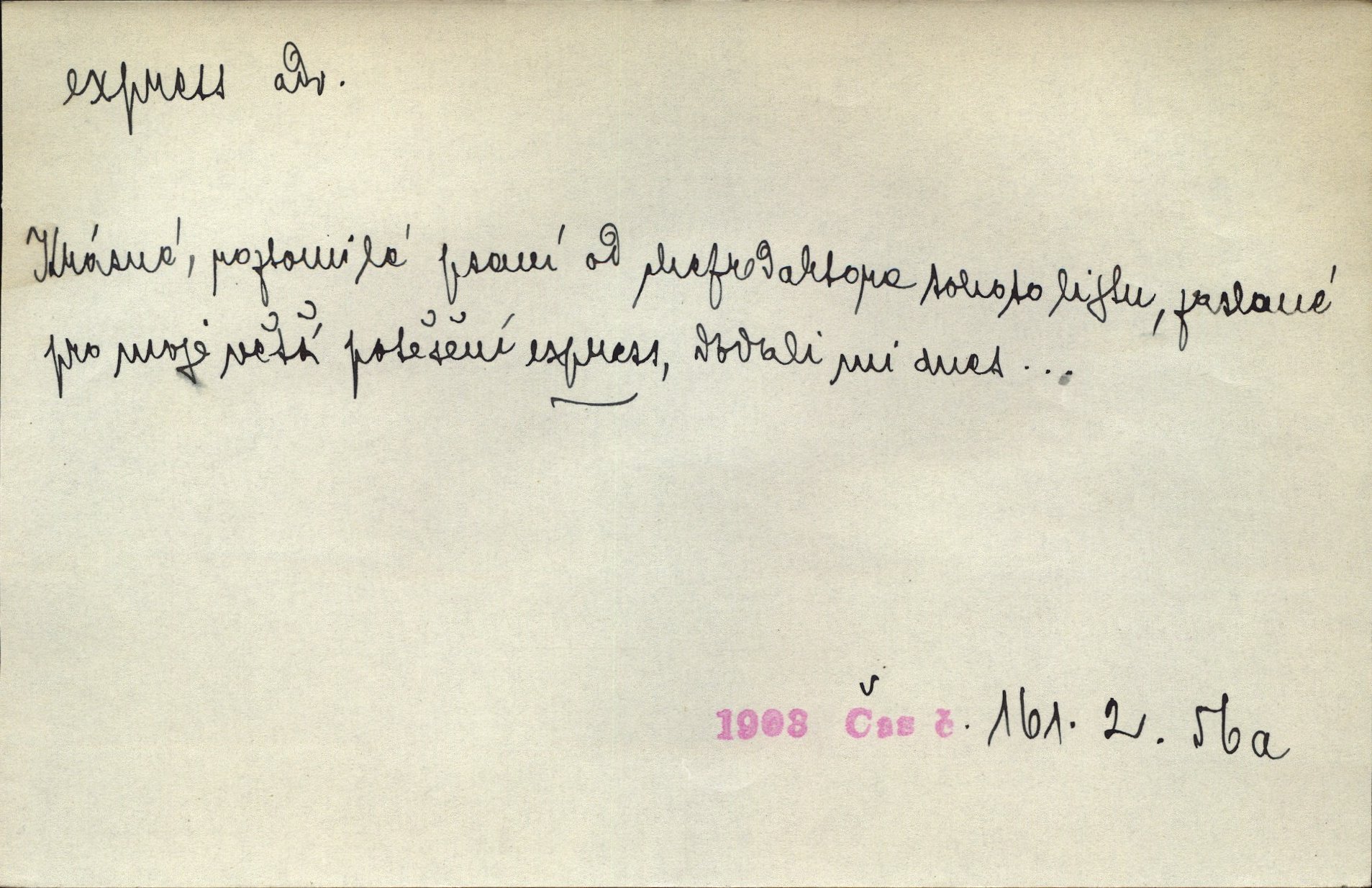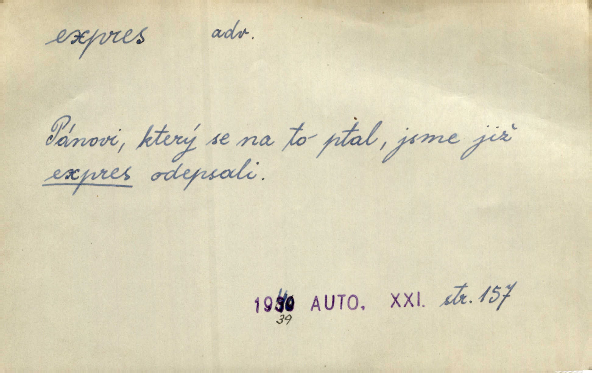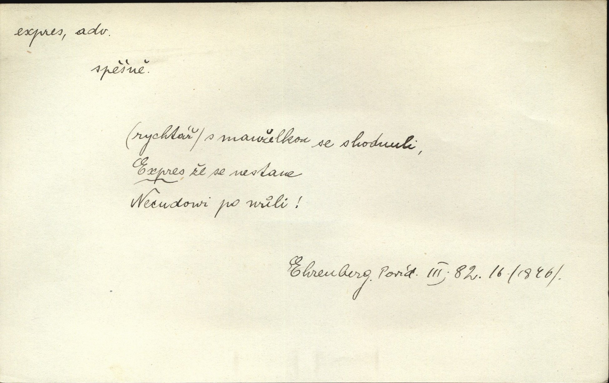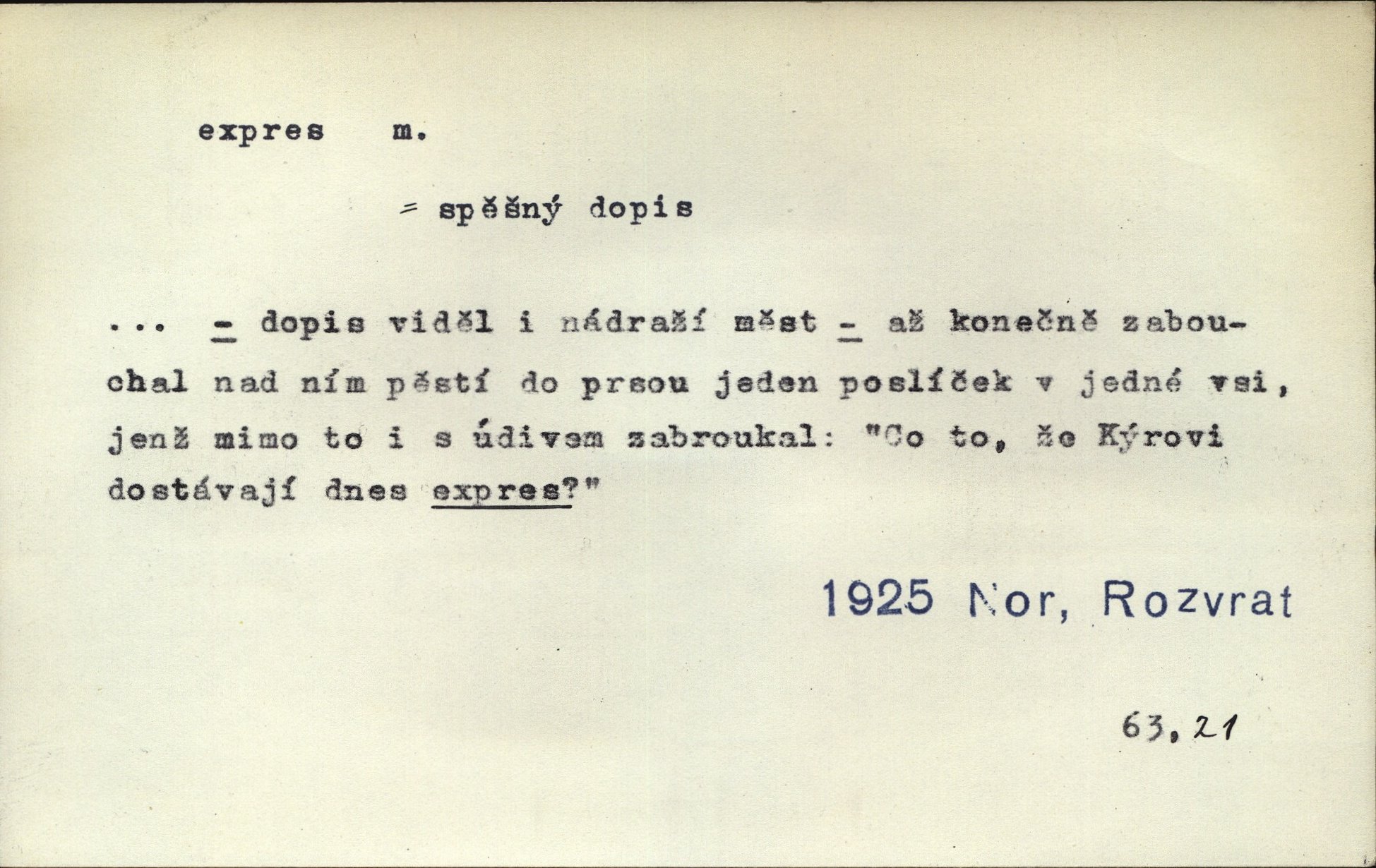 - expres adv. pošt. spěšně, jako spěšnina. Co se zdálo významnější a mělo nárok na rychlejší vyřízení, posílalo se expres. Šlej.
