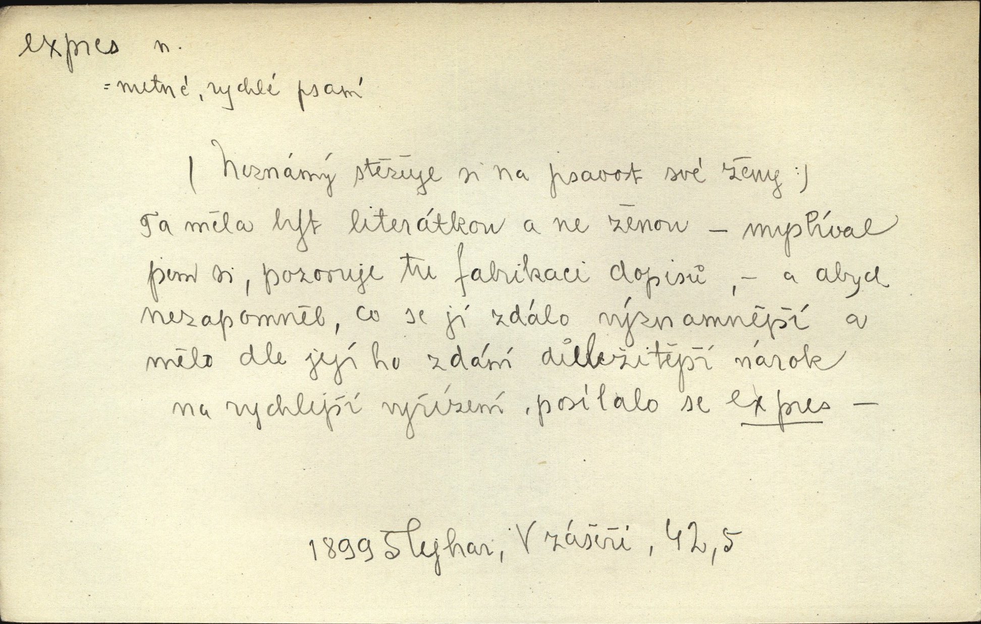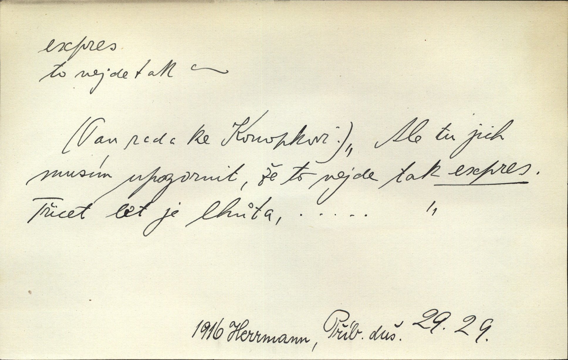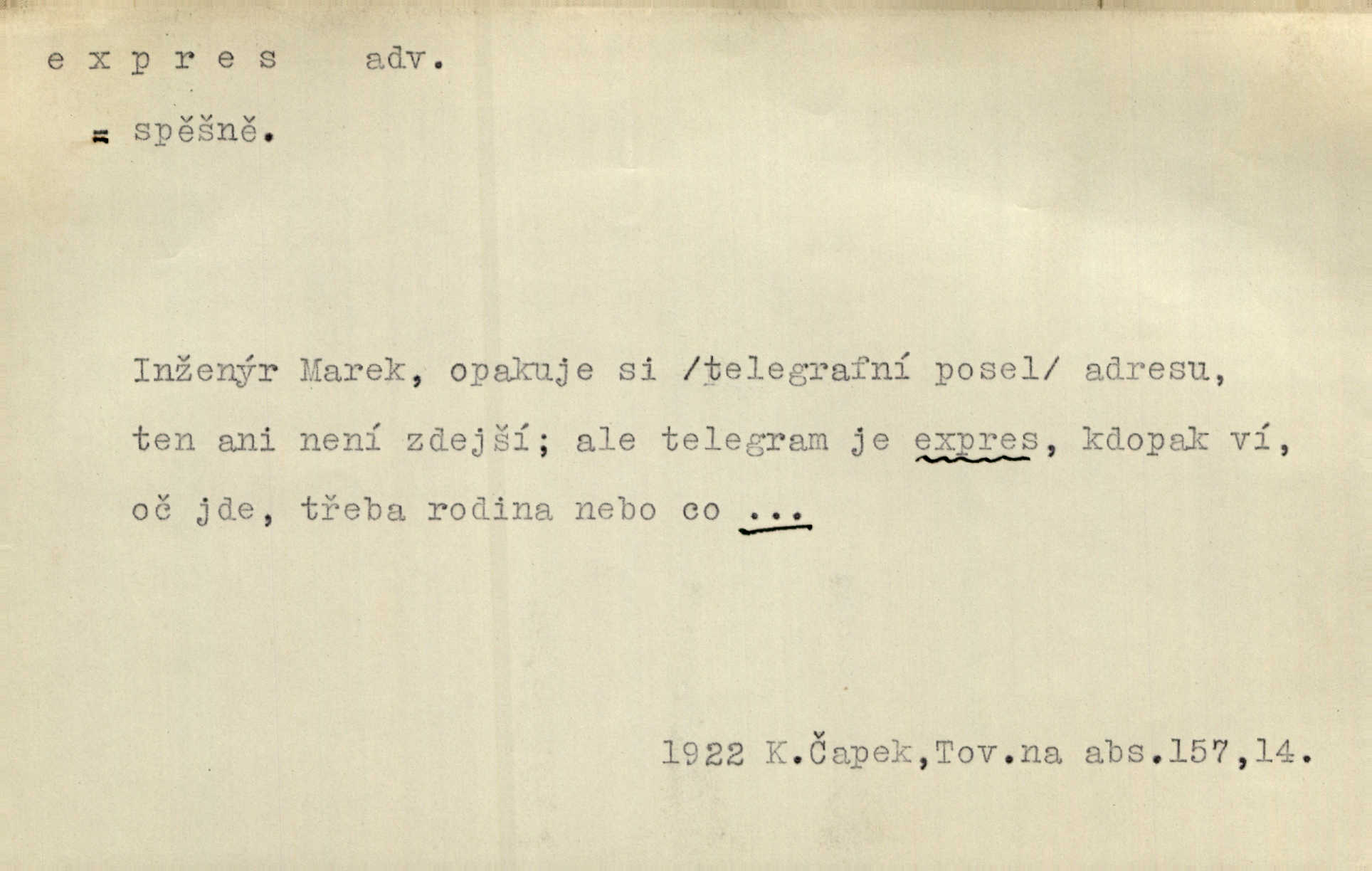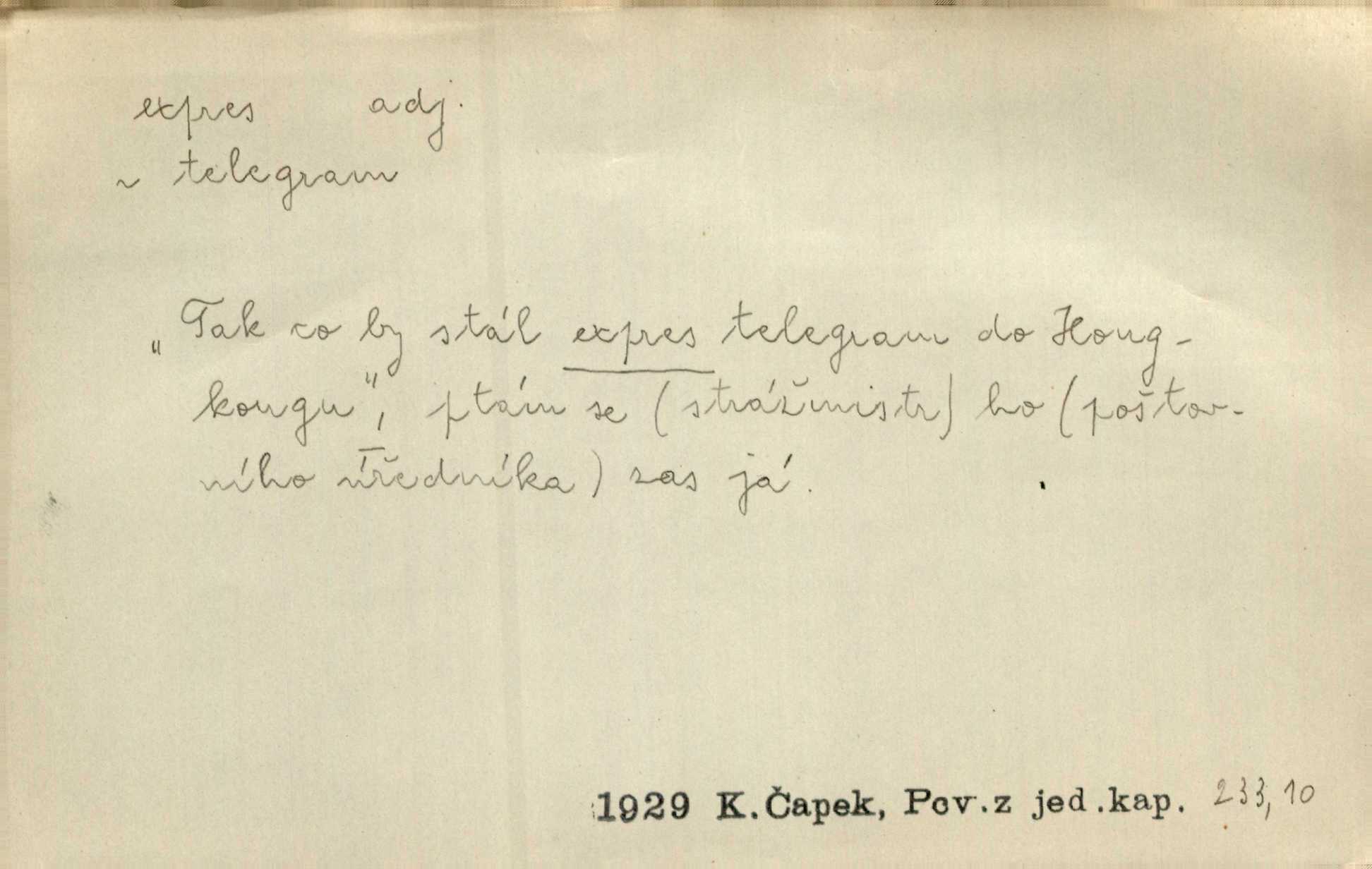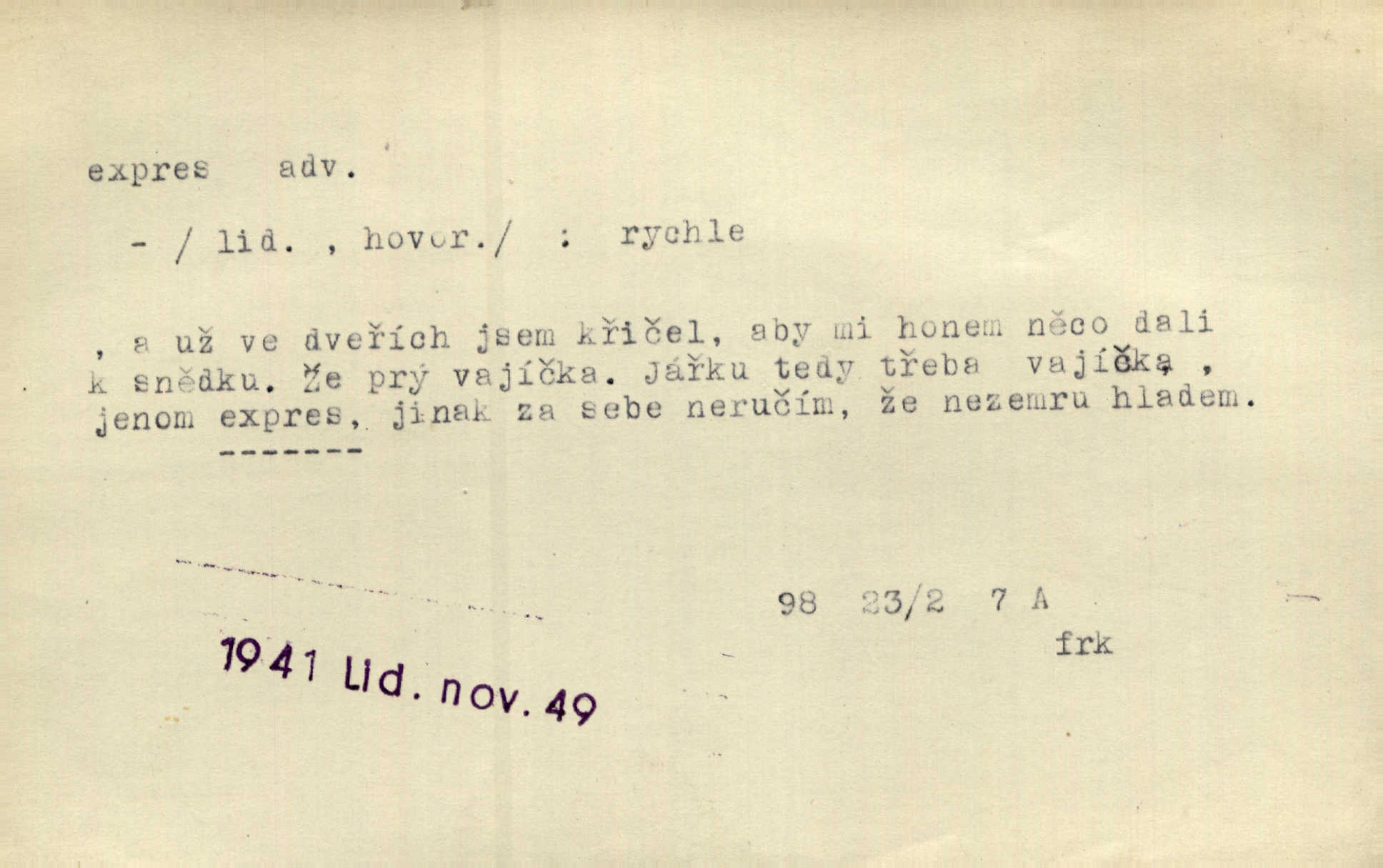- expres adv. pošt. spěšně, jako spěšnina. Co se zdálo významnější a mělo nárok na rychlejší vyřízení, posílalo se expres. Šlej.