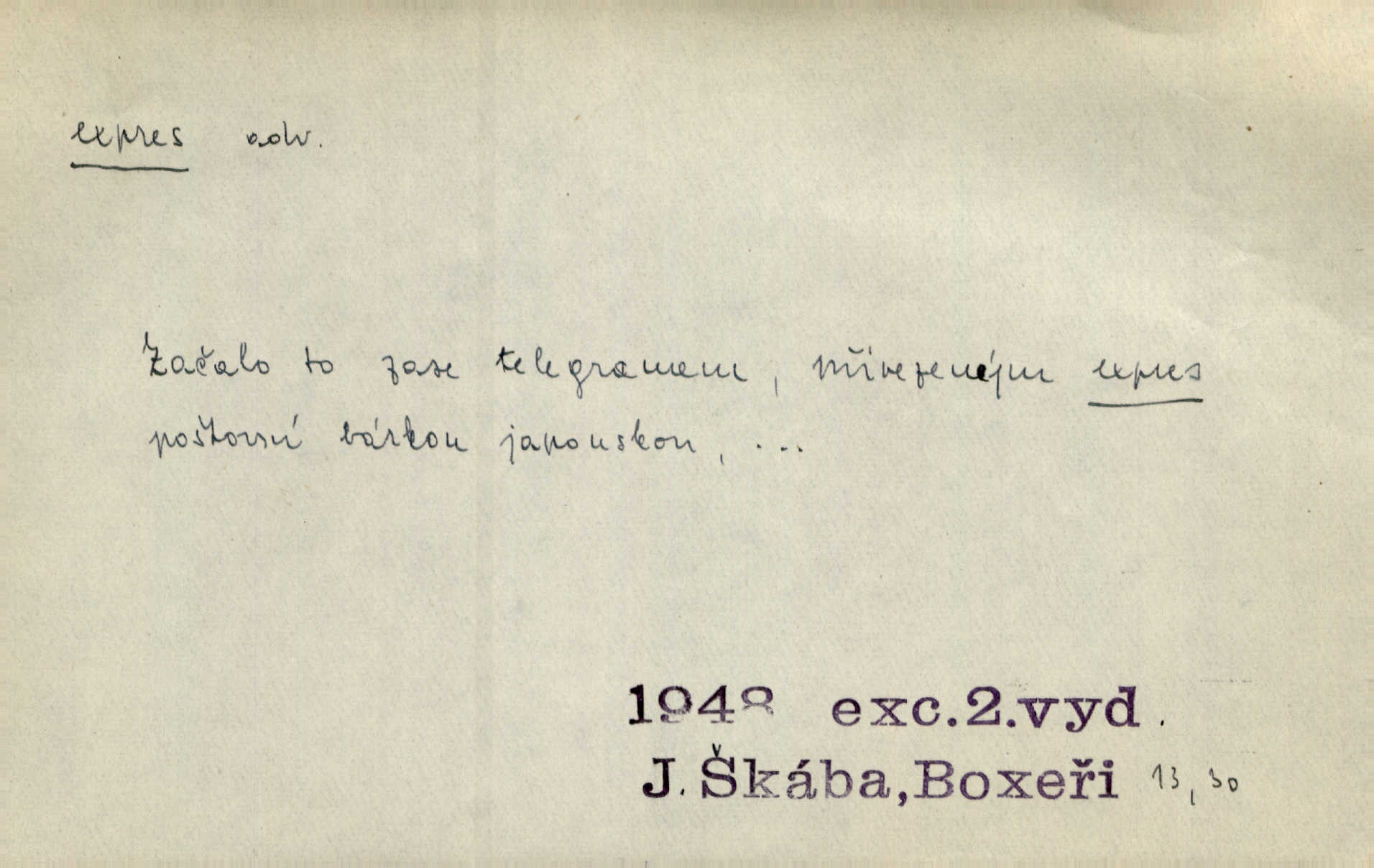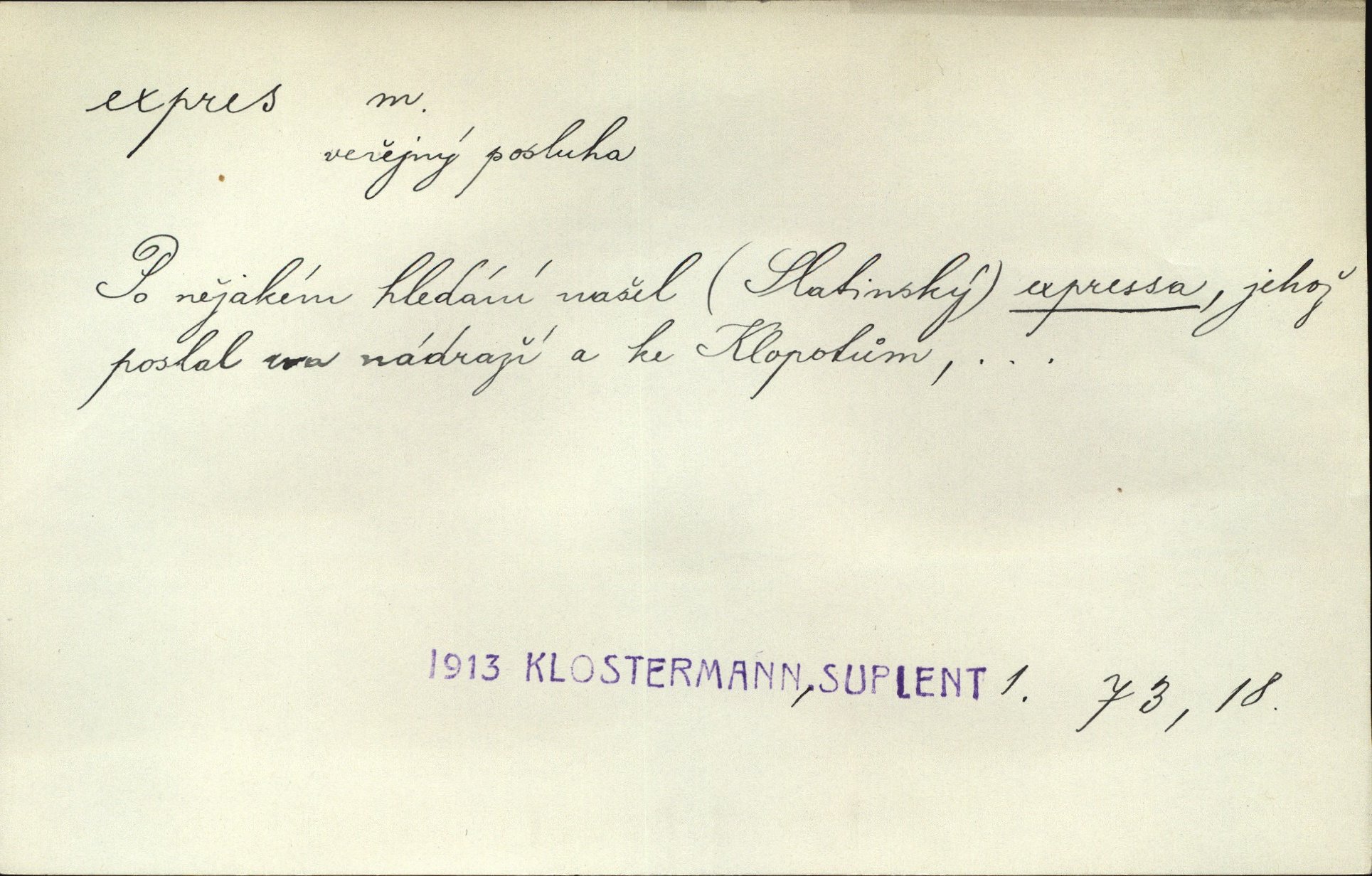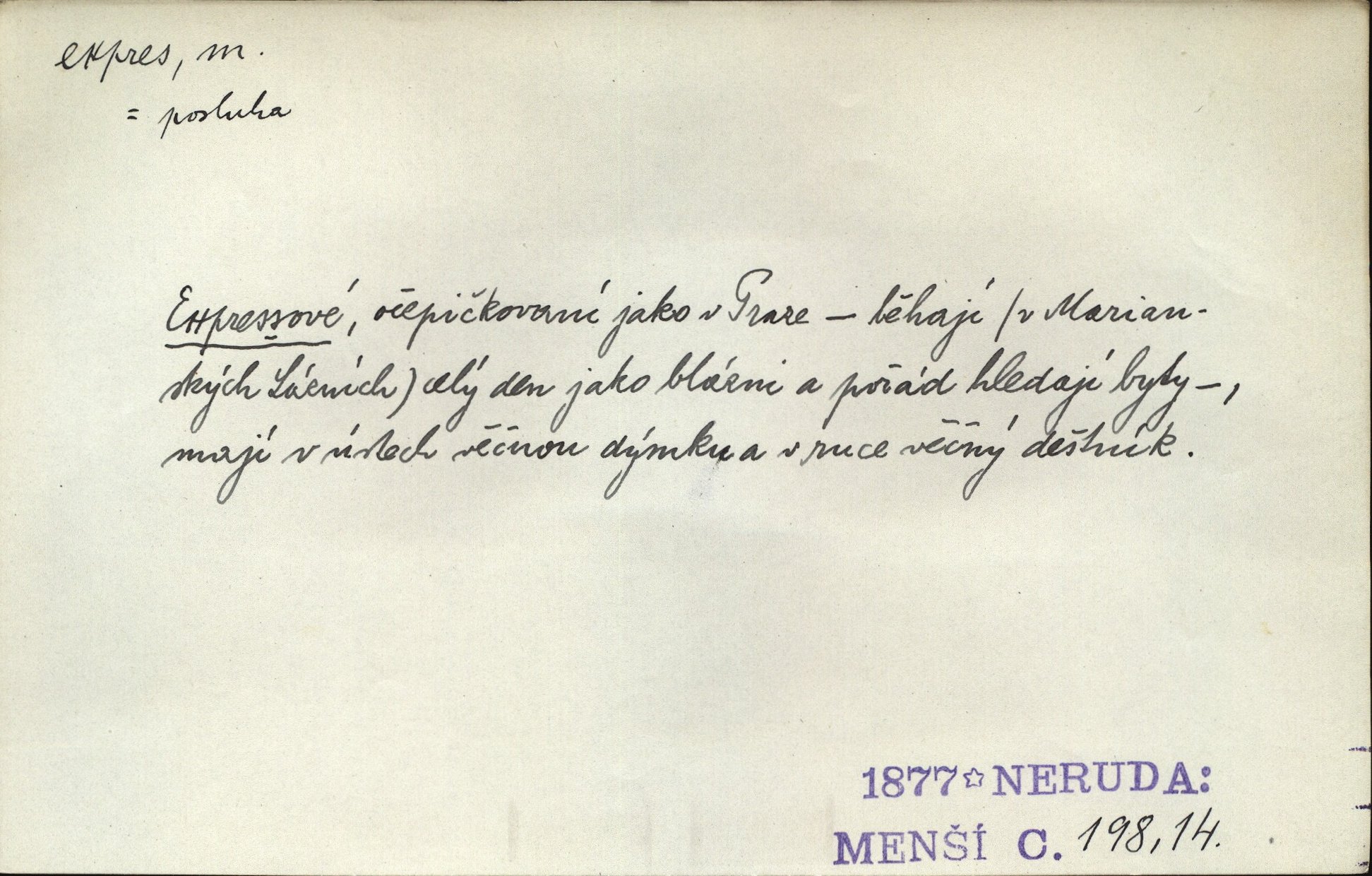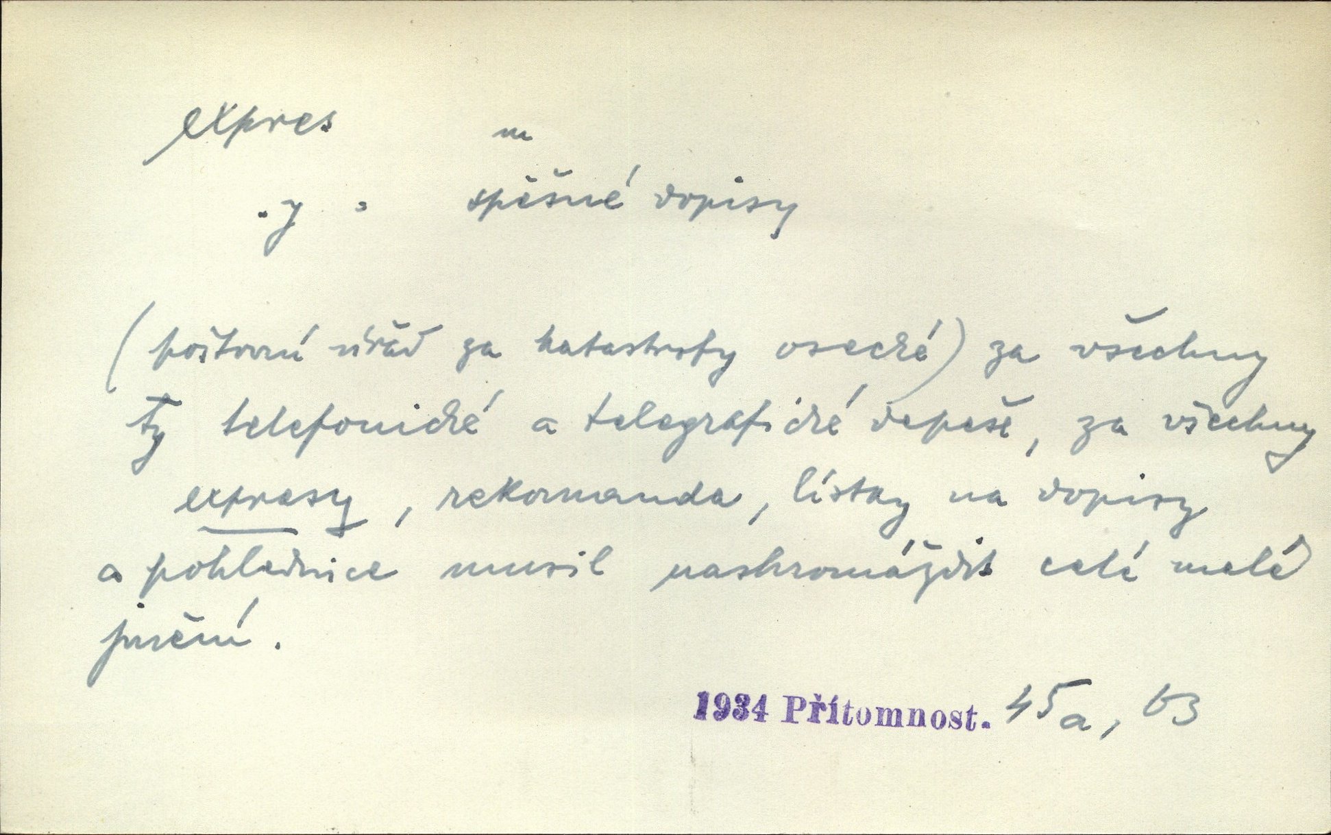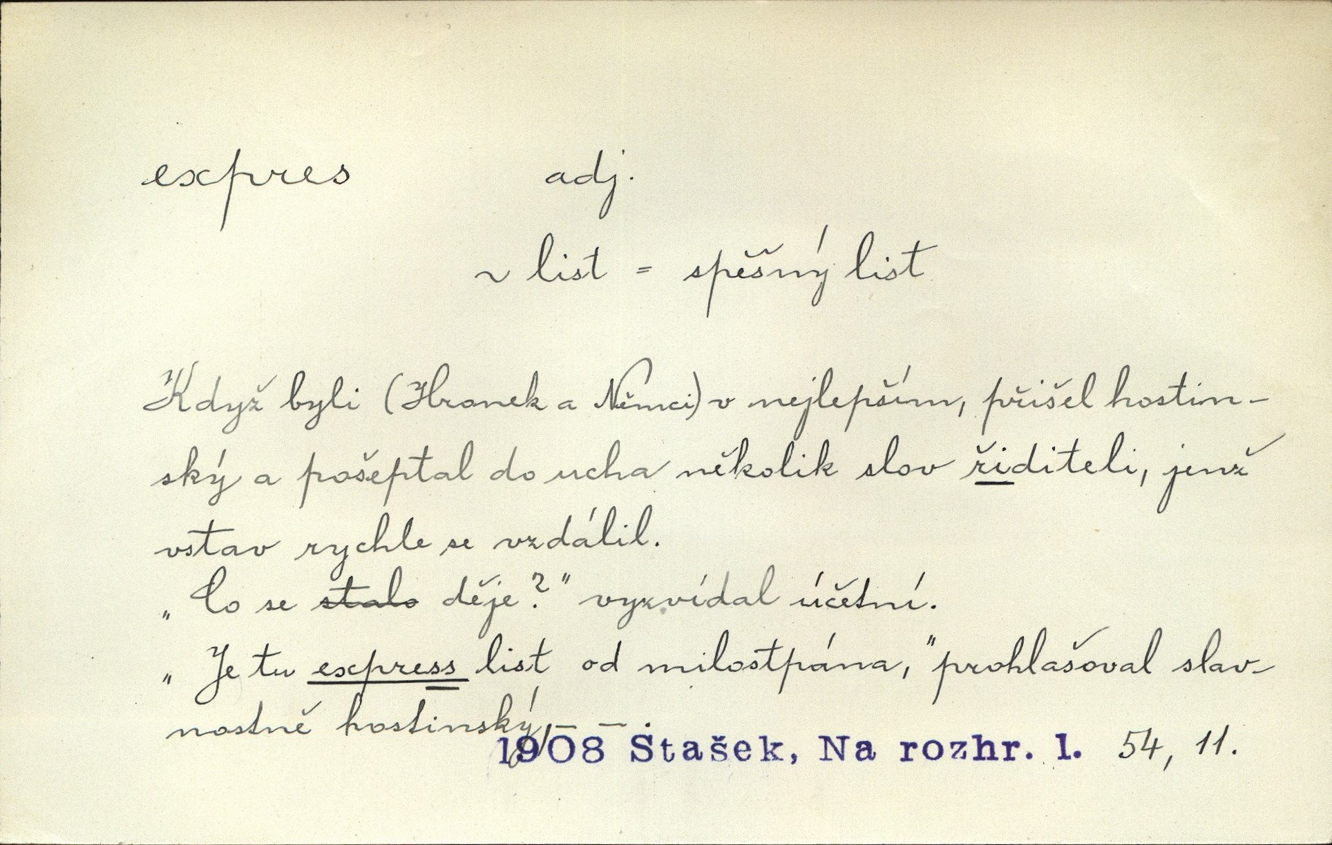 - expres adv. pošt. spěšně, jako spěšnina. Co se zdálo významnější a mělo nárok na rychlejší vyřízení, posílalo se expres. Šlej.