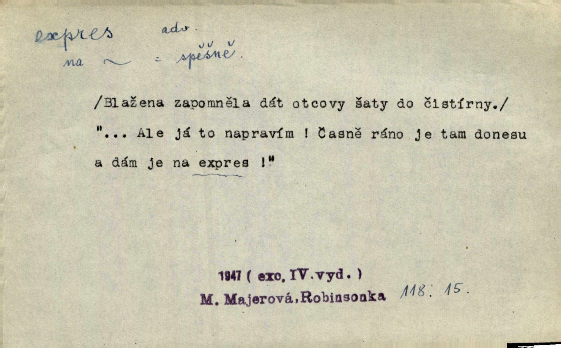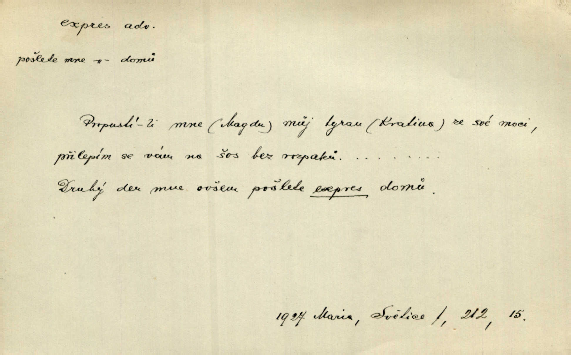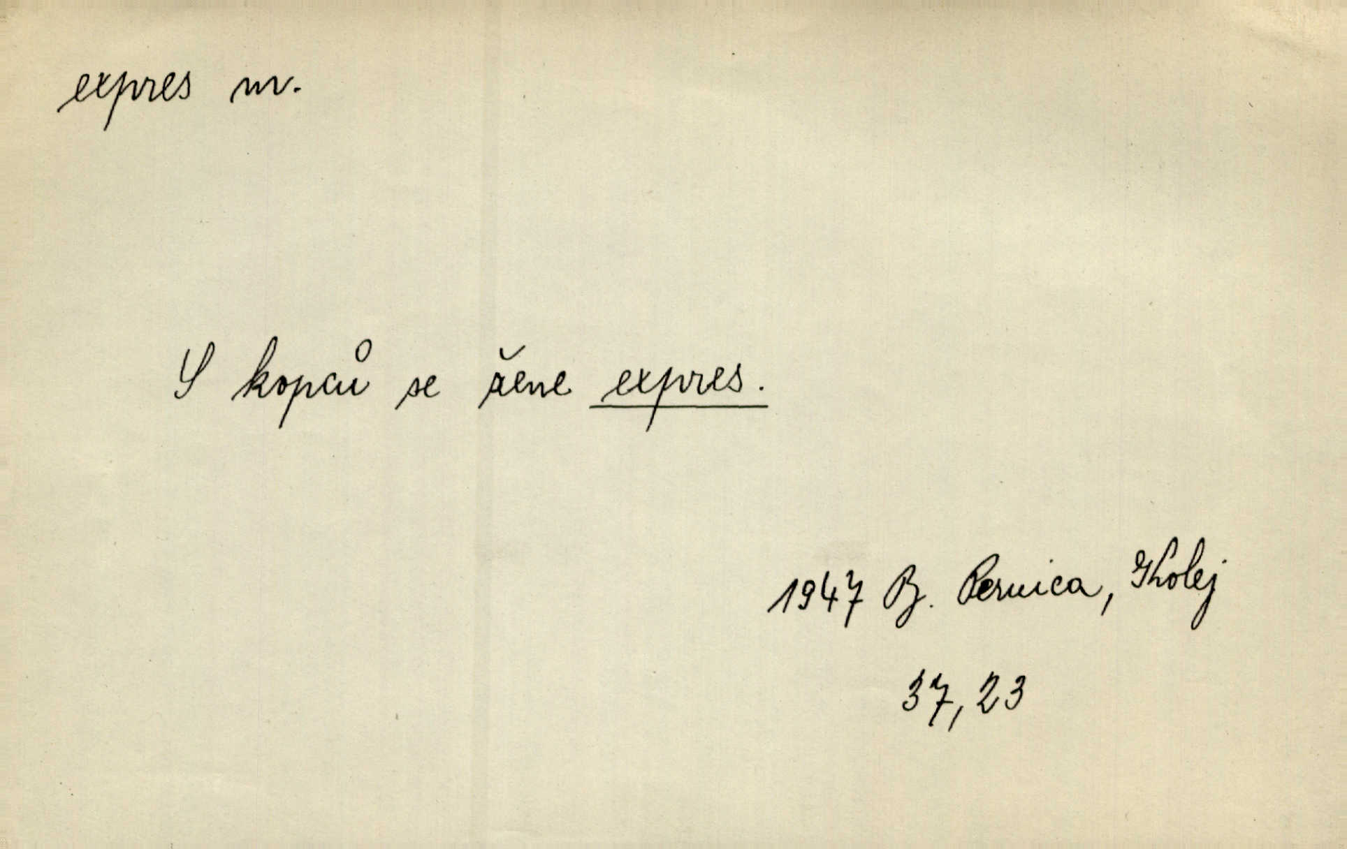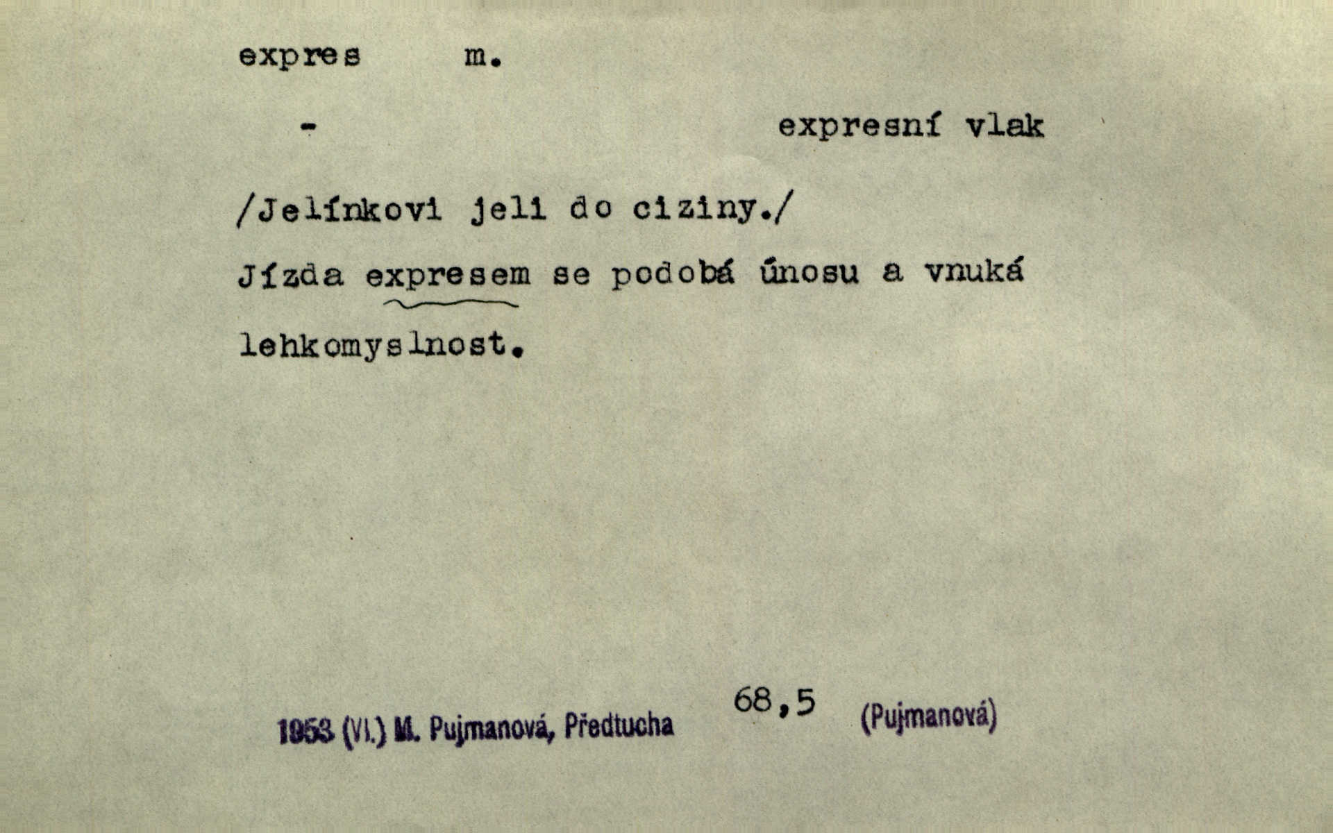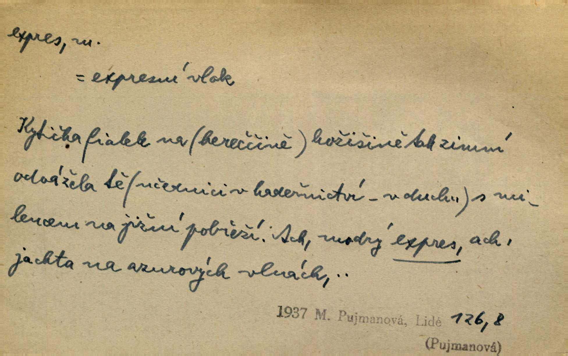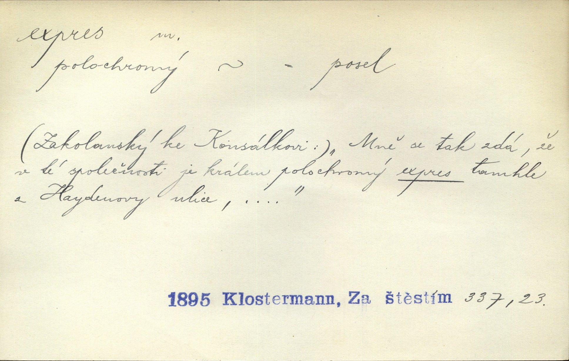 - expres adv. pošt. spěšně, jako spěšnina. Co se zdálo významnější a mělo nárok na rychlejší vyřízení, posílalo se expres. Šlej.