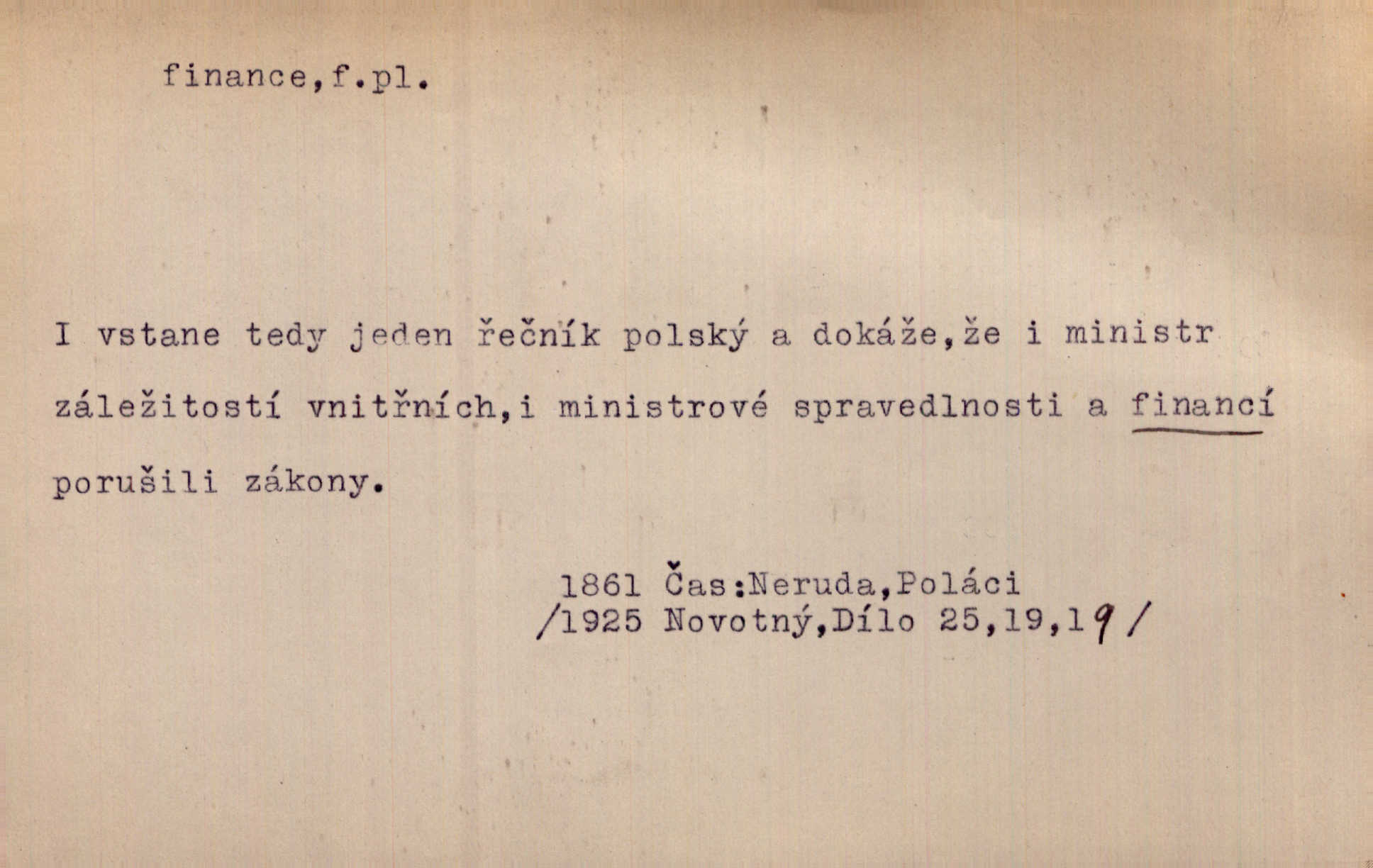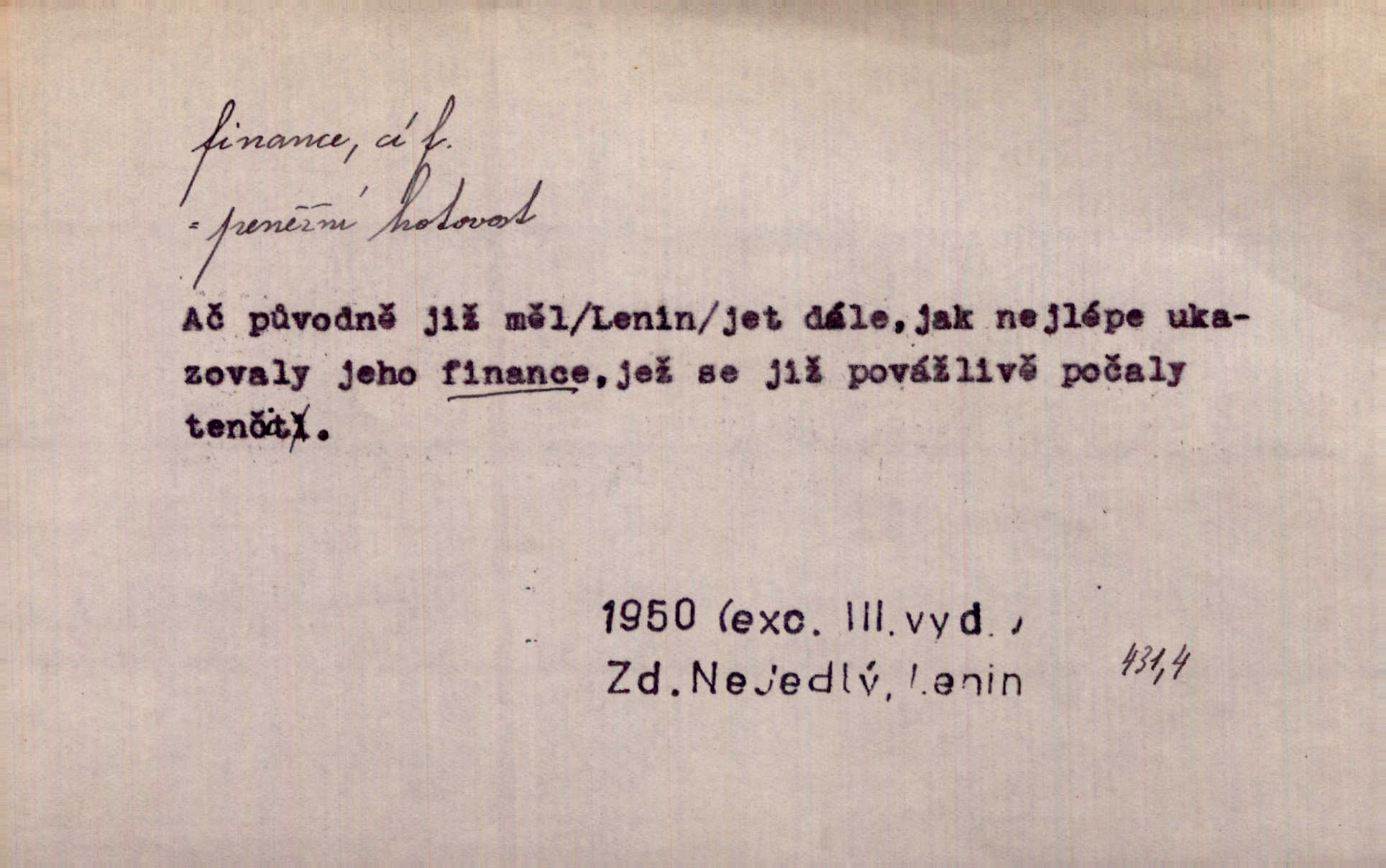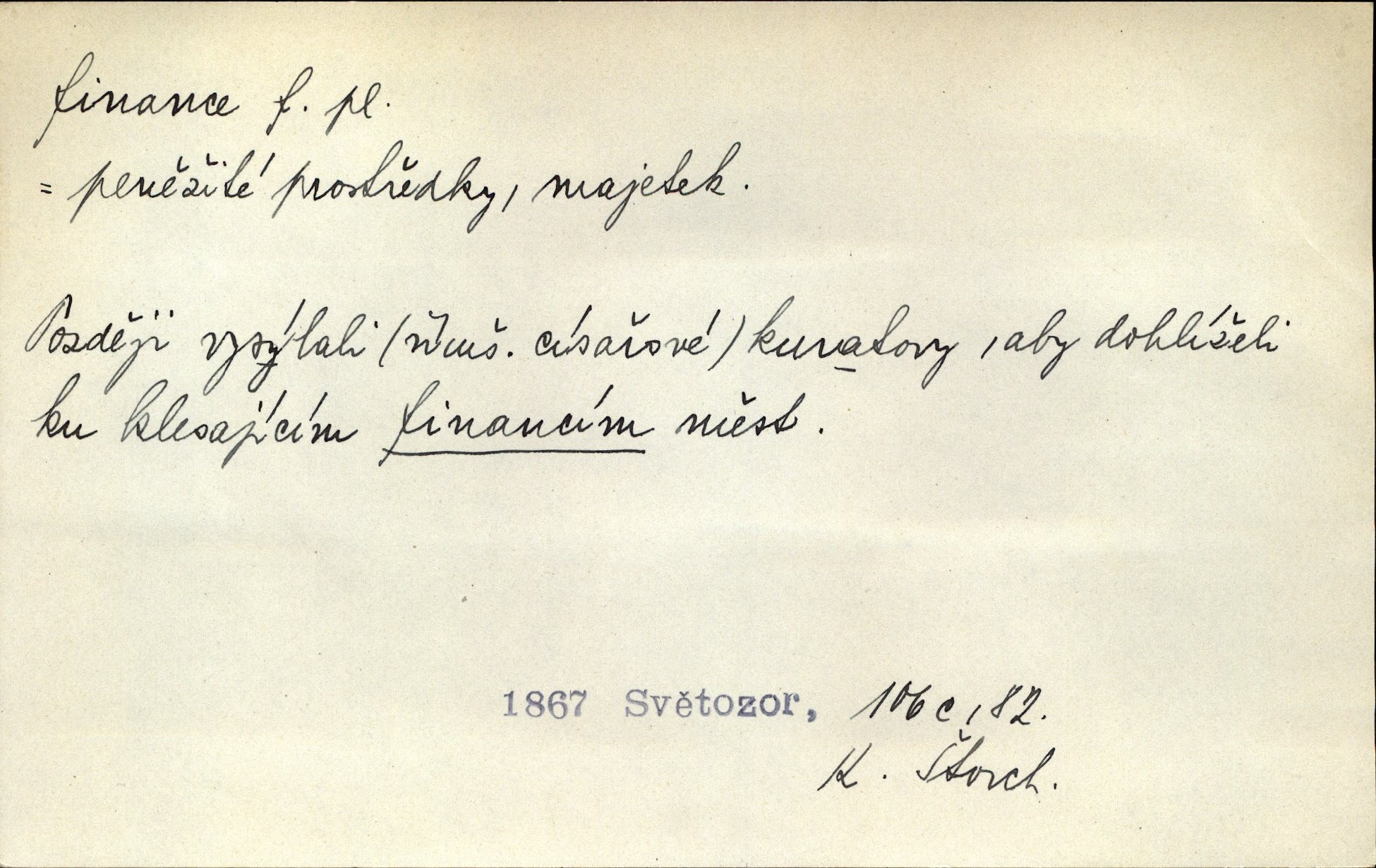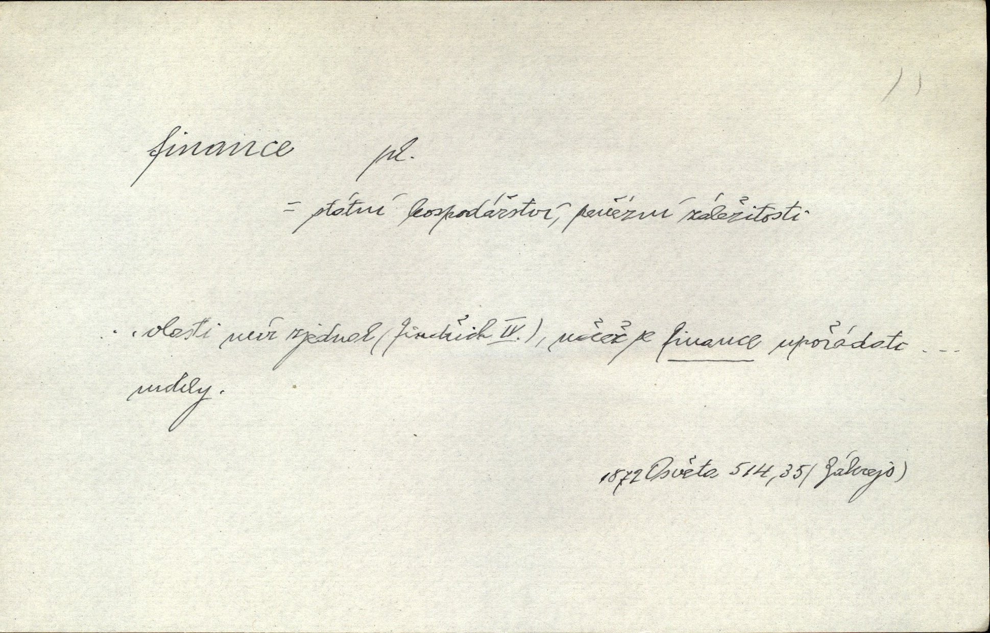 - finance, -í f. pomn. státní hospodářství. Ministerstvo financí. D hospodářský stav, majetkové poměry. Rok 1886 jest počátkem šťastného obratu ve financích Národních Listů. Herb. D Fam. peníze. Jídával jsem kdysi, ano, když tatínek posílával finance. Herrm.