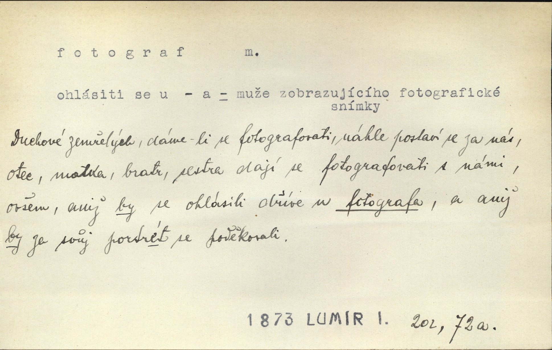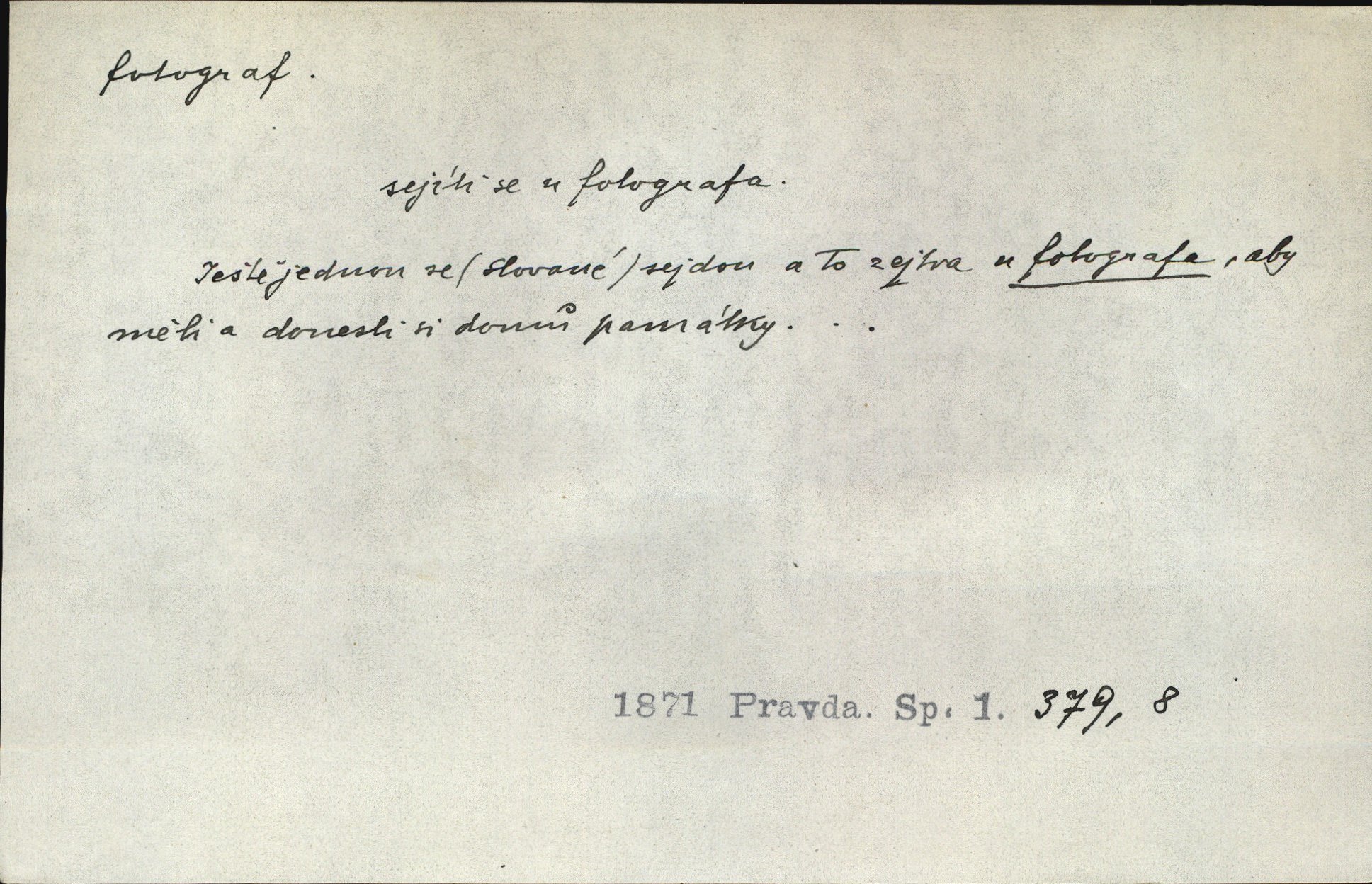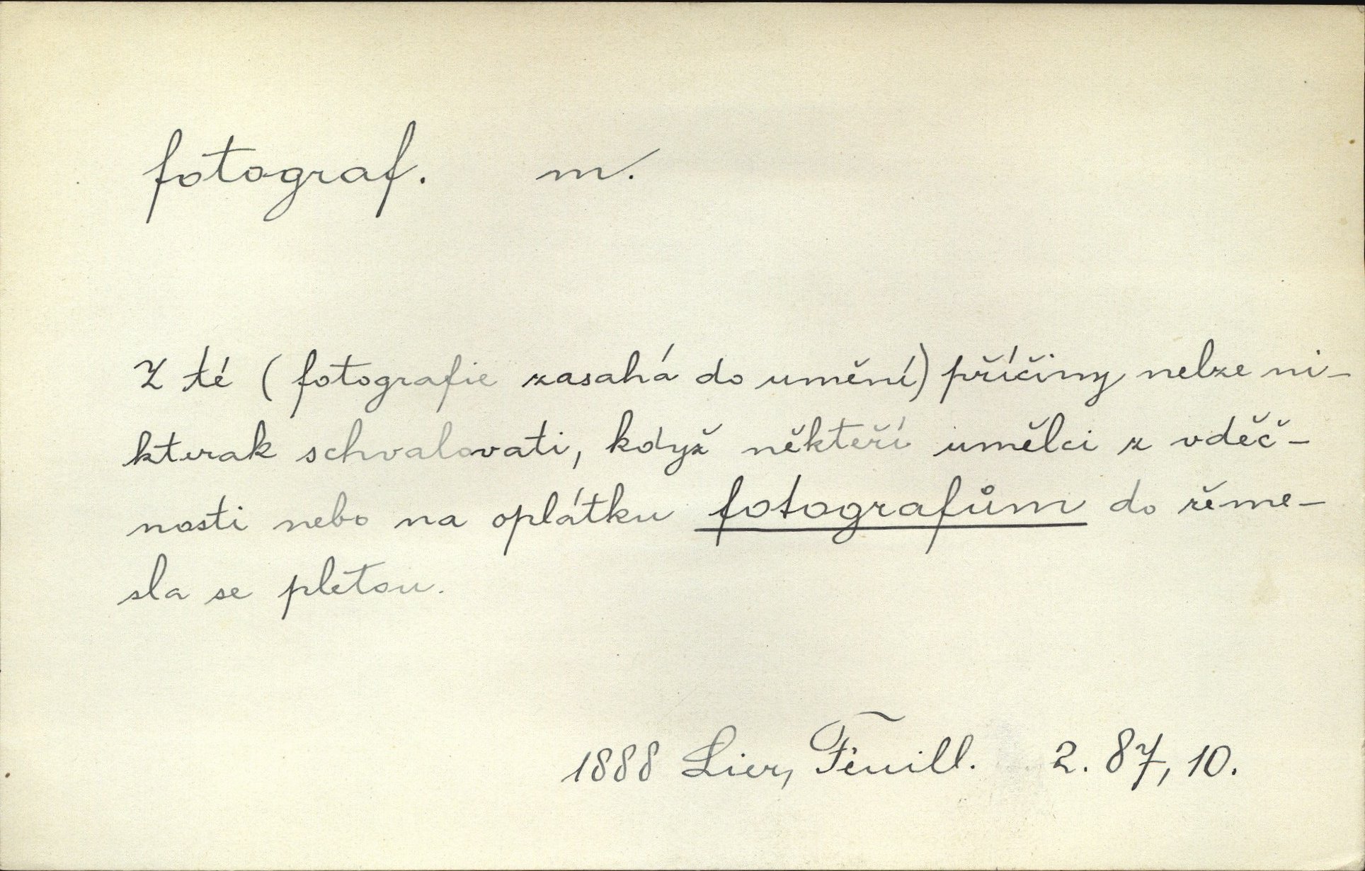 - fotograf, -a m. kdo se zaměstnává fotografováním n. je po živnostensku provádí. Pohlíželi na objektiv, až řekne fotograf „teď“. Herrm. Přen. Co do líčení jest [Turgeněv] pouhým fotografem věrným napodobitelem skutečnosti. Staš.