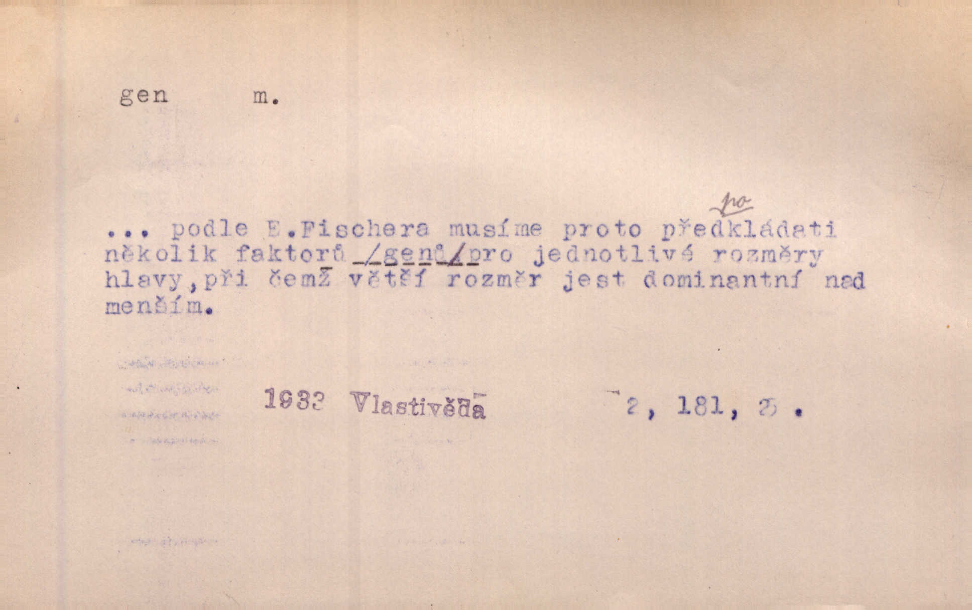 Podle E. Fischera musíme předpokládati několik faktorů (genů) pro jednotlivé rozměry hlavy.