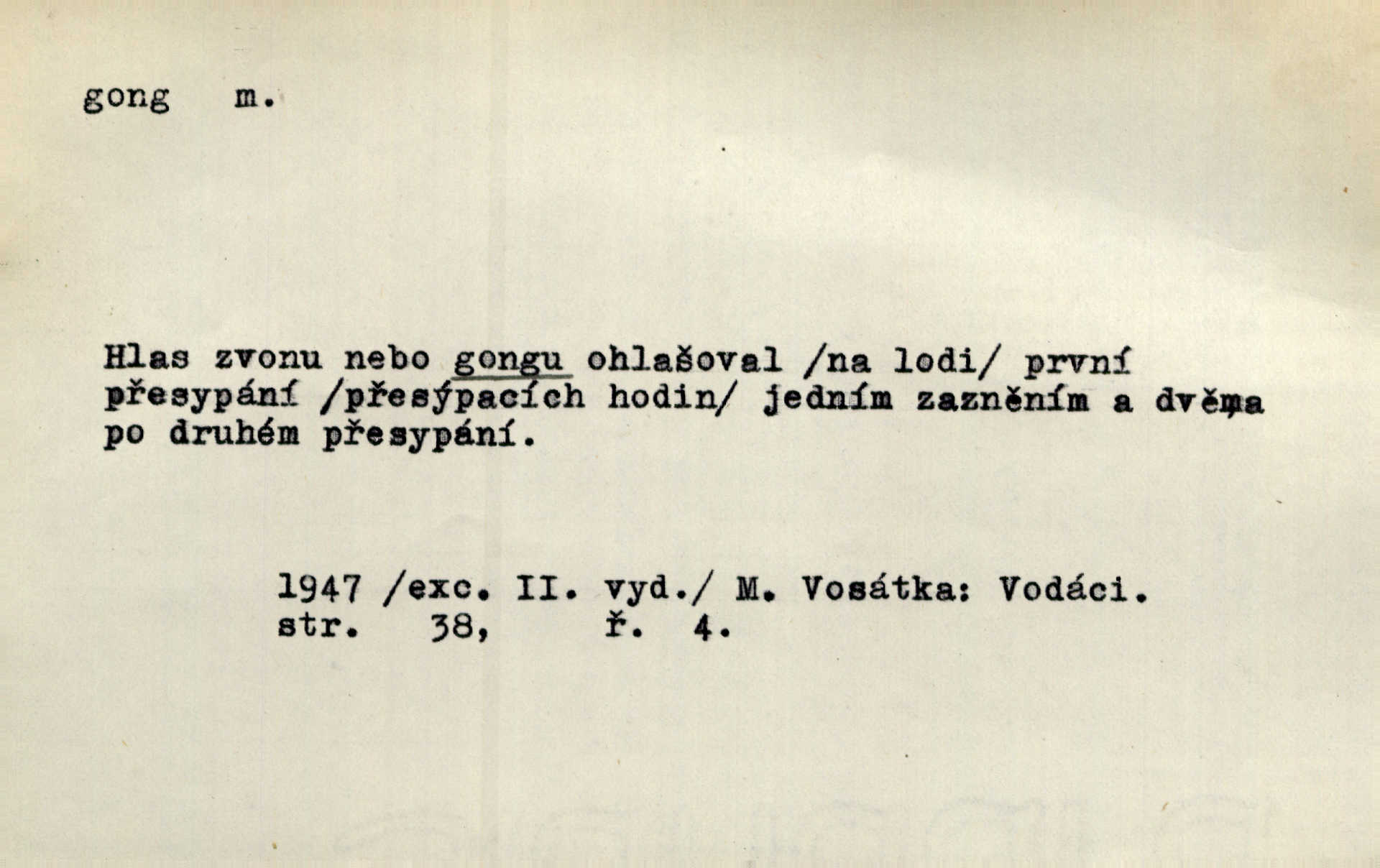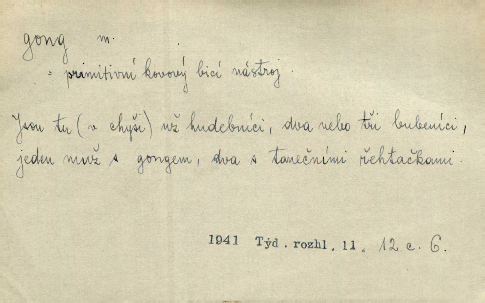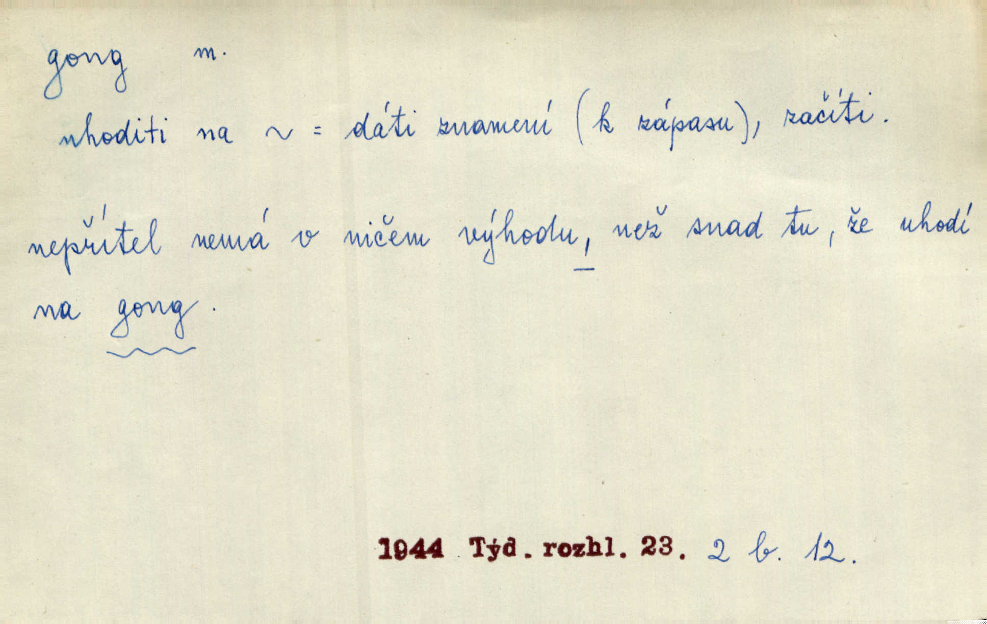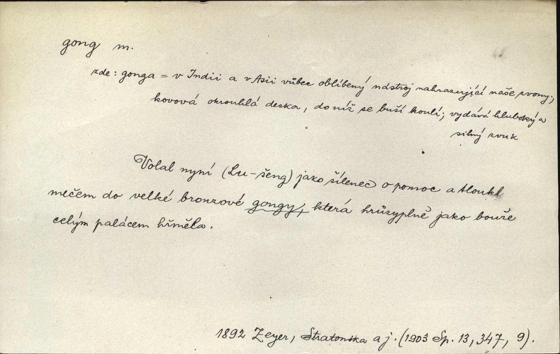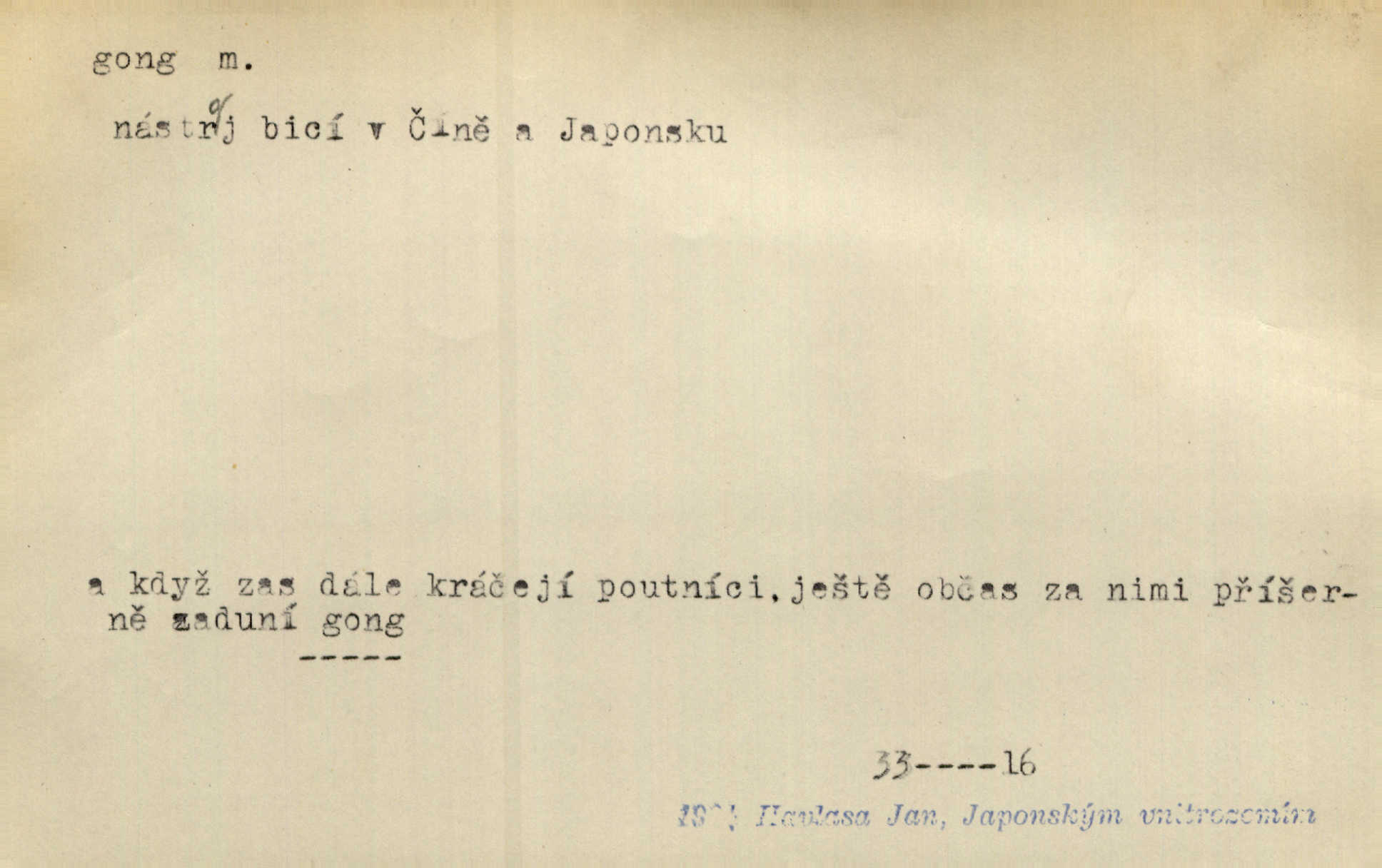 - gong, -u m. čínský bicí nástroj talířové podoby a táhlého zvuku; u nás se jím svolává k jídlu ve větších domácnostech, na lodi a p. Z jedné z pekinských ulic vybočil nádherný průvod: napřed dav otroků hřmících velikými gongy. Zey. Hud. též jako orchestrální nástroj. D u hodin bicí pružina n. tyč temného gongového zvuku. Sport. nástroj, kterým se označuje začátek a konec kola při rohování.