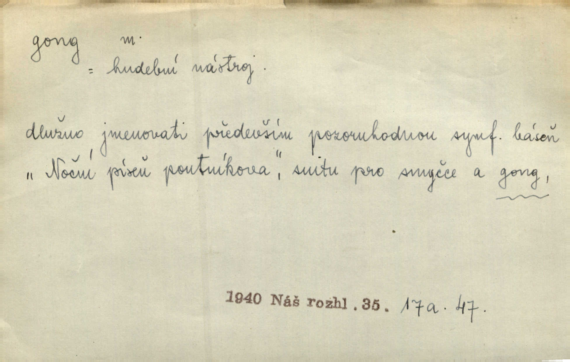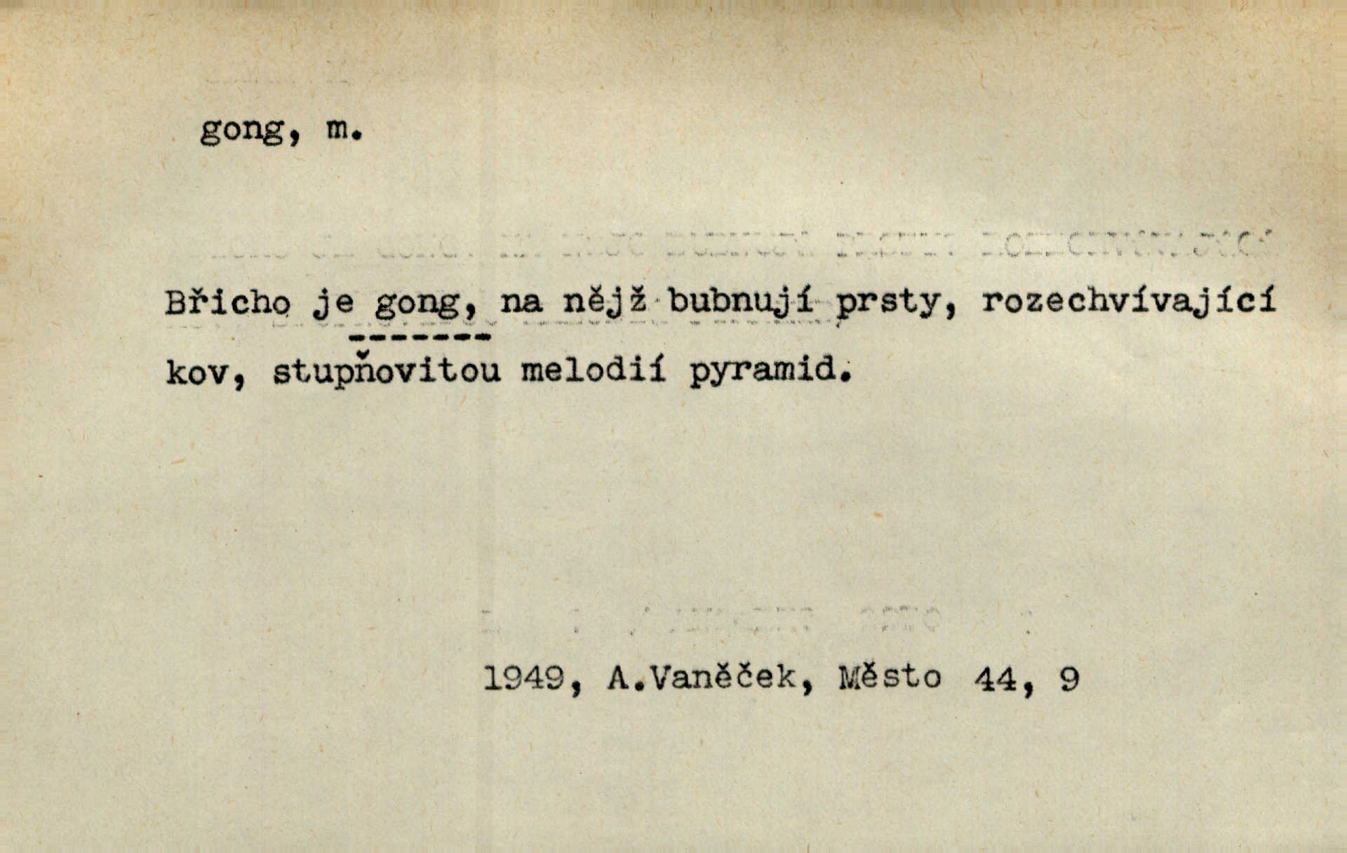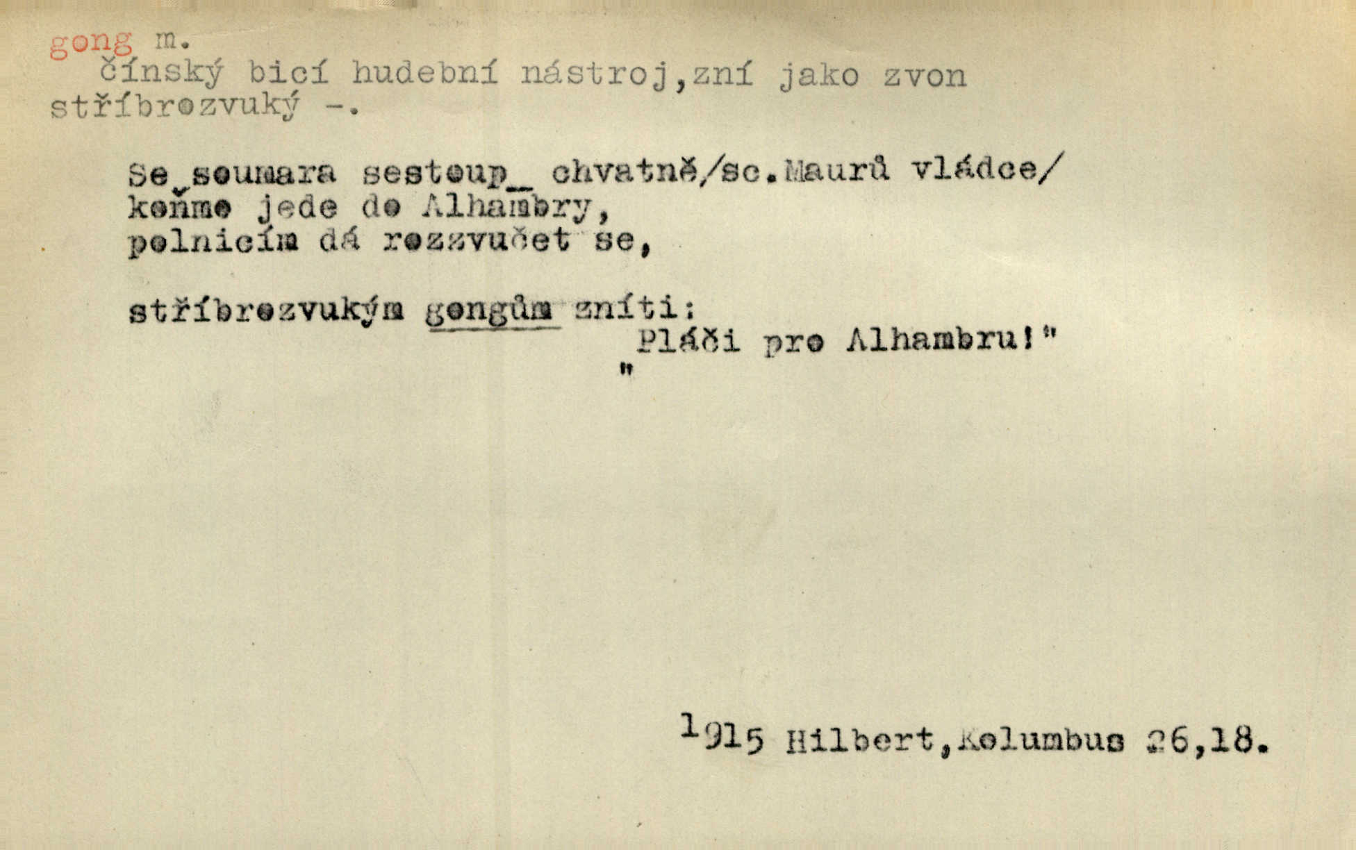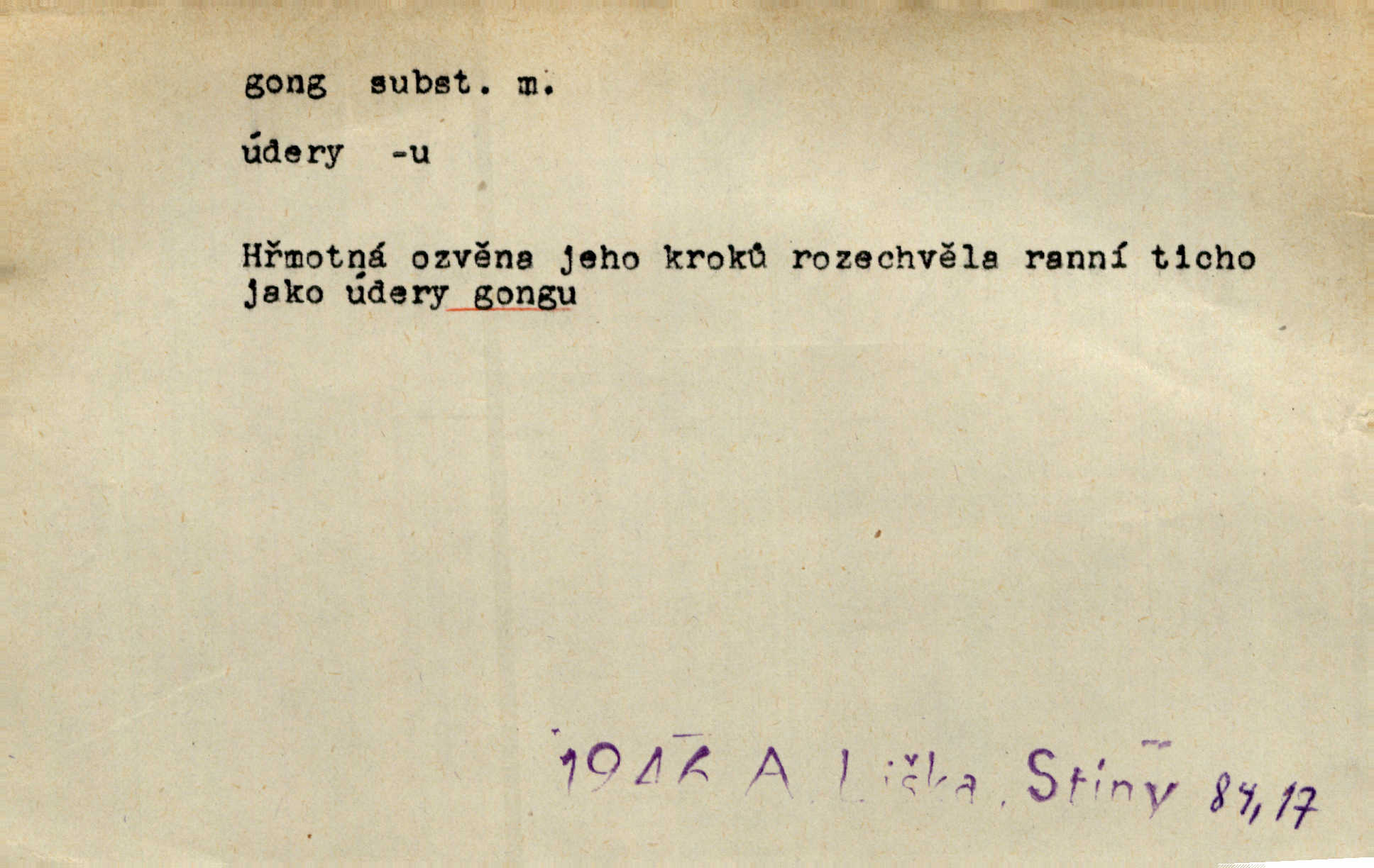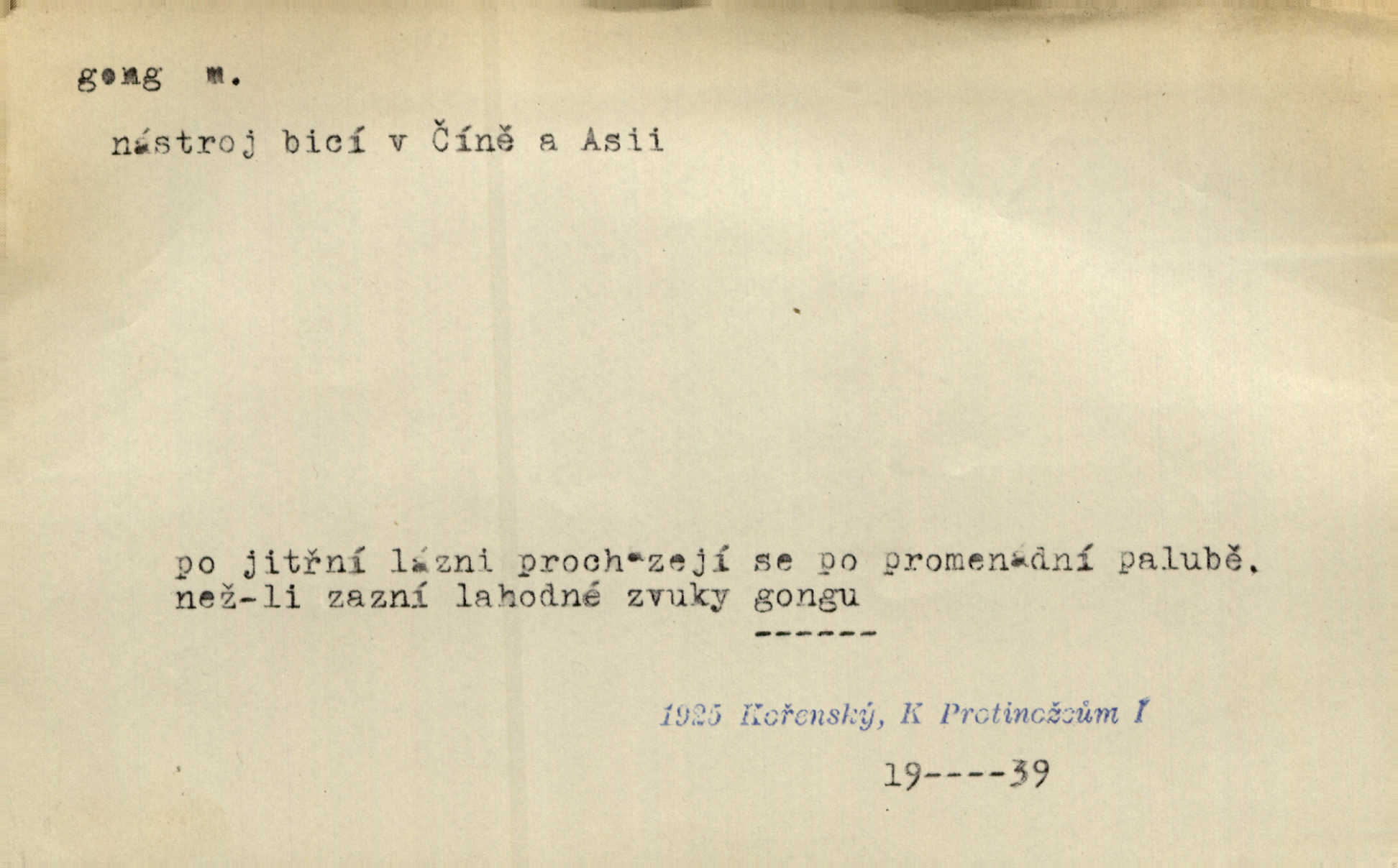 - gong, -u m. čínský bicí nástroj talířové podoby a táhlého zvuku; u nás se jím svolává k jídlu ve větších domácnostech, na lodi a p. Z jedné z pekinských ulic vybočil nádherný průvod: napřed dav otroků hřmících velikými gongy. Zey. Hud. též jako orchestrální nástroj. D u hodin bicí pružina n. tyč temného gongového zvuku. Sport. nástroj, kterým se označuje začátek a konec kola při rohování.