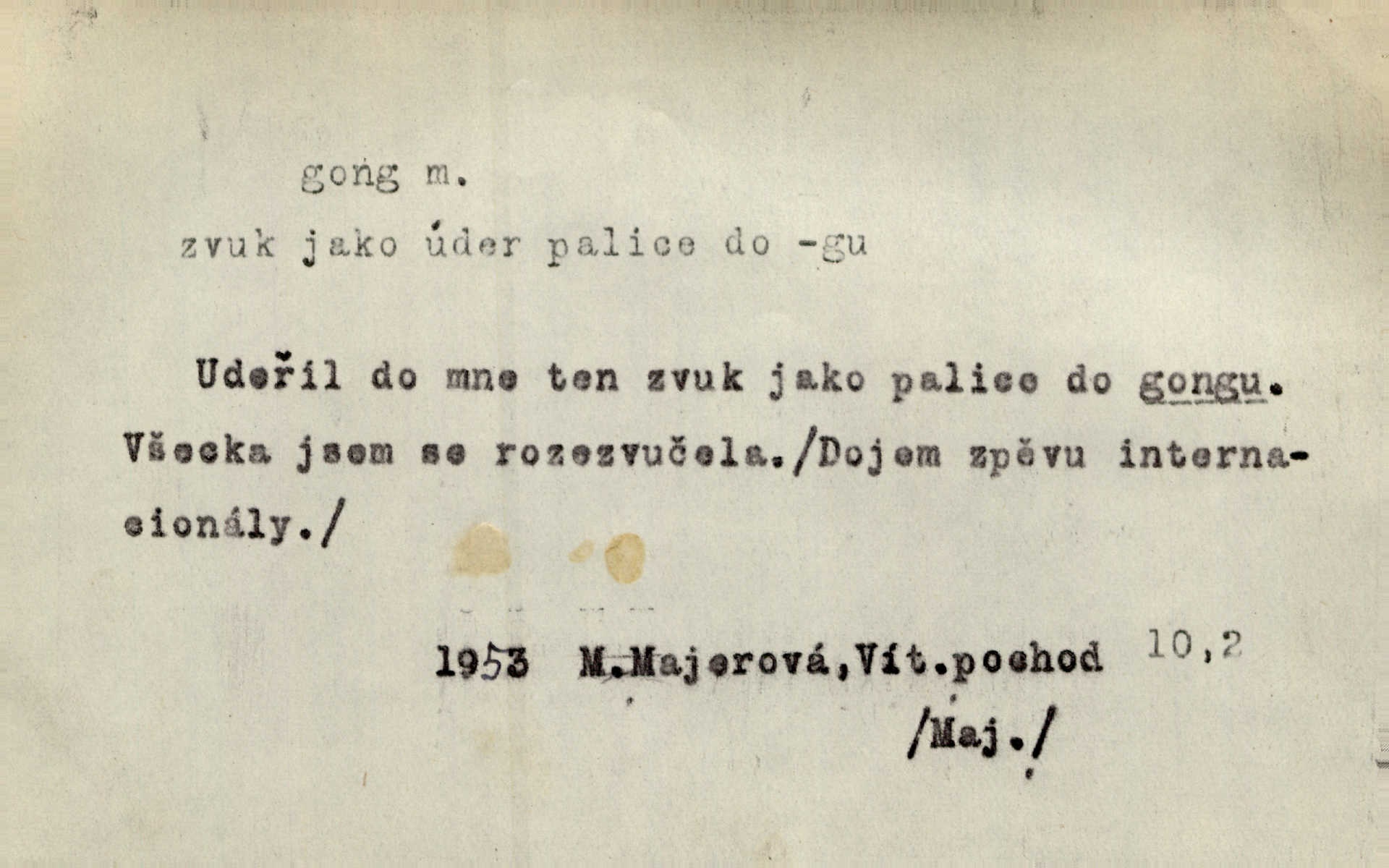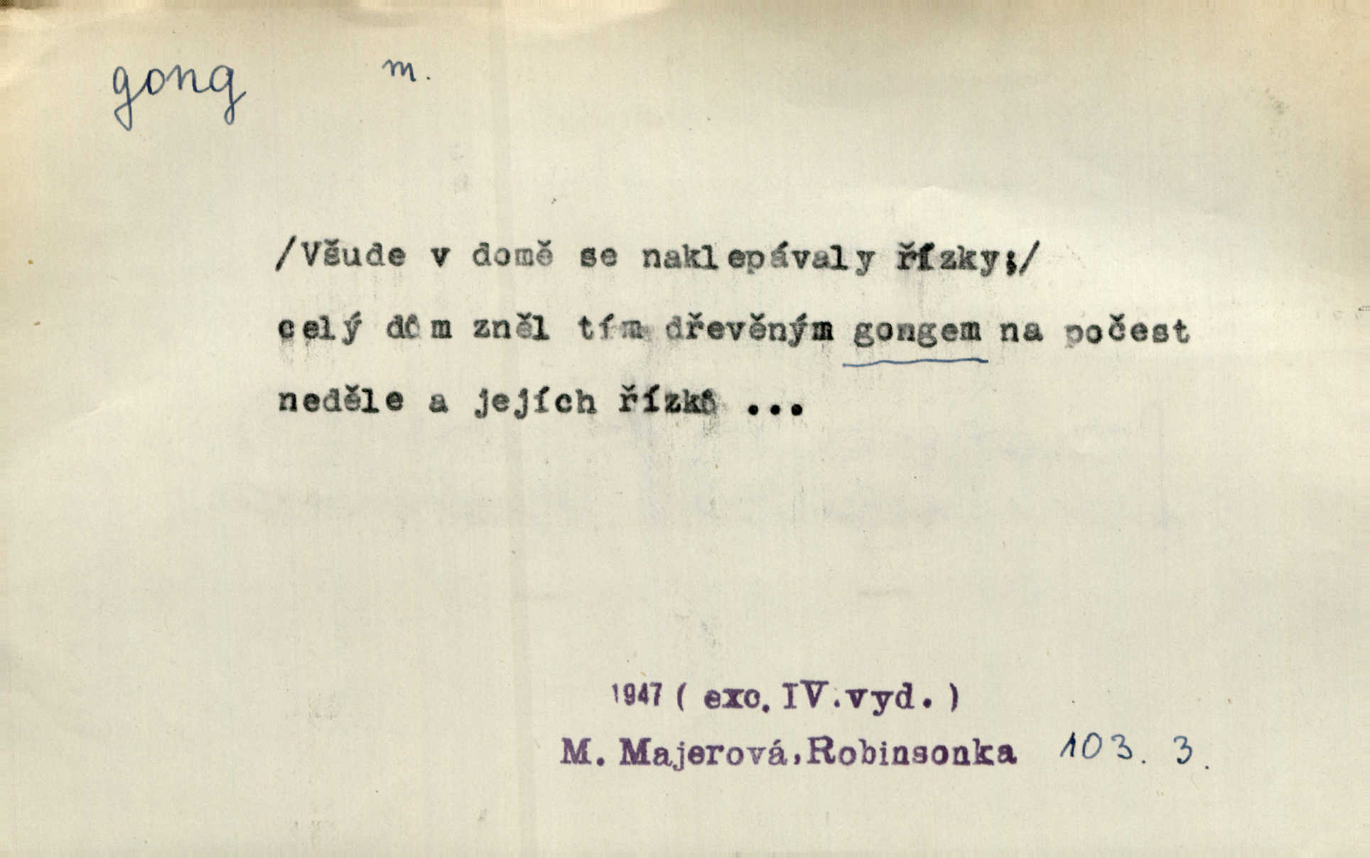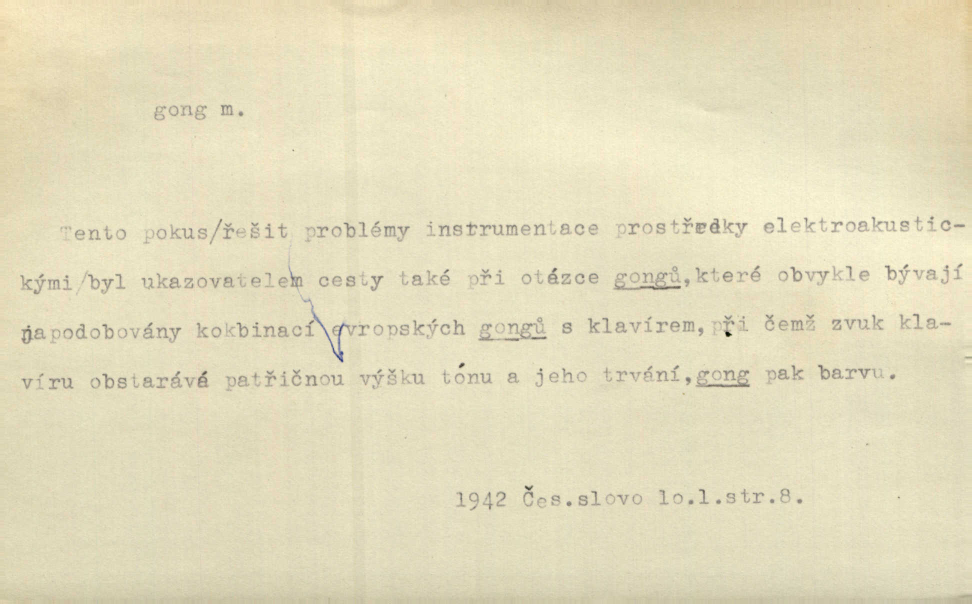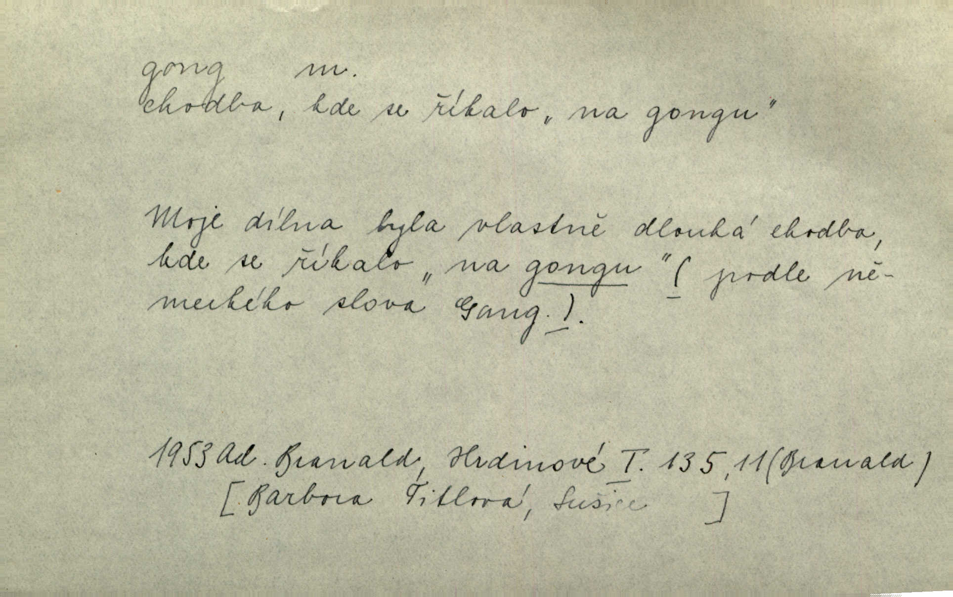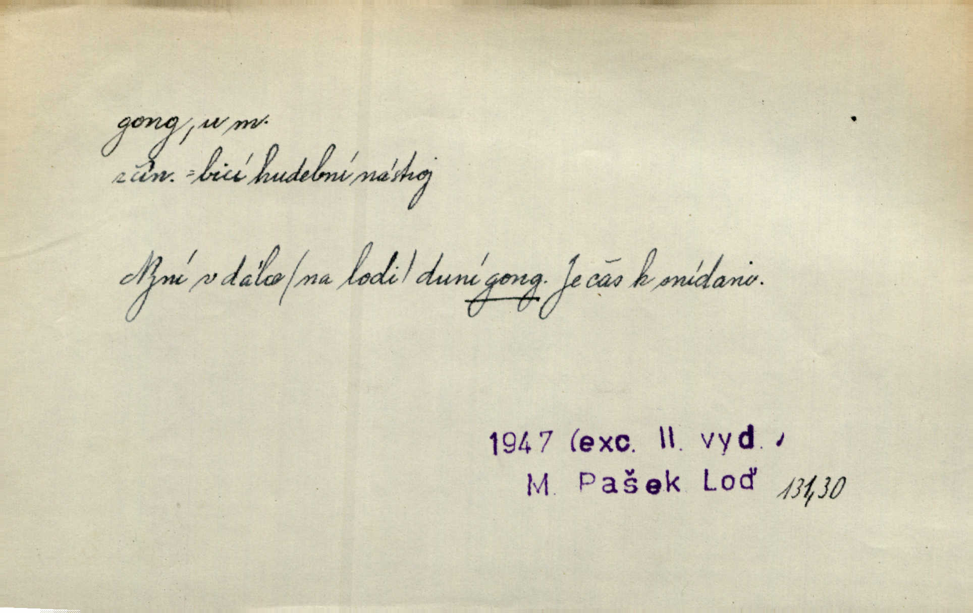 - gong, -u m. čínský bicí nástroj talířové podoby a táhlého zvuku; u nás se jím svolává k jídlu ve větších domácnostech, na lodi a p. Z jedné z pekinských ulic vybočil nádherný průvod: napřed dav otroků hřmících velikými gongy. Zey. Hud. též jako orchestrální nástroj. D u hodin bicí pružina n. tyč temného gongového zvuku. Sport. nástroj, kterým se označuje začátek a konec kola při rohování.