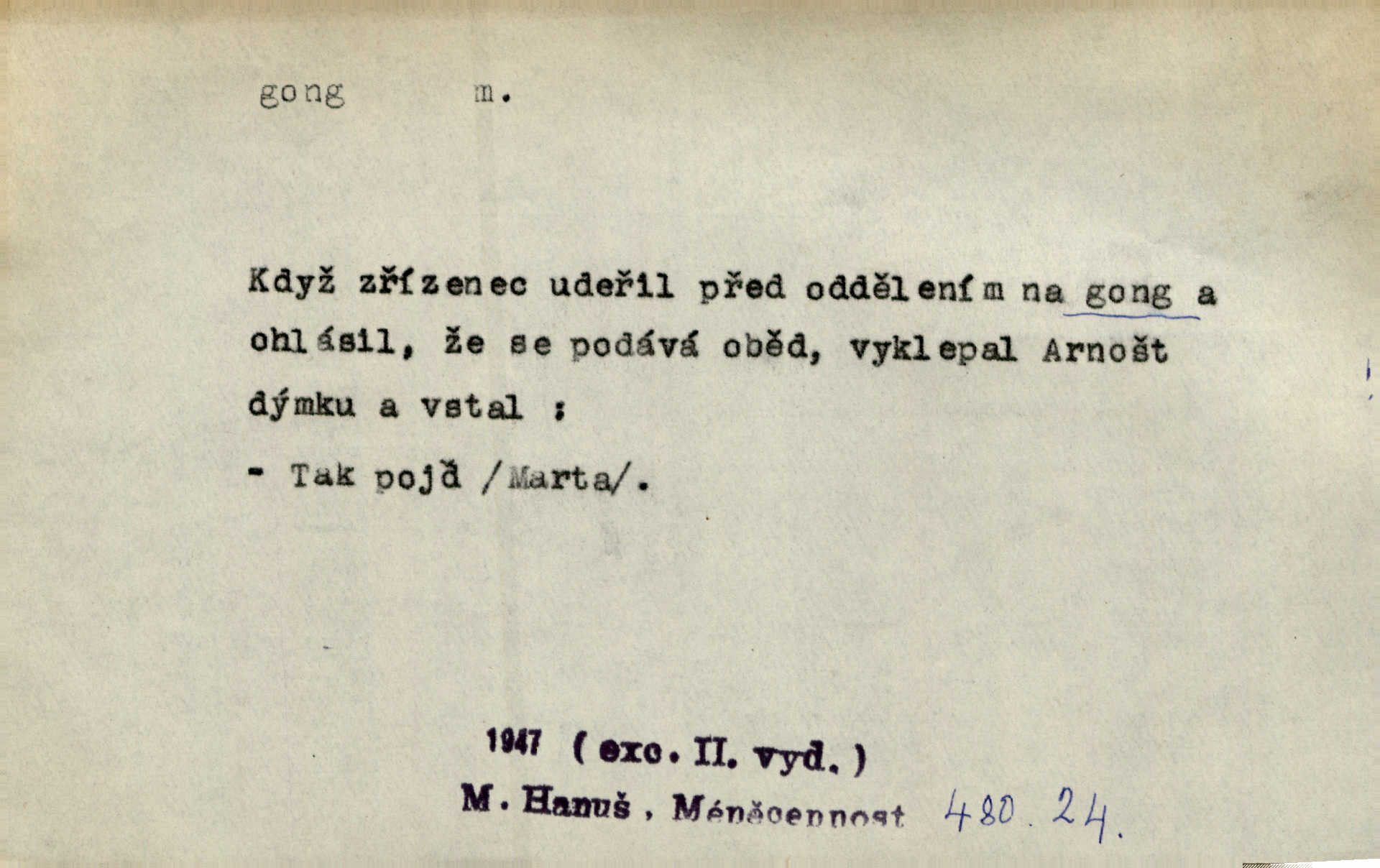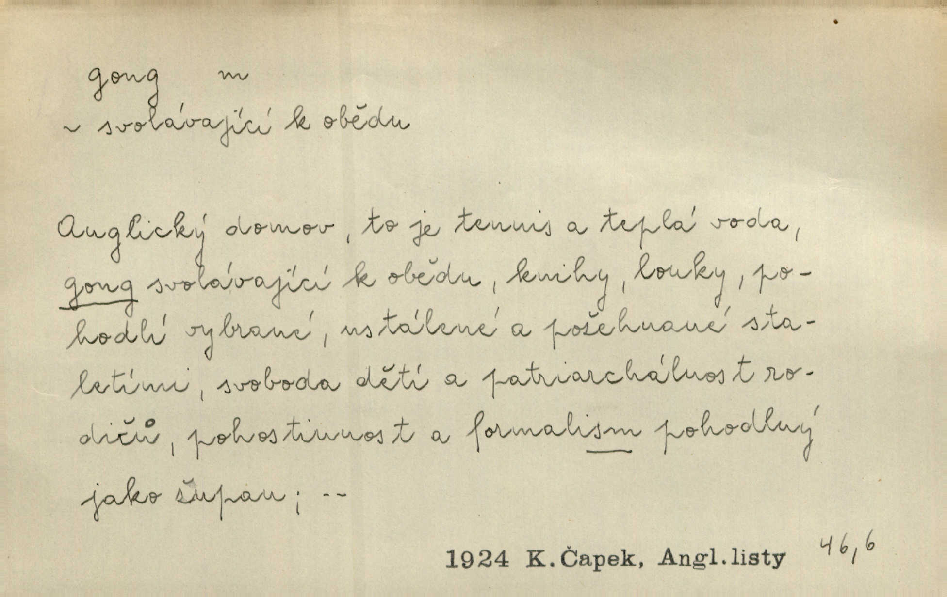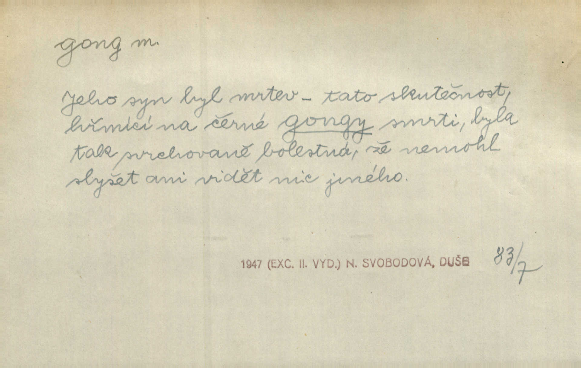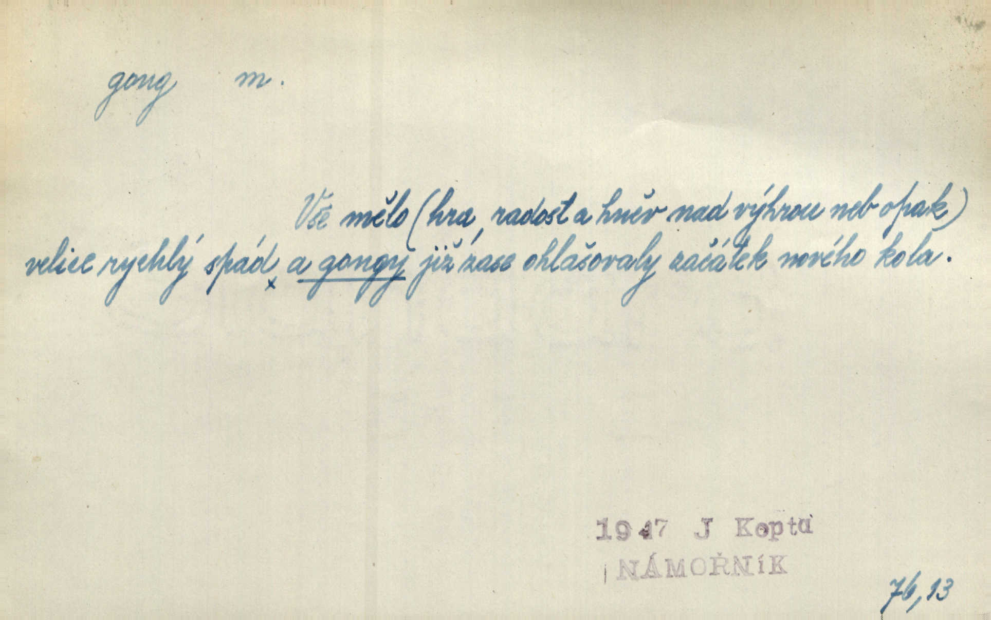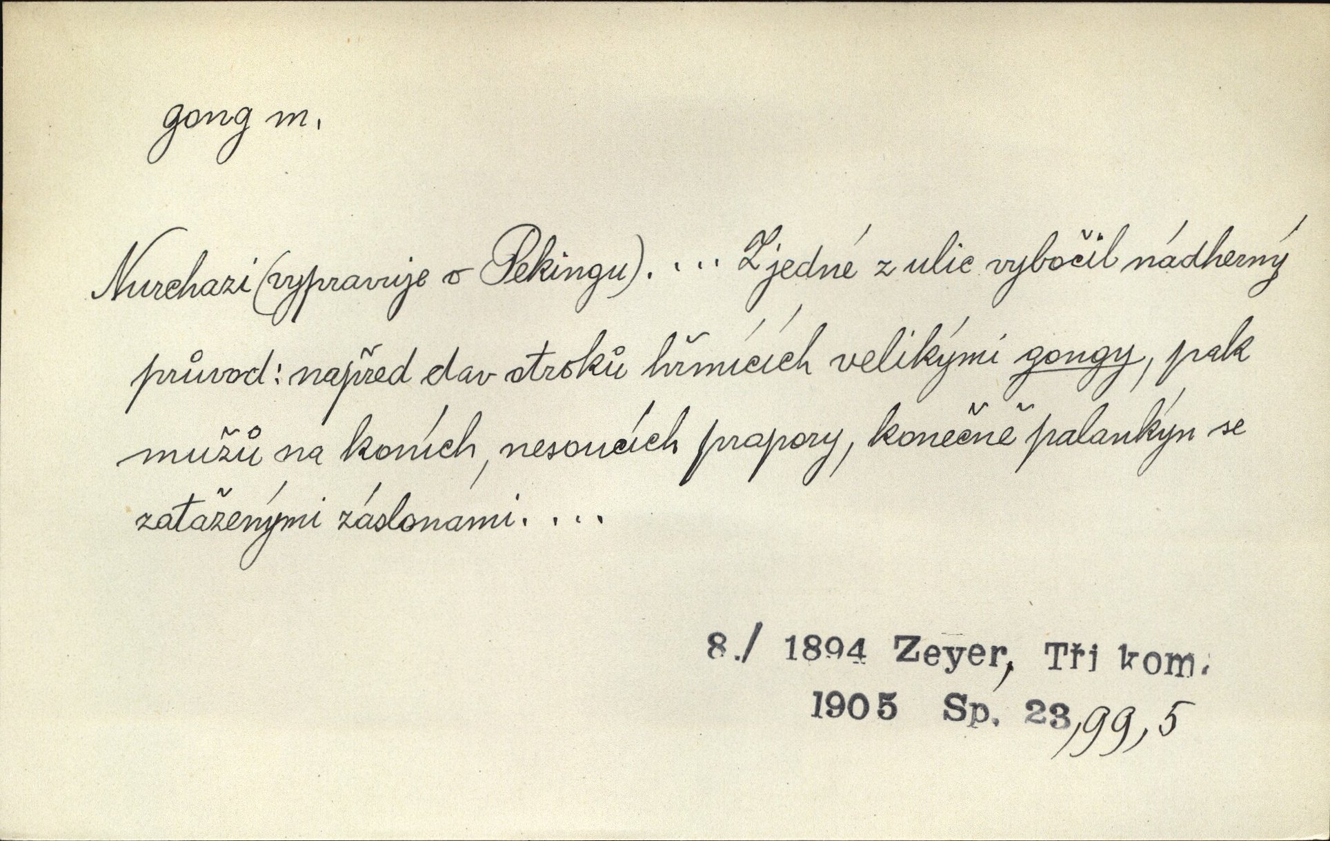 - gong, -u m. čínský bicí nástroj talířové podoby a táhlého zvuku; u nás se jím svolává k jídlu ve větších domácnostech, na lodi a p. Z jedné z pekinských ulic vybočil nádherný průvod: napřed dav otroků hřmících velikými gongy. Zey. Hud. též jako orchestrální nástroj. D u hodin bicí pružina n. tyč temného gongového zvuku. Sport. nástroj, kterým se označuje začátek a konec kola při rohování.