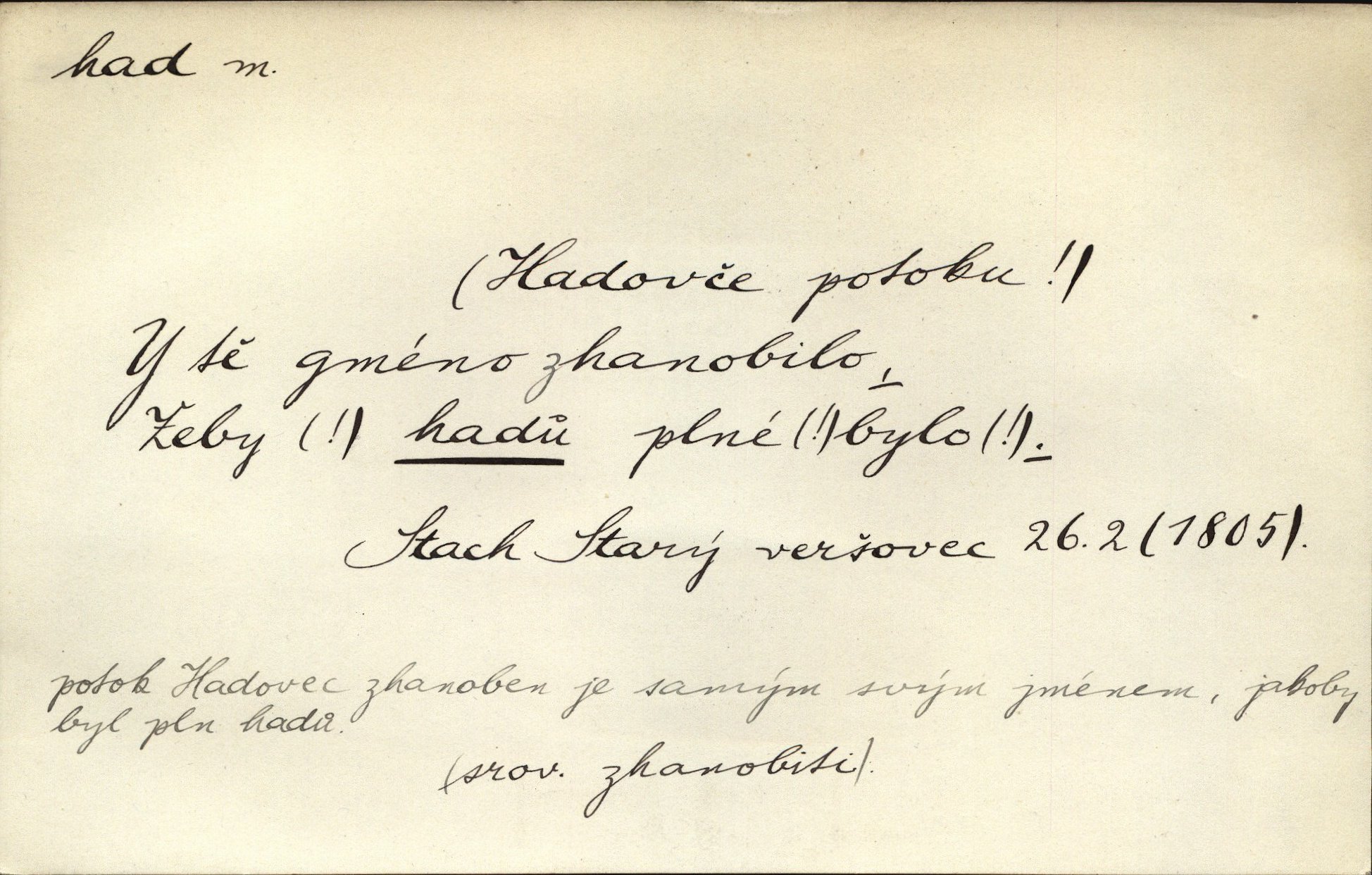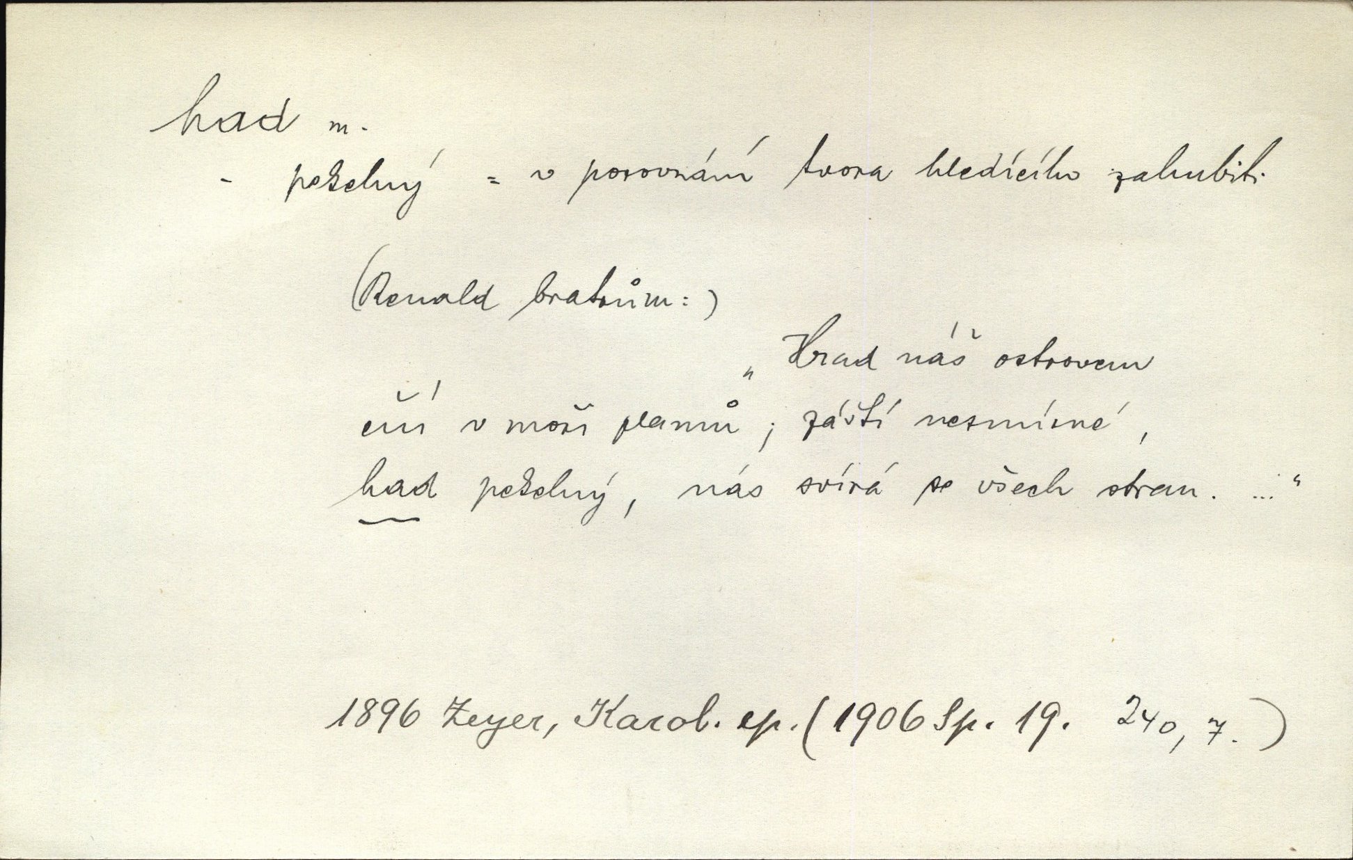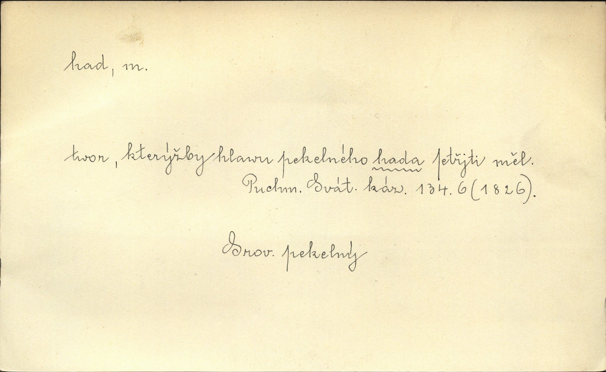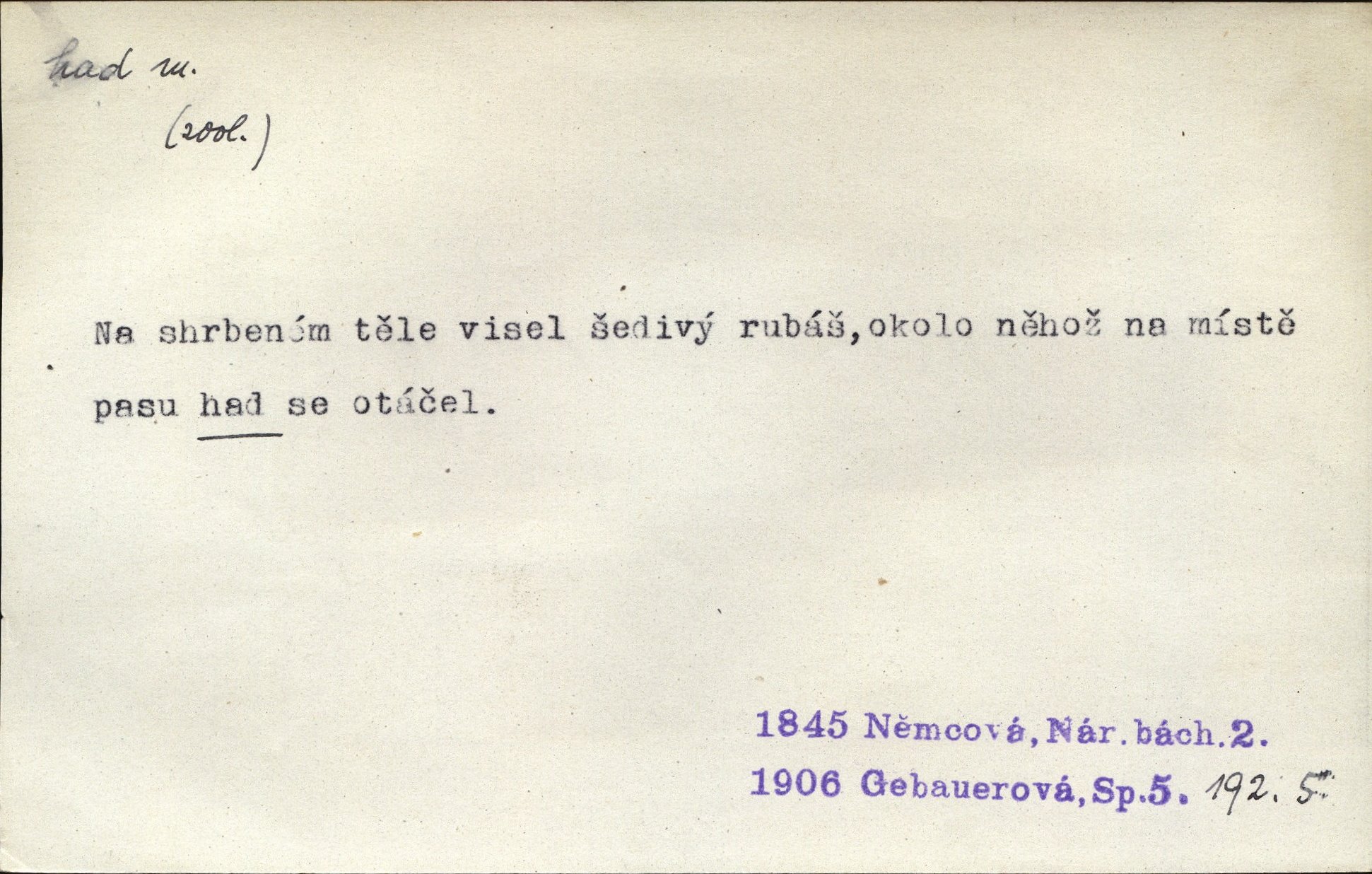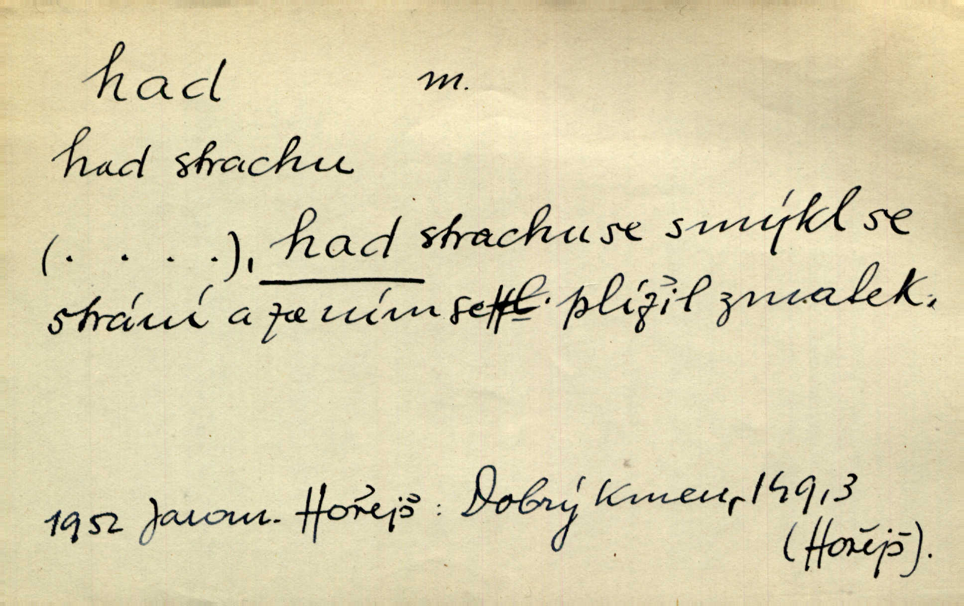 - had, -a m. zool. hadi řád plazů (Ophidia). Ustál. sp. Smaž hada, jak chceš, nebude z něho úhoř. Přísl. Od včely pochází med, od hada jed. Přísl. Nehřej hada za ňadry! Pořek. Utrhla se jakoby ji had uštknul. Herb. Muž ten byl obratný jako had. Dyk. Pamatuji se na chansonieru, štíhlou jako had. Šim. To víte, že mně peníze vždy z rukou uklouznou jako had. Svět. Mořský had novinářská kachna. V Tichém oceáně poznovu byl objeven mořský had. Herrm. D (v lidovém podání) domácí had, had hospodář, hospodáříček šotek pro štěstí. A dokud líhal pod pecí nebo pod prahem domácí Had, starý hospodář, neodešlo z rodu štěstí a požehnání. Jir. Ztracenou končinu Šlarafie — kde had hospodáříček v mandelu šelmovství spí — mi vraťte. Halas. D Přen. o věcech nějak připomínajících hada. Hleděl před se na nekonečného hada vozův i houfů. Jir. Chtěl bych jednou promluvit vážné slovo o zelených hadech čili o t. zv. trávnících na scéně. Mah. Dlaněma válela dlouhého těstového hada. Rais. Klopýtajíc přes hady kořenův, hloub a hlouběji zapadala v tmavnoucí nitro lesa. Sez. Měla vlasy upraveny v samé namaštěné hady. R. Svob. D Přen. ve výrazech abstraktních. Ten starý had v nás by to arci rád převracel a chtěl by, abychom tělu hověli a ducha uspávali ďábel, pokušení. Svět. Celerka nasadila Tomášovi hada mučivou myšlenku. Jir. Klevetím, hady nasazuju nesvár. Jir. Zašlapává hada pochybnosti. Kar. Vloudil se i do tvého srdce had plemenného záští. Čech. Podezření had jej uštkl jedovatě u srdce. Zey. Had závisti se vypjal brzy. Čech. D nadávka. „Hade jedovatý!“ řekl Kojan [synovi]. Hol. Zrádkyně, hade! Dyk. Žertovná přezdívka. „Tady je cukr, vy hadi!“ vzkřikl pan Kódl [na spoluvojáky]. Med. D Tech. trubka beze švů stočená do šroubovice v ploše nebo do spirály. Had topný, chladicí, vodní, trubkový. Váleč. druh někdejších děl. Přiběhli feuerwerkři od kartounů, falkonů a hadů. Dur. Had jm. souhvězdí. Těl. hra na hada, stahování hada druh hry. D Argot. řemen, řetěz, zrádce.