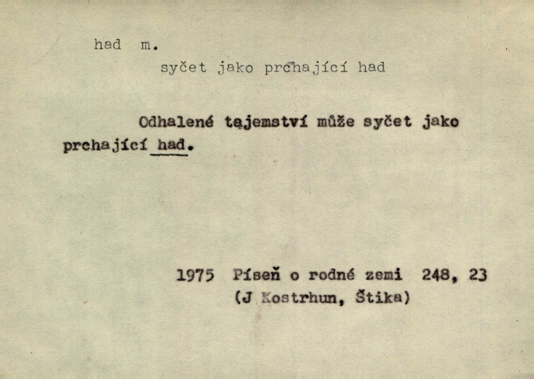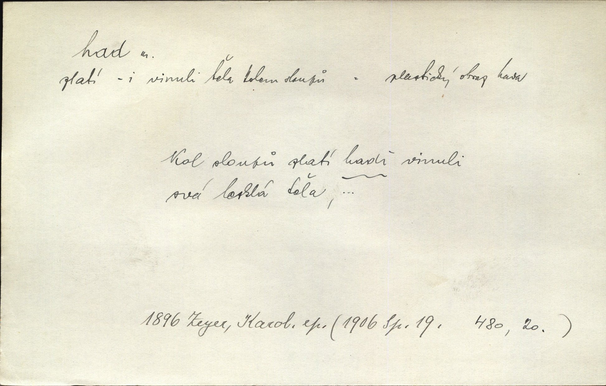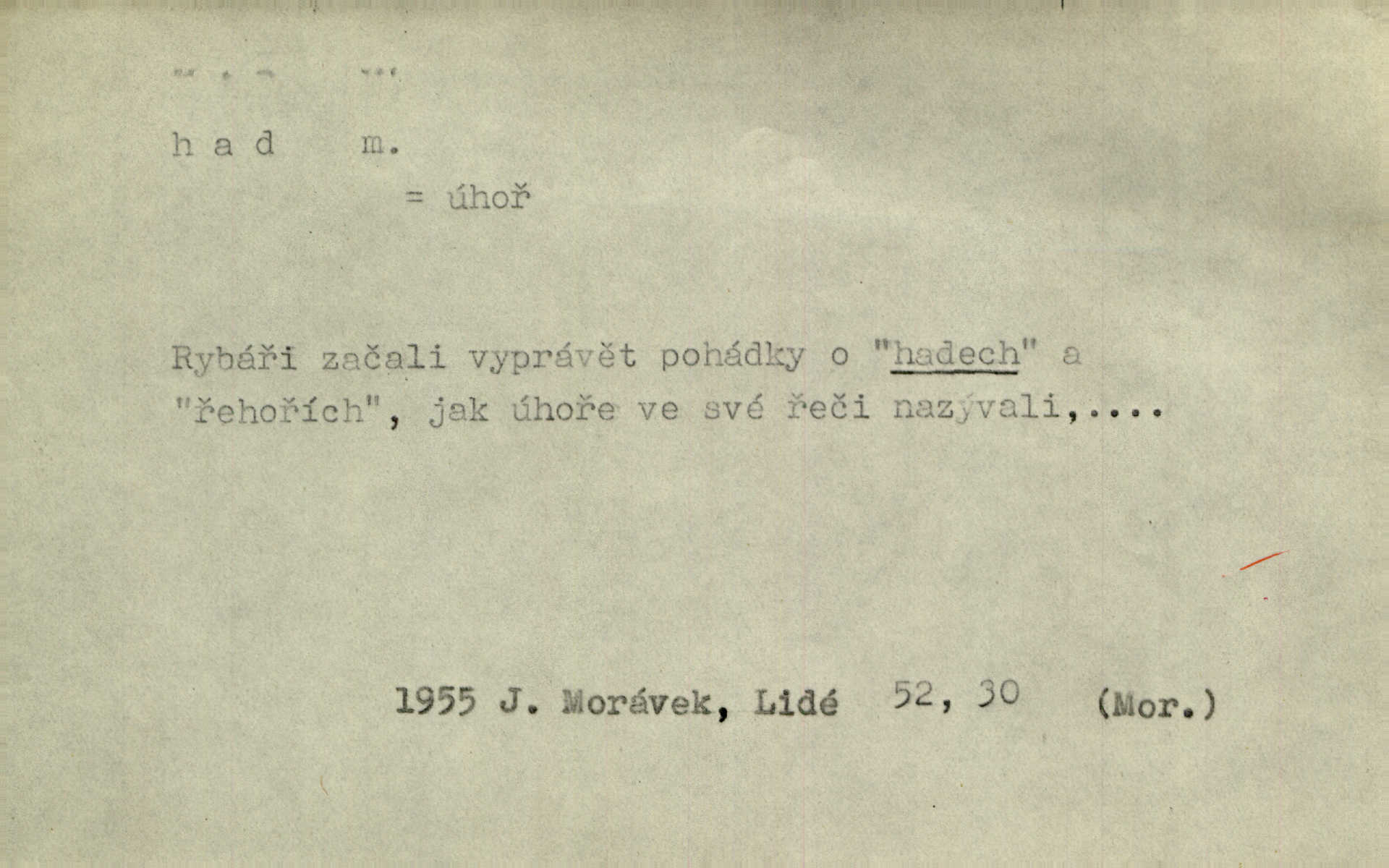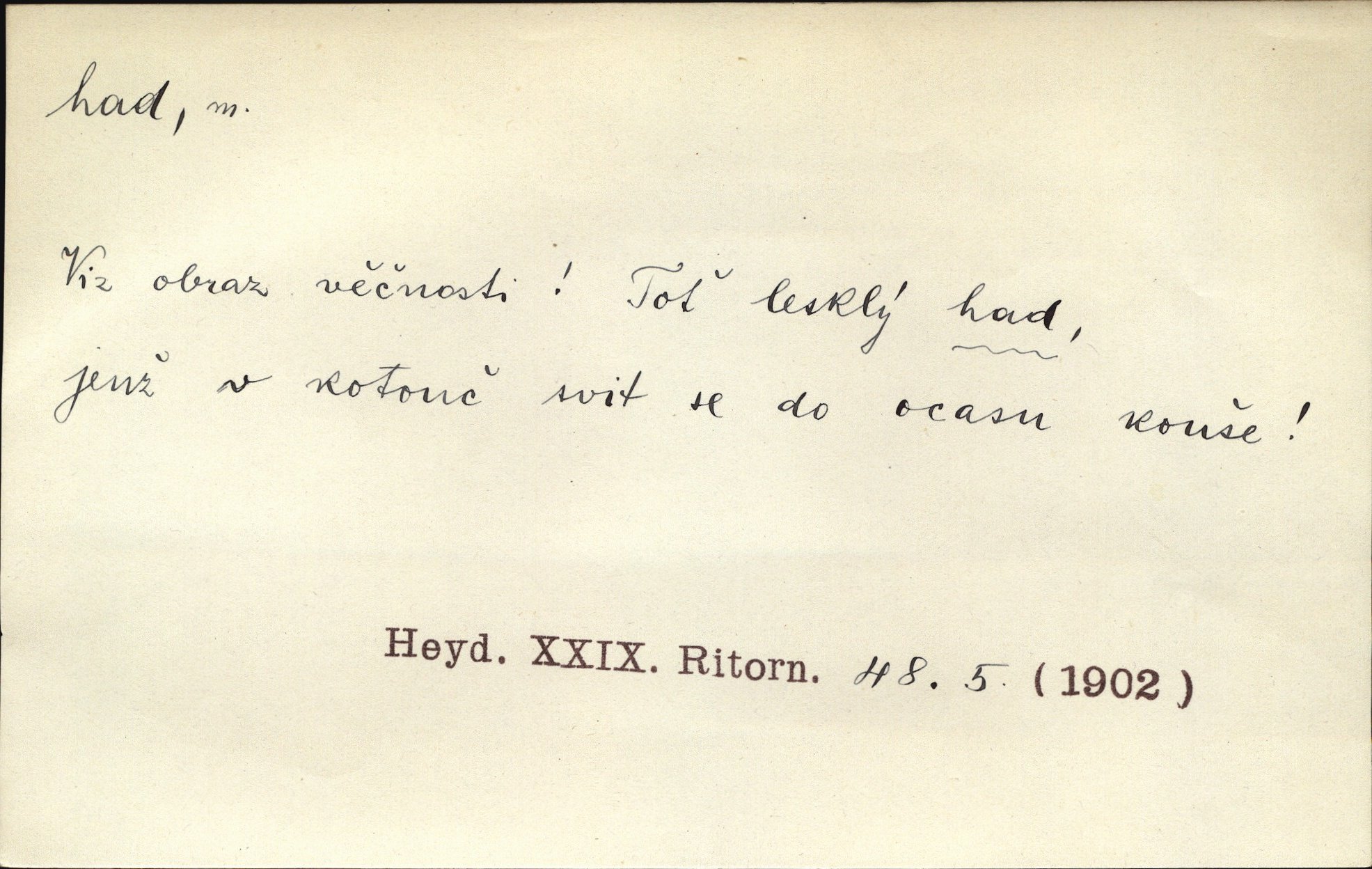 - had, -a m. zool. hadi řád plazů (Ophidia). Ustál. sp. Smaž hada, jak chceš, nebude z něho úhoř. Přísl. Od včely pochází med, od hada jed. Přísl. Nehřej hada za ňadry! Pořek. Utrhla se jakoby ji had uštknul. Herb. Muž ten byl obratný jako had. Dyk. Pamatuji se na chansonieru, štíhlou jako had. Šim. To víte, že mně peníze vždy z rukou uklouznou jako had. Svět. Mořský had novinářská kachna. V Tichém oceáně poznovu byl objeven mořský had. Herrm. D (v lidovém podání) domácí had, had hospodář, hospodáříček šotek pro štěstí. A dokud líhal pod pecí nebo pod prahem domácí Had, starý hospodář, neodešlo z rodu štěstí a požehnání. Jir. Ztracenou končinu Šlarafie — kde had hospodáříček v mandelu šelmovství spí — mi vraťte. Halas. D Přen. o věcech nějak připomínajících hada. Hleděl před se na nekonečného hada vozův i houfů. Jir. Chtěl bych jednou promluvit vážné slovo o zelených hadech čili o t. zv. trávnících na scéně. Mah. Dlaněma válela dlouhého těstového hada. Rais. Klopýtajíc přes hady kořenův, hloub a hlouběji zapadala v tmavnoucí nitro lesa. Sez. Měla vlasy upraveny v samé namaštěné hady. R. Svob. D Přen. ve výrazech abstraktních. Ten starý had v nás by to arci rád převracel a chtěl by, abychom tělu hověli a ducha uspávali ďábel, pokušení. Svět. Celerka nasadila Tomášovi hada mučivou myšlenku. Jir. Klevetím, hady nasazuju nesvár. Jir. Zašlapává hada pochybnosti. Kar. Vloudil se i do tvého srdce had plemenného záští. Čech. Podezření had jej uštkl jedovatě u srdce. Zey. Had závisti se vypjal brzy. Čech. D nadávka. „Hade jedovatý!“ řekl Kojan [synovi]. Hol. Zrádkyně, hade! Dyk. Žertovná přezdívka. „Tady je cukr, vy hadi!“ vzkřikl pan Kódl [na spoluvojáky]. Med. D Tech. trubka beze švů stočená do šroubovice v ploše nebo do spirály. Had topný, chladicí, vodní, trubkový. Váleč. druh někdejších děl. Přiběhli feuerwerkři od kartounů, falkonů a hadů. Dur. Had jm. souhvězdí. Těl. hra na hada, stahování hada druh hry. D Argot. řemen, řetěz, zrádce.