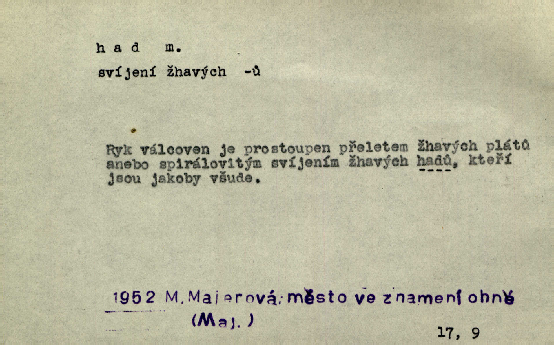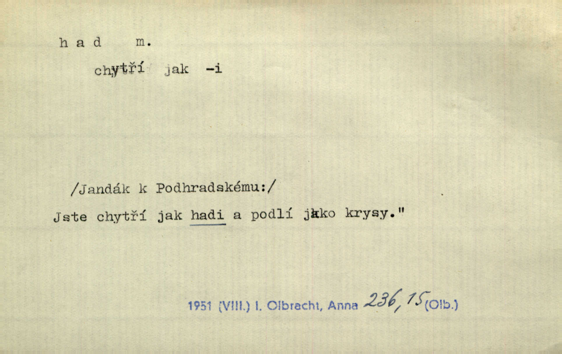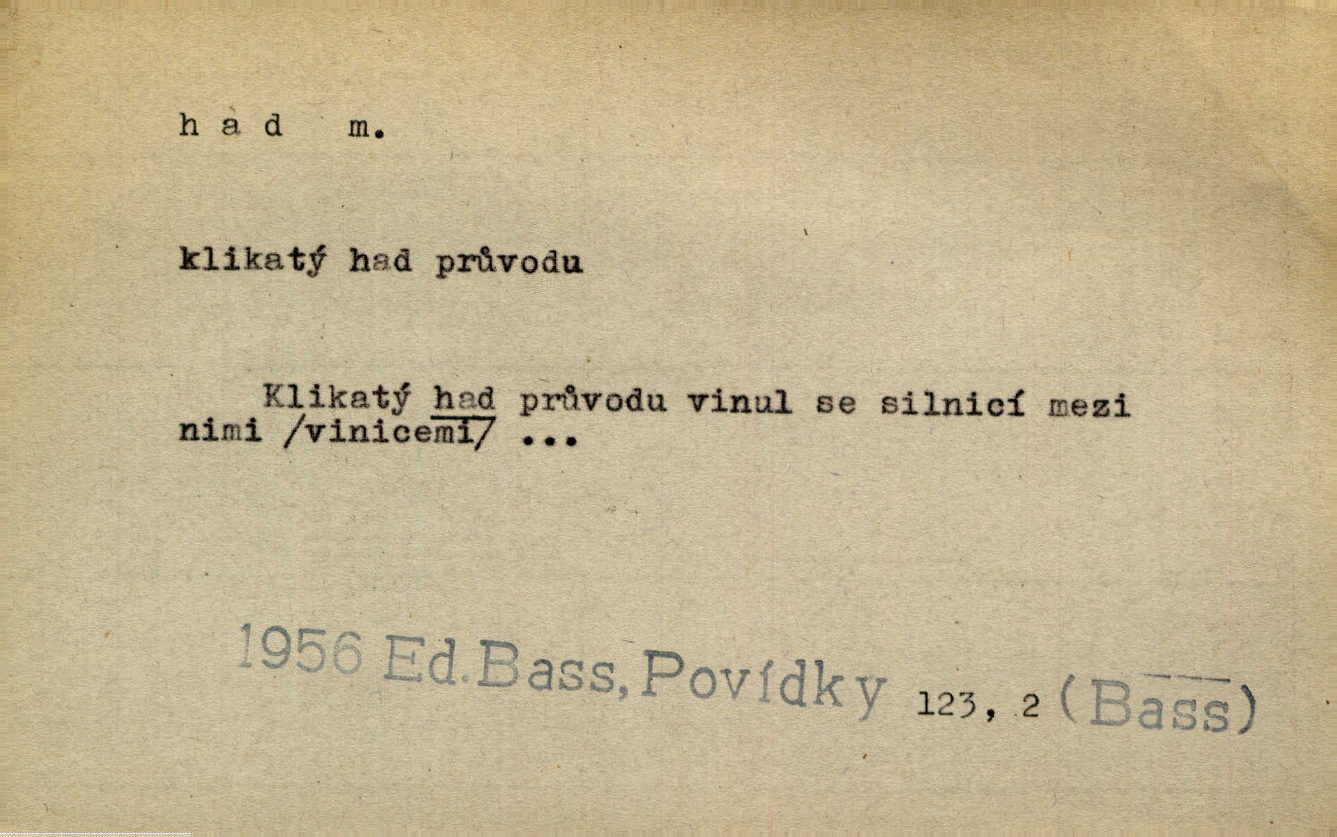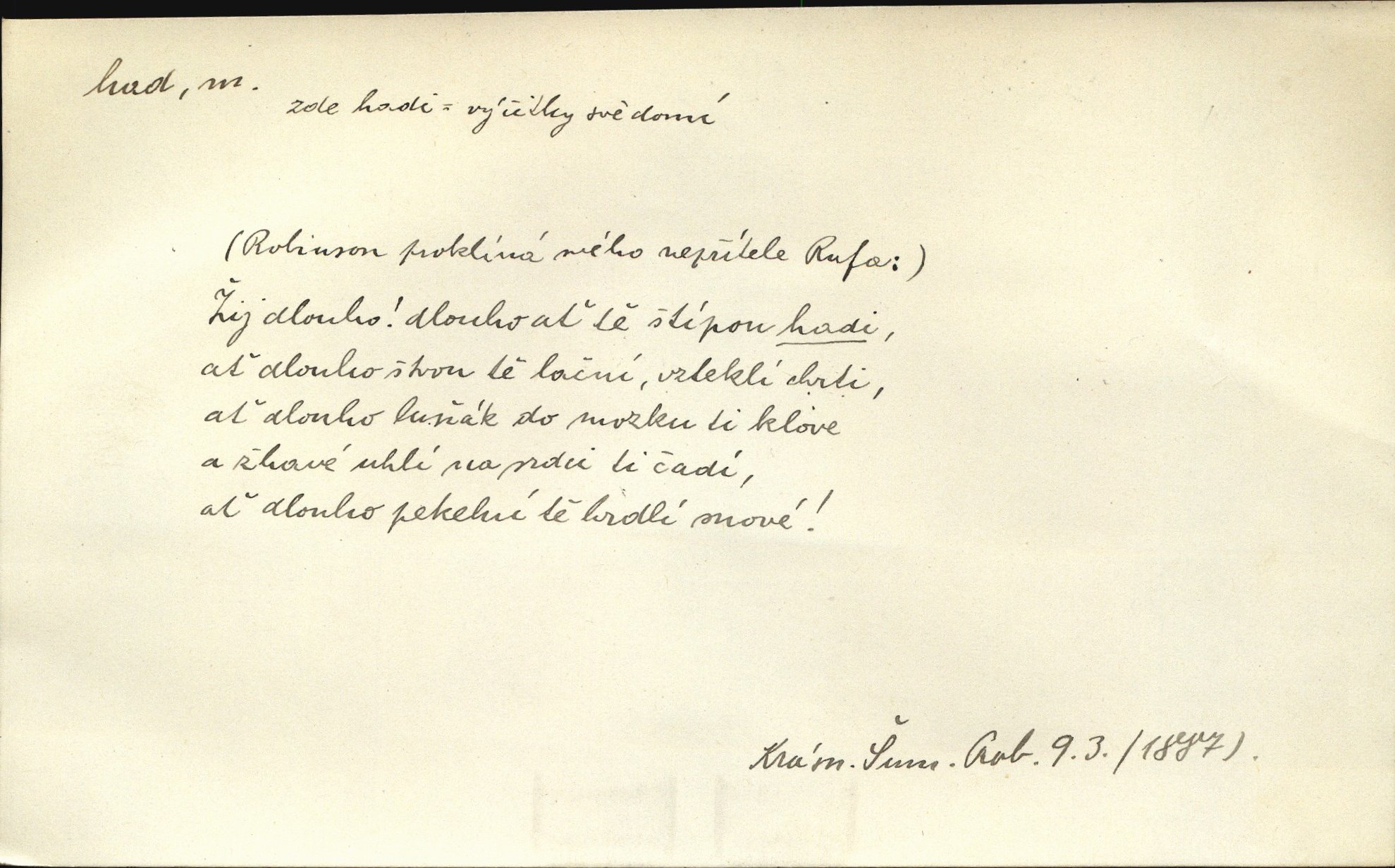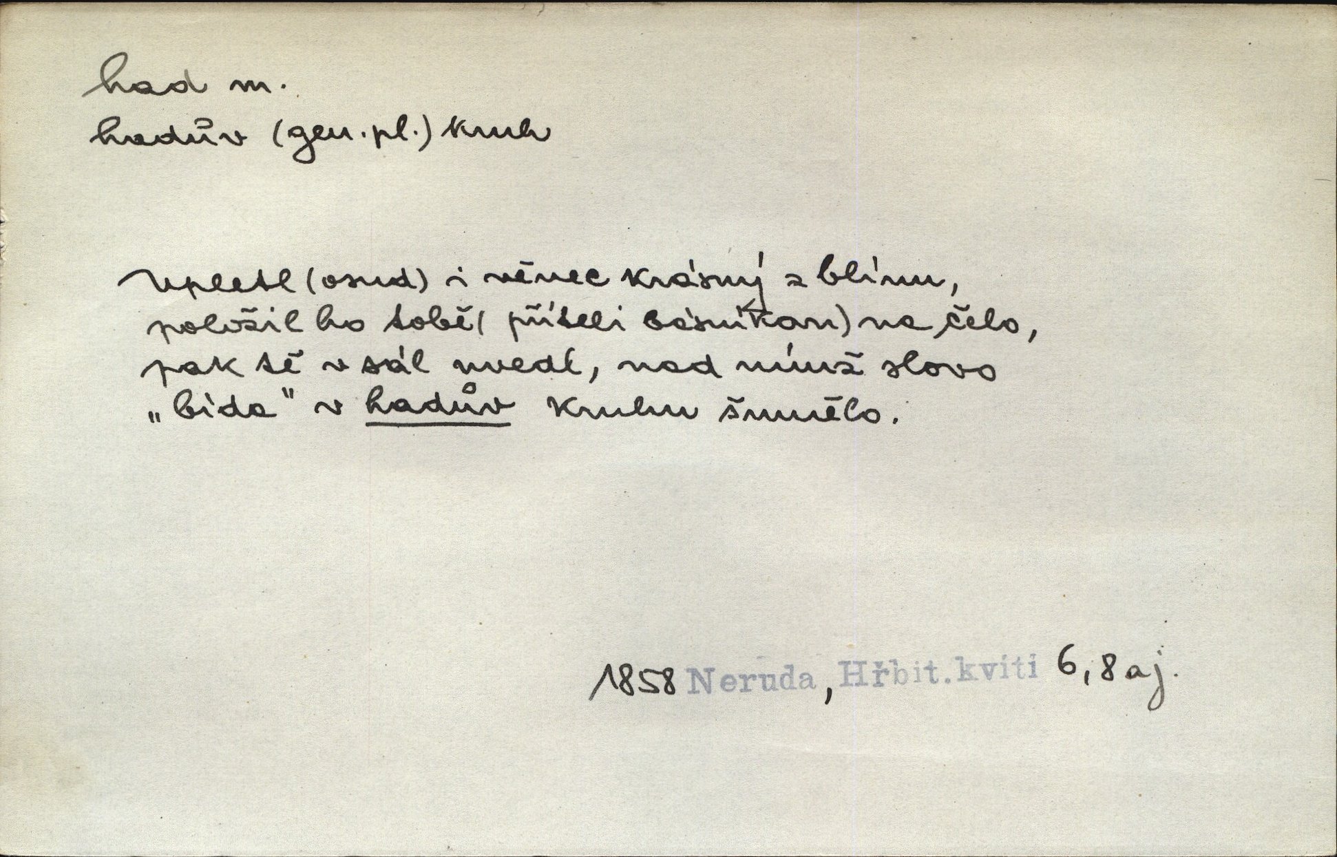 - had, -a m. zool. hadi řád plazů (Ophidia). Ustál. sp. Smaž hada, jak chceš, nebude z něho úhoř. Přísl. Od včely pochází med, od hada jed. Přísl. Nehřej hada za ňadry! Pořek. Utrhla se jakoby ji had uštknul. Herb. Muž ten byl obratný jako had. Dyk. Pamatuji se na chansonieru, štíhlou jako had. Šim. To víte, že mně peníze vždy z rukou uklouznou jako had. Svět. Mořský had novinářská kachna. V Tichém oceáně poznovu byl objeven mořský had. Herrm. D (v lidovém podání) domácí had, had hospodář, hospodáříček šotek pro štěstí. A dokud líhal pod pecí nebo pod prahem domácí Had, starý hospodář, neodešlo z rodu štěstí a požehnání. Jir. Ztracenou končinu Šlarafie — kde had hospodáříček v mandelu šelmovství spí — mi vraťte. Halas. D Přen. o věcech nějak připomínajících hada. Hleděl před se na nekonečného hada vozův i houfů. Jir. Chtěl bych jednou promluvit vážné slovo o zelených hadech čili o t. zv. trávnících na scéně. Mah. Dlaněma válela dlouhého těstového hada. Rais. Klopýtajíc přes hady kořenův, hloub a hlouběji zapadala v tmavnoucí nitro lesa. Sez. Měla vlasy upraveny v samé namaštěné hady. R. Svob. D Přen. ve výrazech abstraktních. Ten starý had v nás by to arci rád převracel a chtěl by, abychom tělu hověli a ducha uspávali ďábel, pokušení. Svět. Celerka nasadila Tomášovi hada mučivou myšlenku. Jir. Klevetím, hady nasazuju nesvár. Jir. Zašlapává hada pochybnosti. Kar. Vloudil se i do tvého srdce had plemenného záští. Čech. Podezření had jej uštkl jedovatě u srdce. Zey. Had závisti se vypjal brzy. Čech. D nadávka. „Hade jedovatý!“ řekl Kojan [synovi]. Hol. Zrádkyně, hade! Dyk. Žertovná přezdívka. „Tady je cukr, vy hadi!“ vzkřikl pan Kódl [na spoluvojáky]. Med. D Tech. trubka beze švů stočená do šroubovice v ploše nebo do spirály. Had topný, chladicí, vodní, trubkový. Váleč. druh někdejších děl. Přiběhli feuerwerkři od kartounů, falkonů a hadů. Dur. Had jm. souhvězdí. Těl. hra na hada, stahování hada druh hry. D Argot. řemen, řetěz, zrádce.