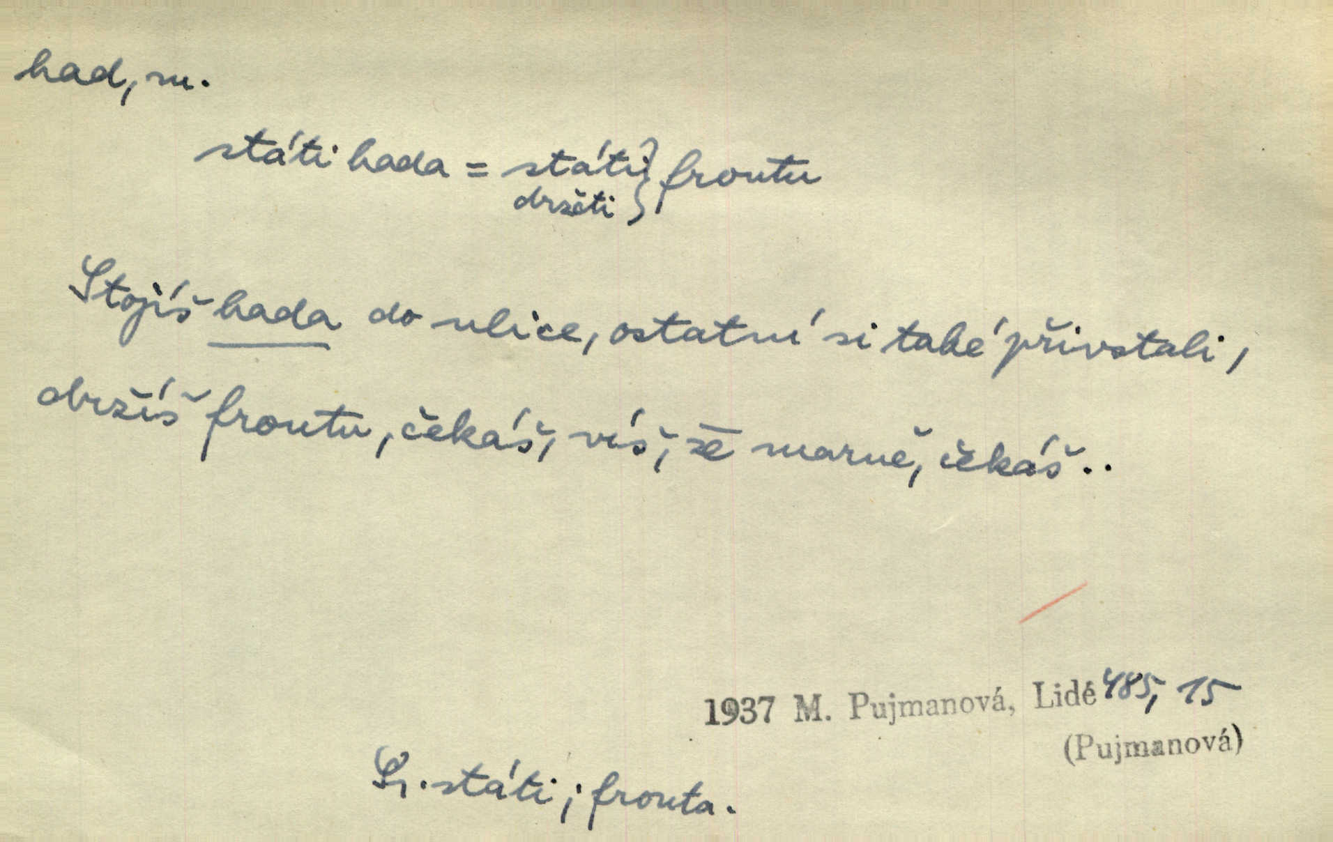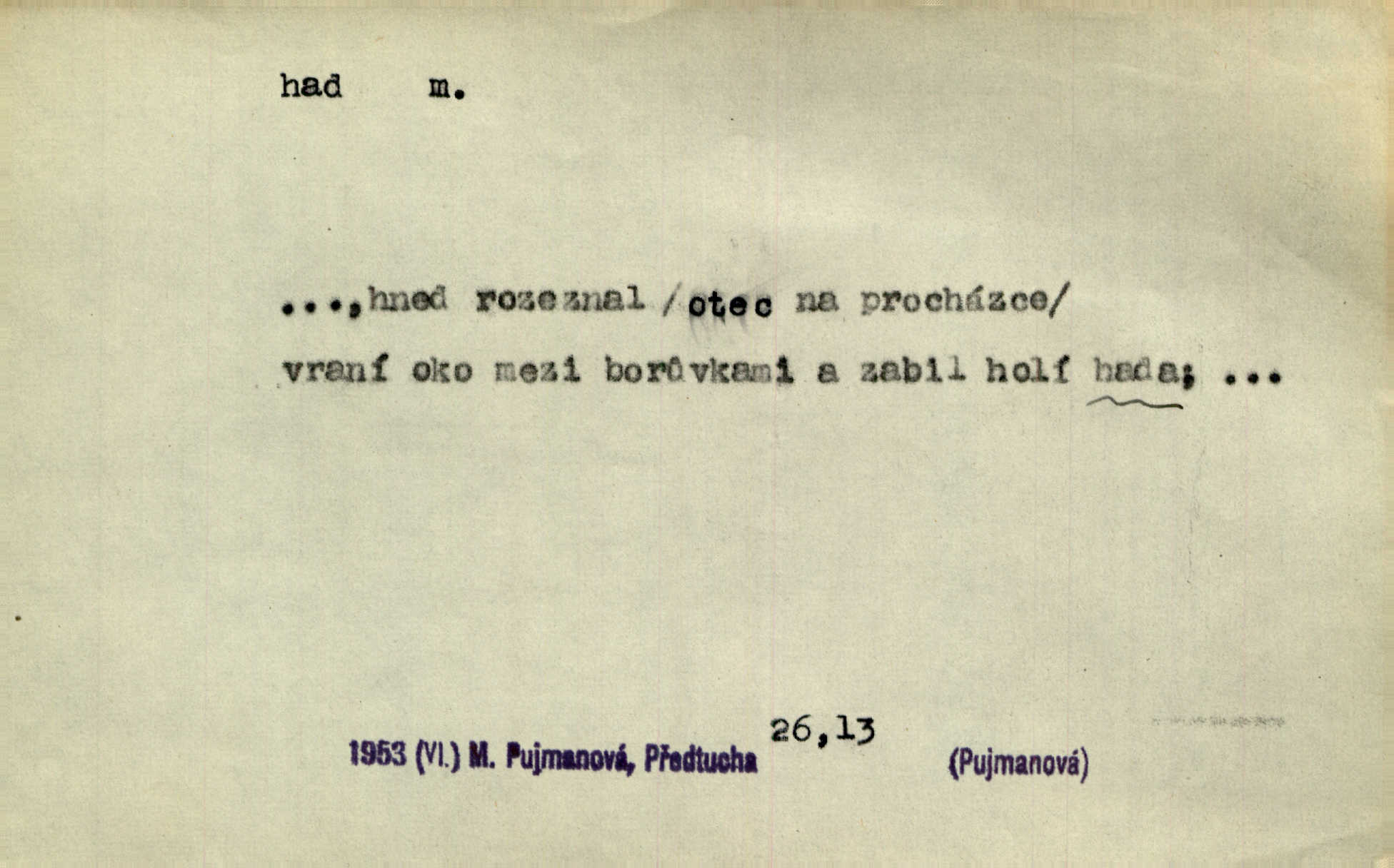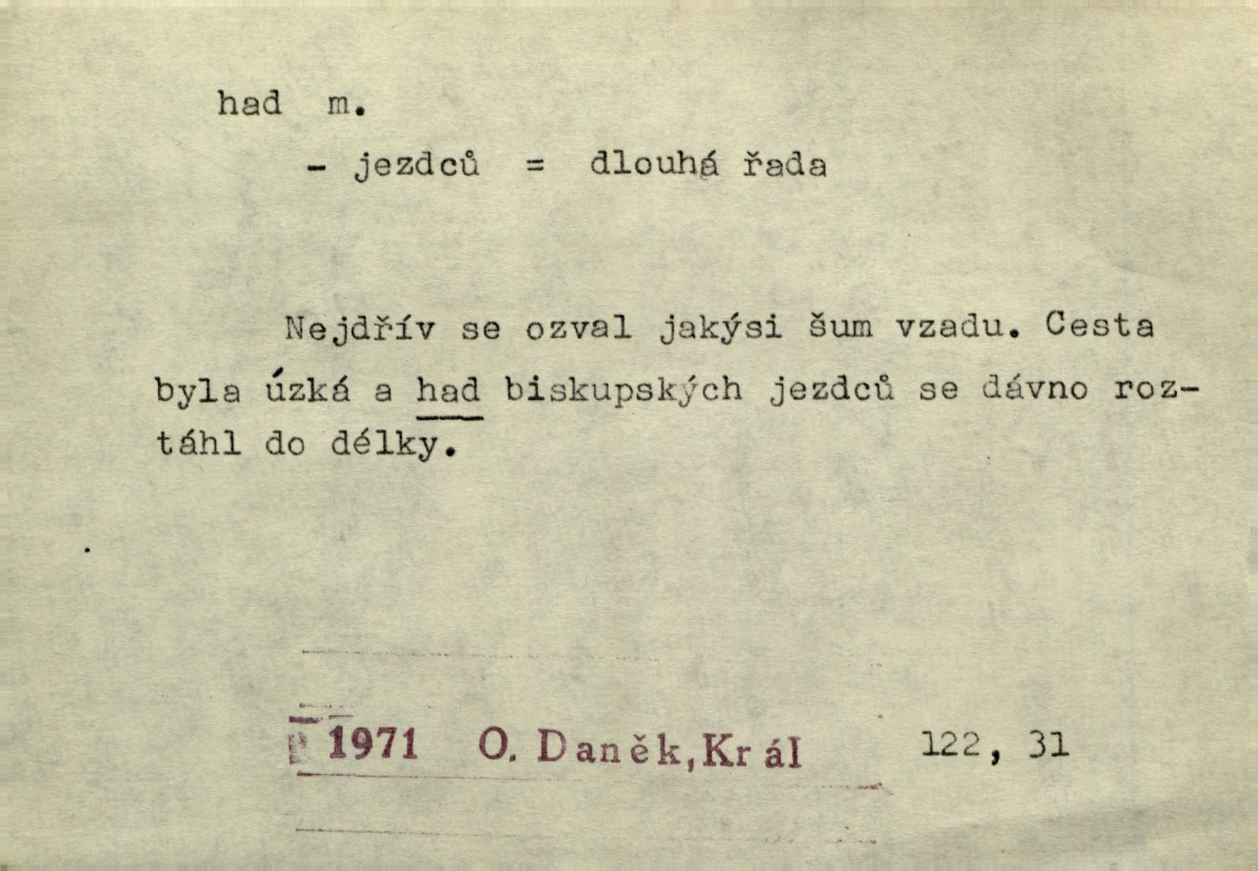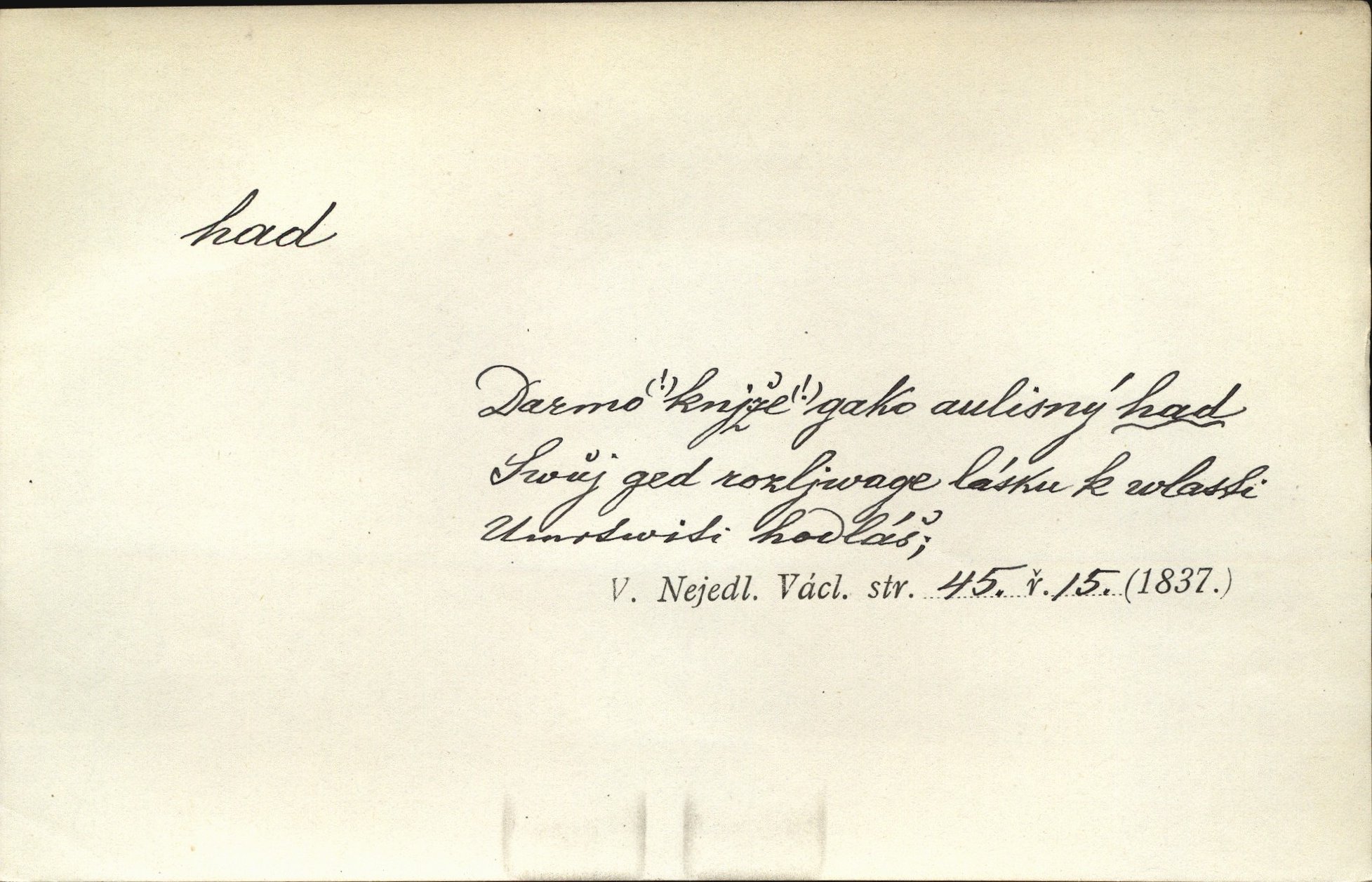- had, -a m. zool. hadi řád plazů (Ophidia). Ustál. sp. Smaž hada, jak chceš, nebude z něho úhoř. Přísl. Od včely pochází med, od hada jed. Přísl. Nehřej hada za ňadry! Pořek. Utrhla se jakoby ji had uštknul. Herb. Muž ten byl obratný jako had. Dyk. Pamatuji se na chansonieru, štíhlou jako had. Šim. To víte, že mně peníze vždy z rukou uklouznou jako had. Svět. Mořský had novinářská kachna. V Tichém oceáně poznovu byl objeven mořský had. Herrm. D (v lidovém podání) domácí had, had hospodář, hospodáříček šotek pro štěstí. A dokud líhal pod pecí nebo pod prahem domácí Had, starý hospodář, neodešlo z rodu štěstí a požehnání. Jir. Ztracenou končinu Šlarafie — kde had hospodáříček v mandelu šelmovství spí — mi vraťte. Halas. D Přen. o věcech nějak připomínajících hada. Hleděl před se na nekonečného hada vozův i houfů. Jir. Chtěl bych jednou promluvit vážné slovo o zelených hadech čili o t. zv. trávnících na scéně. Mah. Dlaněma válela dlouhého těstového hada. Rais. Klopýtajíc přes hady kořenův, hloub a hlouběji zapadala v tmavnoucí nitro lesa. Sez. Měla vlasy upraveny v samé namaštěné hady. R. Svob. D Přen. ve výrazech abstraktních. Ten starý had v nás by to arci rád převracel a chtěl by, abychom tělu hověli a ducha uspávali ďábel, pokušení. Svět. Celerka nasadila Tomášovi hada mučivou myšlenku. Jir. Klevetím, hady nasazuju nesvár. Jir. Zašlapává hada pochybnosti. Kar. Vloudil se i do tvého srdce had plemenného záští. Čech. Podezření had jej uštkl jedovatě u srdce. Zey. Had závisti se vypjal brzy. Čech. D nadávka. „Hade jedovatý!“ řekl Kojan [synovi]. Hol. Zrádkyně, hade! Dyk. Žertovná přezdívka. „Tady je cukr, vy hadi!“ vzkřikl pan Kódl [na spoluvojáky]. Med. D Tech. trubka beze švů stočená do šroubovice v ploše nebo do spirály. Had topný, chladicí, vodní, trubkový. Váleč. druh někdejších děl. Přiběhli feuerwerkři od kartounů, falkonů a hadů. Dur. Had jm. souhvězdí. Těl. hra na hada, stahování hada druh hry. D Argot. řemen, řetěz, zrádce.