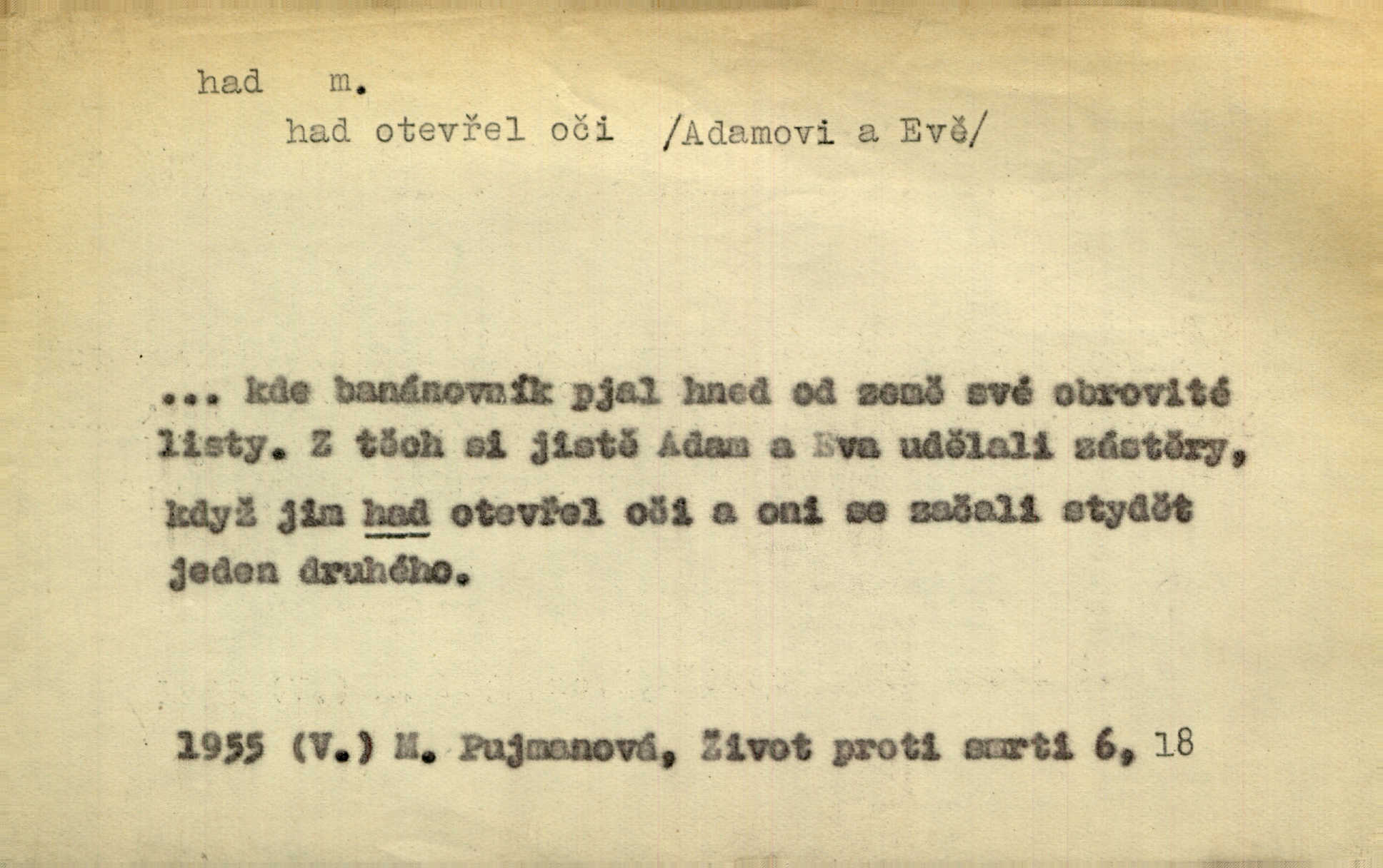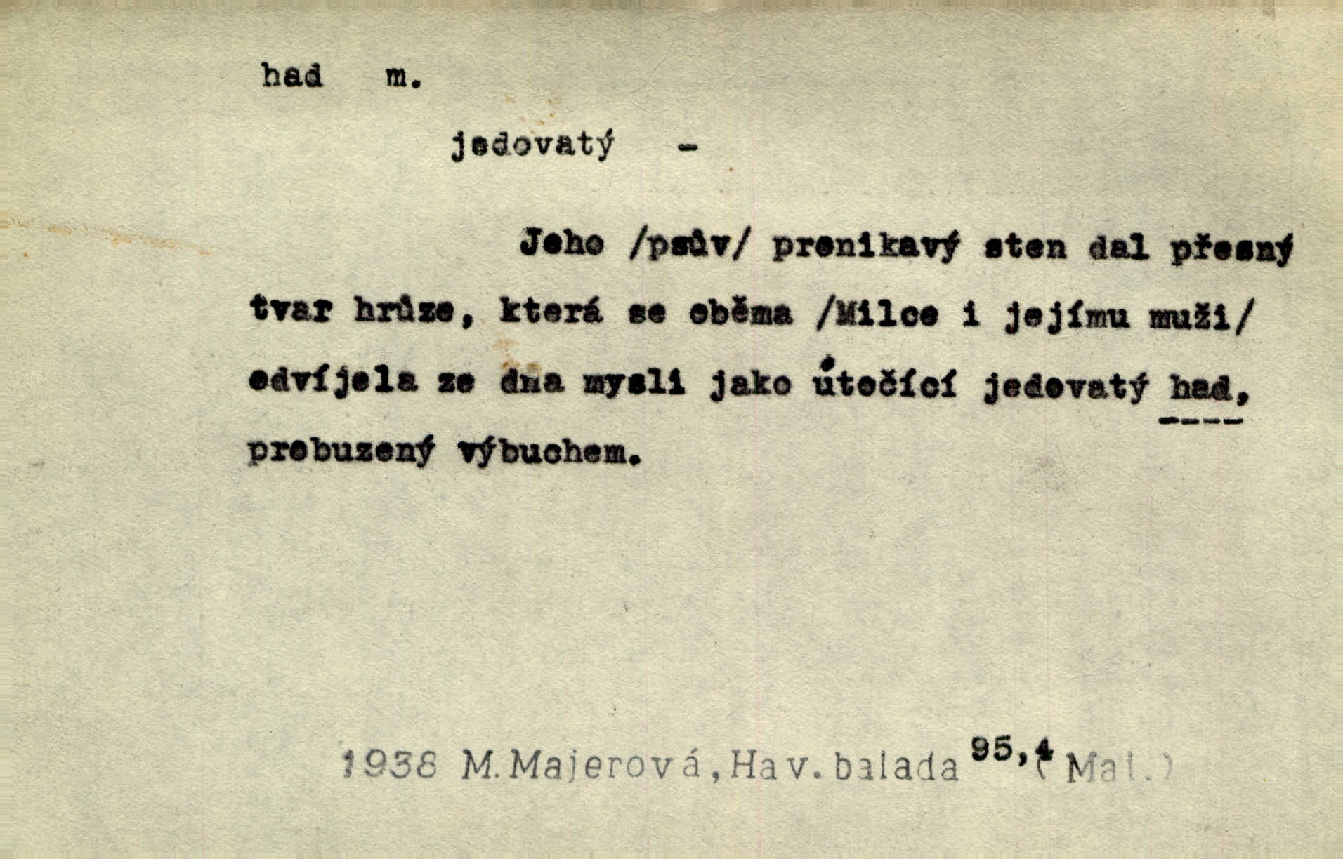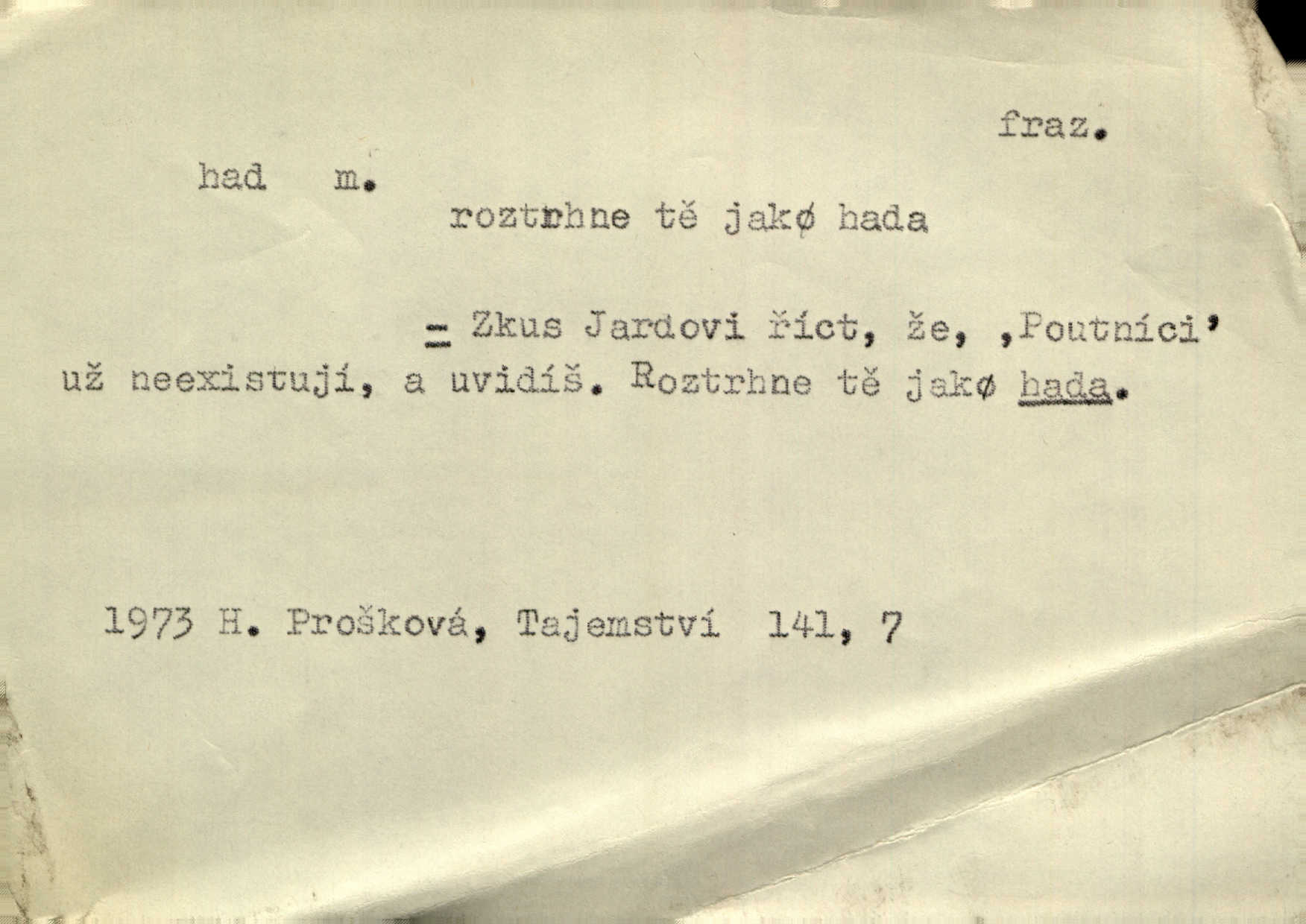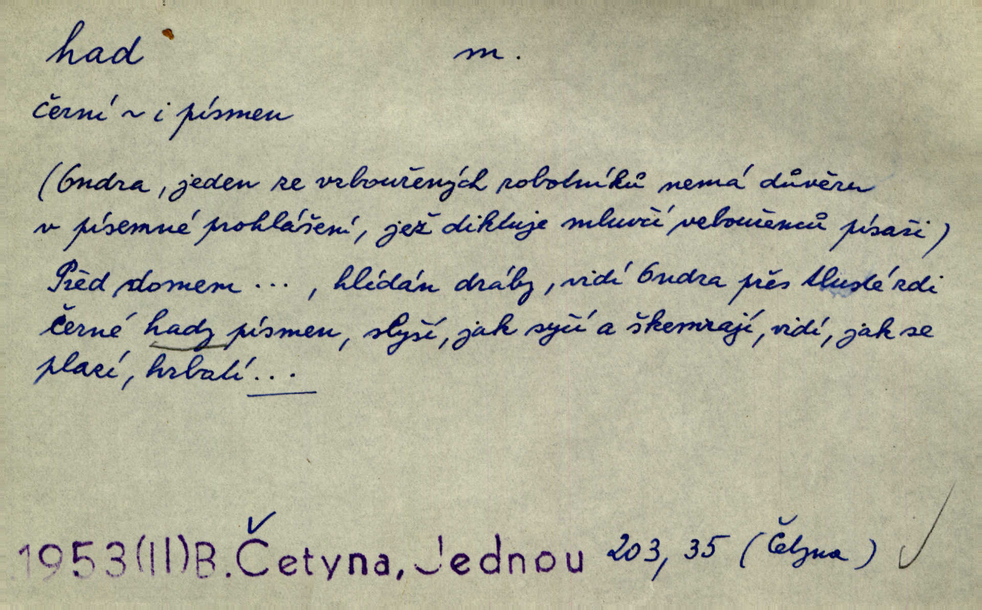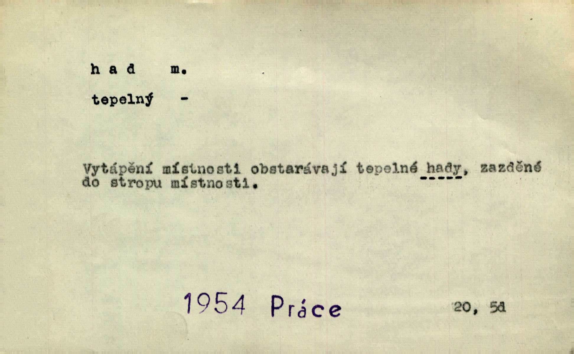 - had, -a m. zool. hadi řád plazů (Ophidia). Ustál. sp. Smaž hada, jak chceš, nebude z něho úhoř. Přísl. Od včely pochází med, od hada jed. Přísl. Nehřej hada za ňadry! Pořek. Utrhla se jakoby ji had uštknul. Herb. Muž ten byl obratný jako had. Dyk. Pamatuji se na chansonieru, štíhlou jako had. Šim. To víte, že mně peníze vždy z rukou uklouznou jako had. Svět. Mořský had novinářská kachna. V Tichém oceáně poznovu byl objeven mořský had. Herrm. D (v lidovém podání) domácí had, had hospodář, hospodáříček šotek pro štěstí. A dokud líhal pod pecí nebo pod prahem domácí Had, starý hospodář, neodešlo z rodu štěstí a požehnání. Jir. Ztracenou končinu Šlarafie — kde had hospodáříček v mandelu šelmovství spí — mi vraťte. Halas. D Přen. o věcech nějak připomínajících hada. Hleděl před se na nekonečného hada vozův i houfů. Jir. Chtěl bych jednou promluvit vážné slovo o zelených hadech čili o t. zv. trávnících na scéně. Mah. Dlaněma válela dlouhého těstového hada. Rais. Klopýtajíc přes hady kořenův, hloub a hlouběji zapadala v tmavnoucí nitro lesa. Sez. Měla vlasy upraveny v samé namaštěné hady. R. Svob. D Přen. ve výrazech abstraktních. Ten starý had v nás by to arci rád převracel a chtěl by, abychom tělu hověli a ducha uspávali ďábel, pokušení. Svět. Celerka nasadila Tomášovi hada mučivou myšlenku. Jir. Klevetím, hady nasazuju nesvár. Jir. Zašlapává hada pochybnosti. Kar. Vloudil se i do tvého srdce had plemenného záští. Čech. Podezření had jej uštkl jedovatě u srdce. Zey. Had závisti se vypjal brzy. Čech. D nadávka. „Hade jedovatý!“ řekl Kojan [synovi]. Hol. Zrádkyně, hade! Dyk. Žertovná přezdívka. „Tady je cukr, vy hadi!“ vzkřikl pan Kódl [na spoluvojáky]. Med. D Tech. trubka beze švů stočená do šroubovice v ploše nebo do spirály. Had topný, chladicí, vodní, trubkový. Váleč. druh někdejších děl. Přiběhli feuerwerkři od kartounů, falkonů a hadů. Dur. Had jm. souhvězdí. Těl. hra na hada, stahování hada druh hry. D Argot. řemen, řetěz, zrádce.