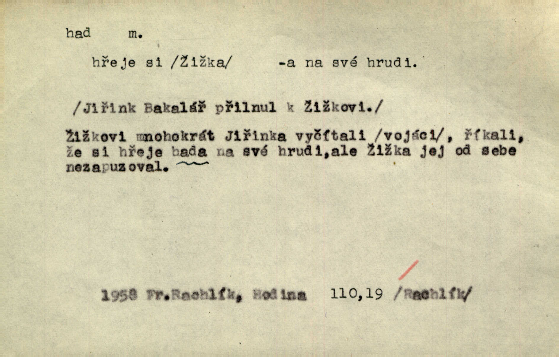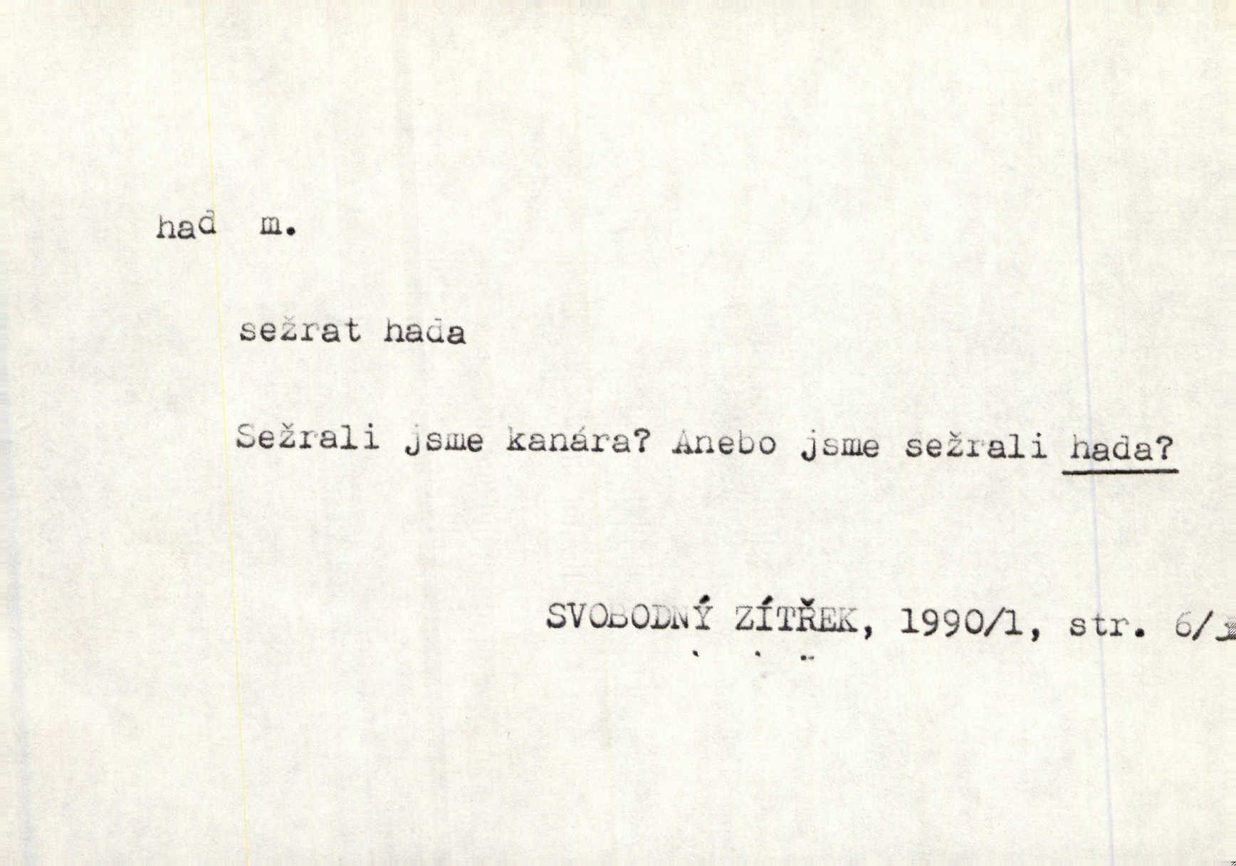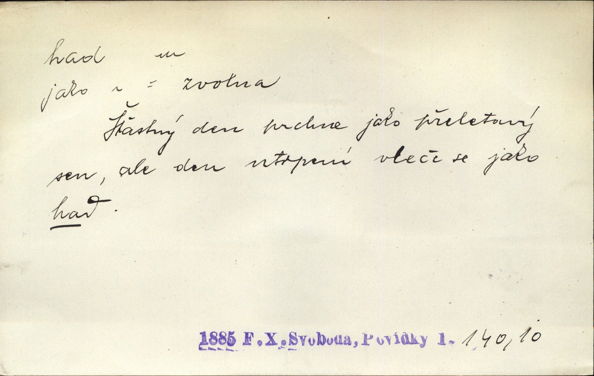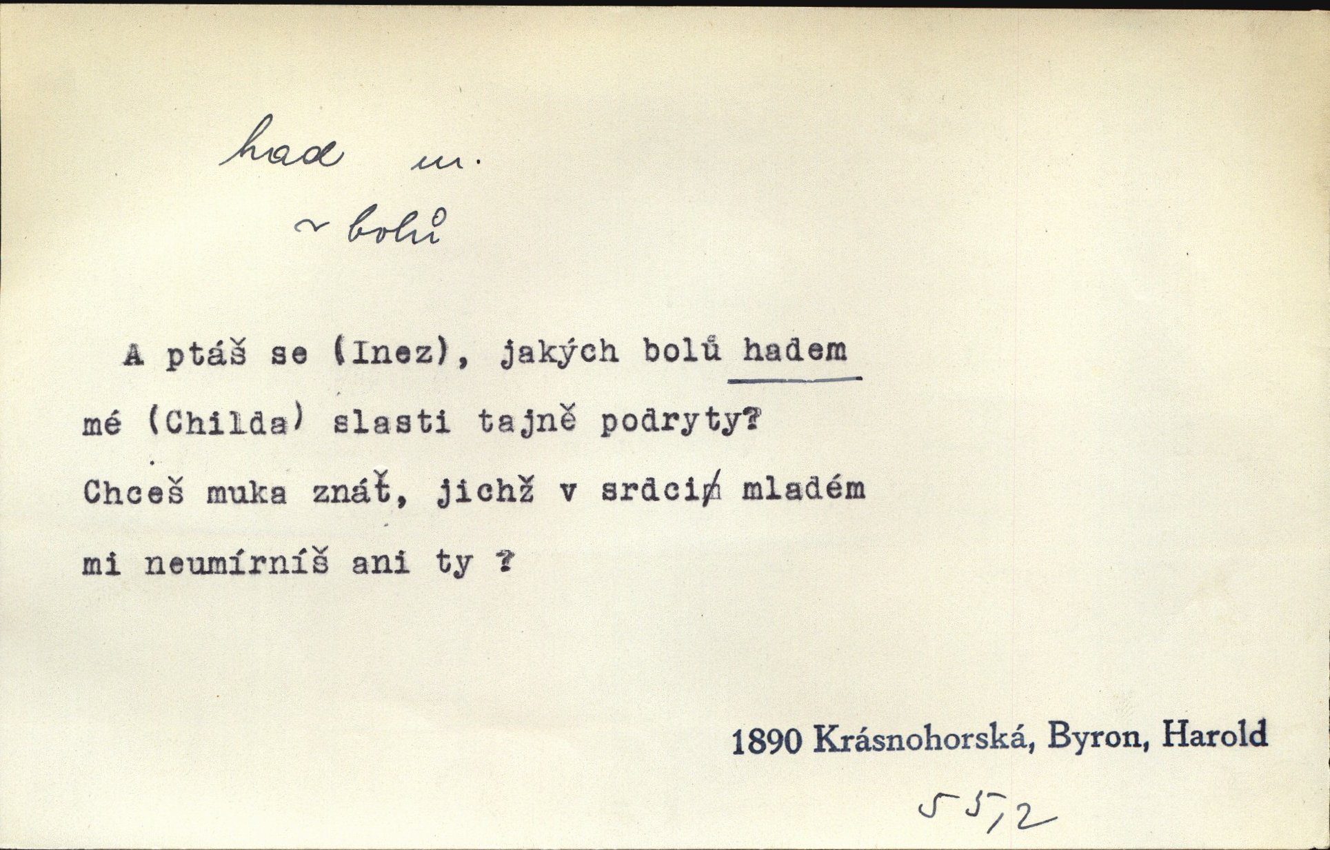 - had, -a m. zool. hadi řád plazů (Ophidia). Ustál. sp. Smaž hada, jak chceš, nebude z něho úhoř. Přísl. Od včely pochází med, od hada jed. Přísl. Nehřej hada za ňadry! Pořek. Utrhla se jakoby ji had uštknul. Herb. Muž ten byl obratný jako had. Dyk. Pamatuji se na chansonieru, štíhlou jako had. Šim. To víte, že mně peníze vždy z rukou uklouznou jako had. Svět. Mořský had novinářská kachna. V Tichém oceáně poznovu byl objeven mořský had. Herrm. D (v lidovém podání) domácí had, had hospodář, hospodáříček šotek pro štěstí. A dokud líhal pod pecí nebo pod prahem domácí Had, starý hospodář, neodešlo z rodu štěstí a požehnání. Jir. Ztracenou končinu Šlarafie — kde had hospodáříček v mandelu šelmovství spí — mi vraťte. Halas. D Přen. o věcech nějak připomínajících hada. Hleděl před se na nekonečného hada vozův i houfů. Jir. Chtěl bych jednou promluvit vážné slovo o zelených hadech čili o t. zv. trávnících na scéně. Mah. Dlaněma válela dlouhého těstového hada. Rais. Klopýtajíc přes hady kořenův, hloub a hlouběji zapadala v tmavnoucí nitro lesa. Sez. Měla vlasy upraveny v samé namaštěné hady. R. Svob. D Přen. ve výrazech abstraktních. Ten starý had v nás by to arci rád převracel a chtěl by, abychom tělu hověli a ducha uspávali ďábel, pokušení. Svět. Celerka nasadila Tomášovi hada mučivou myšlenku. Jir. Klevetím, hady nasazuju nesvár. Jir. Zašlapává hada pochybnosti. Kar. Vloudil se i do tvého srdce had plemenného záští. Čech. Podezření had jej uštkl jedovatě u srdce. Zey. Had závisti se vypjal brzy. Čech. D nadávka. „Hade jedovatý!“ řekl Kojan [synovi]. Hol. Zrádkyně, hade! Dyk. Žertovná přezdívka. „Tady je cukr, vy hadi!“ vzkřikl pan Kódl [na spoluvojáky]. Med. D Tech. trubka beze švů stočená do šroubovice v ploše nebo do spirály. Had topný, chladicí, vodní, trubkový. Váleč. druh někdejších děl. Přiběhli feuerwerkři od kartounů, falkonů a hadů. Dur. Had jm. souhvězdí. Těl. hra na hada, stahování hada druh hry. D Argot. řemen, řetěz, zrádce.