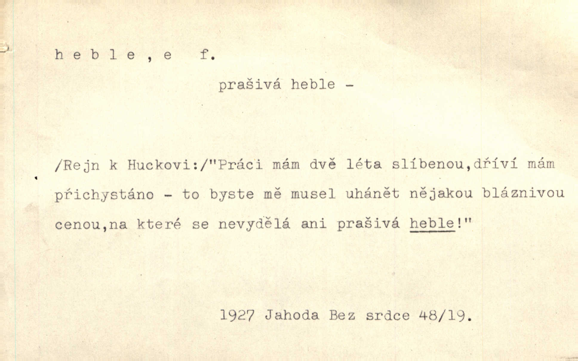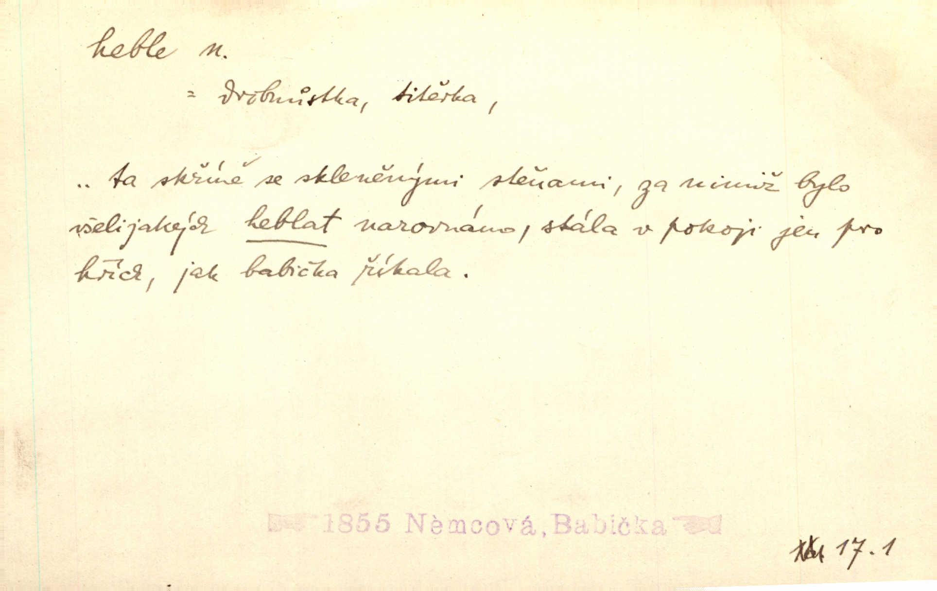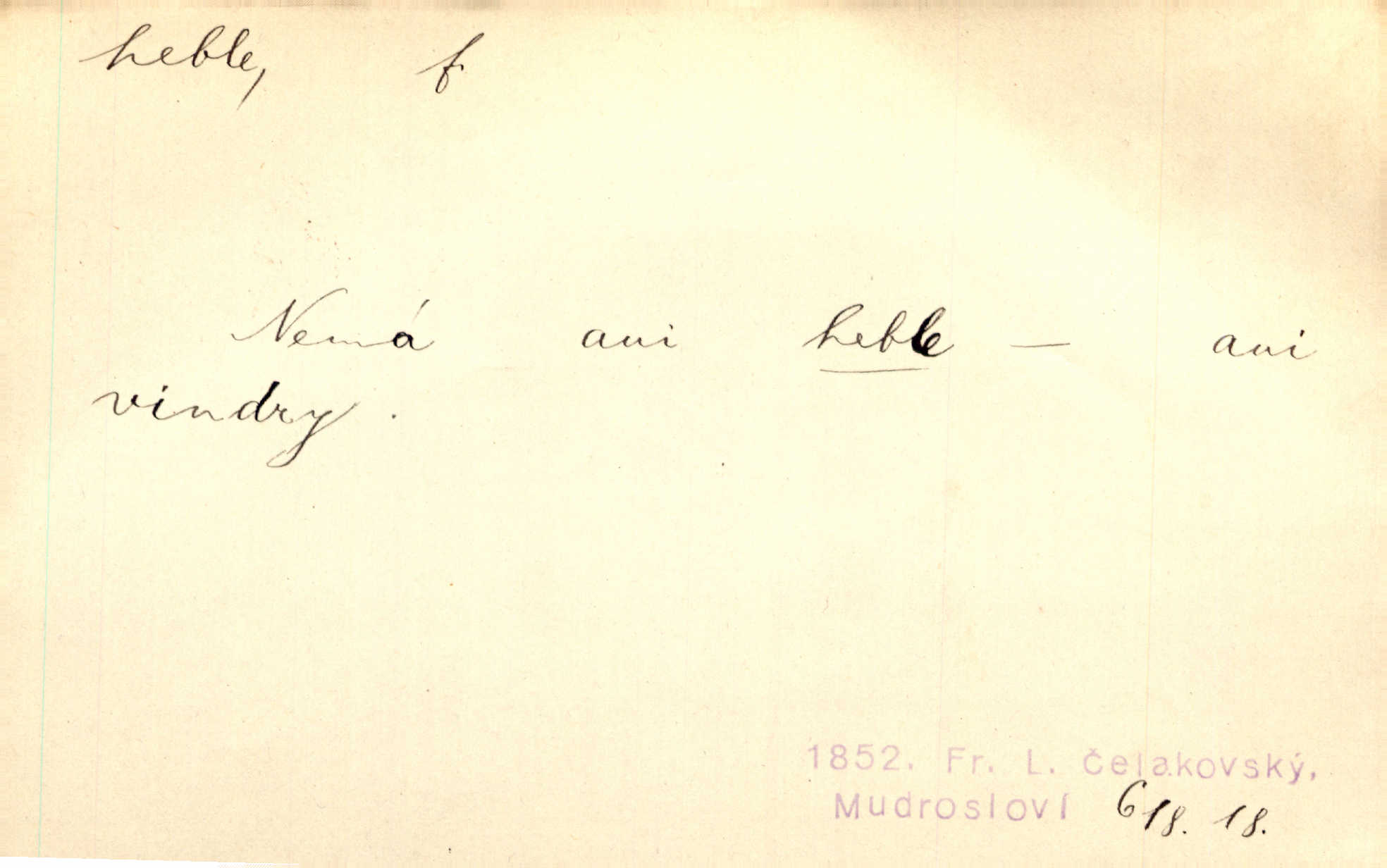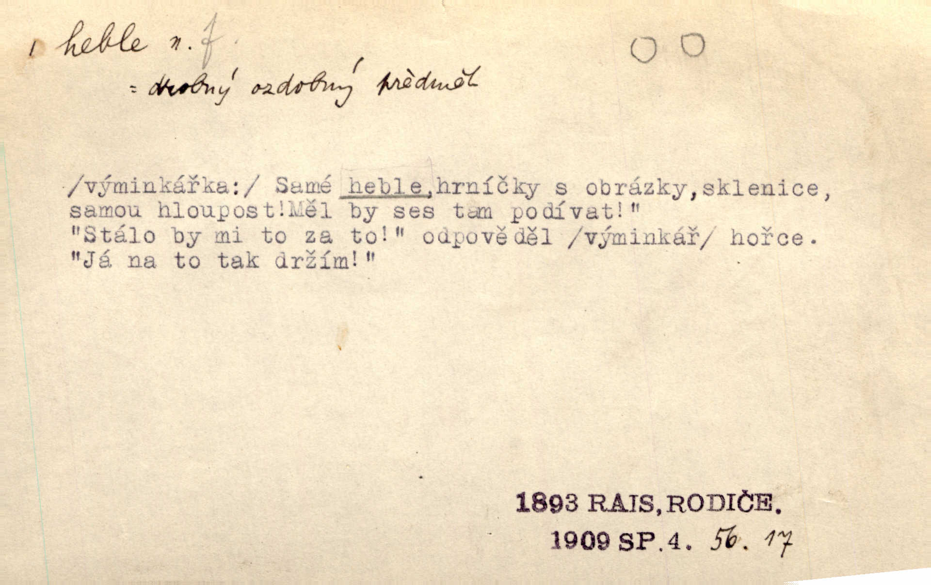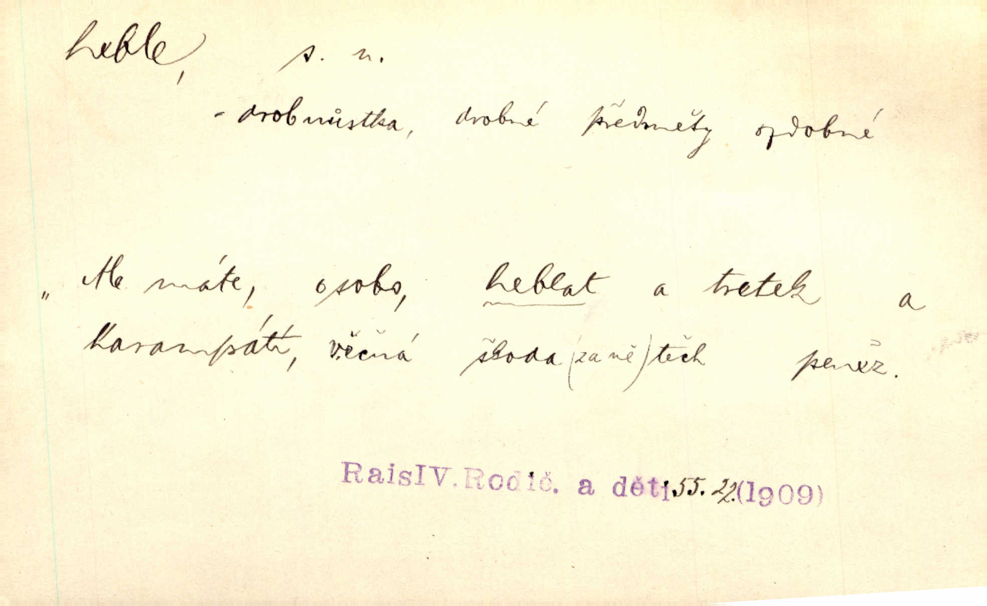 - heble, -ete n., též -e f. drobnůstka, titěrka; vindra. Ta skříně se skleněnými stěnami, za nimiž bylo všelijakých heblat narovnáno, stála v pokoji jen pro hřích. Něm. Potom, co ještě měl [stařec], po nebožce zbytečné heble a všecko ostatní nastěhoval do skály. Rais. Nemá ani heble — ani vindry. Čel.