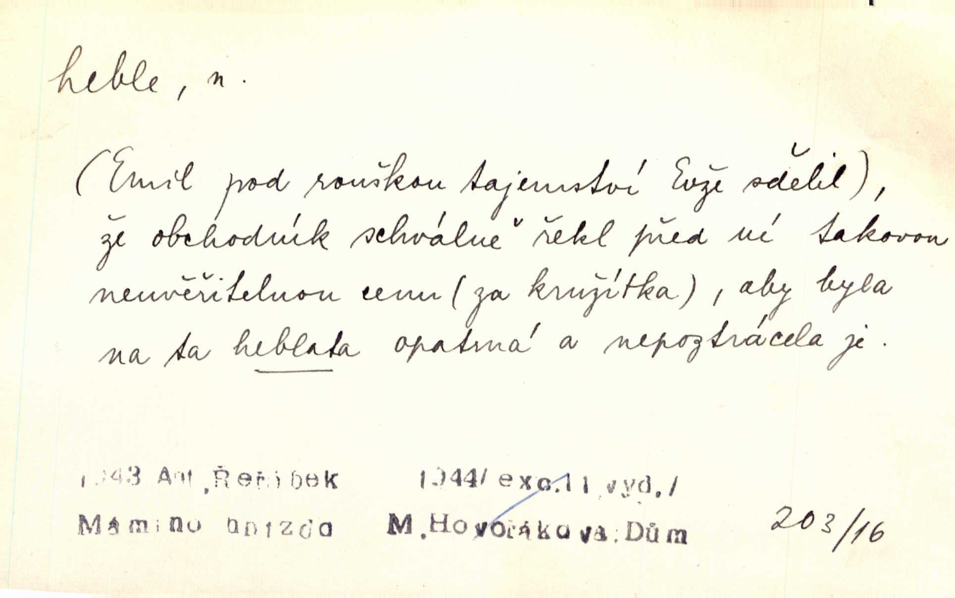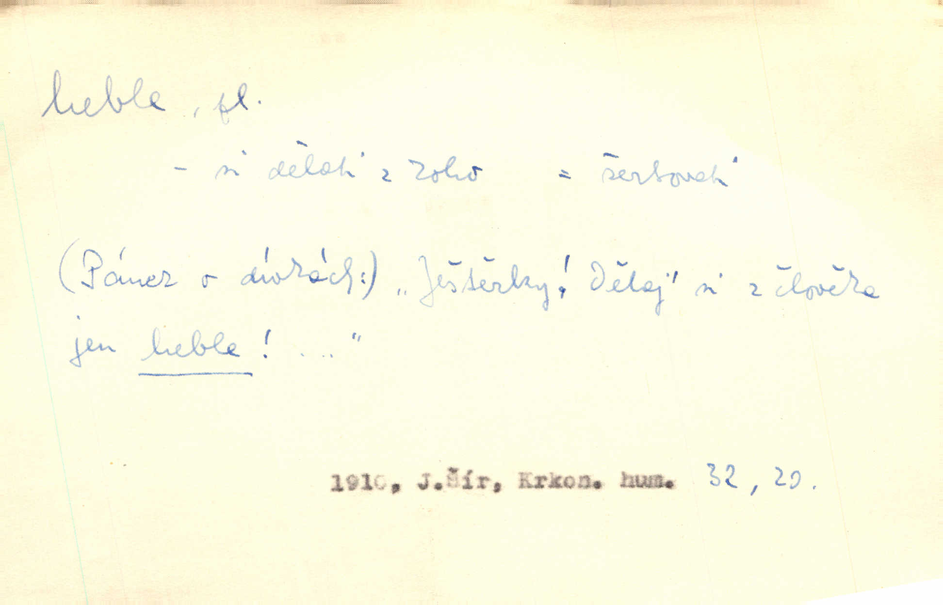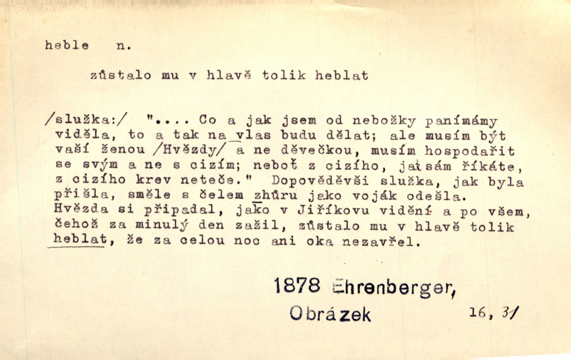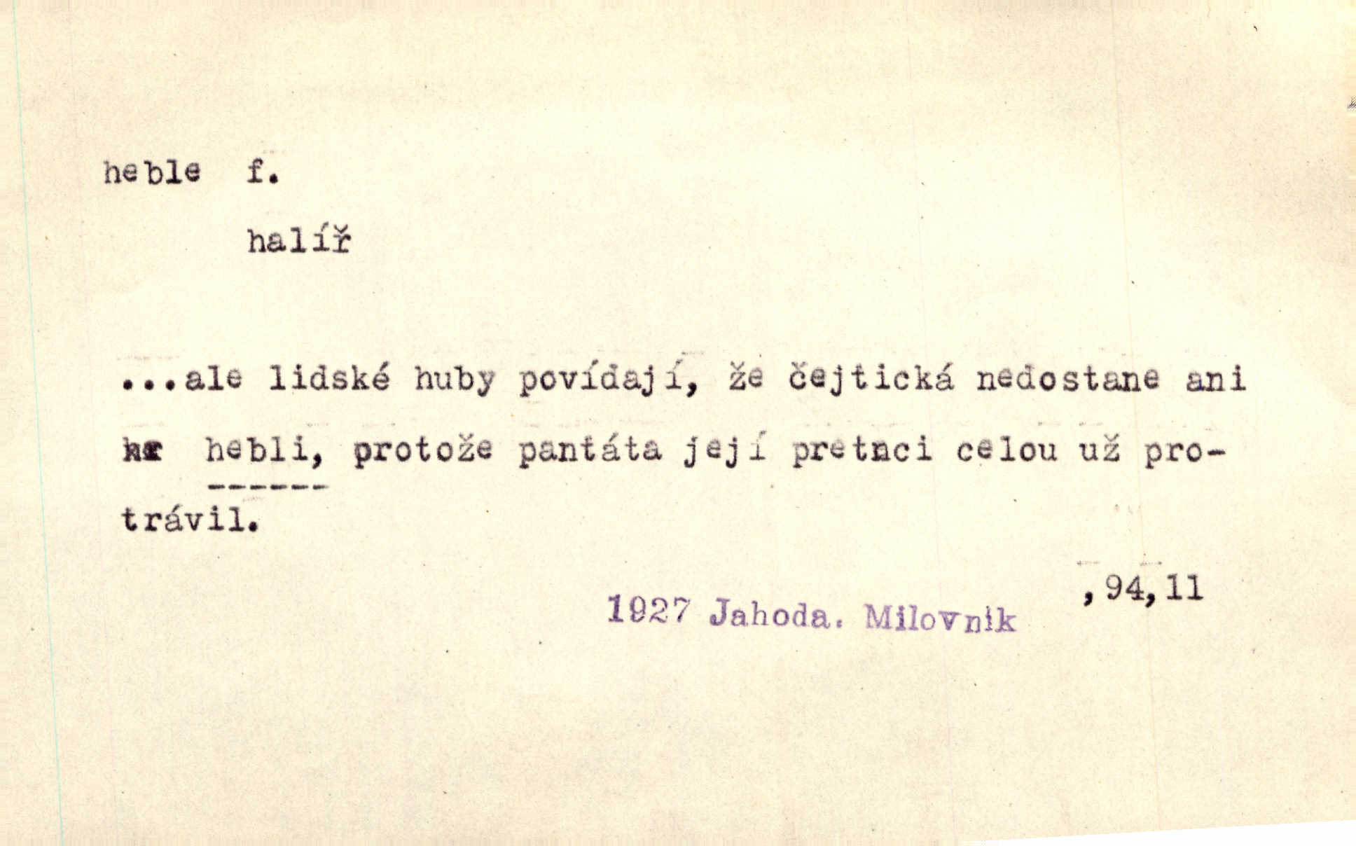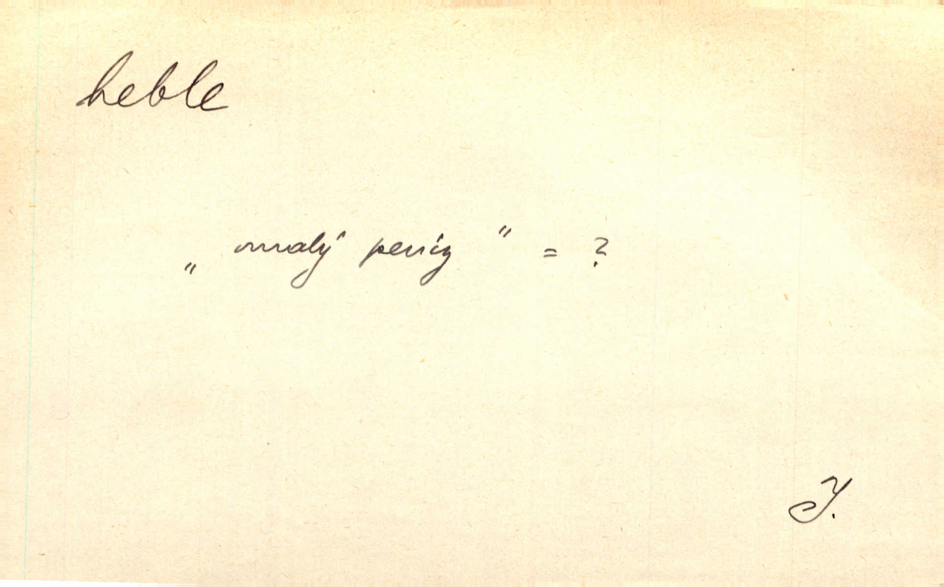 - heble, -ete n., též -e f. drobnůstka, titěrka; vindra. Ta skříně se skleněnými stěnami, za nimiž bylo všelijakých heblat narovnáno, stála v pokoji jen pro hřích. Něm. Potom, co ještě měl [stařec], po nebožce zbytečné heble a všecko ostatní nastěhoval do skály. Rais. Nemá ani heble — ani vindry. Čel.