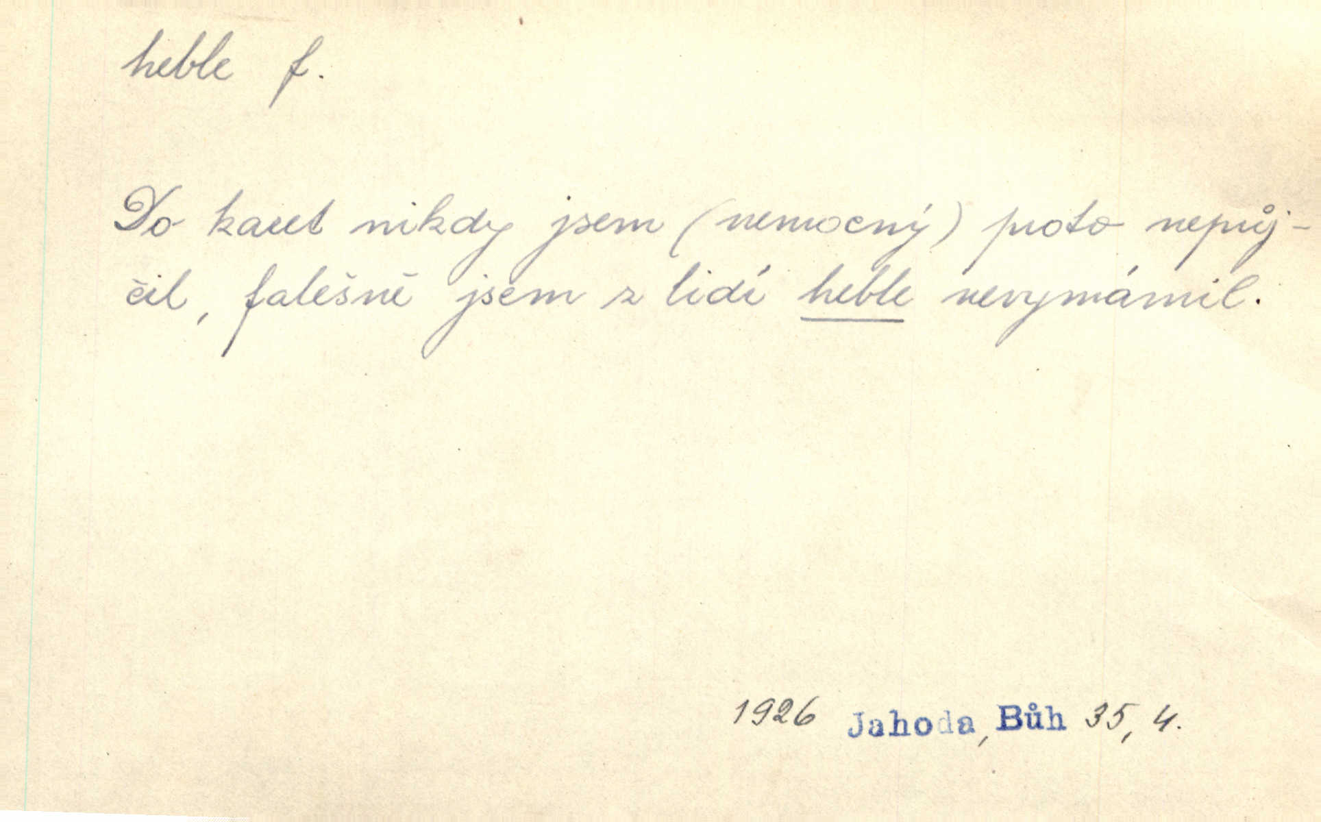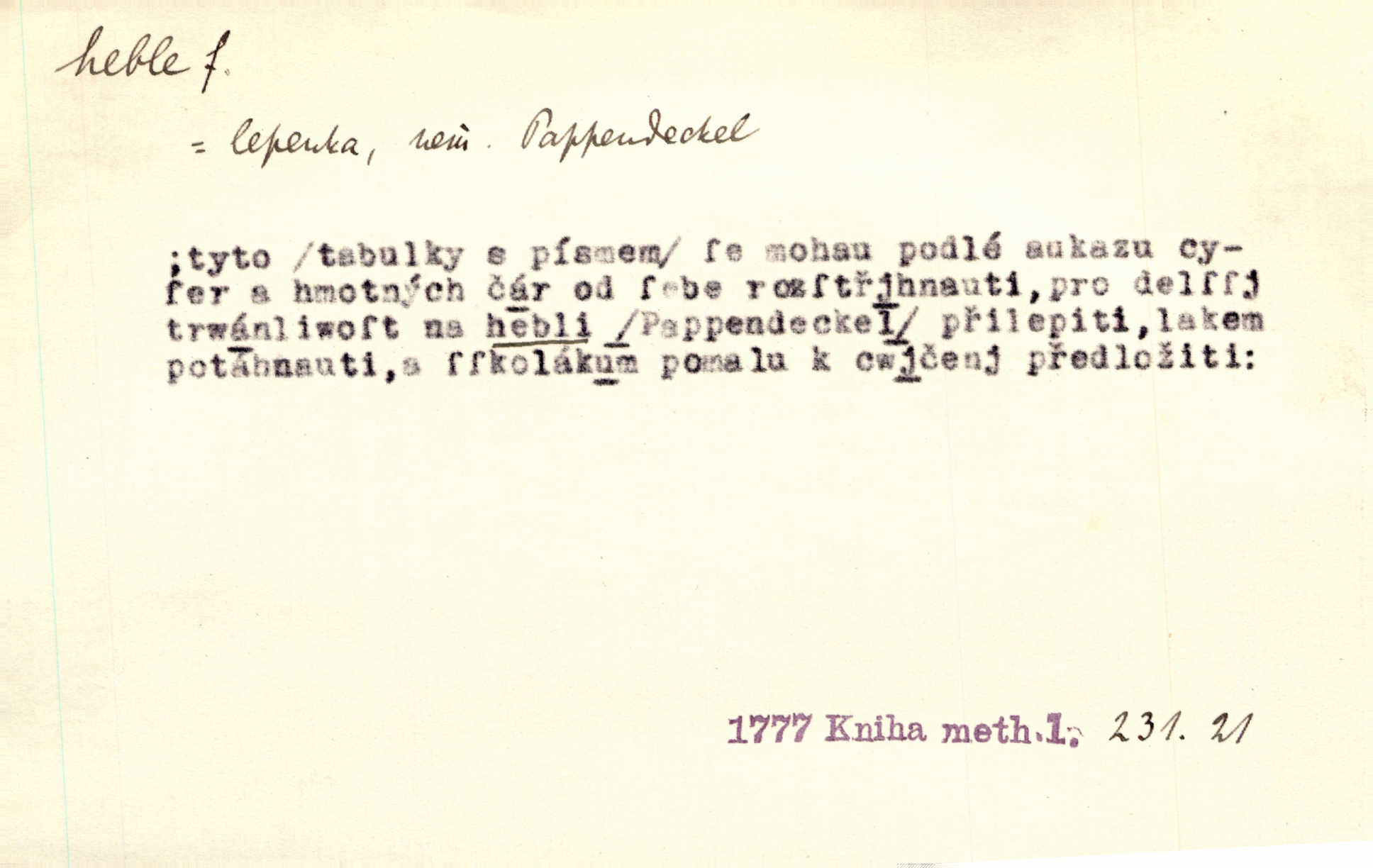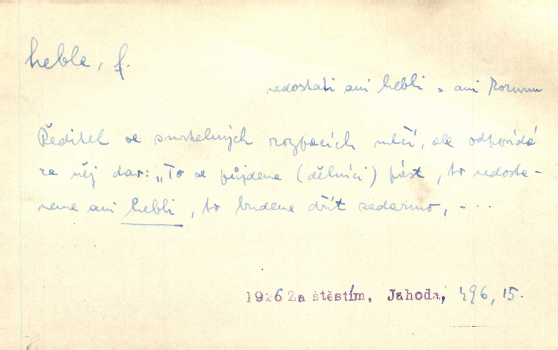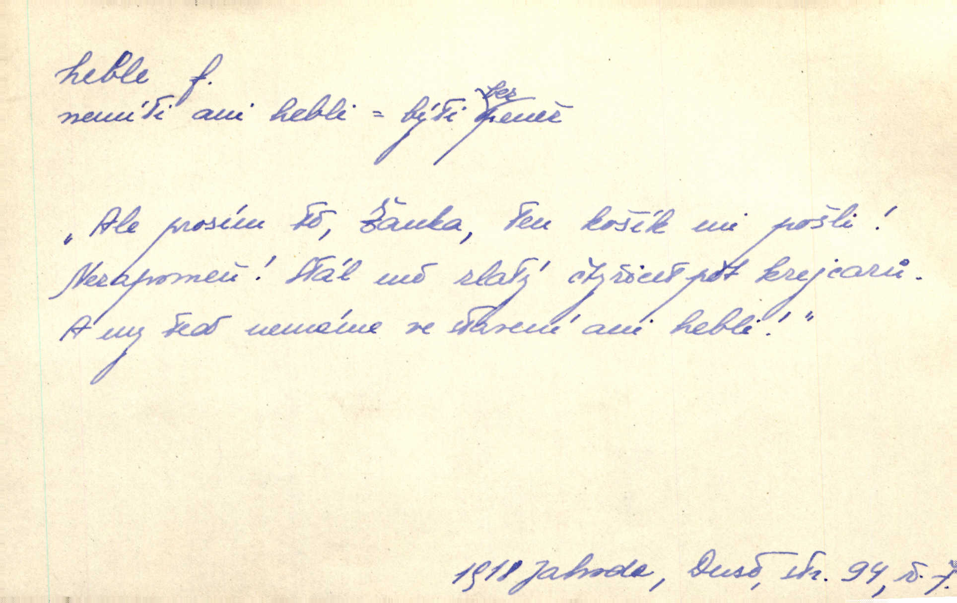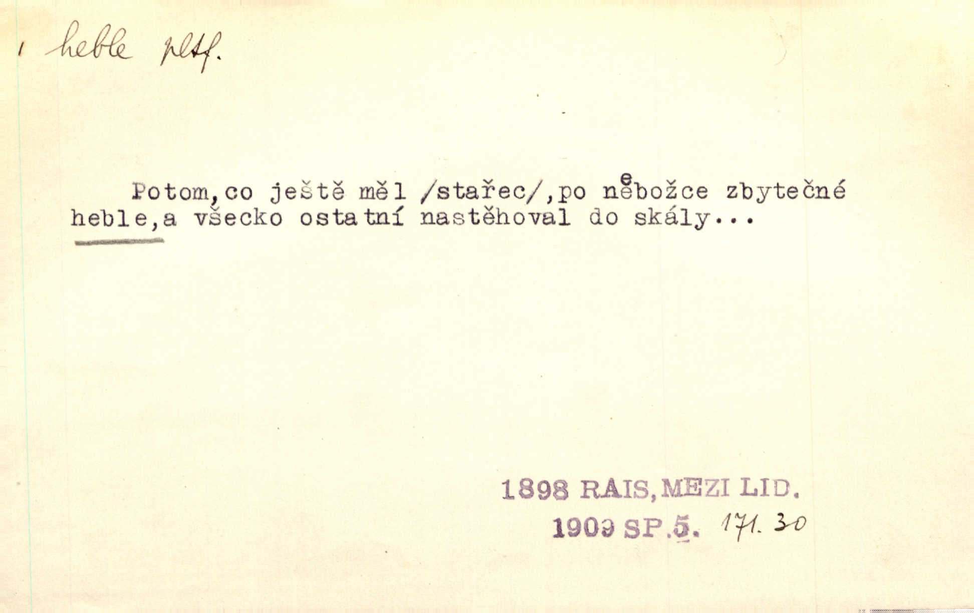 - heble, -ete n., též -e f. drobnůstka, titěrka; vindra. Ta skříně se skleněnými stěnami, za nimiž bylo všelijakých heblat narovnáno, stála v pokoji jen pro hřích. Něm. Potom, co ještě měl [stařec], po nebožce zbytečné heble a všecko ostatní nastěhoval do skály. Rais. Nemá ani heble — ani vindry. Čel.