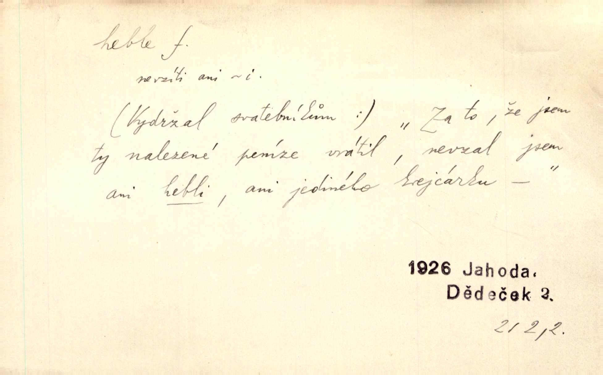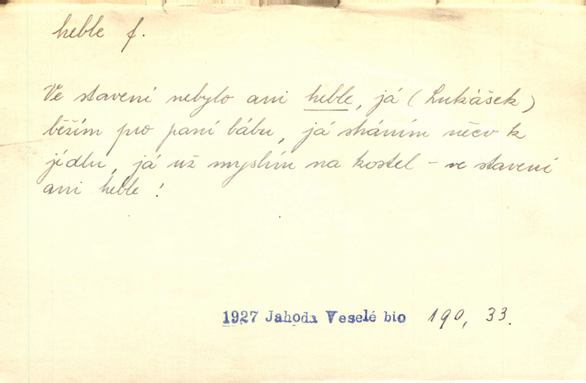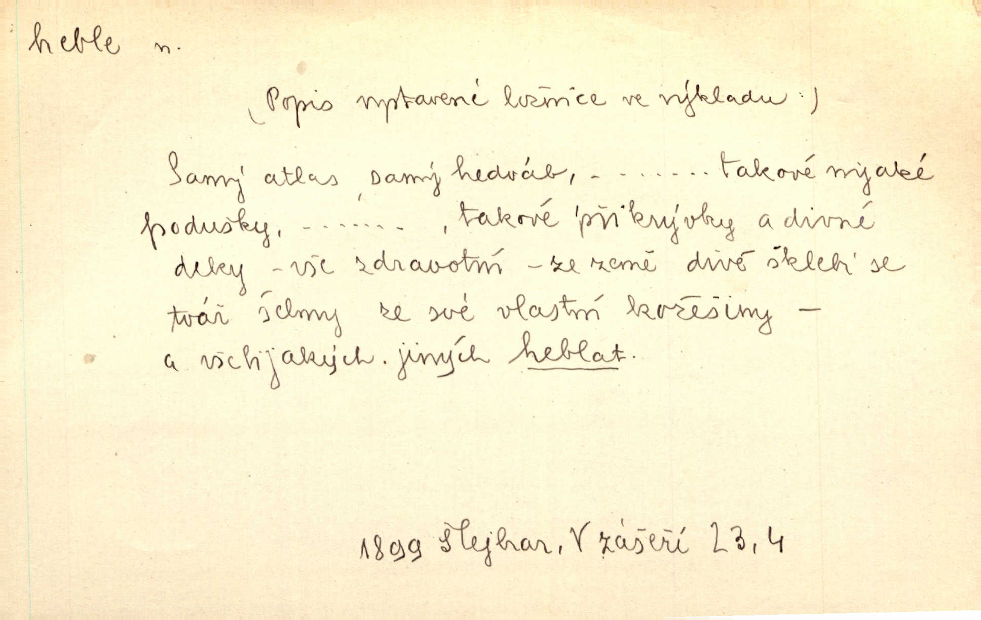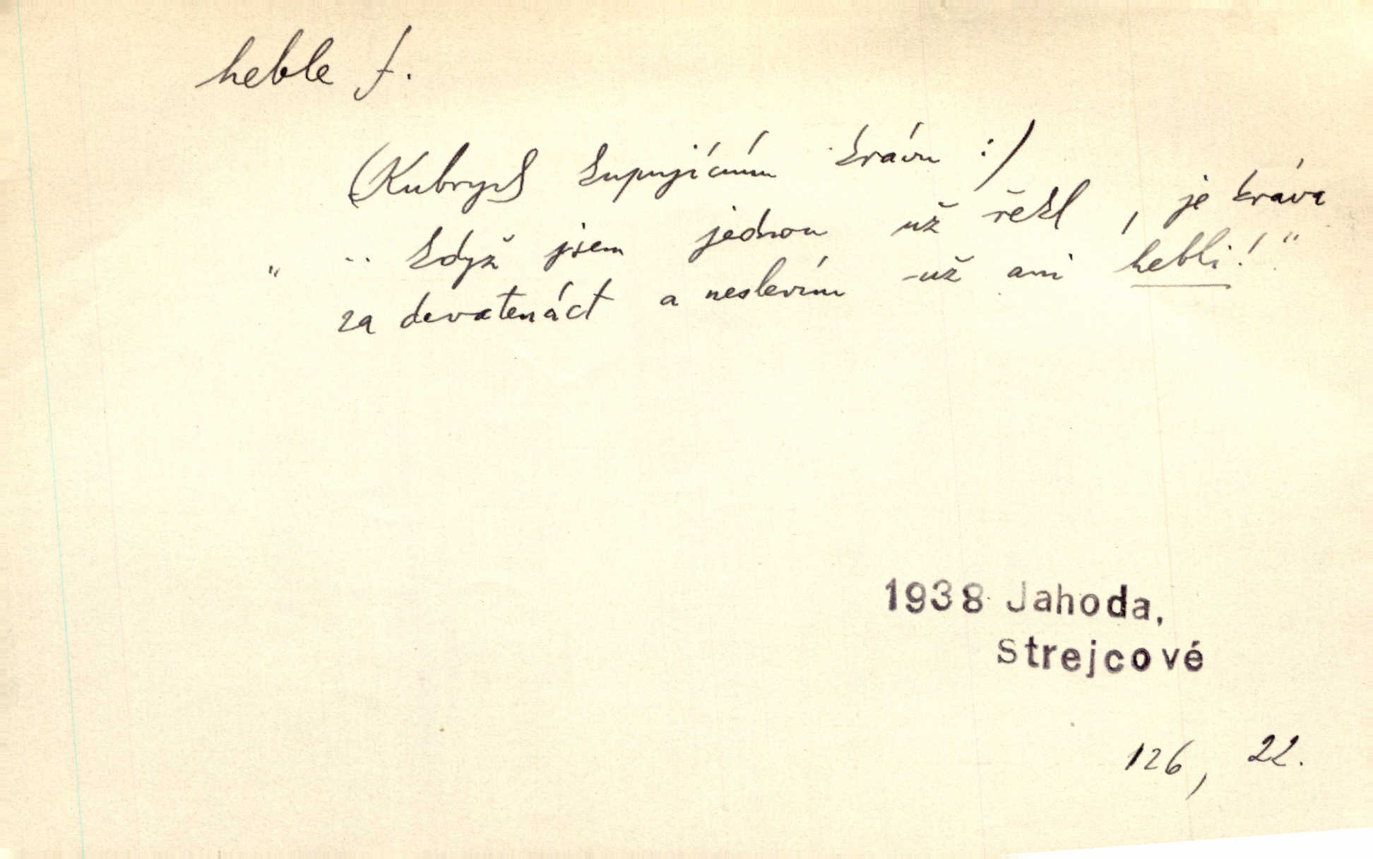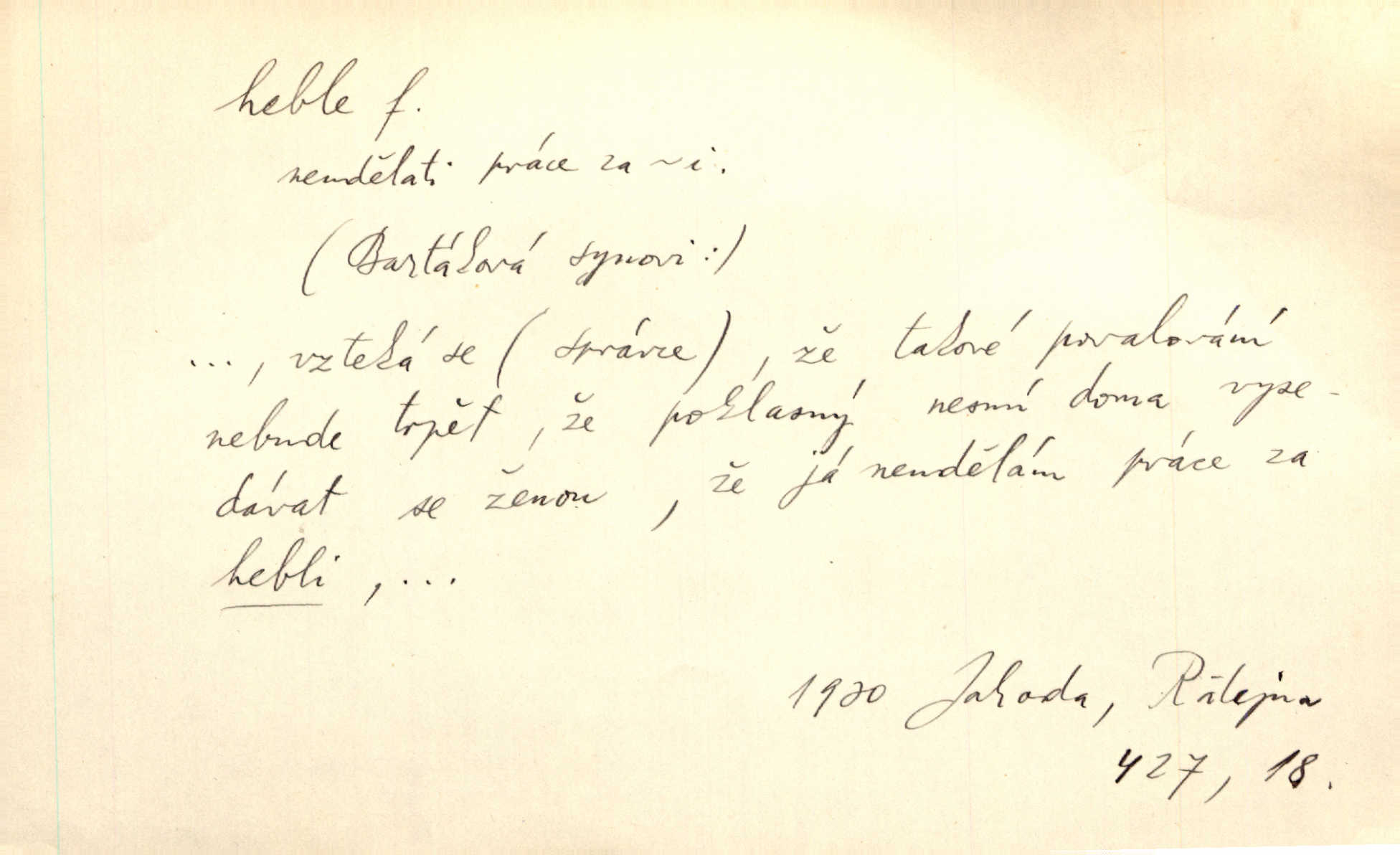 - heble, -ete n., též -e f. drobnůstka, titěrka; vindra. Ta skříně se skleněnými stěnami, za nimiž bylo všelijakých heblat narovnáno, stála v pokoji jen pro hřích. Něm. Potom, co ještě měl [stařec], po nebožce zbytečné heble a všecko ostatní nastěhoval do skály. Rais. Nemá ani heble — ani vindry. Čel.