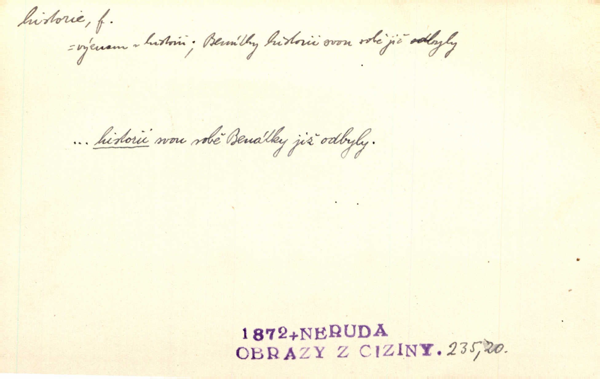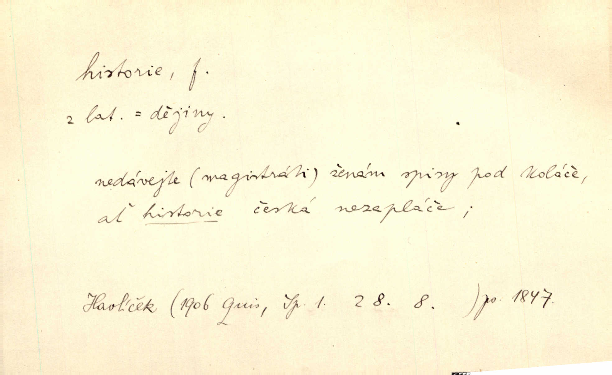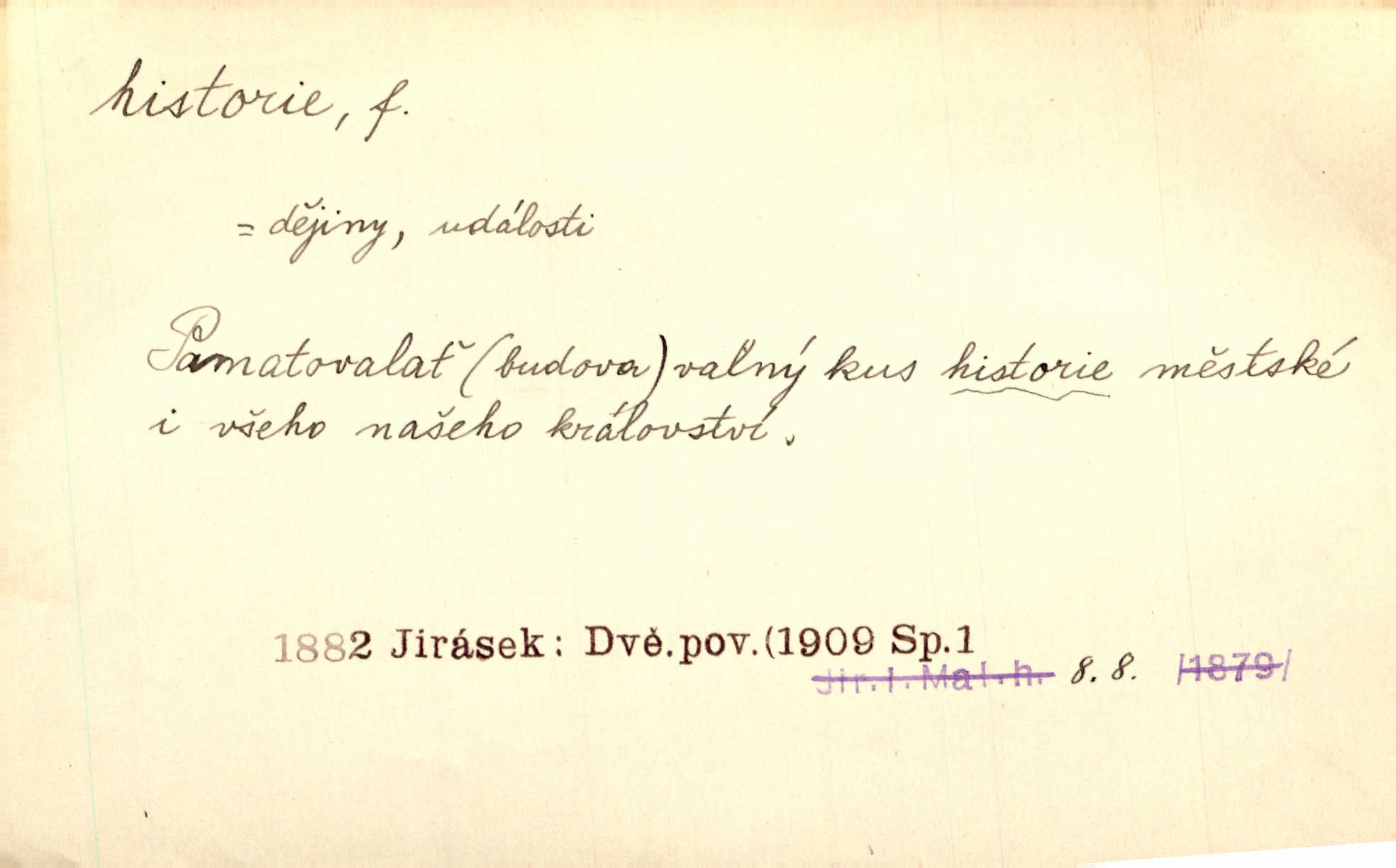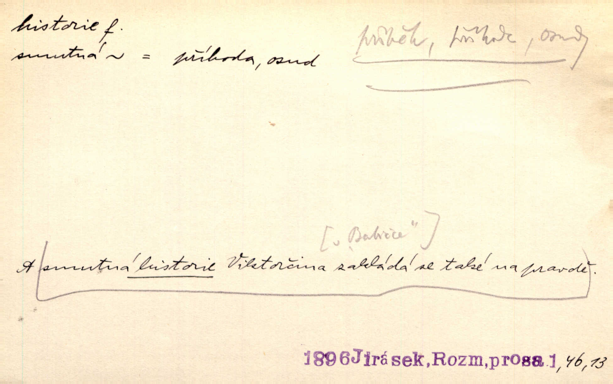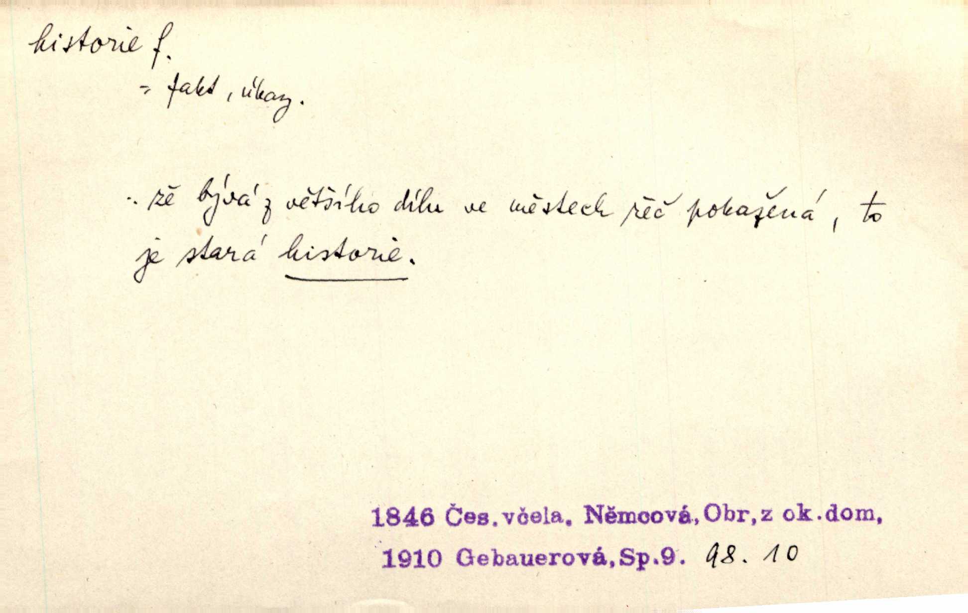- historie, -e f. dějiny, dějepis. Historie politická, církevní, hospodářská, kulturní. Historie literární dějiny literatury. Historie výtvarných umění, hudby. D (o kom, o čem) vypravování. Znal historii o rytíři, který obléhal hrad krásné vdovy, chtěje násilím dobýti její ruky. Čap. Ch. Poučné a kratochvilné historie o strašidlech. Jir. Kudy všudy chodil — ach, to by byla dlouhá historie! Herrm. D Ob. životní osudy, příběhy, nebo jednotlivá událost, příběh. Znal dobře historii její rodiny. Hlad. Smutná historie Viktorčina [v „Babičce“] zakládá se také na pravdě. Jir. Povím vám historii toho děvčete a pak prosím suďte sám. Štol. D faktum, událost, věc, úkaz. Že bývá z většího dílu ve městech řeč pokažená, to je stará historie. Něm. Číms nekonečně bolestně vzrušeným bylo naplněno srdce mé — ale to jsou jiné historie. Šlej. [Úkol kritiků] je sakramentsky nepříjemná historie, která tě rozvádí a znepřáteluje kde s kým. Šal.