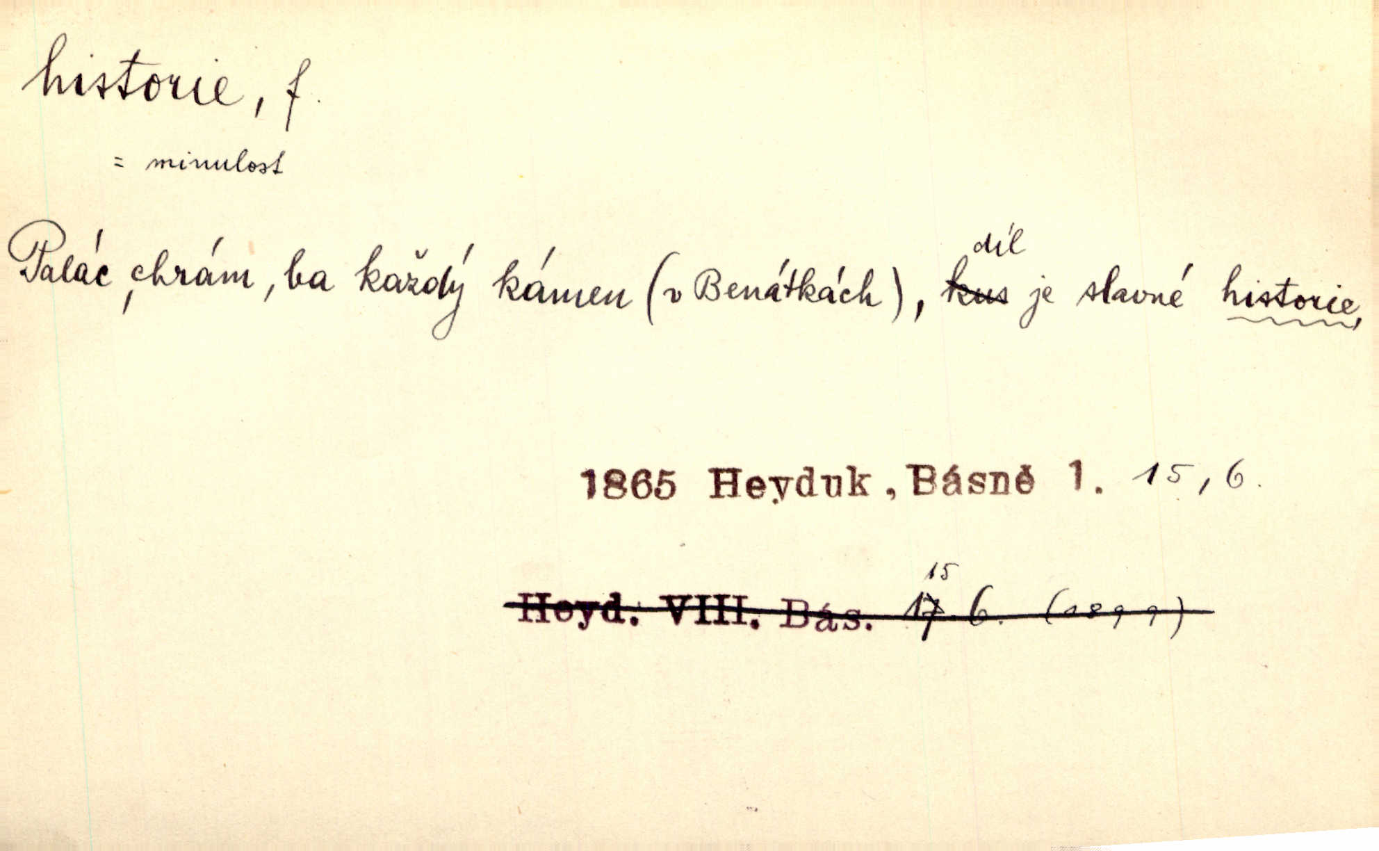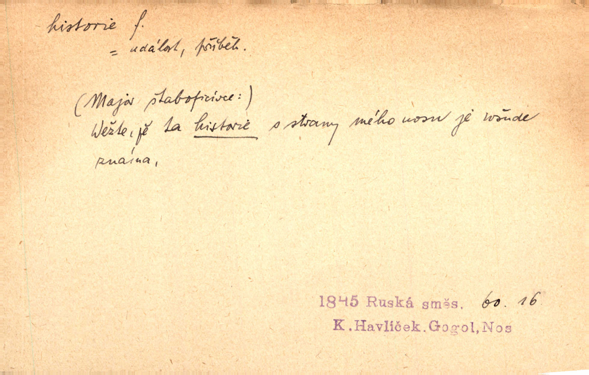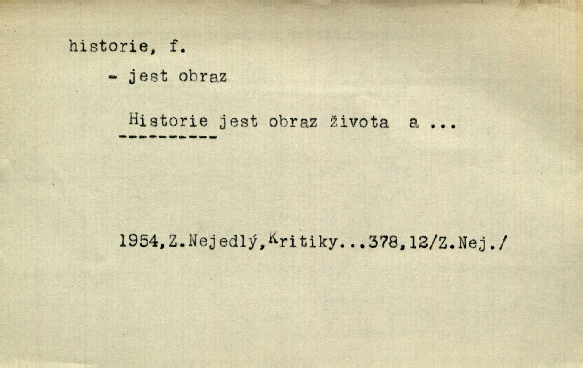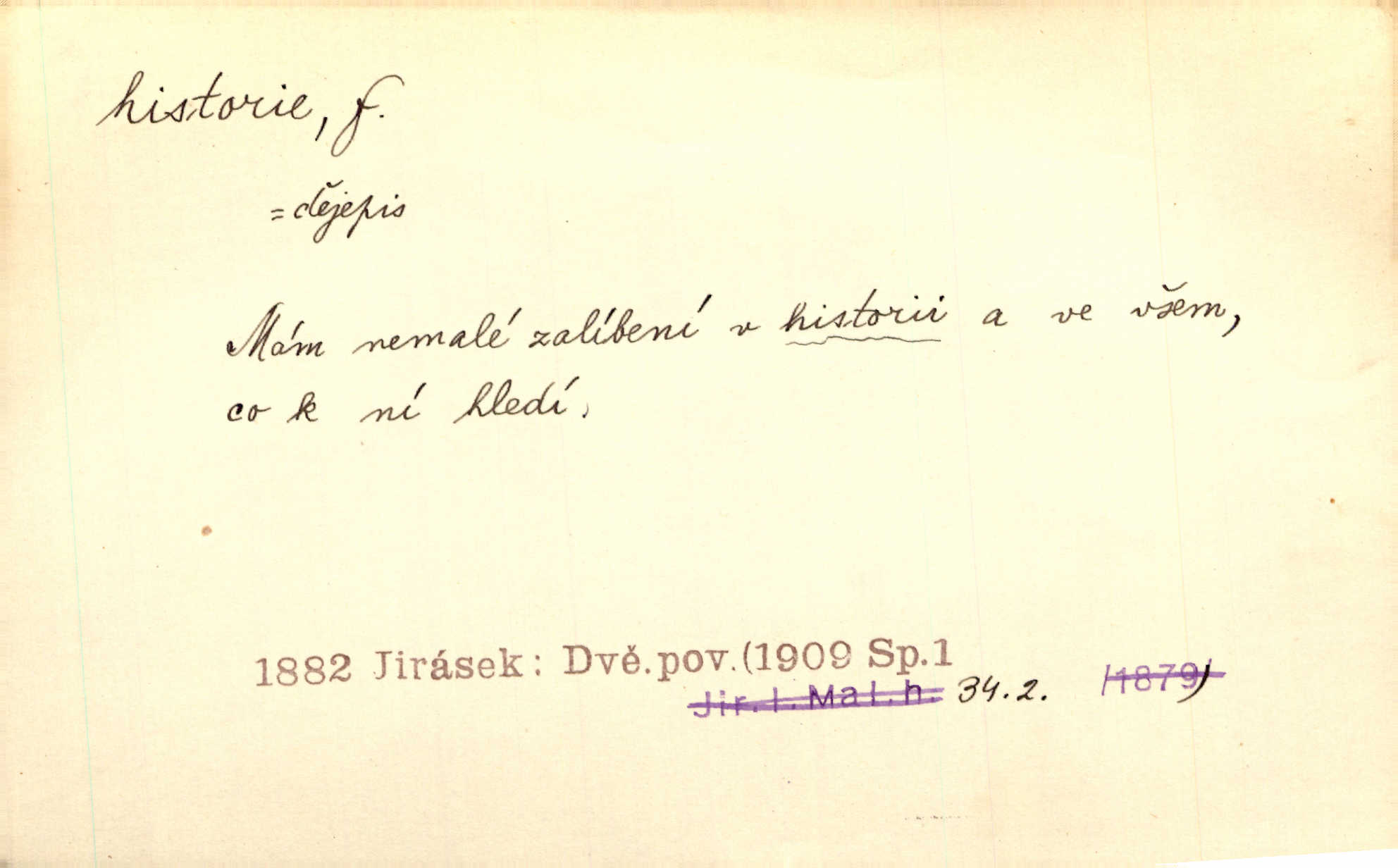 - historie, -e f. dějiny, dějepis. Historie politická, církevní, hospodářská, kulturní. Historie literární dějiny literatury. Historie výtvarných umění, hudby. D (o kom, o čem) vypravování. Znal historii o rytíři, který obléhal hrad krásné vdovy, chtěje násilím dobýti její ruky. Čap. Ch. Poučné a kratochvilné historie o strašidlech. Jir. Kudy všudy chodil — ach, to by byla dlouhá historie! Herrm. D Ob. životní osudy, příběhy, nebo jednotlivá událost, příběh. Znal dobře historii její rodiny. Hlad. Smutná historie Viktorčina [v „Babičce“] zakládá se také na pravdě. Jir. Povím vám historii toho děvčete a pak prosím suďte sám. Štol. D faktum, událost, věc, úkaz. Že bývá z většího dílu ve městech řeč pokažená, to je stará historie. Něm. Číms nekonečně bolestně vzrušeným bylo naplněno srdce mé — ale to jsou jiné historie. Šlej. [Úkol kritiků] je sakramentsky nepříjemná historie, která tě rozvádí a znepřáteluje kde s kým. Šal.