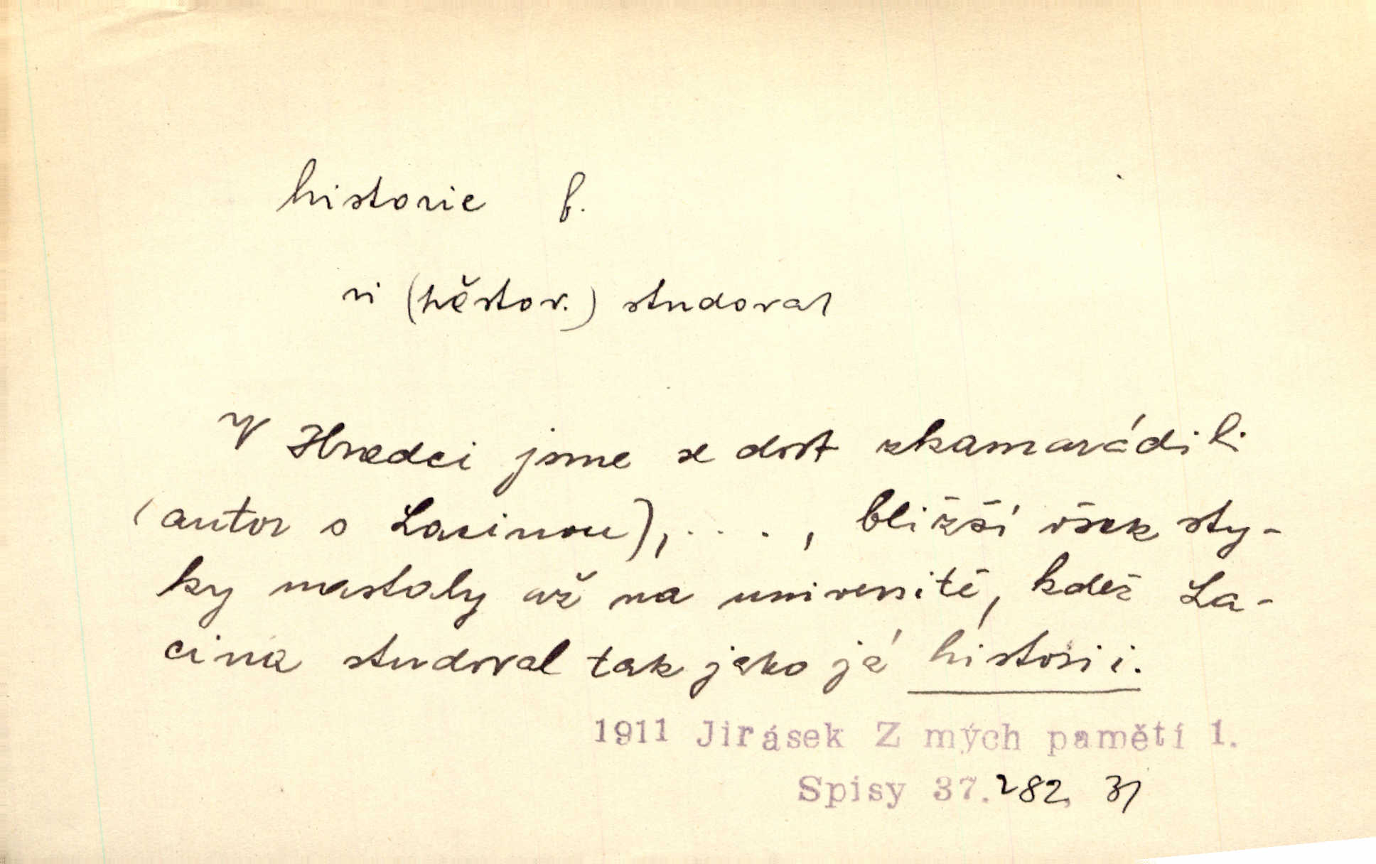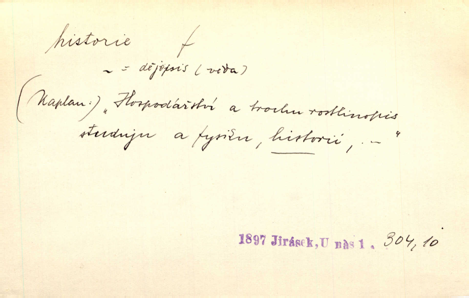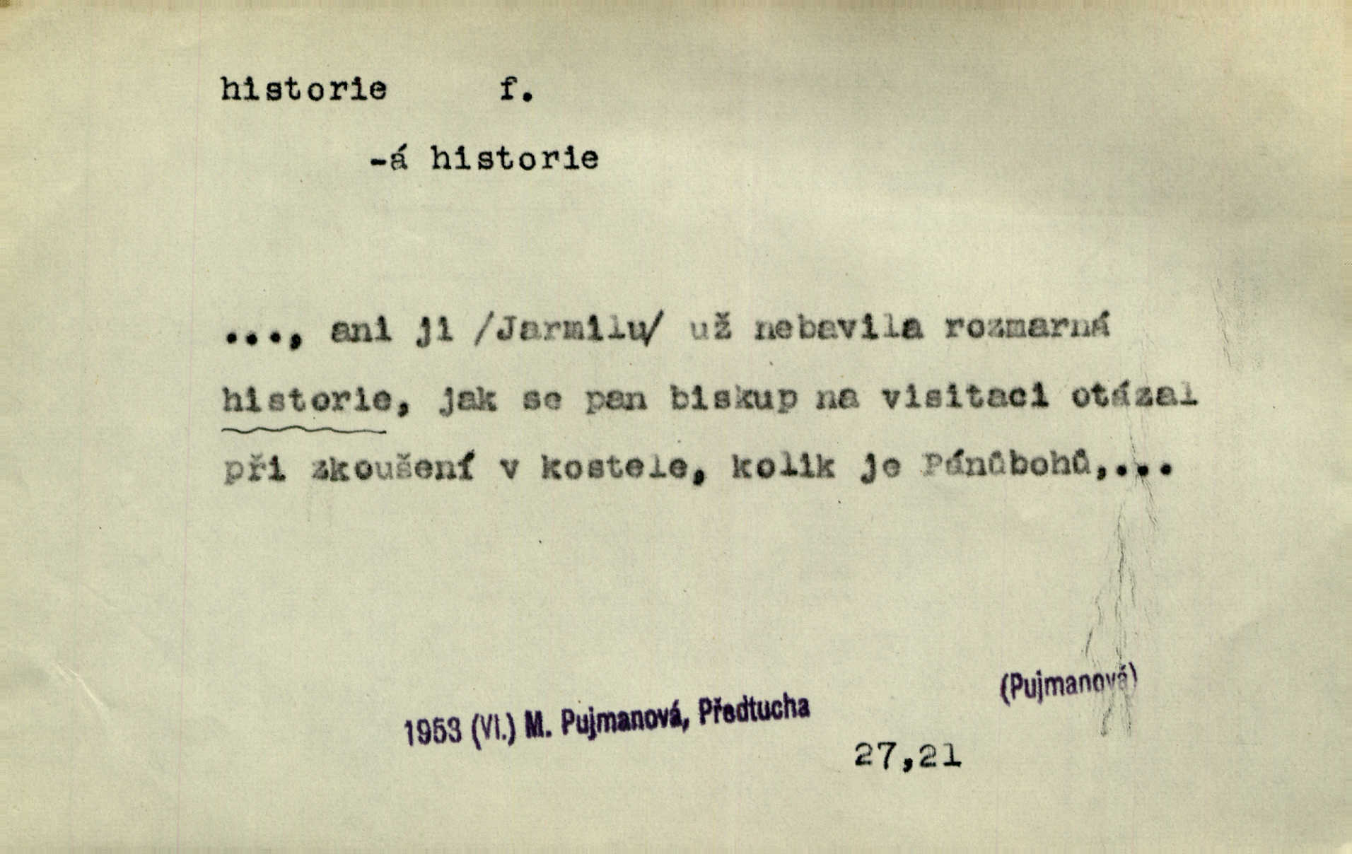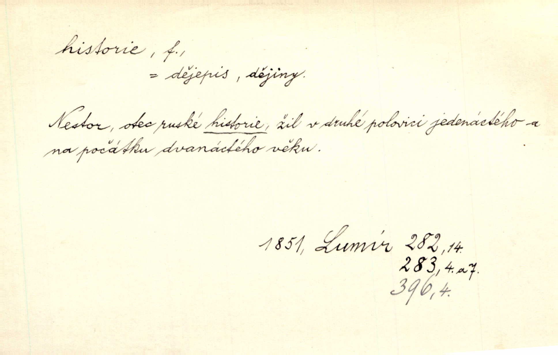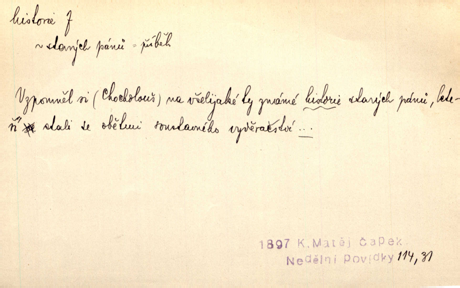 - historie, -e f. dějiny, dějepis. Historie politická, církevní, hospodářská, kulturní. Historie literární dějiny literatury. Historie výtvarných umění, hudby. D (o kom, o čem) vypravování. Znal historii o rytíři, který obléhal hrad krásné vdovy, chtěje násilím dobýti její ruky. Čap. Ch. Poučné a kratochvilné historie o strašidlech. Jir. Kudy všudy chodil — ach, to by byla dlouhá historie! Herrm. D Ob. životní osudy, příběhy, nebo jednotlivá událost, příběh. Znal dobře historii její rodiny. Hlad. Smutná historie Viktorčina [v „Babičce“] zakládá se také na pravdě. Jir. Povím vám historii toho děvčete a pak prosím suďte sám. Štol. D faktum, událost, věc, úkaz. Že bývá z většího dílu ve městech řeč pokažená, to je stará historie. Něm. Číms nekonečně bolestně vzrušeným bylo naplněno srdce mé — ale to jsou jiné historie. Šlej. [Úkol kritiků] je sakramentsky nepříjemná historie, která tě rozvádí a znepřáteluje kde s kým. Šal.