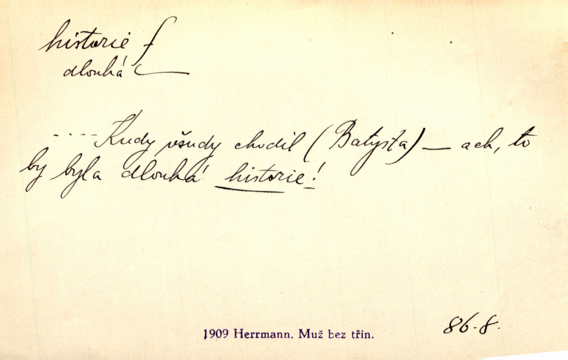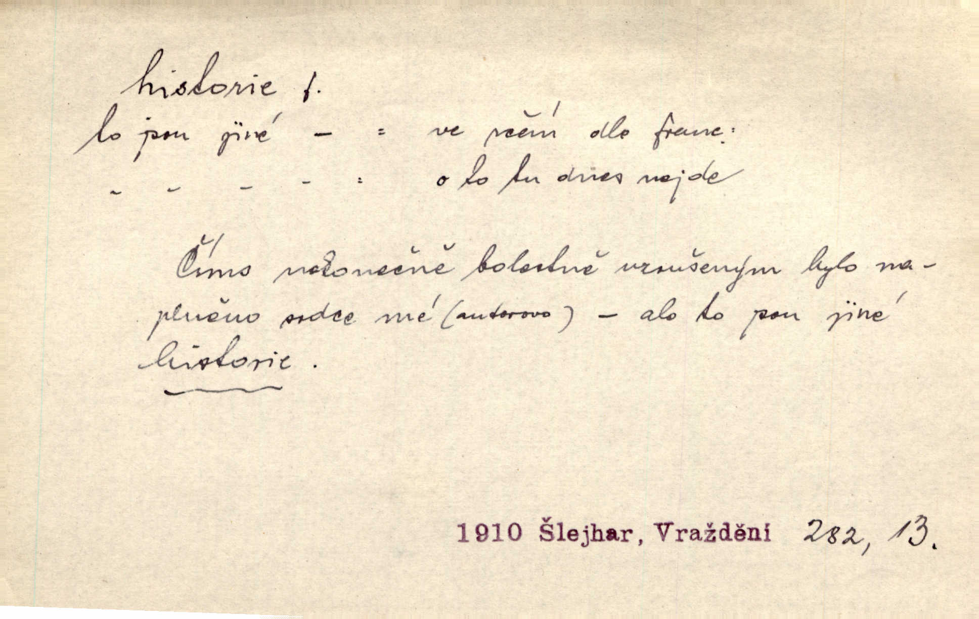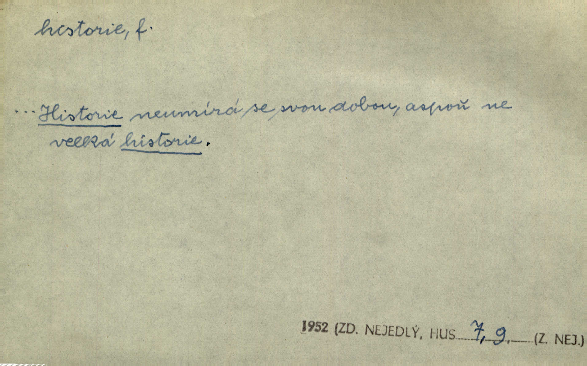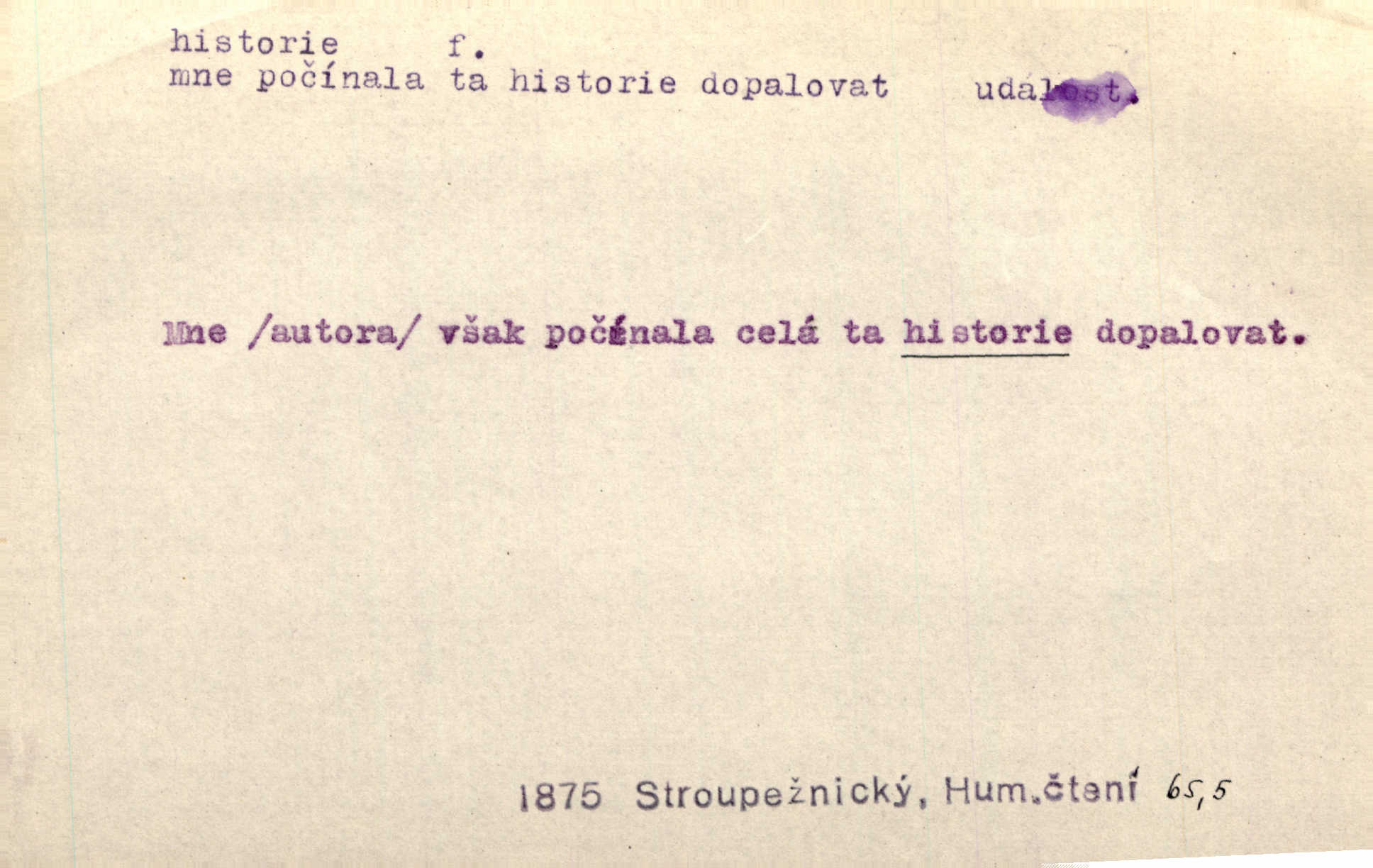 - historie, -e f. dějiny, dějepis. Historie politická, církevní, hospodářská, kulturní. Historie literární dějiny literatury. Historie výtvarných umění, hudby. D (o kom, o čem) vypravování. Znal historii o rytíři, který obléhal hrad krásné vdovy, chtěje násilím dobýti její ruky. Čap. Ch. Poučné a kratochvilné historie o strašidlech. Jir. Kudy všudy chodil — ach, to by byla dlouhá historie! Herrm. D Ob. životní osudy, příběhy, nebo jednotlivá událost, příběh. Znal dobře historii její rodiny. Hlad. Smutná historie Viktorčina [v „Babičce“] zakládá se také na pravdě. Jir. Povím vám historii toho děvčete a pak prosím suďte sám. Štol. D faktum, událost, věc, úkaz. Že bývá z většího dílu ve městech řeč pokažená, to je stará historie. Něm. Číms nekonečně bolestně vzrušeným bylo naplněno srdce mé — ale to jsou jiné historie. Šlej. [Úkol kritiků] je sakramentsky nepříjemná historie, která tě rozvádí a znepřáteluje kde s kým. Šal.