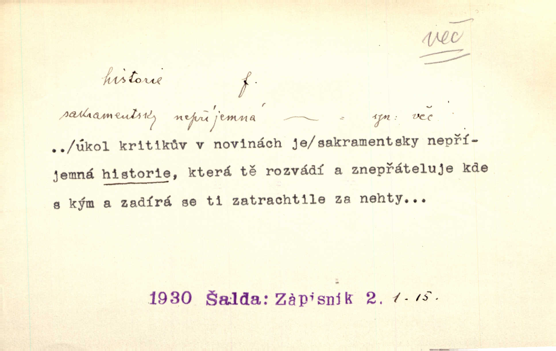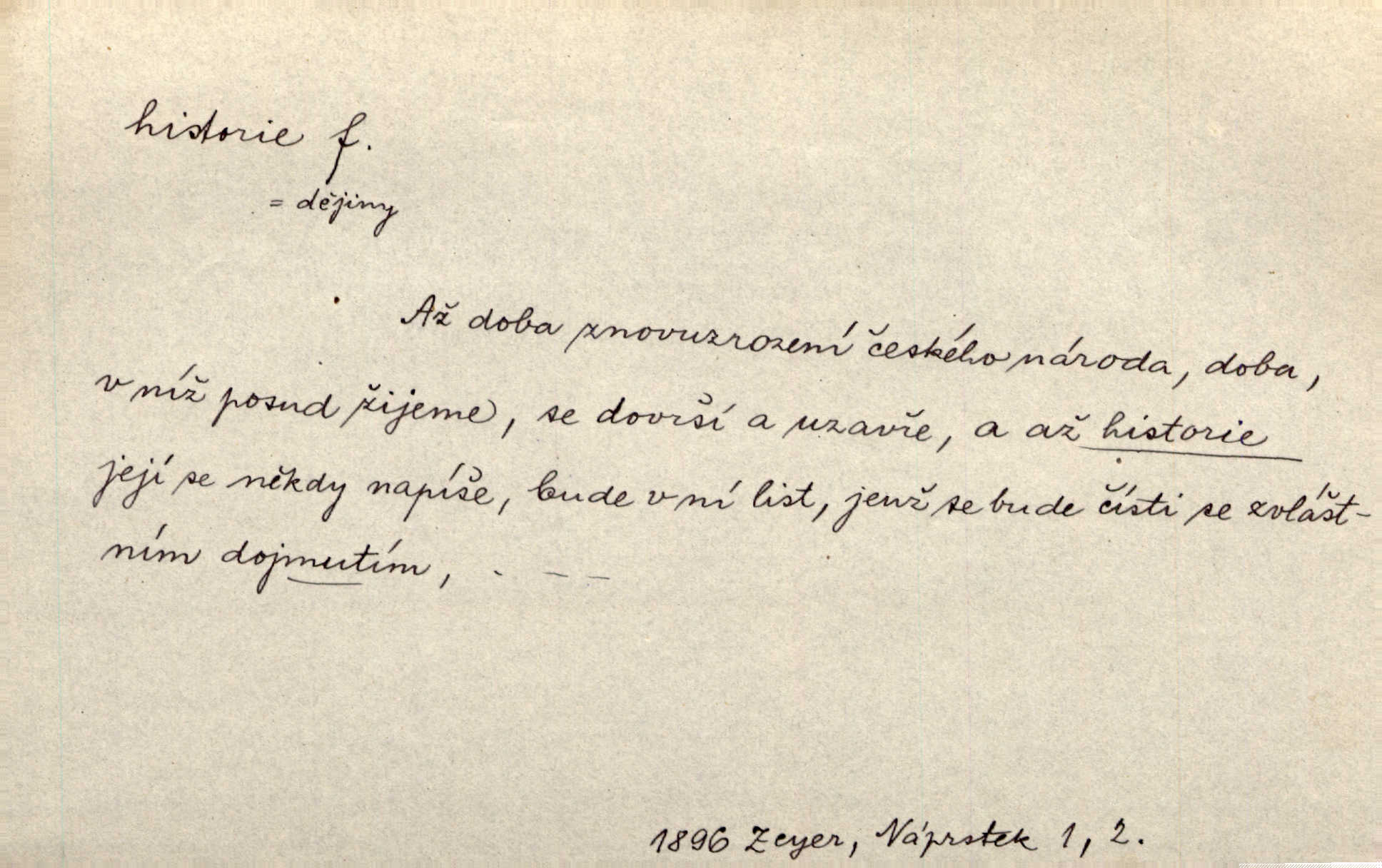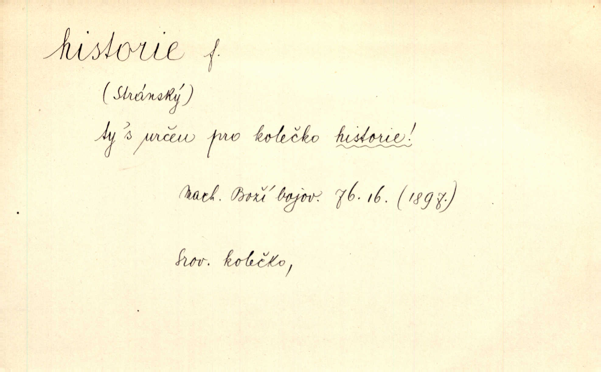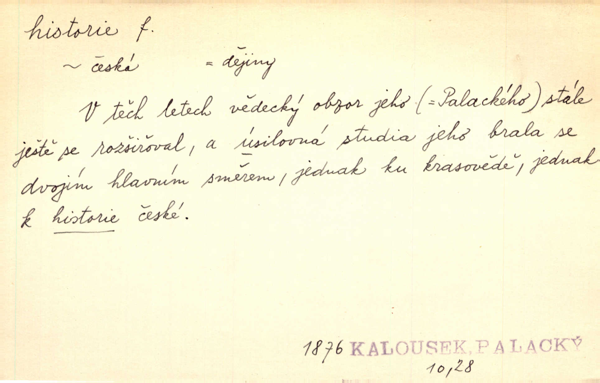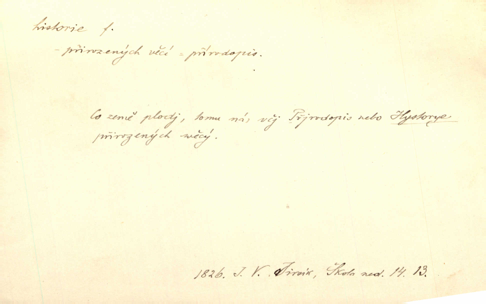 - historie, -e f. dějiny, dějepis. Historie politická, církevní, hospodářská, kulturní. Historie literární dějiny literatury. Historie výtvarných umění, hudby. D (o kom, o čem) vypravování. Znal historii o rytíři, který obléhal hrad krásné vdovy, chtěje násilím dobýti její ruky. Čap. Ch. Poučné a kratochvilné historie o strašidlech. Jir. Kudy všudy chodil — ach, to by byla dlouhá historie! Herrm. D Ob. životní osudy, příběhy, nebo jednotlivá událost, příběh. Znal dobře historii její rodiny. Hlad. Smutná historie Viktorčina [v „Babičce“] zakládá se také na pravdě. Jir. Povím vám historii toho děvčete a pak prosím suďte sám. Štol. D faktum, událost, věc, úkaz. Že bývá z většího dílu ve městech řeč pokažená, to je stará historie. Něm. Číms nekonečně bolestně vzrušeným bylo naplněno srdce mé — ale to jsou jiné historie. Šlej. [Úkol kritiků] je sakramentsky nepříjemná historie, která tě rozvádí a znepřáteluje kde s kým. Šal.