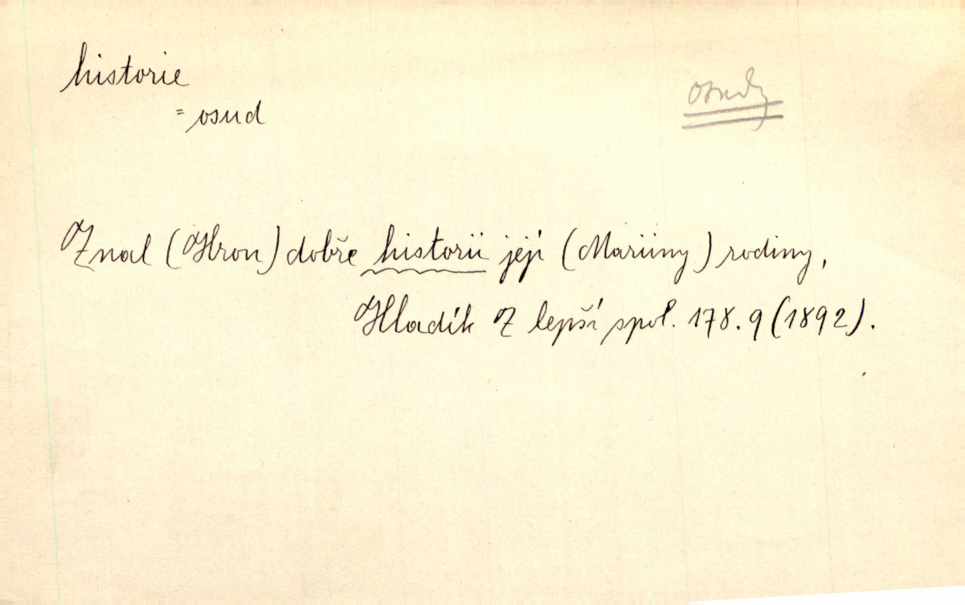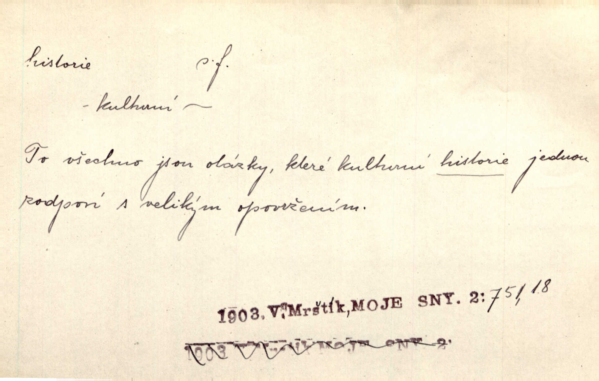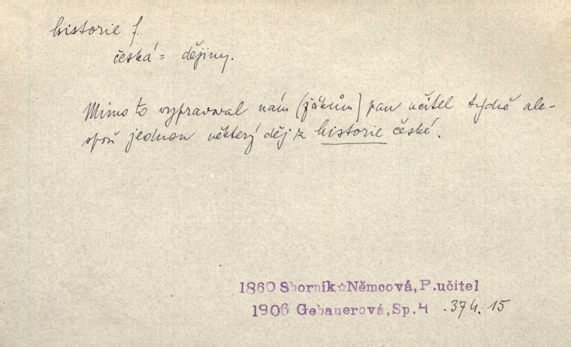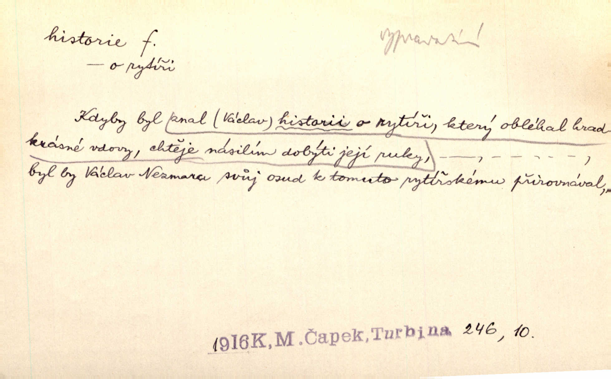 - historie, -e f. dějiny, dějepis. Historie politická, církevní, hospodářská, kulturní. Historie literární dějiny literatury. Historie výtvarných umění, hudby. D (o kom, o čem) vypravování. Znal historii o rytíři, který obléhal hrad krásné vdovy, chtěje násilím dobýti její ruky. Čap. Ch. Poučné a kratochvilné historie o strašidlech. Jir. Kudy všudy chodil — ach, to by byla dlouhá historie! Herrm. D Ob. životní osudy, příběhy, nebo jednotlivá událost, příběh. Znal dobře historii její rodiny. Hlad. Smutná historie Viktorčina [v „Babičce“] zakládá se také na pravdě. Jir. Povím vám historii toho děvčete a pak prosím suďte sám. Štol. D faktum, událost, věc, úkaz. Že bývá z většího dílu ve městech řeč pokažená, to je stará historie. Něm. Číms nekonečně bolestně vzrušeným bylo naplněno srdce mé — ale to jsou jiné historie. Šlej. [Úkol kritiků] je sakramentsky nepříjemná historie, která tě rozvádí a znepřáteluje kde s kým. Šal.