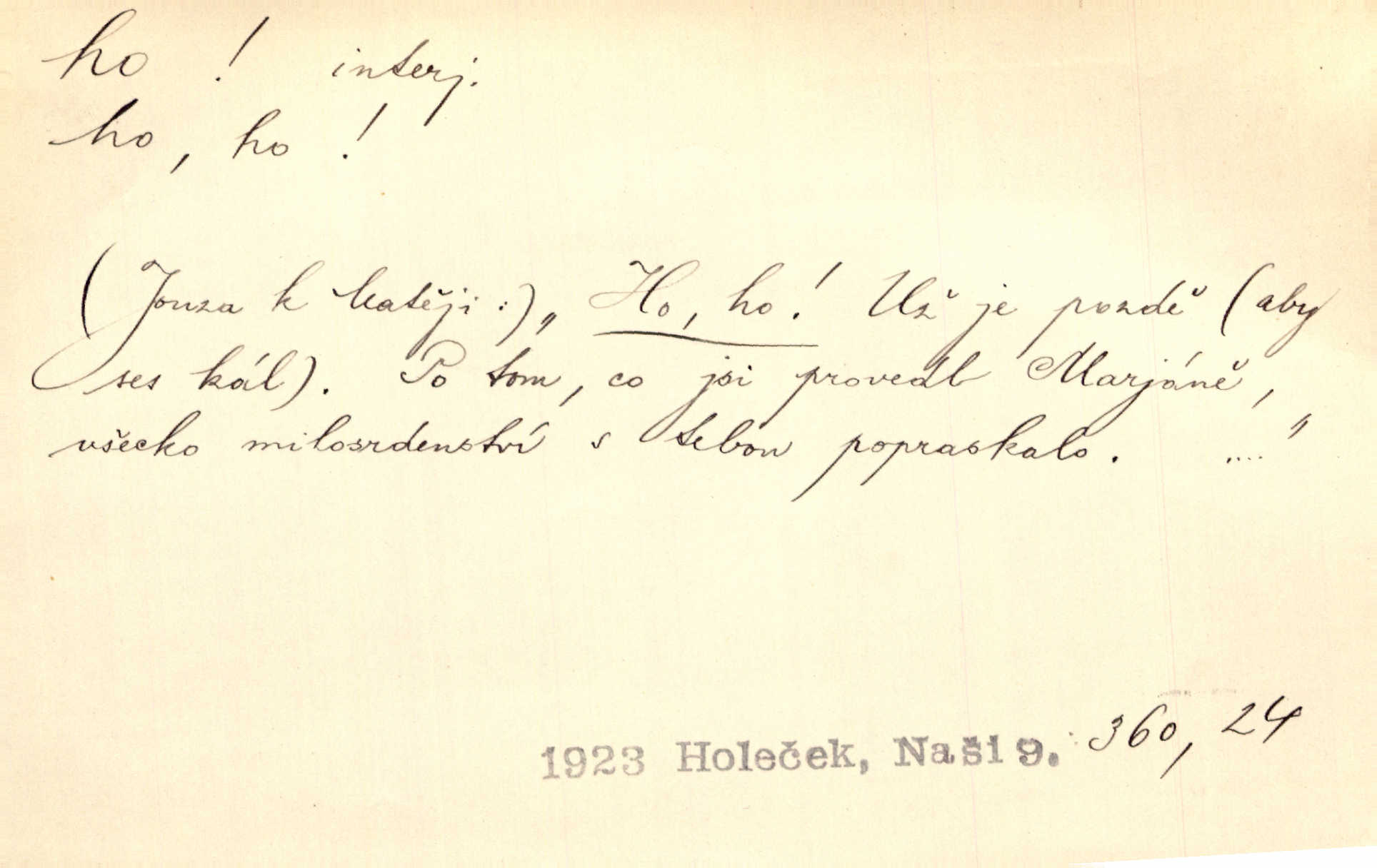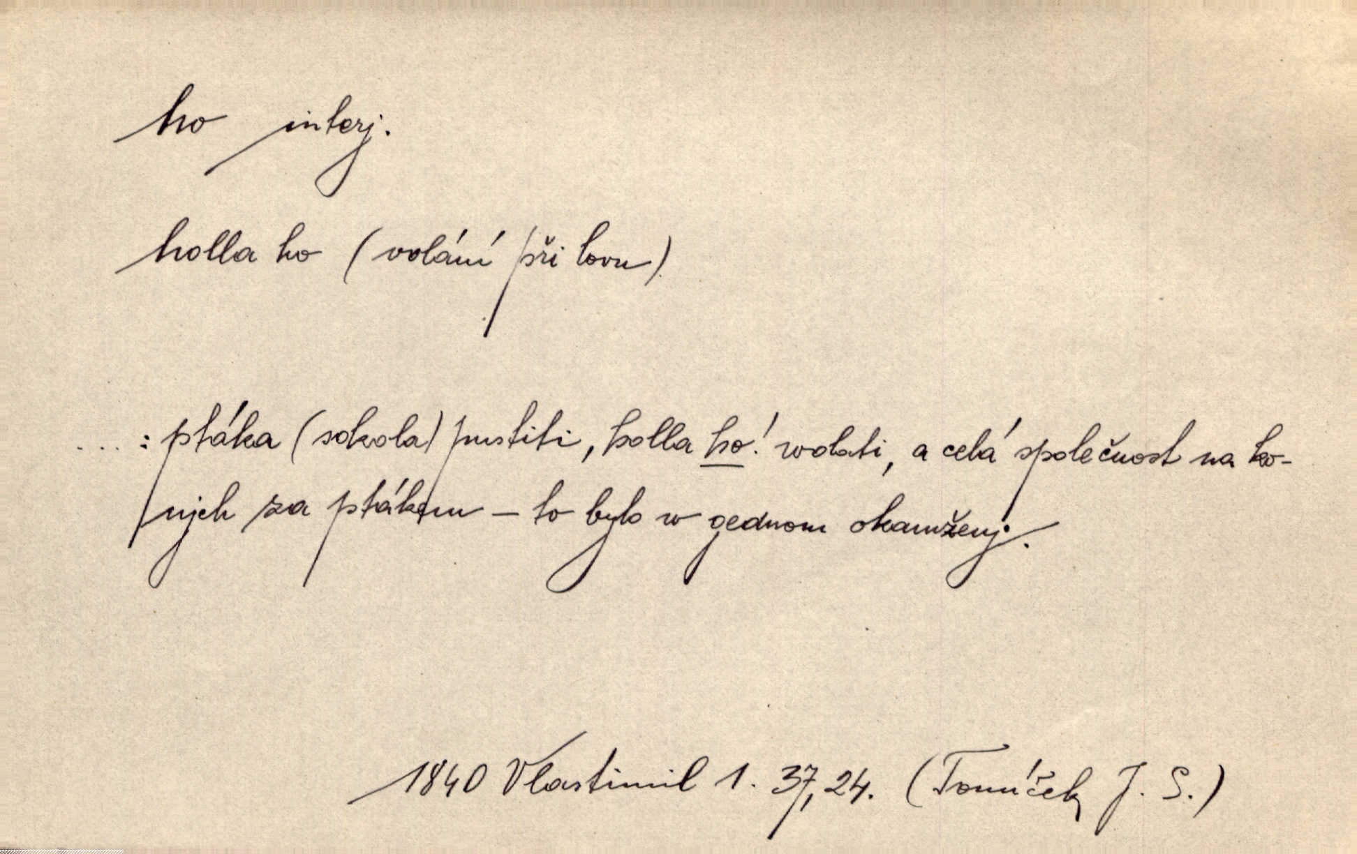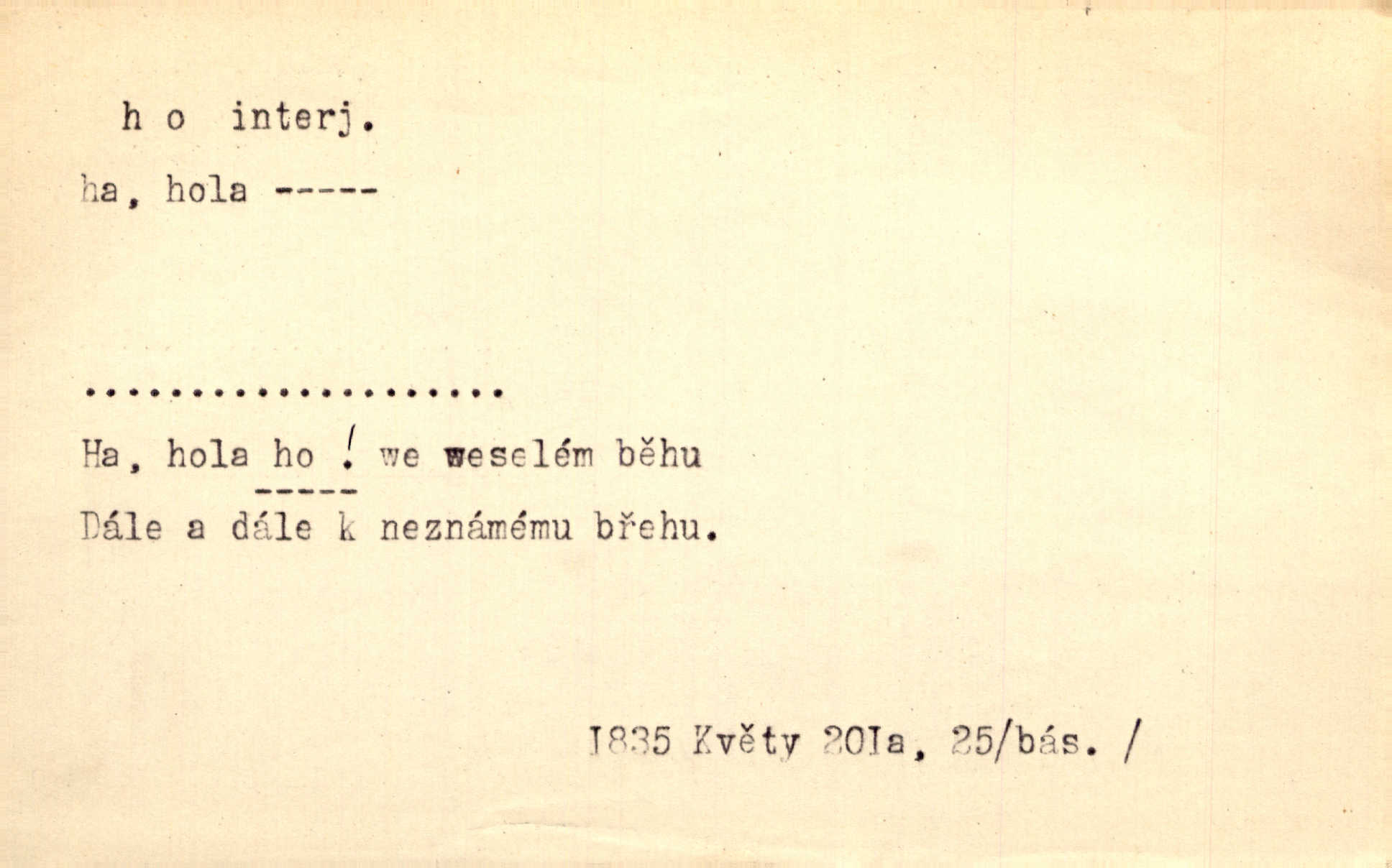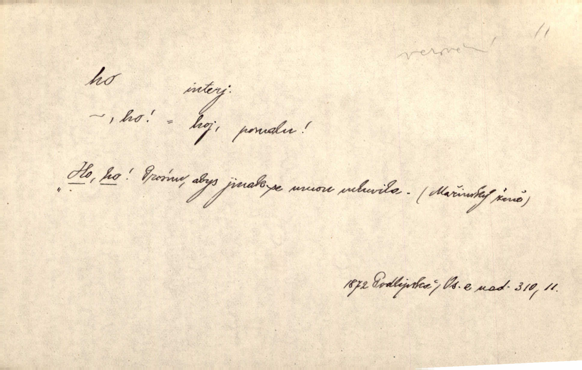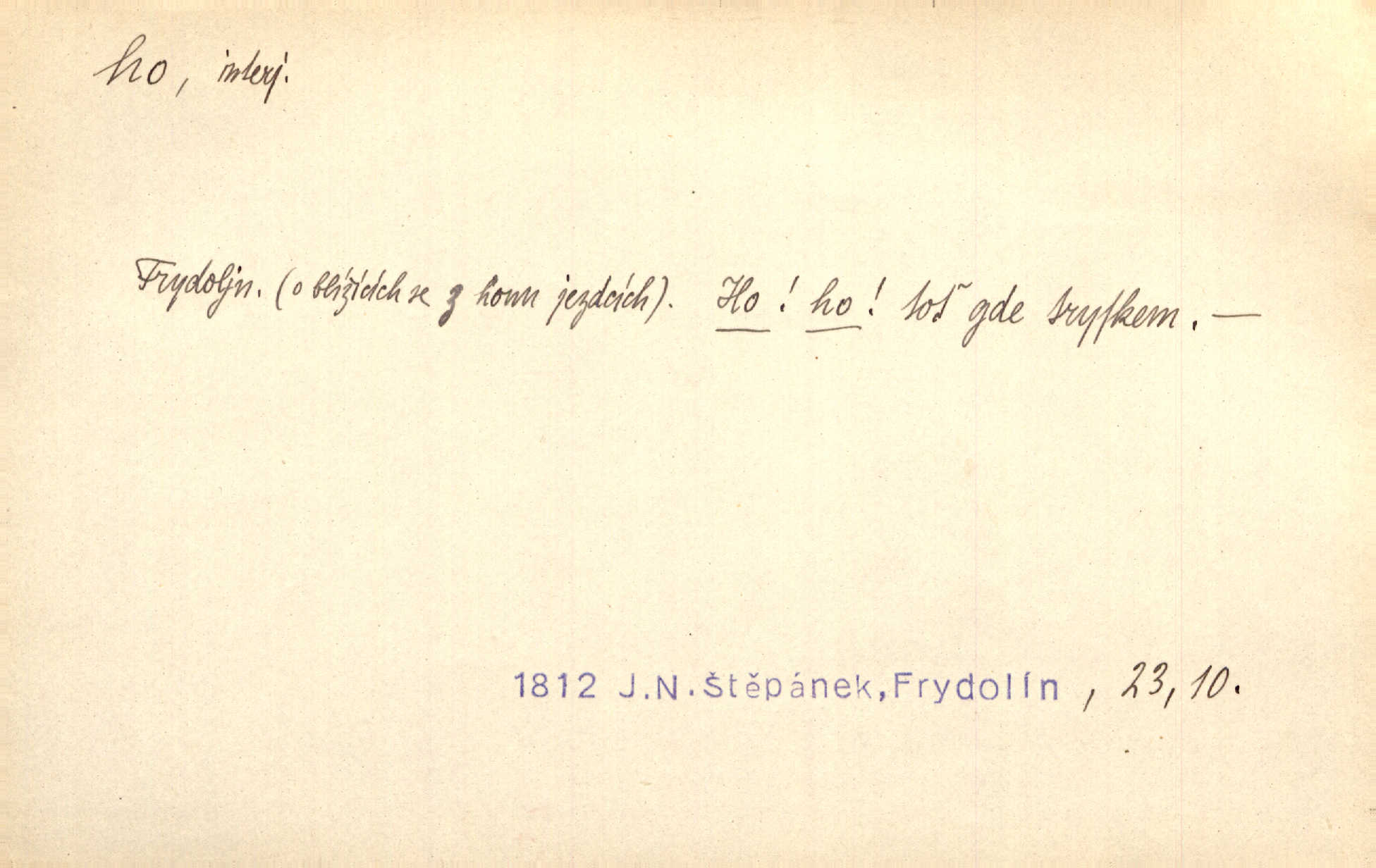 - ho, hó citosl. vyjadřující překvapení, příjemné n. nepříjemné, podiv, uleknutí, nevoli, nedůvěru, nesouhlas. Ho, jaký tlum to pestrý, polonahý těl zapletených. Čech. Hó, milý bratře, aby každý za hlavu se chytil. Jir. „Ho, ho,“ divil se otec, „já o tom nevím.“ Prav. Hó, napadlo nám sněhu. Šrám. Hó, toč se světe, toč. Šrám. Hó, hřeje [po napití koňaku]. Lang. Ho, nech modlení — skoč a pojď. Erb. Hó, strašlivě mi, paní, hráš. Erb. [Na každé větvi] tělo, — a houpá se, — ho, leknutí po tváři pánu přeletělo, ho, tolik mrtvých, — ho, ten strach, hóoo tolik mrtvých na sosnách… Sova. „Kdo to?“ — „To já, tvůj.“ — „Ho, ho, čtveráku!“ Lum. Ho — ho — už dost, ty moudrý kazateli! Jir. Ho, ho, ho… pomalu! Staš. D (obyč. opakováno) naznačuje smích. [Výheň] rudým směje se mu jazykem! Ho! Hoho! Theer. „Ho, ho, ho!“ smál se papoušek. Vrch. D ohlašuje pohyb, zvl. rychlé přibližování. „Hó — hohó — jedeme!“ volá řidič saní. Rais.