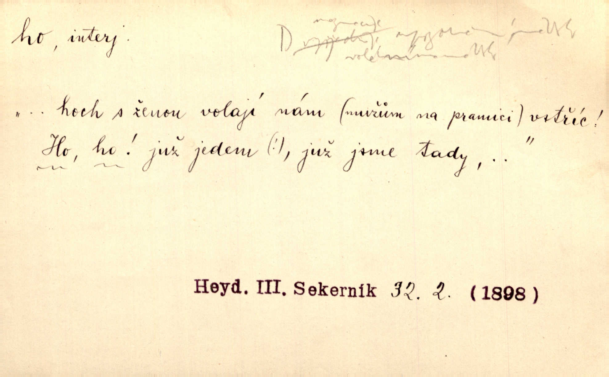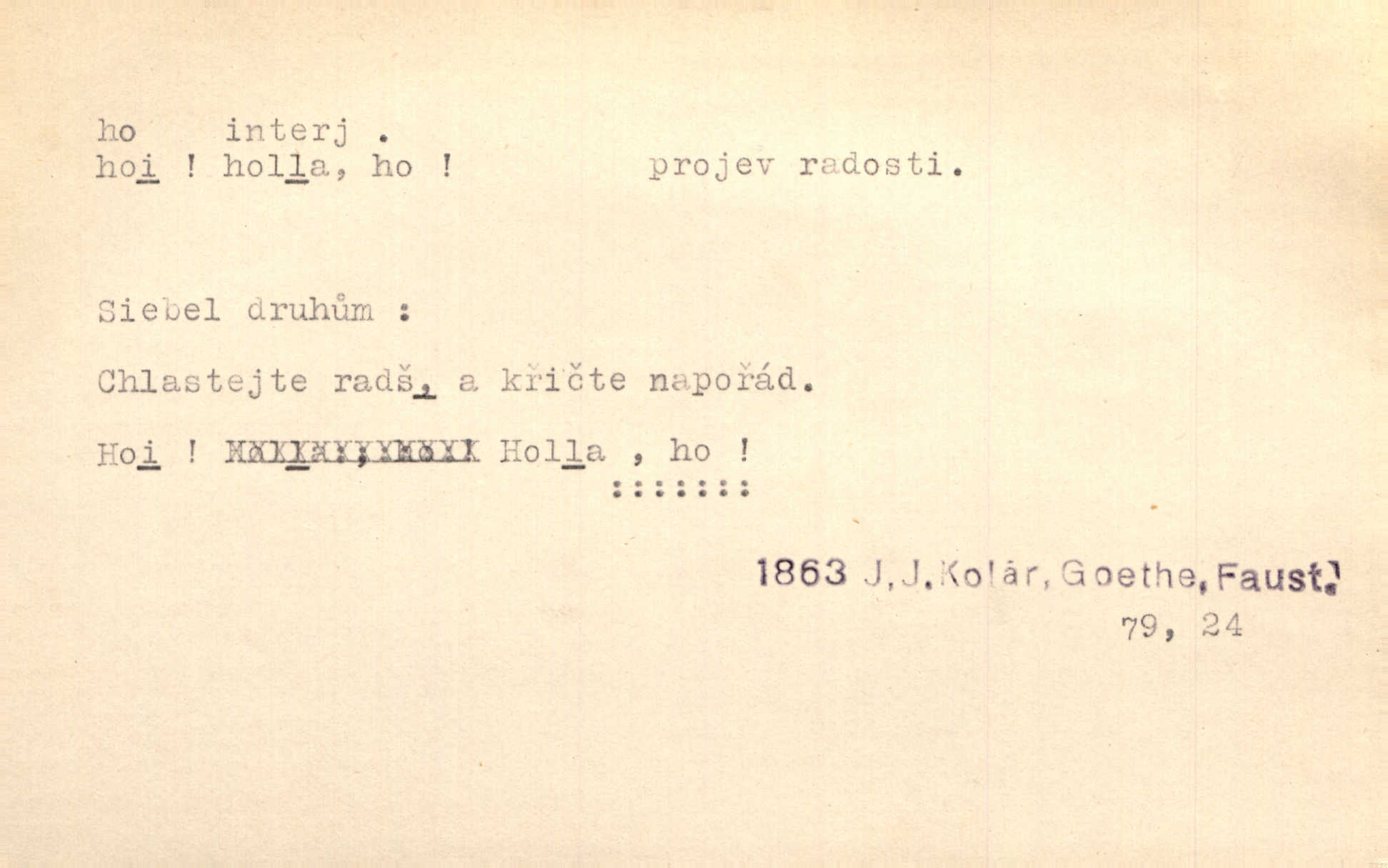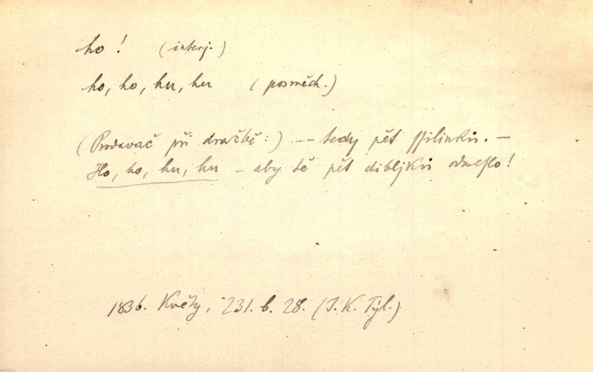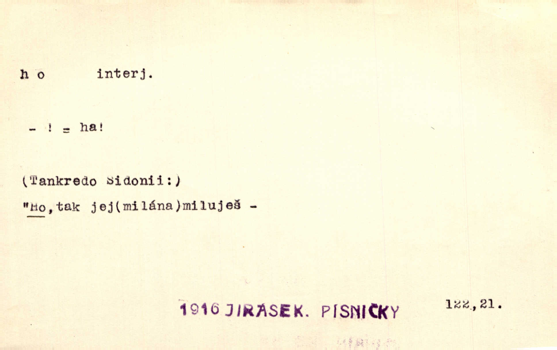- ho, hó citosl. vyjadřující překvapení, příjemné n. nepříjemné, podiv, uleknutí, nevoli, nedůvěru, nesouhlas. Ho, jaký tlum to pestrý, polonahý těl zapletených. Čech. Hó, milý bratře, aby každý za hlavu se chytil. Jir. „Ho, ho,“ divil se otec, „já o tom nevím.“ Prav. Hó, napadlo nám sněhu. Šrám. Hó, toč se světe, toč. Šrám. Hó, hřeje [po napití koňaku]. Lang. Ho, nech modlení — skoč a pojď. Erb. Hó, strašlivě mi, paní, hráš. Erb. [Na každé větvi] tělo, — a houpá se, — ho, leknutí po tváři pánu přeletělo, ho, tolik mrtvých, — ho, ten strach, hóoo tolik mrtvých na sosnách… Sova. „Kdo to?“ — „To já, tvůj.“ — „Ho, ho, čtveráku!“ Lum. Ho — ho — už dost, ty moudrý kazateli! Jir. Ho, ho, ho… pomalu! Staš. D (obyč. opakováno) naznačuje smích. [Výheň] rudým směje se mu jazykem! Ho! Hoho! Theer. „Ho, ho, ho!“ smál se papoušek. Vrch. D ohlašuje pohyb, zvl. rychlé přibližování. „Hó — hohó — jedeme!“ volá řidič saní. Rais.