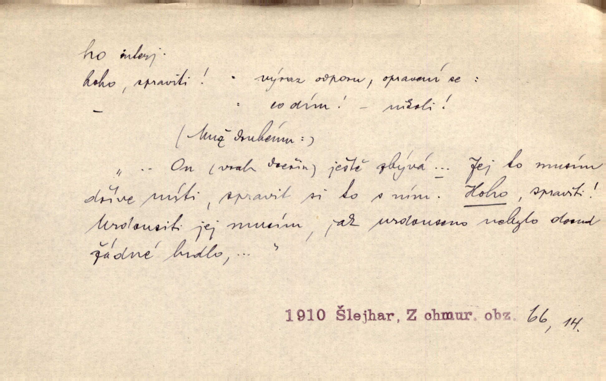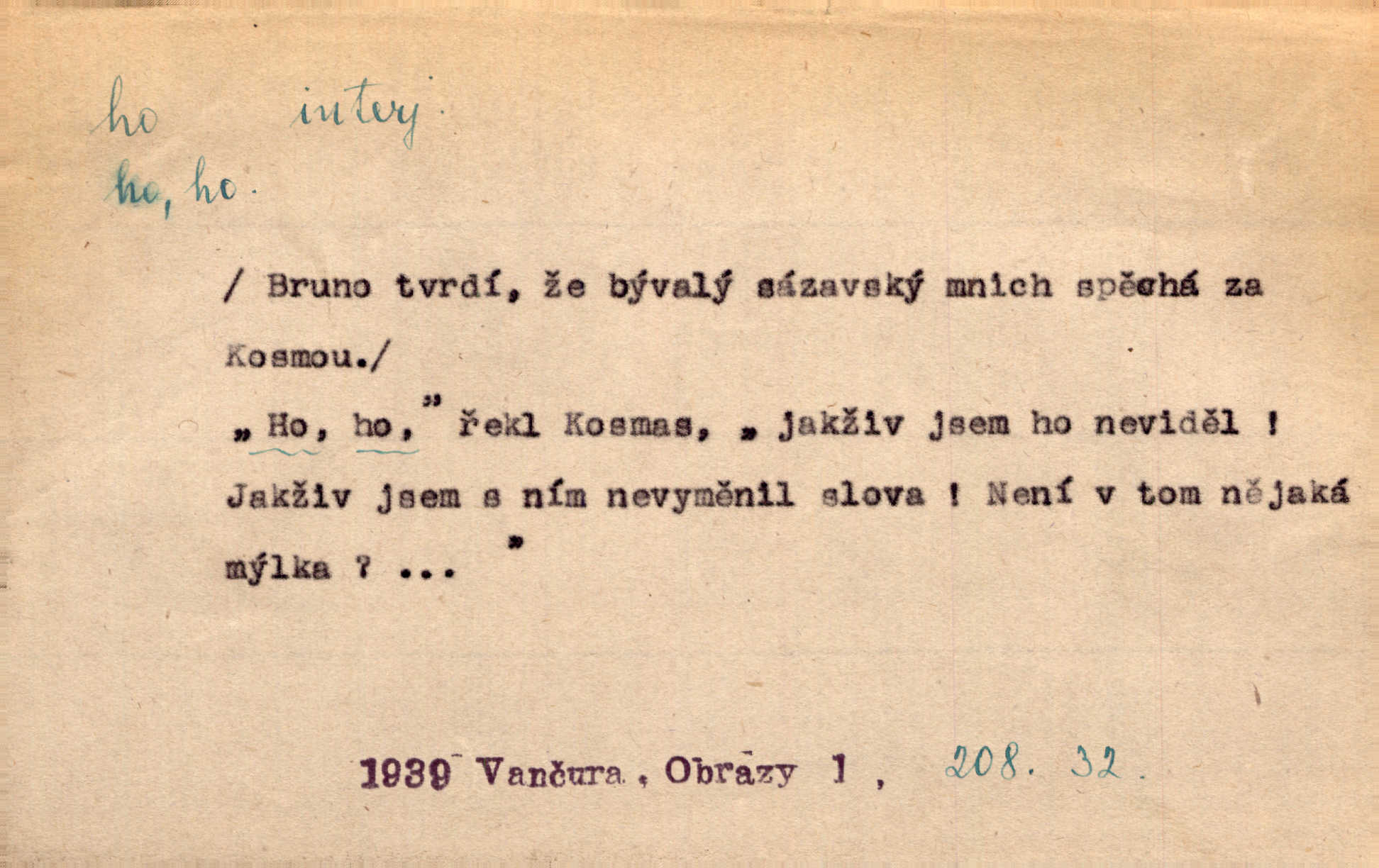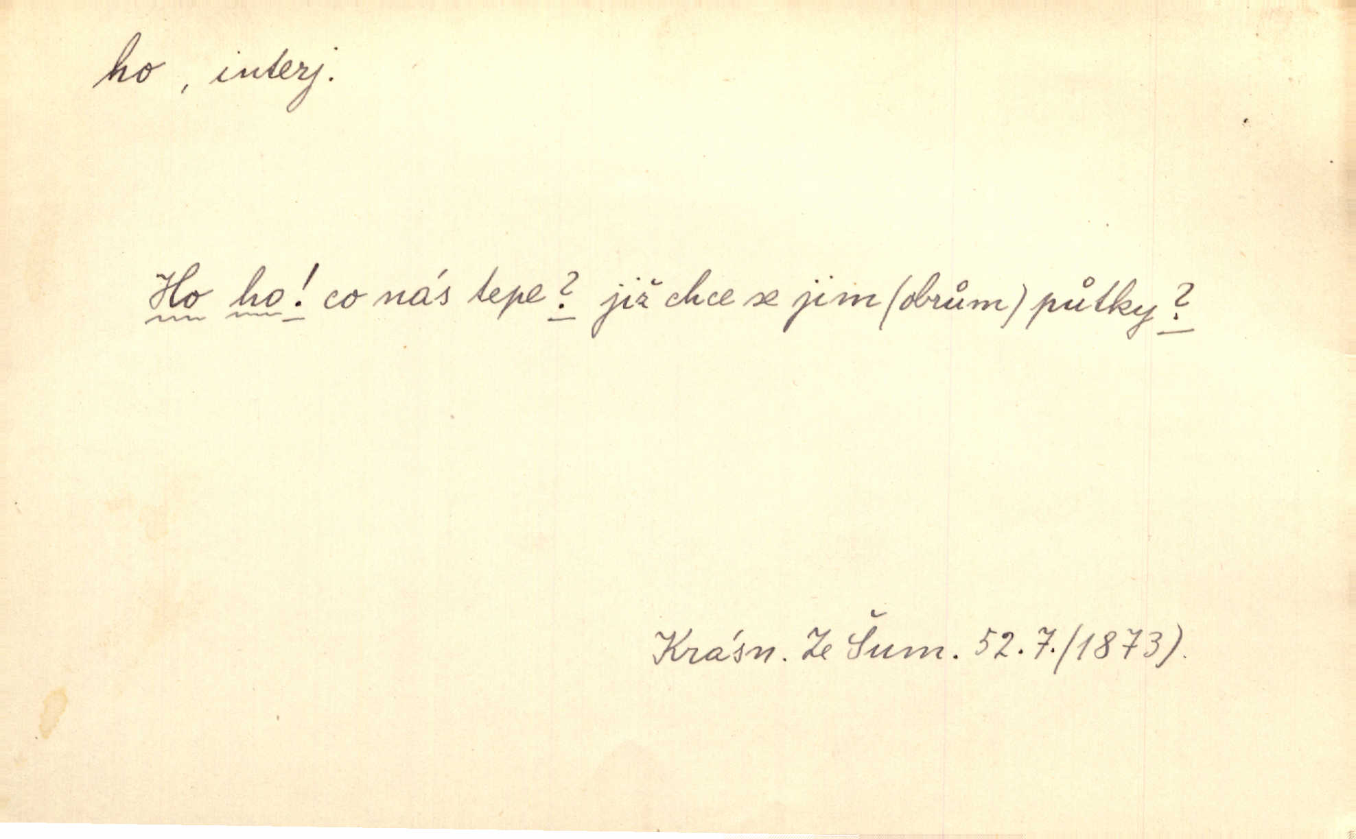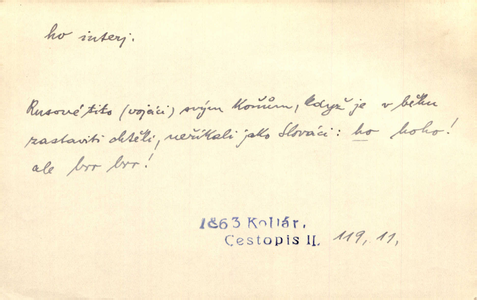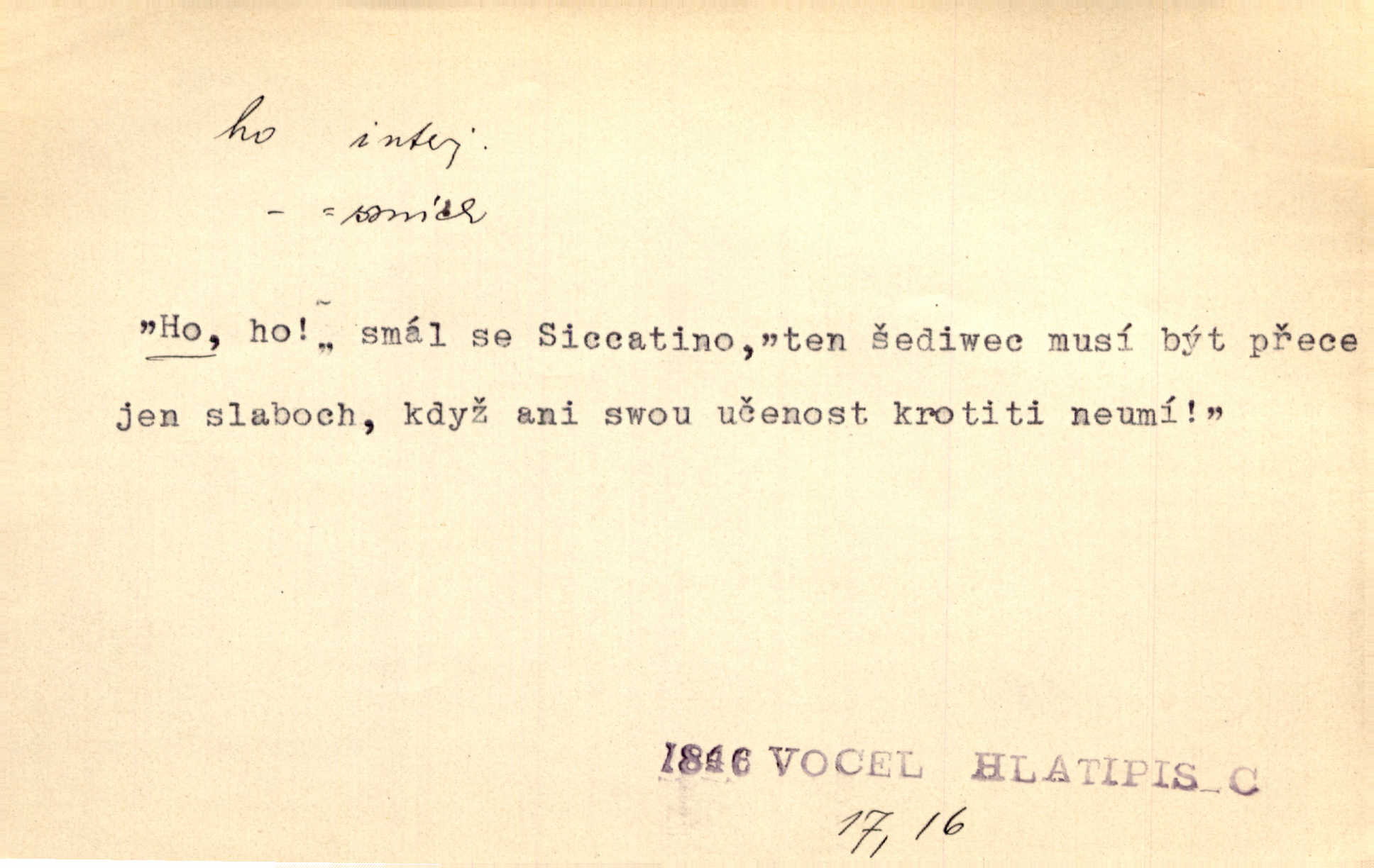 - ho, hó citosl. vyjadřující překvapení, příjemné n. nepříjemné, podiv, uleknutí, nevoli, nedůvěru, nesouhlas. Ho, jaký tlum to pestrý, polonahý těl zapletených. Čech. Hó, milý bratře, aby každý za hlavu se chytil. Jir. „Ho, ho,“ divil se otec, „já o tom nevím.“ Prav. Hó, napadlo nám sněhu. Šrám. Hó, toč se světe, toč. Šrám. Hó, hřeje [po napití koňaku]. Lang. Ho, nech modlení — skoč a pojď. Erb. Hó, strašlivě mi, paní, hráš. Erb. [Na každé větvi] tělo, — a houpá se, — ho, leknutí po tváři pánu přeletělo, ho, tolik mrtvých, — ho, ten strach, hóoo tolik mrtvých na sosnách… Sova. „Kdo to?“ — „To já, tvůj.“ — „Ho, ho, čtveráku!“ Lum. Ho — ho — už dost, ty moudrý kazateli! Jir. Ho, ho, ho… pomalu! Staš. D (obyč. opakováno) naznačuje smích. [Výheň] rudým směje se mu jazykem! Ho! Hoho! Theer. „Ho, ho, ho!“ smál se papoušek. Vrch. D ohlašuje pohyb, zvl. rychlé přibližování. „Hó — hohó — jedeme!“ volá řidič saní. Rais.
