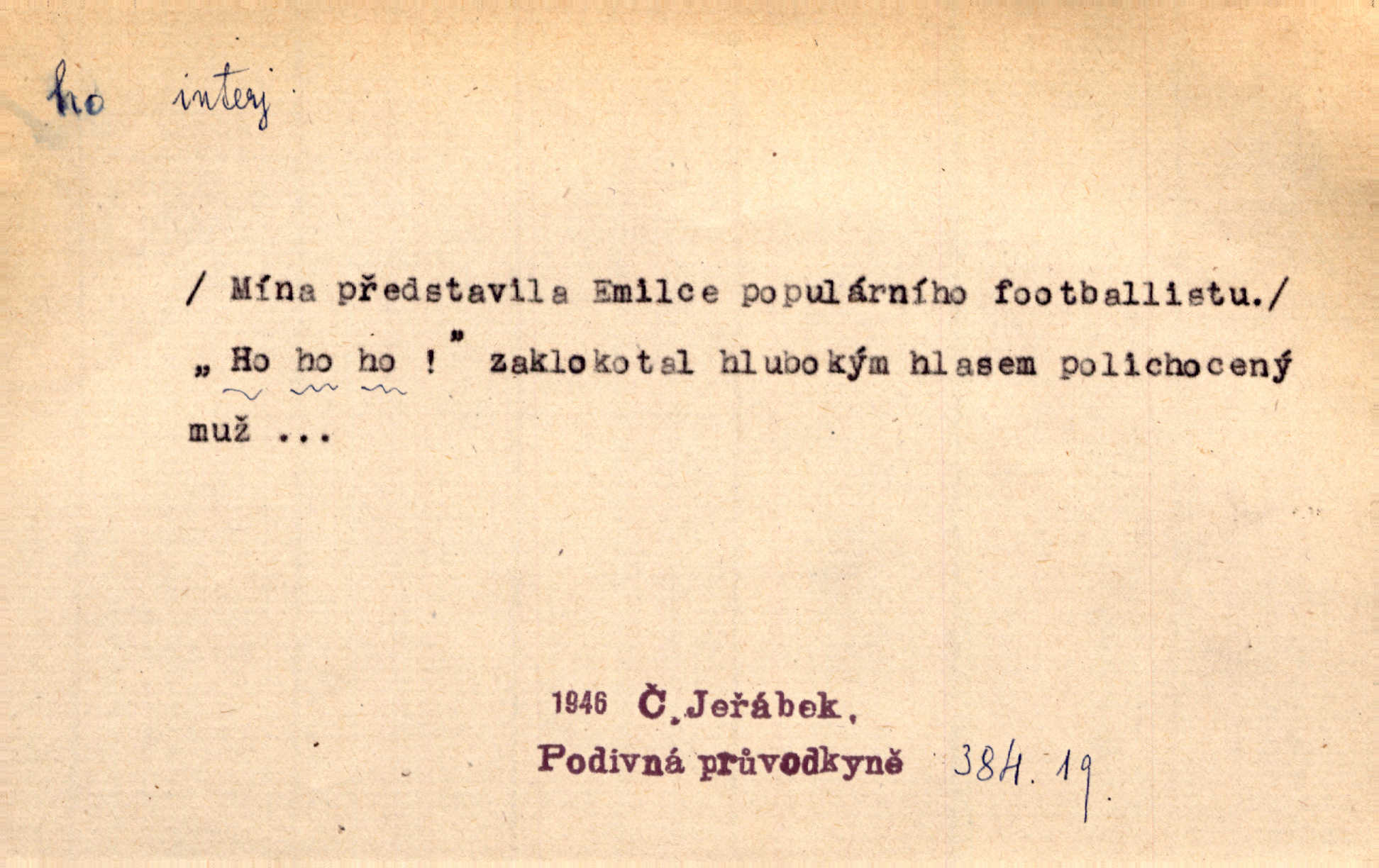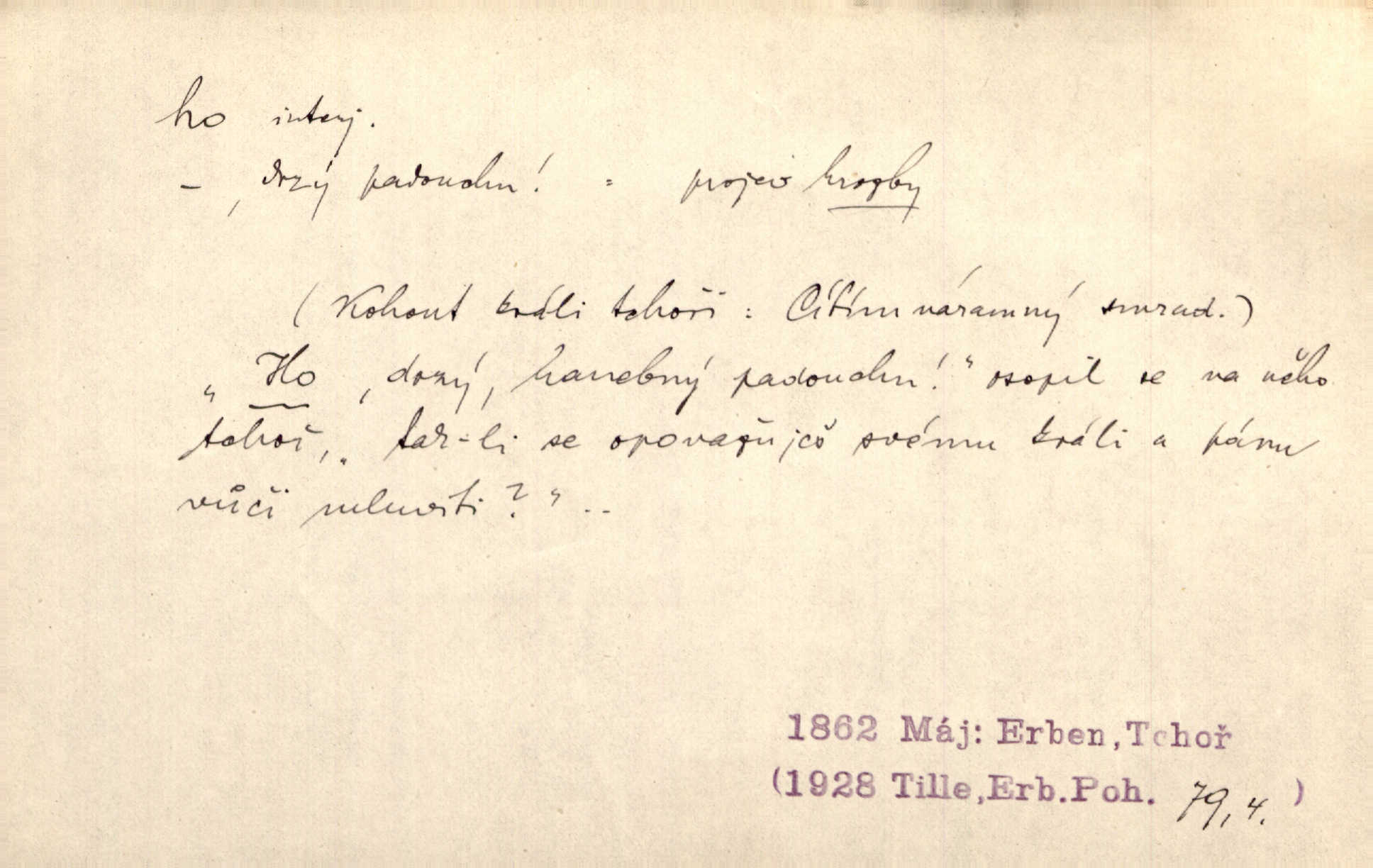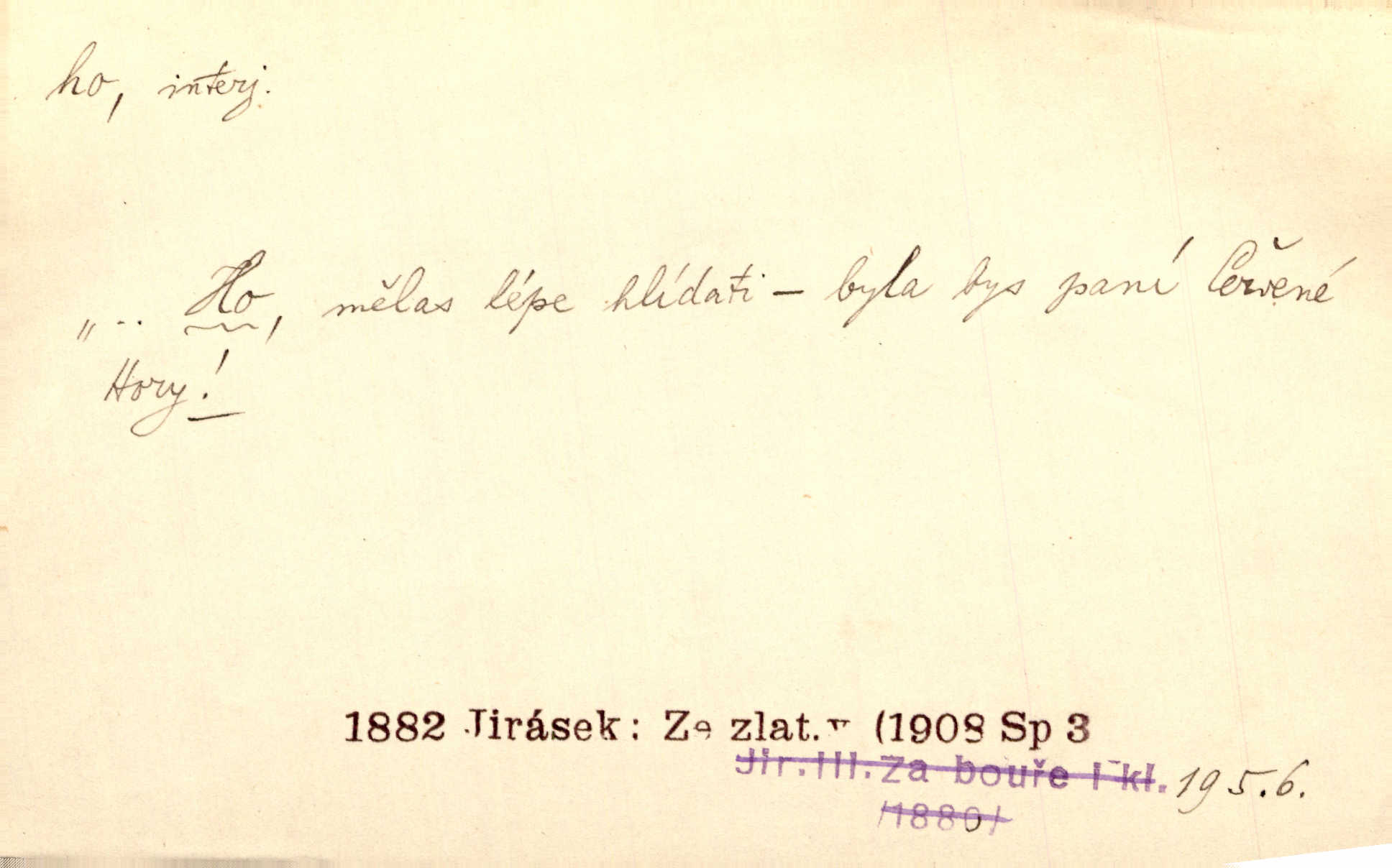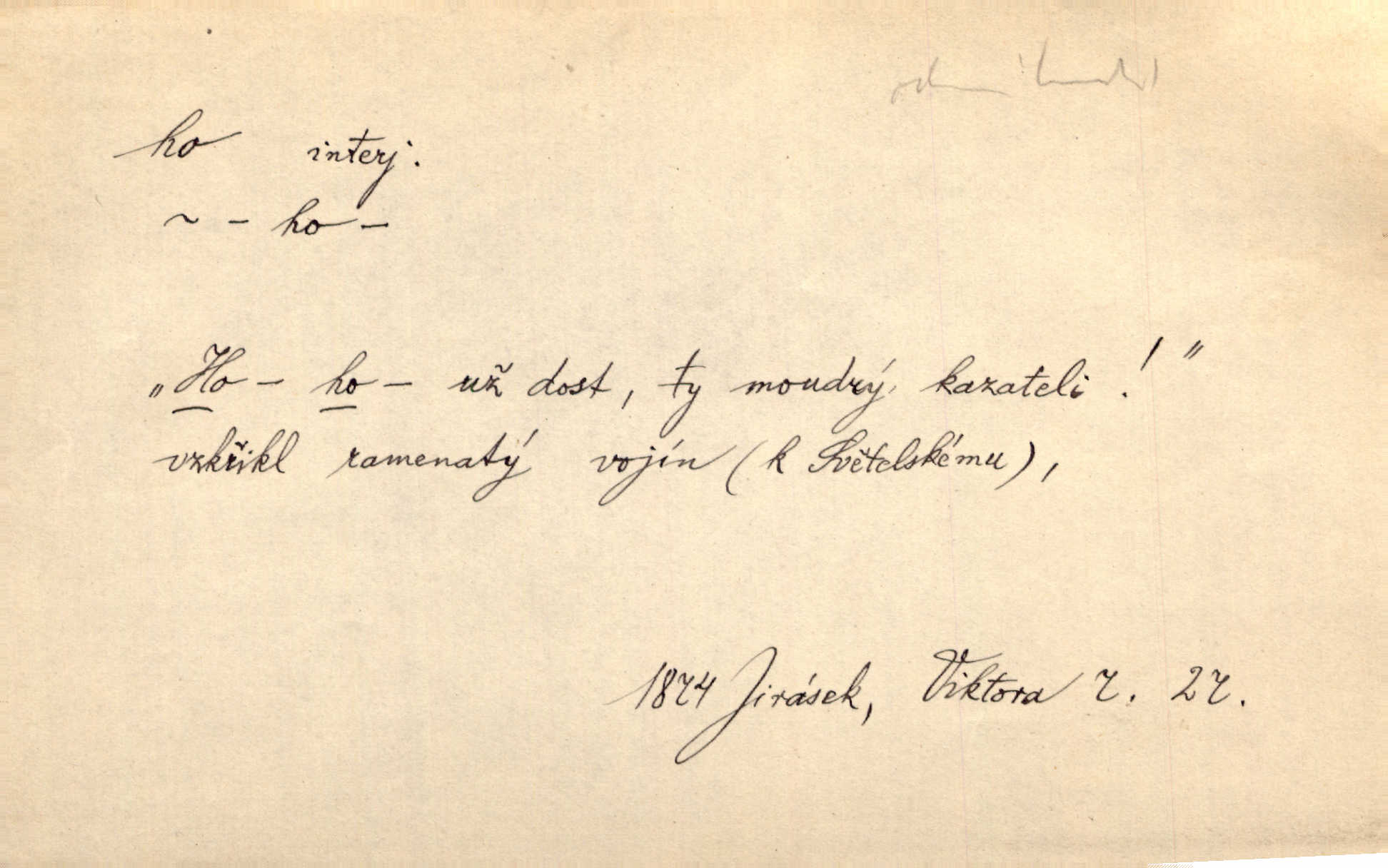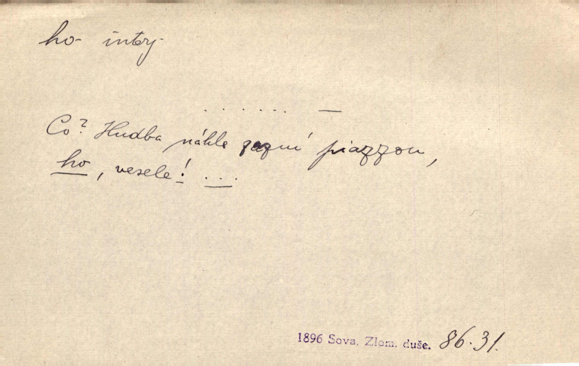 - ho, hó citosl. vyjadřující překvapení, příjemné n. nepříjemné, podiv, uleknutí, nevoli, nedůvěru, nesouhlas. Ho, jaký tlum to pestrý, polonahý těl zapletených. Čech. Hó, milý bratře, aby každý za hlavu se chytil. Jir. „Ho, ho,“ divil se otec, „já o tom nevím.“ Prav. Hó, napadlo nám sněhu. Šrám. Hó, toč se světe, toč. Šrám. Hó, hřeje [po napití koňaku]. Lang. Ho, nech modlení — skoč a pojď. Erb. Hó, strašlivě mi, paní, hráš. Erb. [Na každé větvi] tělo, — a houpá se, — ho, leknutí po tváři pánu přeletělo, ho, tolik mrtvých, — ho, ten strach, hóoo tolik mrtvých na sosnách… Sova. „Kdo to?“ — „To já, tvůj.“ — „Ho, ho, čtveráku!“ Lum. Ho — ho — už dost, ty moudrý kazateli! Jir. Ho, ho, ho… pomalu! Staš. D (obyč. opakováno) naznačuje smích. [Výheň] rudým směje se mu jazykem! Ho! Hoho! Theer. „Ho, ho, ho!“ smál se papoušek. Vrch. D ohlašuje pohyb, zvl. rychlé přibližování. „Hó — hohó — jedeme!“ volá řidič saní. Rais.