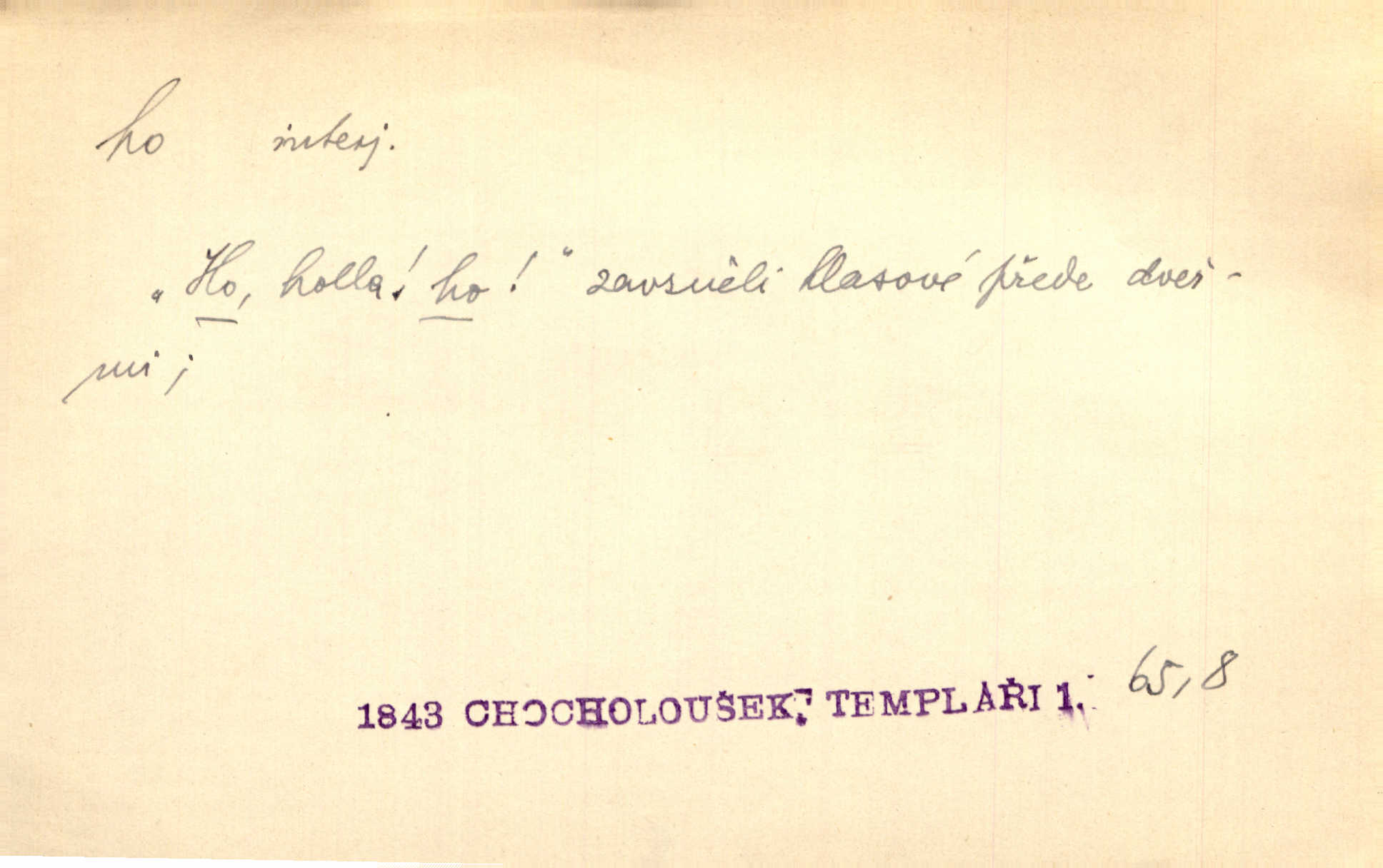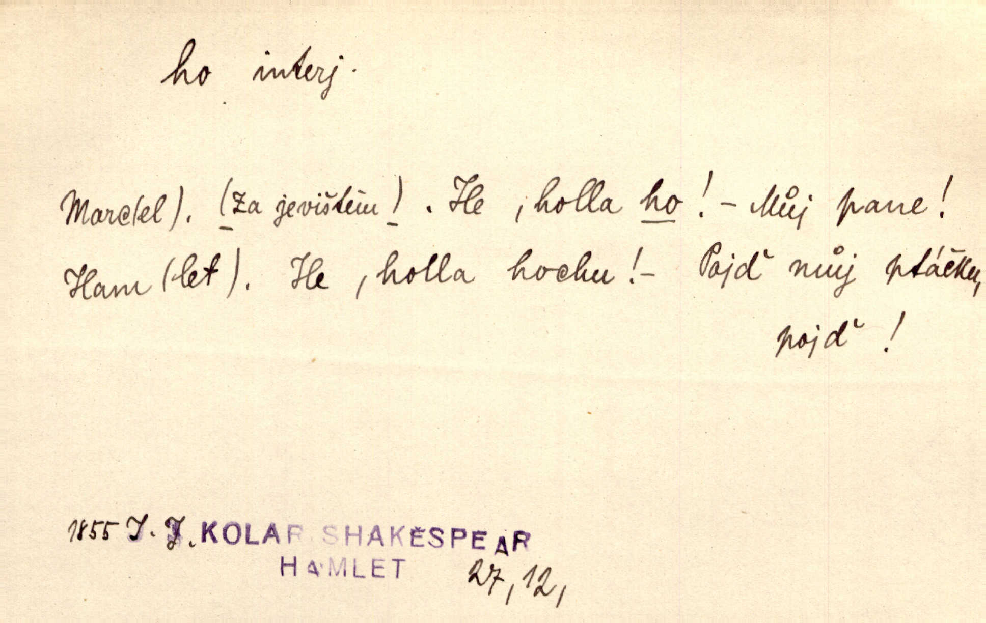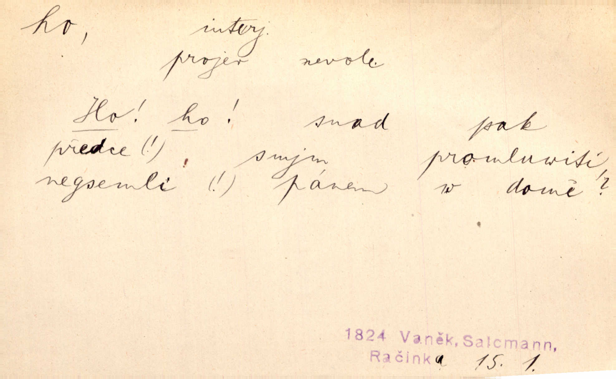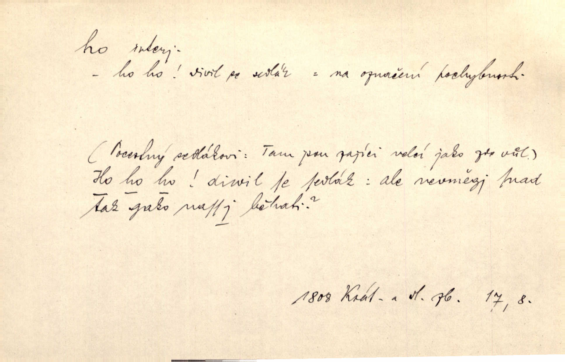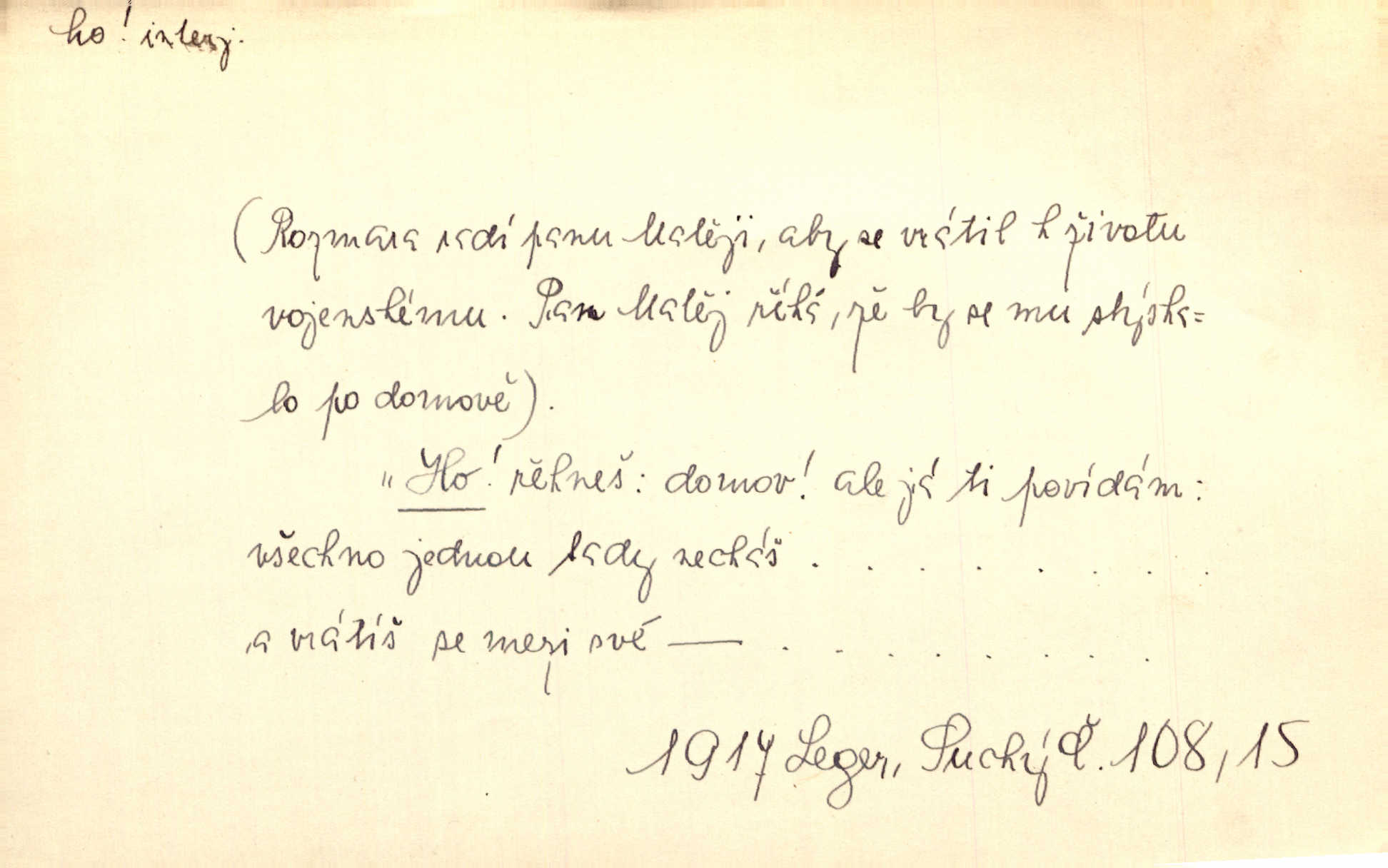 - ho, hó citosl. vyjadřující překvapení, příjemné n. nepříjemné, podiv, uleknutí, nevoli, nedůvěru, nesouhlas. Ho, jaký tlum to pestrý, polonahý těl zapletených. Čech. Hó, milý bratře, aby každý za hlavu se chytil. Jir. „Ho, ho,“ divil se otec, „já o tom nevím.“ Prav. Hó, napadlo nám sněhu. Šrám. Hó, toč se světe, toč. Šrám. Hó, hřeje [po napití koňaku]. Lang. Ho, nech modlení — skoč a pojď. Erb. Hó, strašlivě mi, paní, hráš. Erb. [Na každé větvi] tělo, — a houpá se, — ho, leknutí po tváři pánu přeletělo, ho, tolik mrtvých, — ho, ten strach, hóoo tolik mrtvých na sosnách… Sova. „Kdo to?“ — „To já, tvůj.“ — „Ho, ho, čtveráku!“ Lum. Ho — ho — už dost, ty moudrý kazateli! Jir. Ho, ho, ho… pomalu! Staš. D (obyč. opakováno) naznačuje smích. [Výheň] rudým směje se mu jazykem! Ho! Hoho! Theer. „Ho, ho, ho!“ smál se papoušek. Vrch. D ohlašuje pohyb, zvl. rychlé přibližování. „Hó — hohó — jedeme!“ volá řidič saní. Rais.