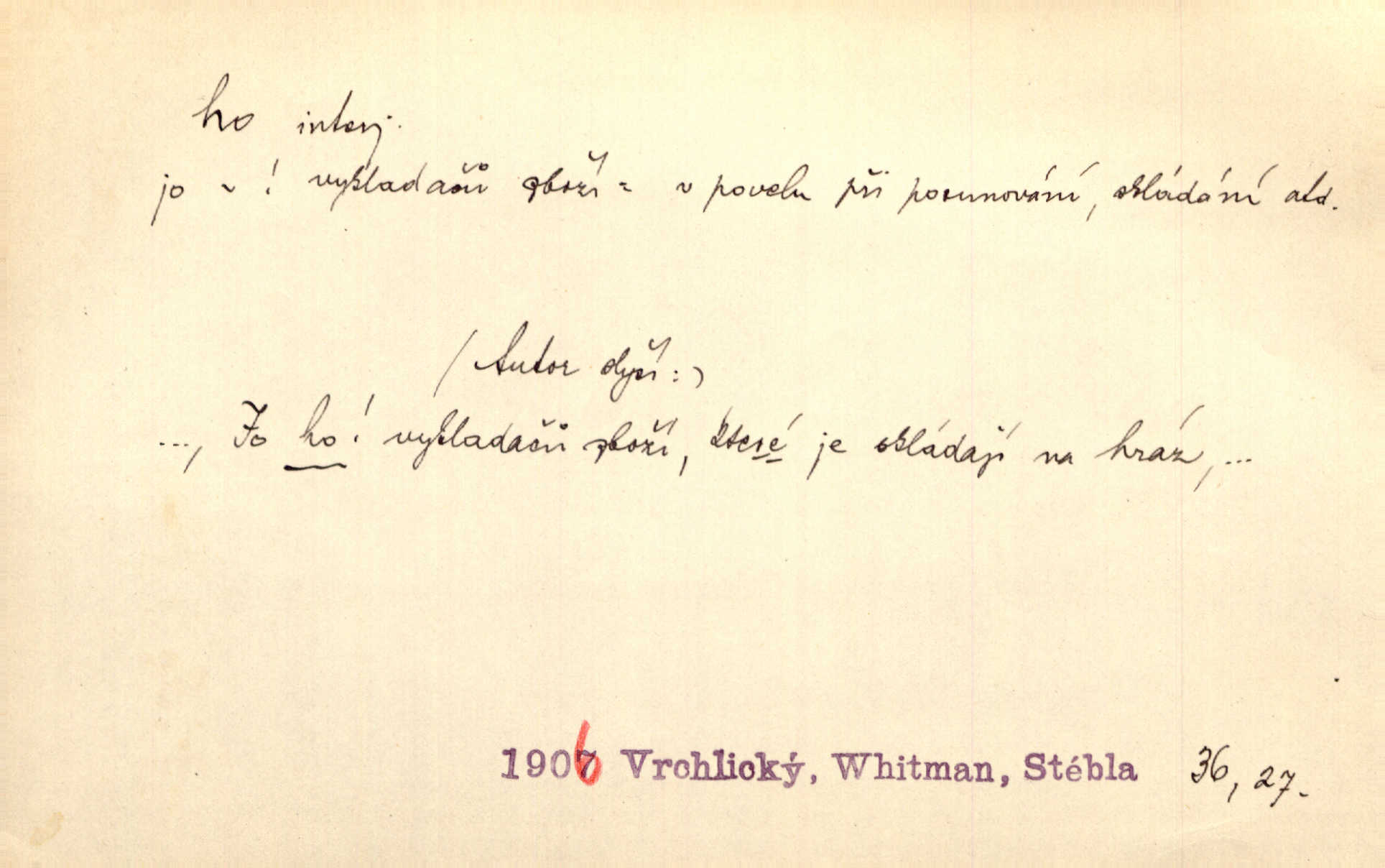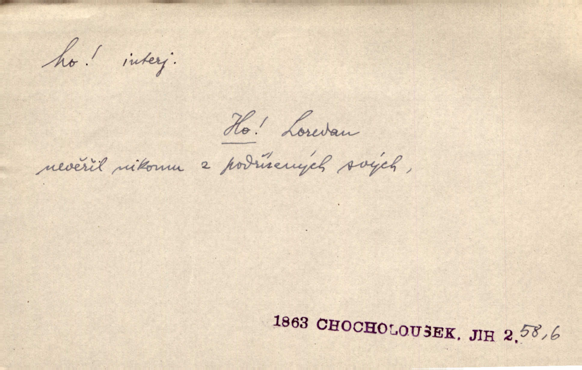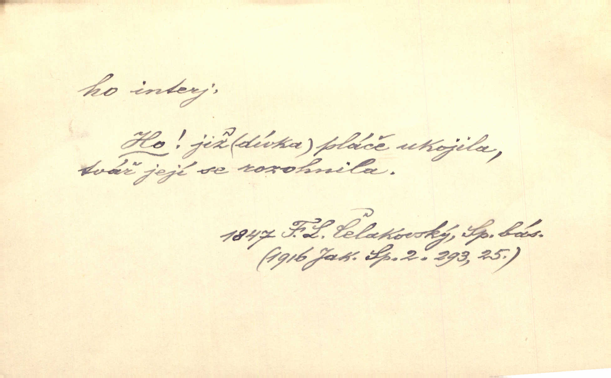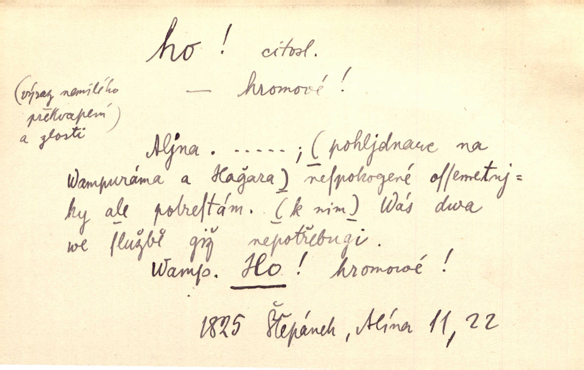 - ho, hó citosl. vyjadřující překvapení, příjemné n. nepříjemné, podiv, uleknutí, nevoli, nedůvěru, nesouhlas. Ho, jaký tlum to pestrý, polonahý těl zapletených. Čech. Hó, milý bratře, aby každý za hlavu se chytil. Jir. „Ho, ho,“ divil se otec, „já o tom nevím.“ Prav. Hó, napadlo nám sněhu. Šrám. Hó, toč se světe, toč. Šrám. Hó, hřeje [po napití koňaku]. Lang. Ho, nech modlení — skoč a pojď. Erb. Hó, strašlivě mi, paní, hráš. Erb. [Na každé větvi] tělo, — a houpá se, — ho, leknutí po tváři pánu přeletělo, ho, tolik mrtvých, — ho, ten strach, hóoo tolik mrtvých na sosnách… Sova. „Kdo to?“ — „To já, tvůj.“ — „Ho, ho, čtveráku!“ Lum. Ho — ho — už dost, ty moudrý kazateli! Jir. Ho, ho, ho… pomalu! Staš. D (obyč. opakováno) naznačuje smích. [Výheň] rudým směje se mu jazykem! Ho! Hoho! Theer. „Ho, ho, ho!“ smál se papoušek. Vrch. D ohlašuje pohyb, zvl. rychlé přibližování. „Hó — hohó — jedeme!“ volá řidič saní. Rais.