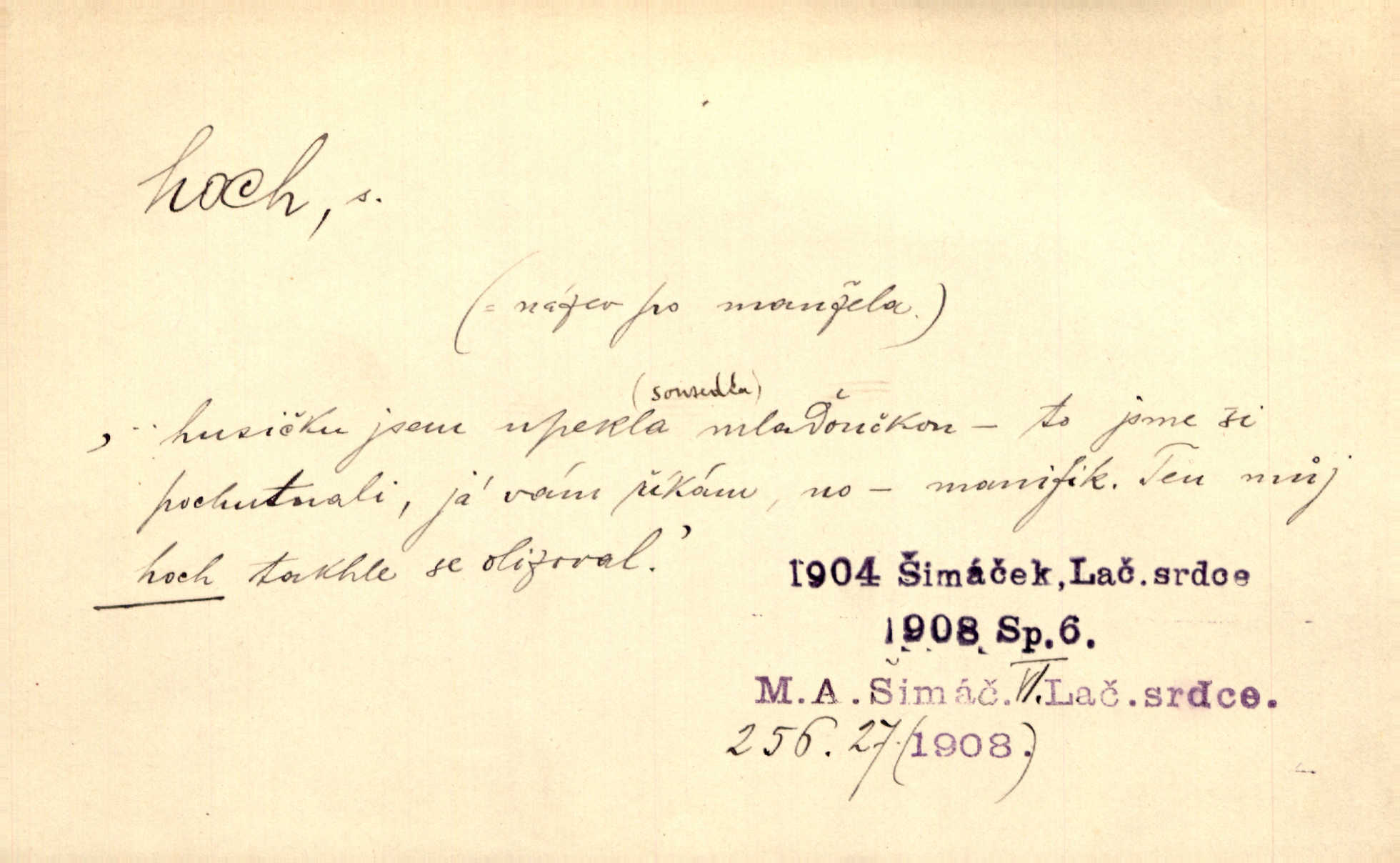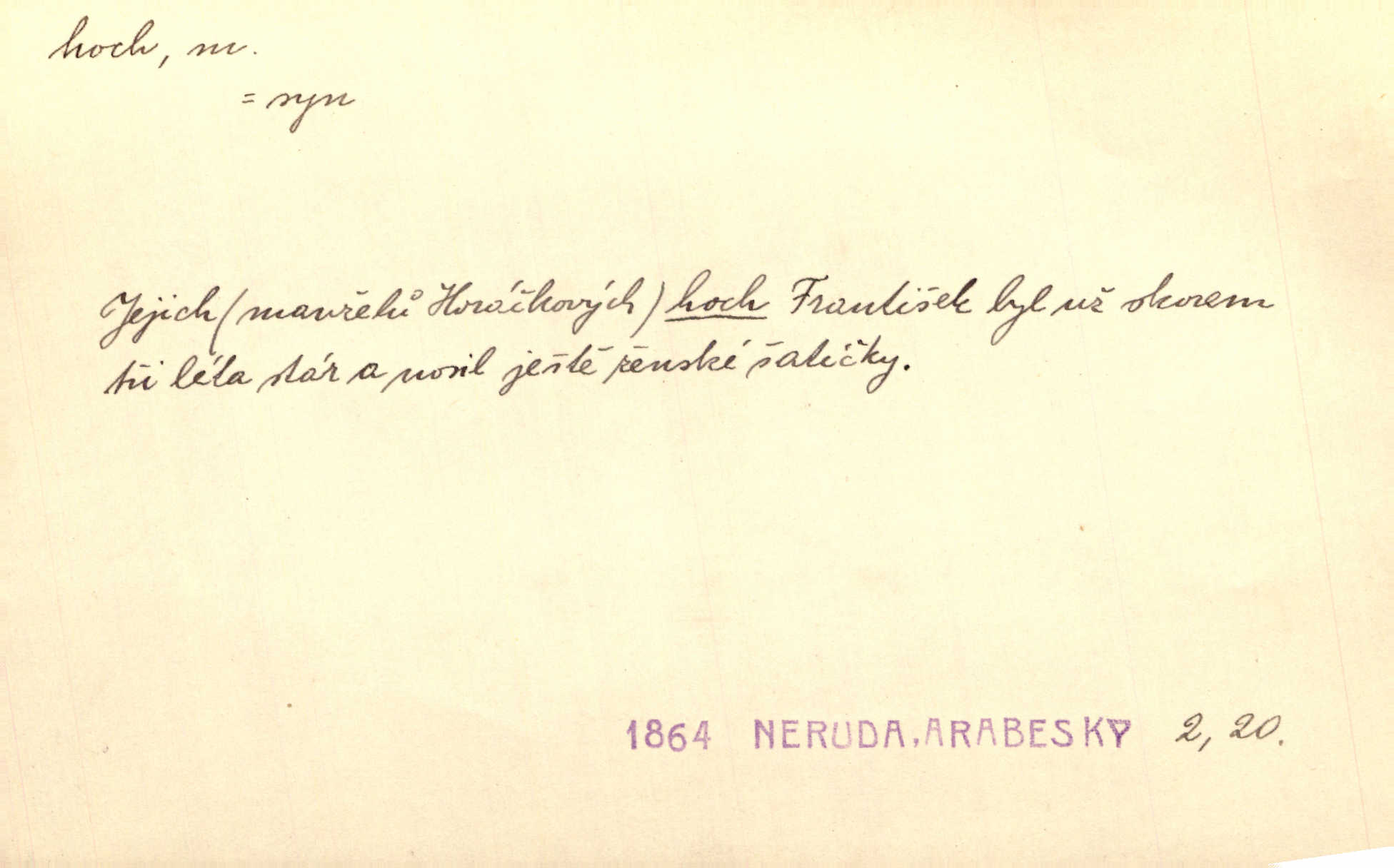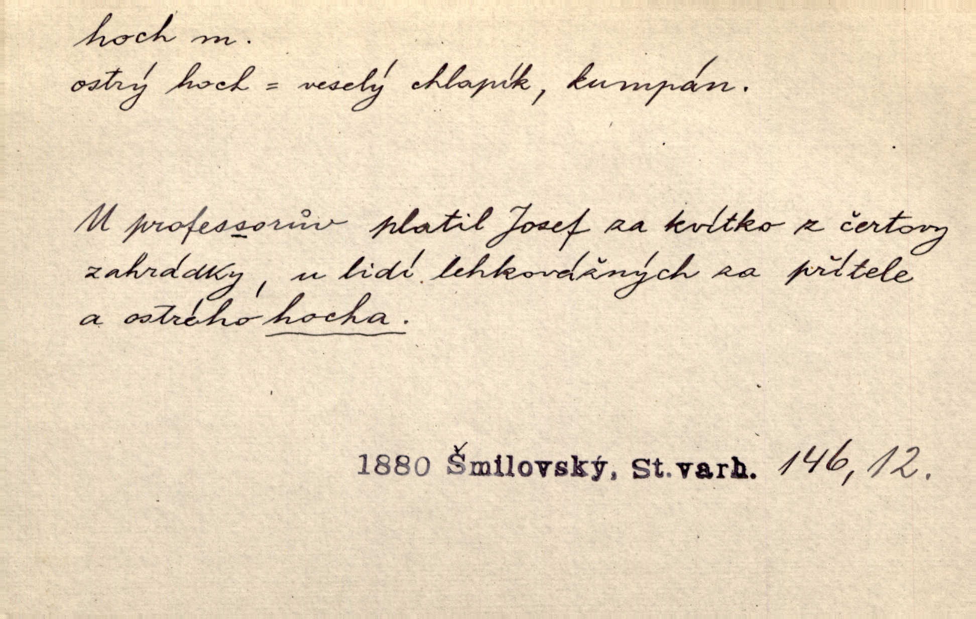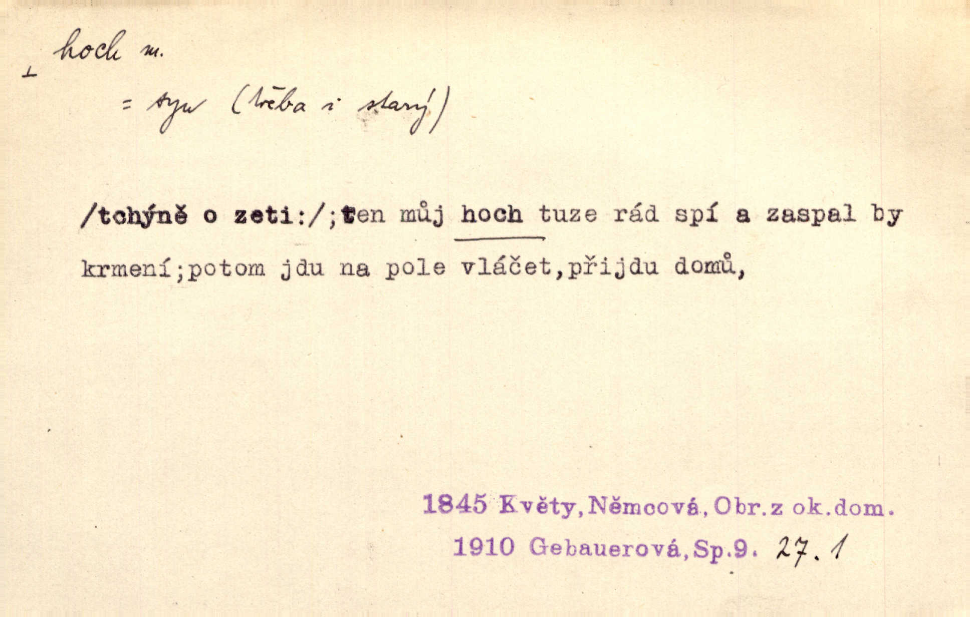 - hoch, -a m. nedospělý člověk mužského pohlaví, chlapec. V levém [šiku]‚ hledíc ode dveří, sedala [ve škole] děvčata, v pravém hoši. Jir. D důvěrně pojmenování n. oslovení milých osob mužských. Ten hoch není ani po nebožtíkovi, ani po mně syn. Jir. [Tchyně o zeti:] Ten můj hoch tuze rád spí. Něm. Stařenka povídala [manželovi]: „Stárnu, hochu.“ Rais. „Hoši, císař bude míti radost,“ zvolal vůdce [k vojákům]. Kou. [Farář ke kantorovi:] Mám ti starost, hochu. Jir. D milenec. „Nech, můj hochu, těch svých písní!“ ondy milá pošeptala. Slád. Holka bez hocha, ryba bez vody. Pořek. D ostrý hoch veselý chlapík, kumpán. U professorův platil Josef za kvítko z čertovy zahrádky, u lidí lehkovážných za ostrého hocha. Šmil. Nejsou zde ostří hoši, kteří jindy mžikem vytáčejí máz nebo dva. Lum. Jizba byla plna hochů z mokré čtvrti pijáků, mazavků. Jir.