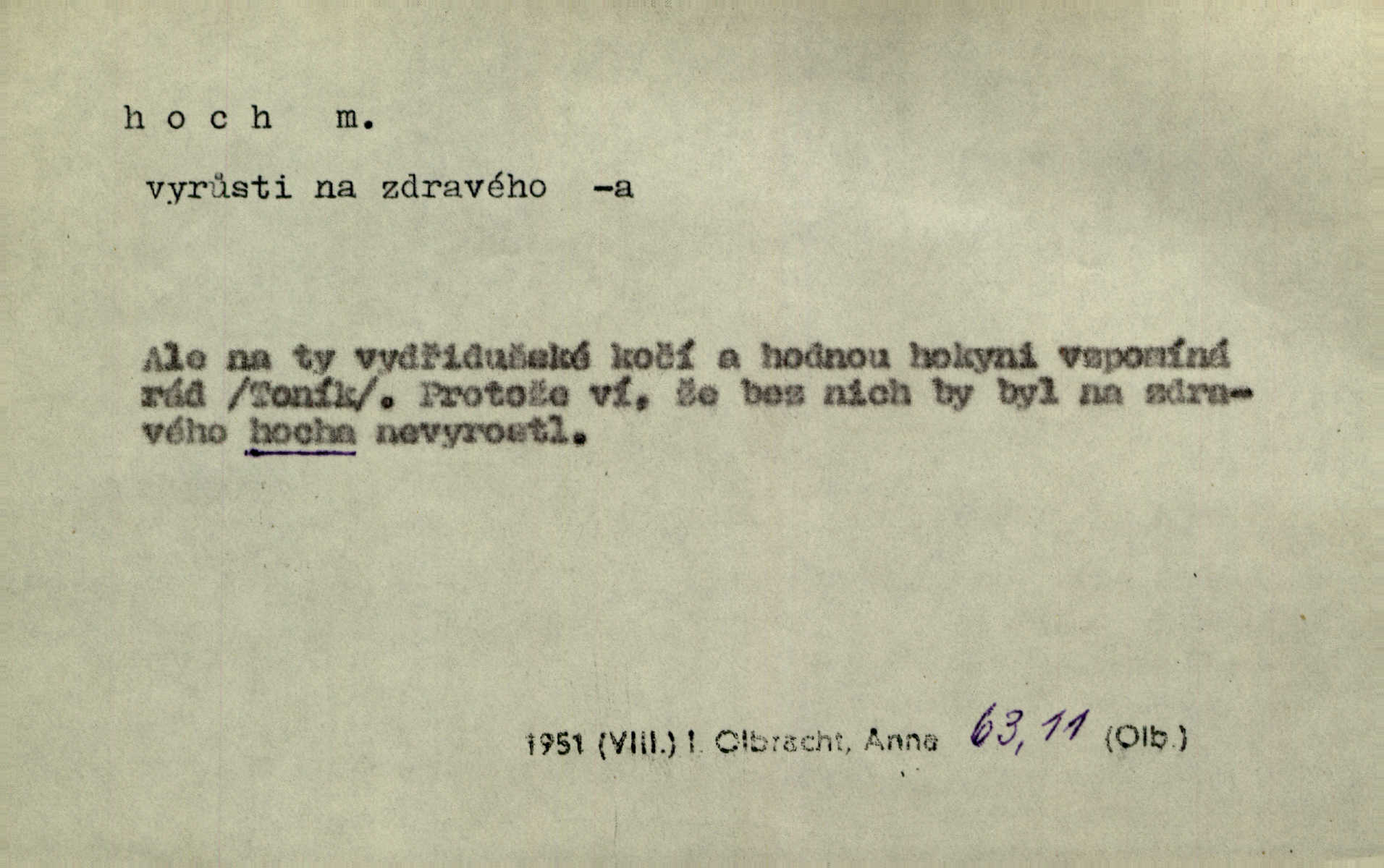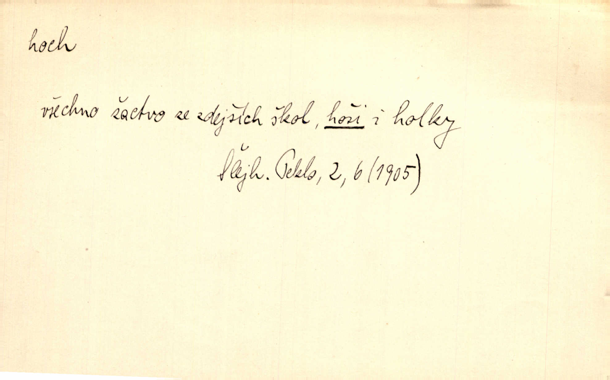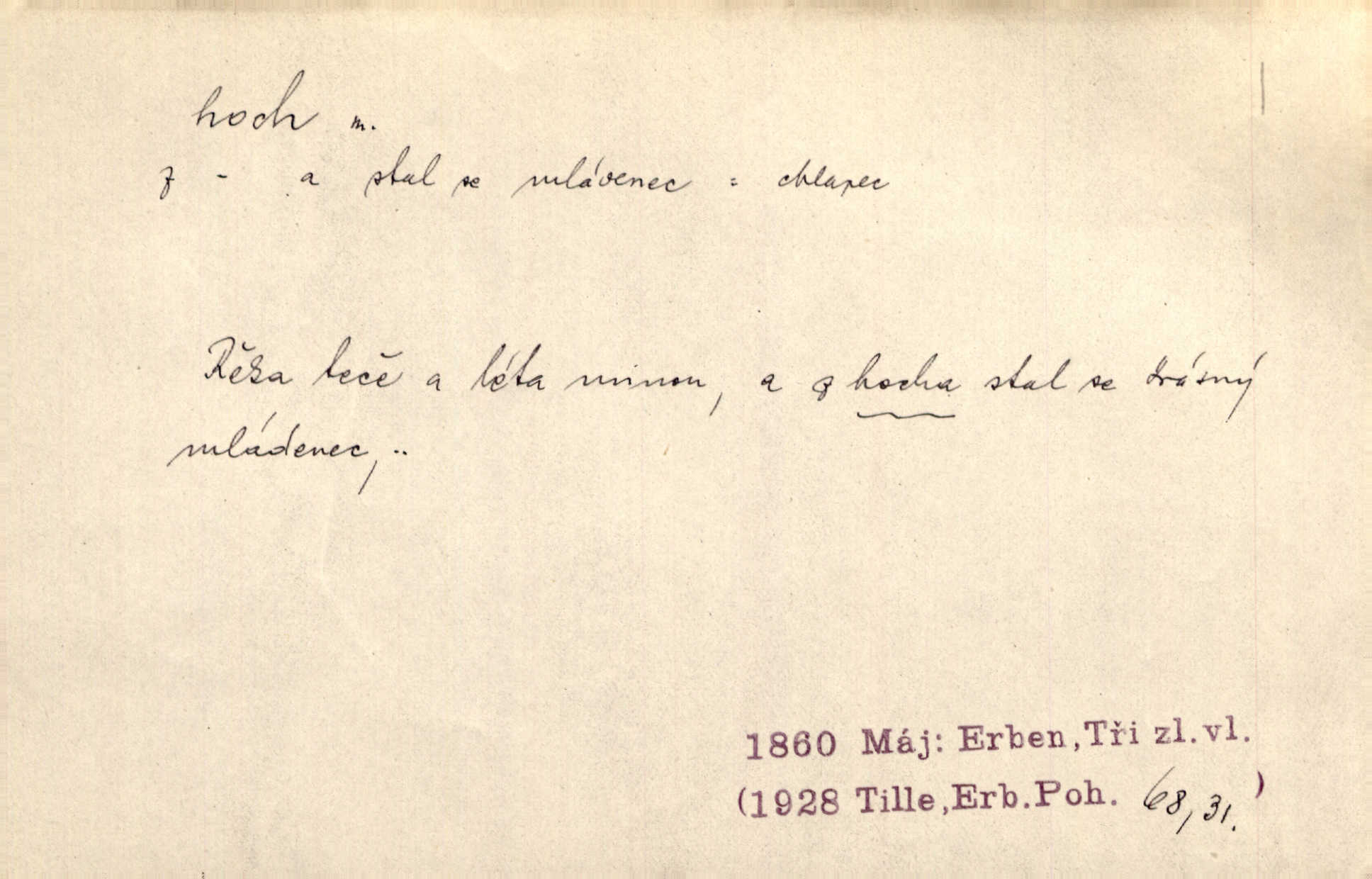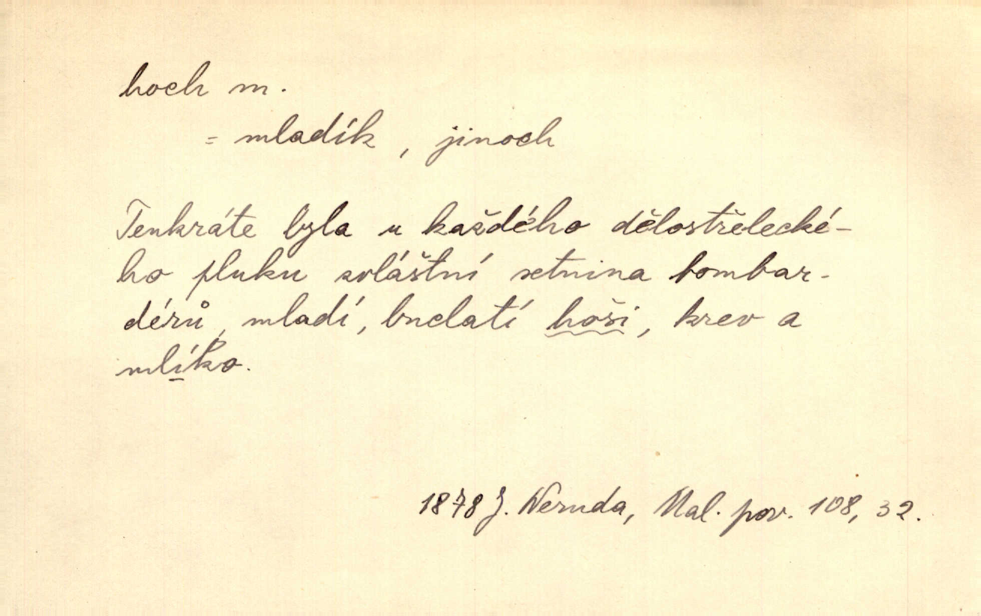 - hoch, -a m. nedospělý člověk mužského pohlaví, chlapec. V levém [šiku]‚ hledíc ode dveří, sedala [ve škole] děvčata, v pravém hoši. Jir. D důvěrně pojmenování n. oslovení milých osob mužských. Ten hoch není ani po nebožtíkovi, ani po mně syn. Jir. [Tchyně o zeti:] Ten můj hoch tuze rád spí. Něm. Stařenka povídala [manželovi]: „Stárnu, hochu.“ Rais. „Hoši, císař bude míti radost,“ zvolal vůdce [k vojákům]. Kou. [Farář ke kantorovi:] Mám ti starost, hochu. Jir. D milenec. „Nech, můj hochu, těch svých písní!“ ondy milá pošeptala. Slád. Holka bez hocha, ryba bez vody. Pořek. D ostrý hoch veselý chlapík, kumpán. U professorův platil Josef za kvítko z čertovy zahrádky, u lidí lehkovážných za ostrého hocha. Šmil. Nejsou zde ostří hoši, kteří jindy mžikem vytáčejí máz nebo dva. Lum. Jizba byla plna hochů z mokré čtvrti pijáků, mazavků. Jir.