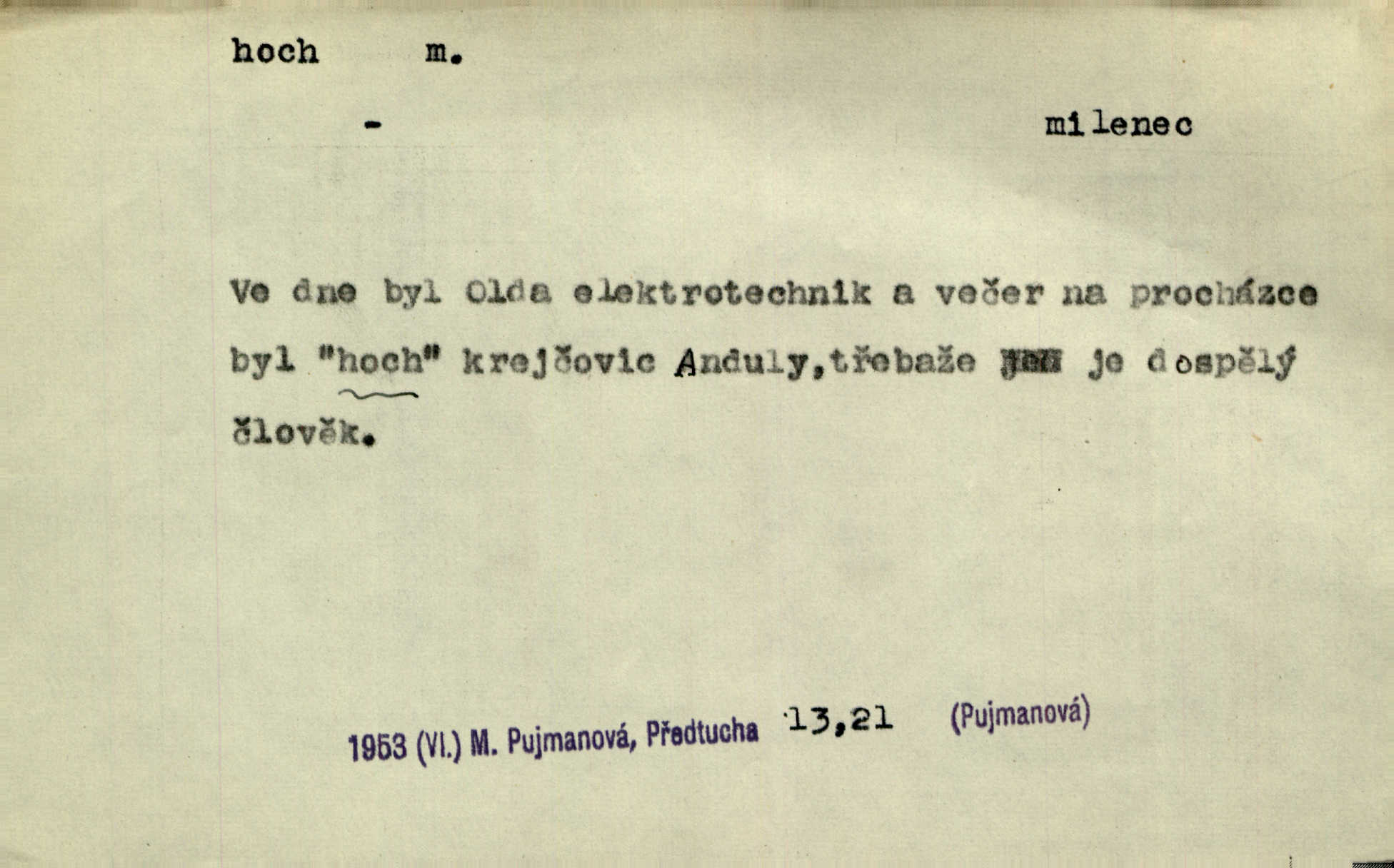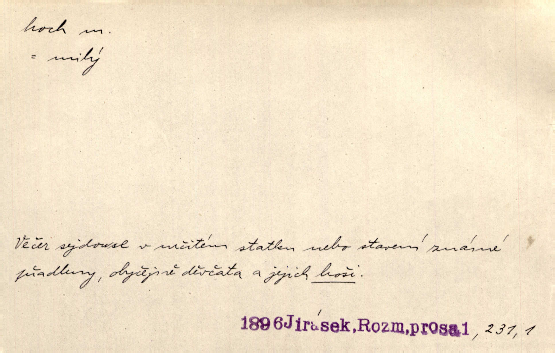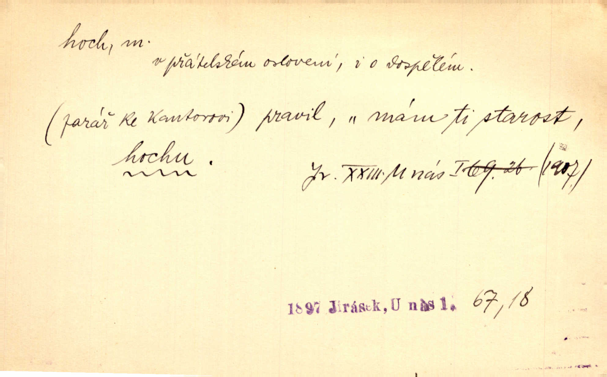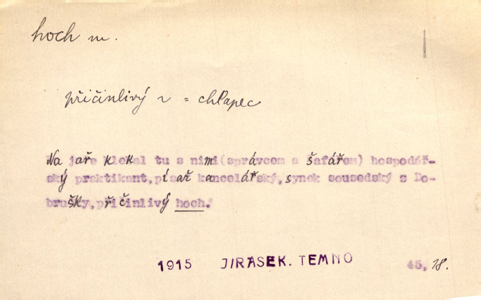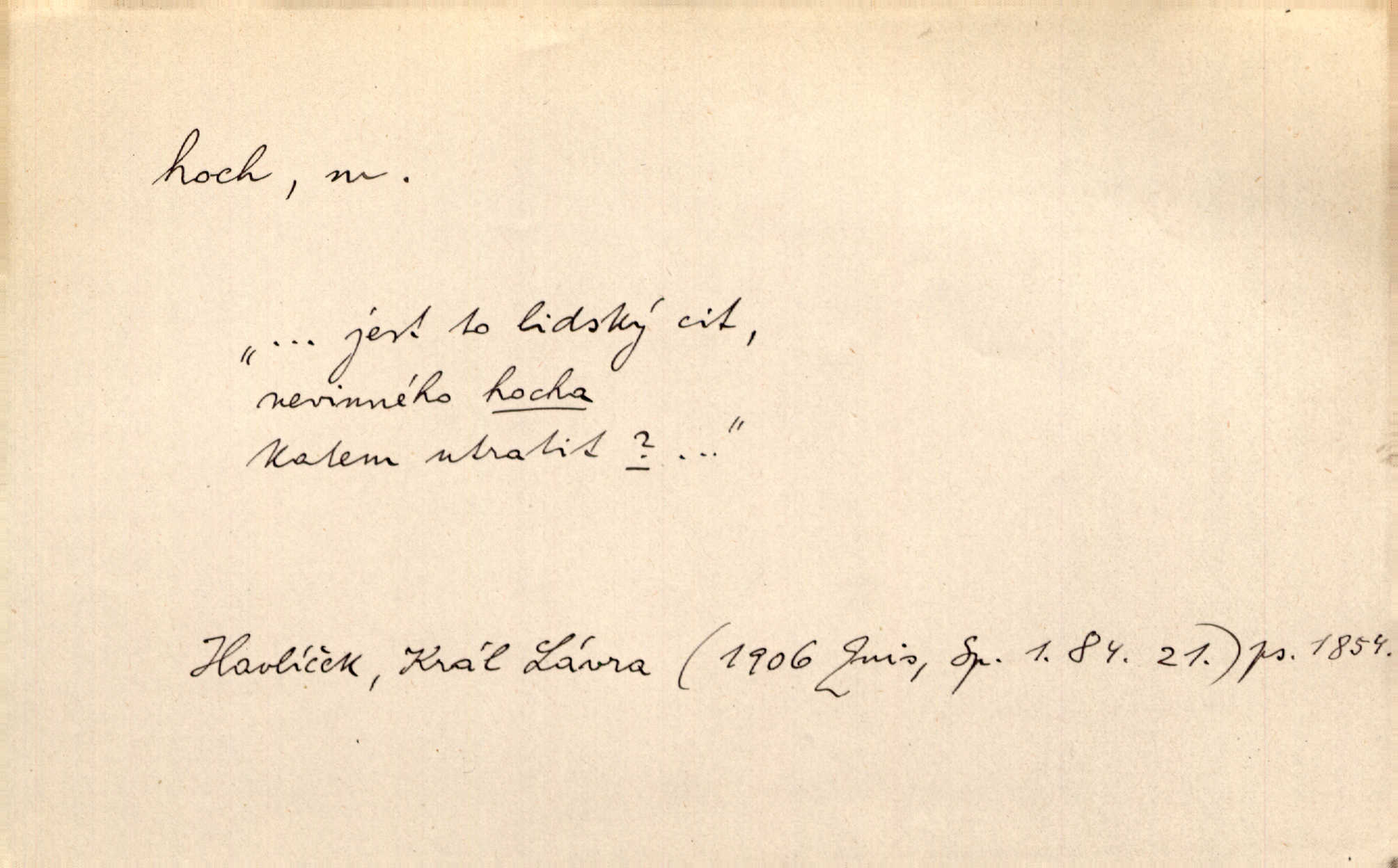 - hoch, -a m. nedospělý člověk mužského pohlaví, chlapec. V levém [šiku]‚ hledíc ode dveří, sedala [ve škole] děvčata, v pravém hoši. Jir. D důvěrně pojmenování n. oslovení milých osob mužských. Ten hoch není ani po nebožtíkovi, ani po mně syn. Jir. [Tchyně o zeti:] Ten můj hoch tuze rád spí. Něm. Stařenka povídala [manželovi]: „Stárnu, hochu.“ Rais. „Hoši, císař bude míti radost,“ zvolal vůdce [k vojákům]. Kou. [Farář ke kantorovi:] Mám ti starost, hochu. Jir. D milenec. „Nech, můj hochu, těch svých písní!“ ondy milá pošeptala. Slád. Holka bez hocha, ryba bez vody. Pořek. D ostrý hoch veselý chlapík, kumpán. U professorův platil Josef za kvítko z čertovy zahrádky, u lidí lehkovážných za ostrého hocha. Šmil. Nejsou zde ostří hoši, kteří jindy mžikem vytáčejí máz nebo dva. Lum. Jizba byla plna hochů z mokré čtvrti pijáků, mazavků. Jir.